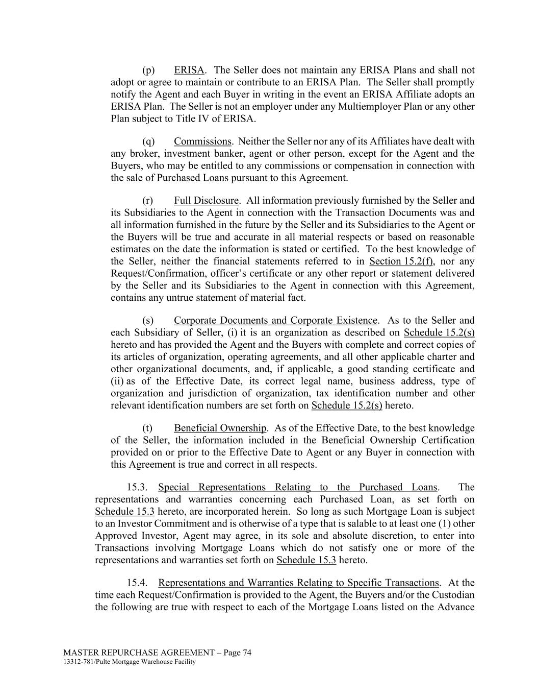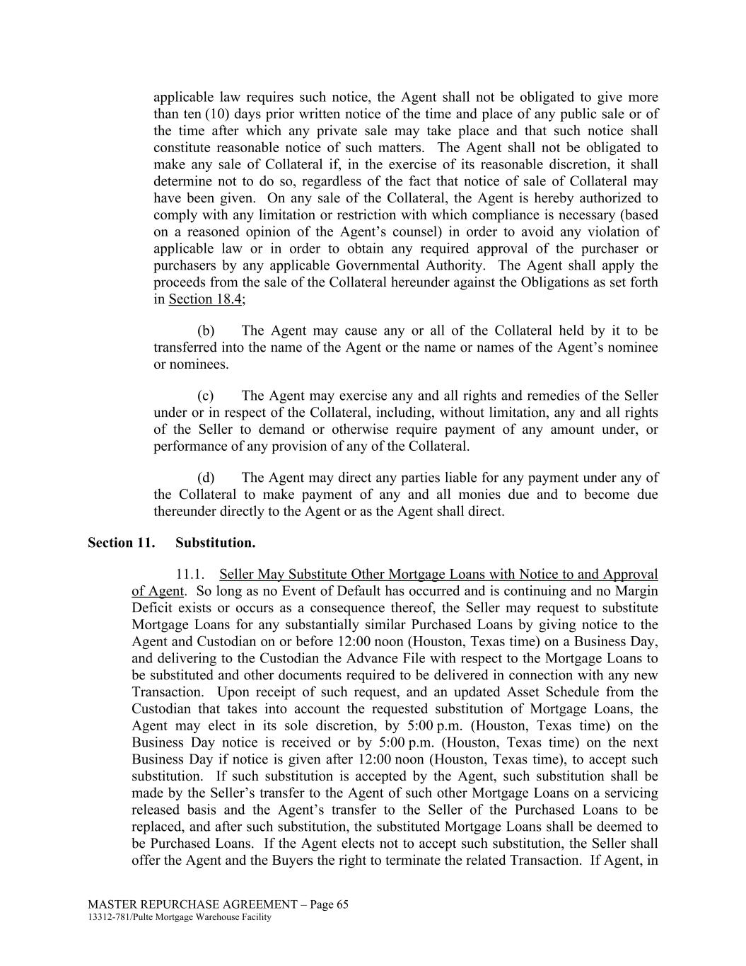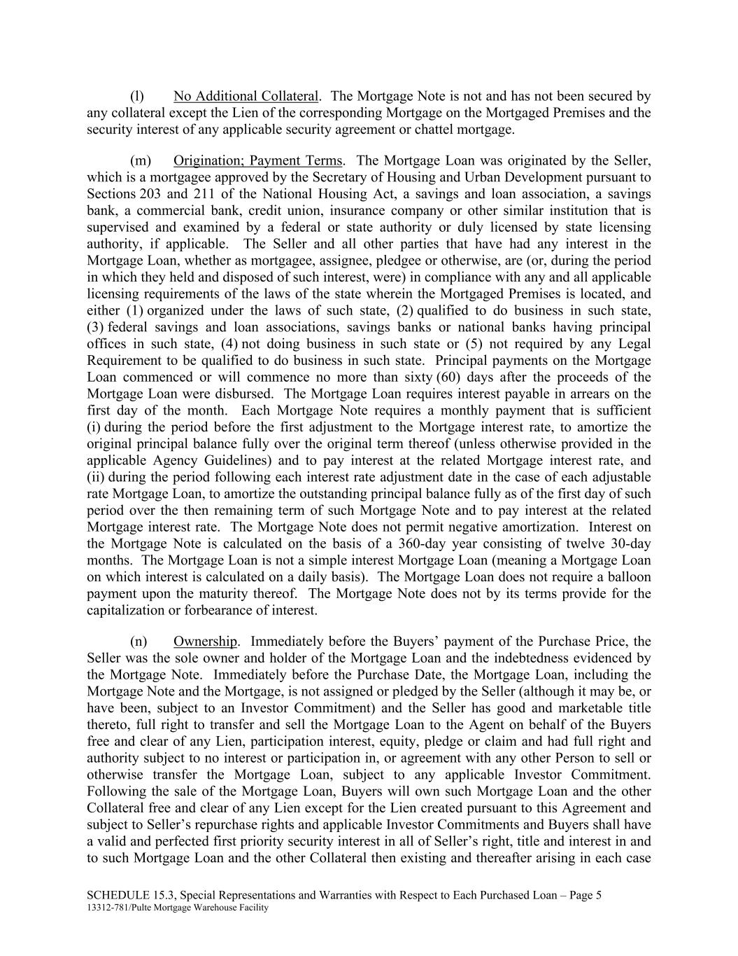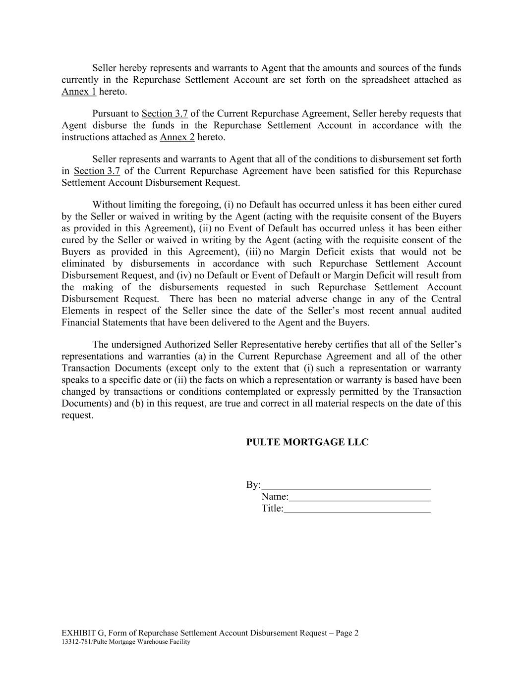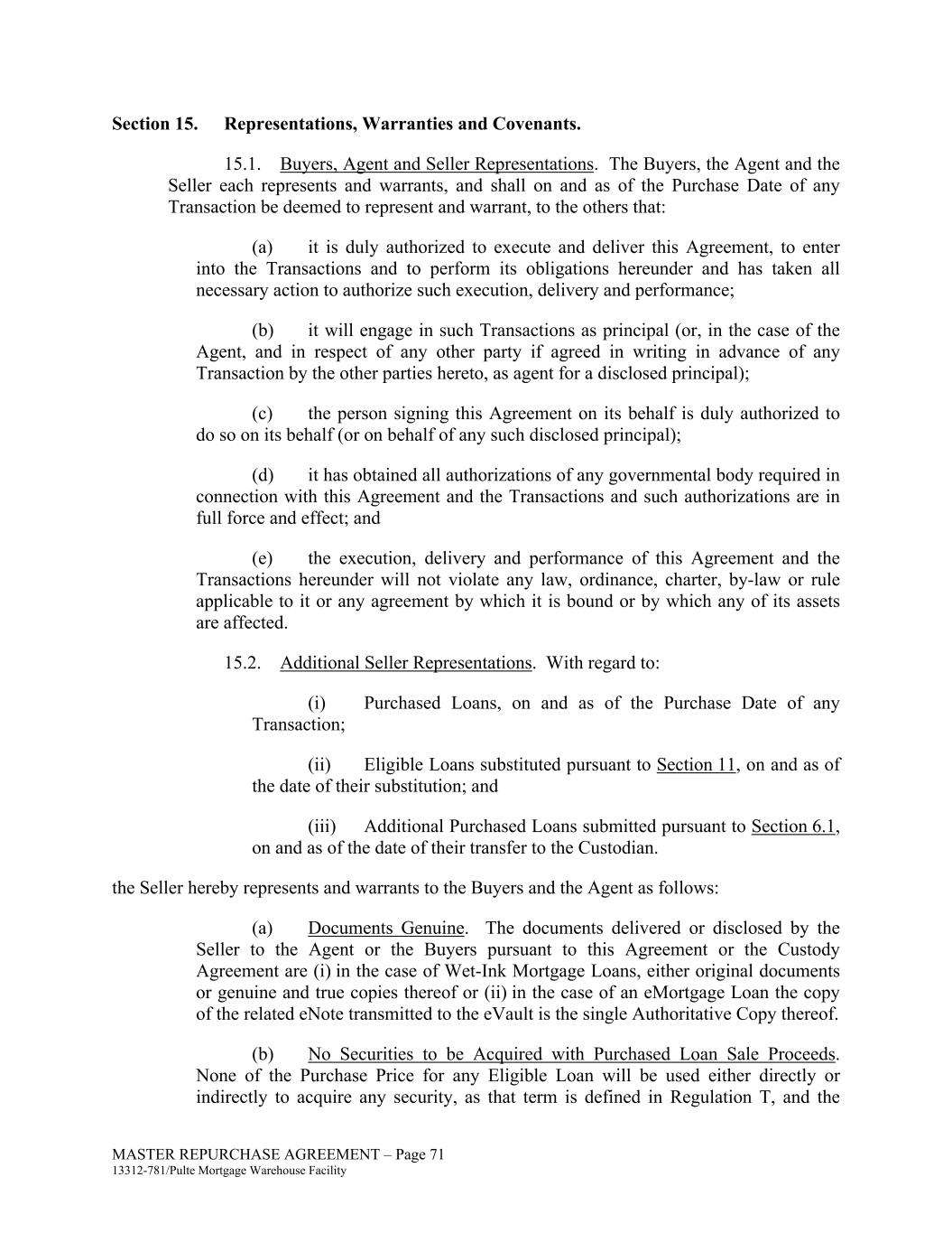 TABLE OF CONTENTS Page iii 13312-781/Pulte Mortgage Warehouse Facility Section 11. Substitution. .......................................................................................................... 64 11.1. Seller May Substitute Other Mortgage Loans with Notice to and Approval of Agent . 64 11.2. Payment to Accompany Substitution ............................................................................ 64 Section 12. Payment and Transfer. .......................................................................................... 64 12.1. Immediately Available Funds; Notice to Custodian ..................................................... 64 12.2. Payments to the Agent .................................................................................................. 64 12.3. If Payment Not Made When Due .................................................................................. 65 12.4. Payments Valid and Effective ....................................................................................... 65 12.5. Pro Rata Distribution of Payments ............................................................................... 65 Section 13. Segregation of Documents Relating to Purchased Loans. .................................... 65 Section 14. Conditions Precedent. ........................................................................................... 66 14.1. Initial Purchase .............................................................................................................. 66 14.2. Each Purchase ............................................................................................................... 68 Section 15. Representations, Warranties and Covenants. ........................................................ 69 15.1. Buyers, Agent and Seller Representations .................................................................... 69 15.2. Additional Seller Representations................................................................................. 69 15.3. Special Representations Relating to the Purchased Loans ........................................... 74 15.4. Representations and Warranties Relating to Specific Transactions ............................. 74 15.5. Buyer Representations .................................................................................................. 76 15.6. Survival ......................................................................................................................... 76 Section 16. Affirmative Covenants. ......................................................................................... 76 16.1. Office of Foreign Assets Control and USA Patriot Act ................................................ 76 16.2. Financial Statements ..................................................................................................... 77 16.3. Financial Statements Will Be Accurate ........................................................................ 78 16.4. Other Reports ................................................................................................................ 78 16.5. Maintain Existence and Statuses; Conduct of Business ............................................... 79 16.6. Compliance with Applicable Laws ............................................................................... 79 16.7. Inspection of Properties and Books; Protection of Seller’s Proprietary Information; Buyers’ Due Diligence of Seller .............................................................................................. 79 16.8. Notice of Suits, Etc ....................................................................................................... 81 16.9. Payment of Taxes, Etc .................................................................................................. 82 16.10. Insurance; Fidelity Bond ........................................................................................... 83 16.11. eMortgage Loans ...................................................................................................... 83