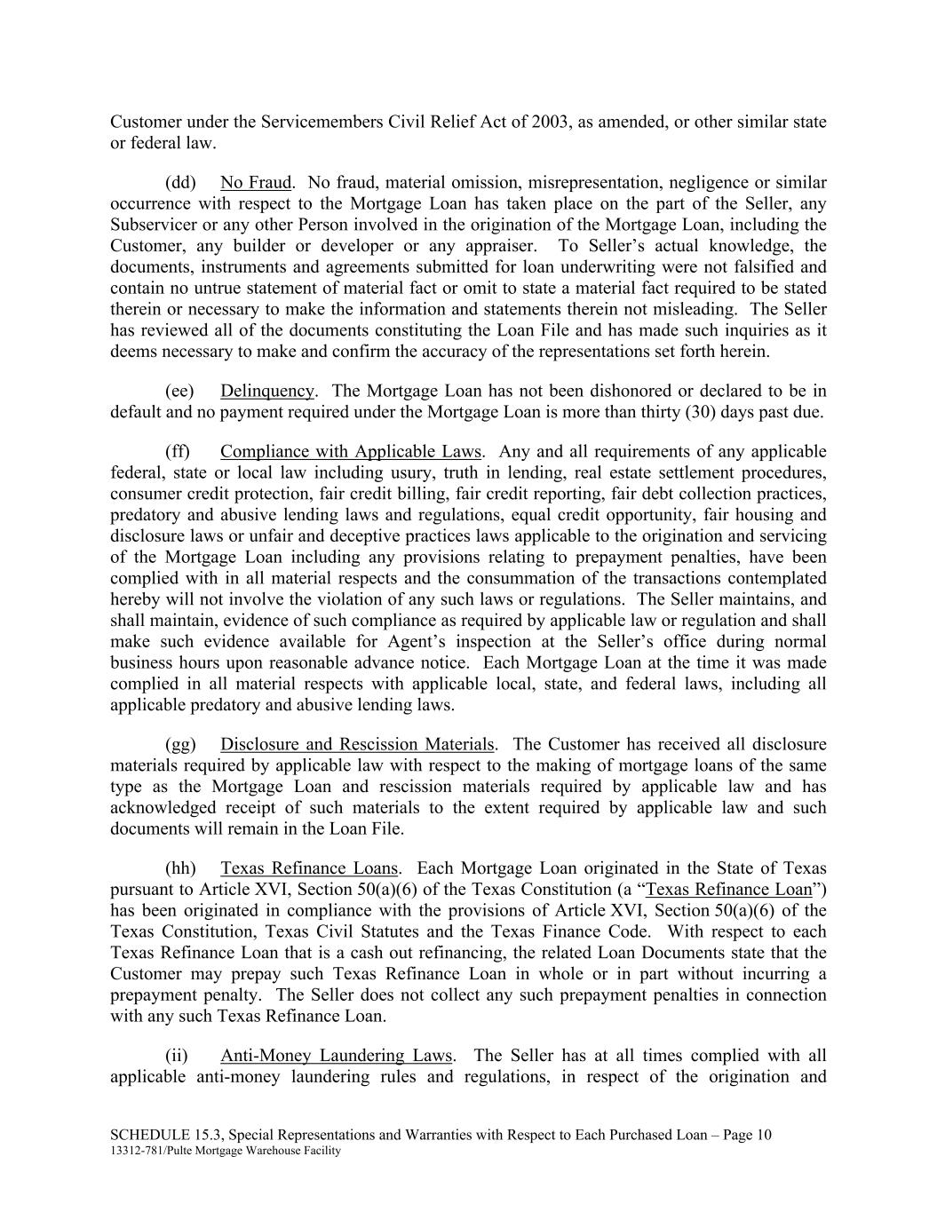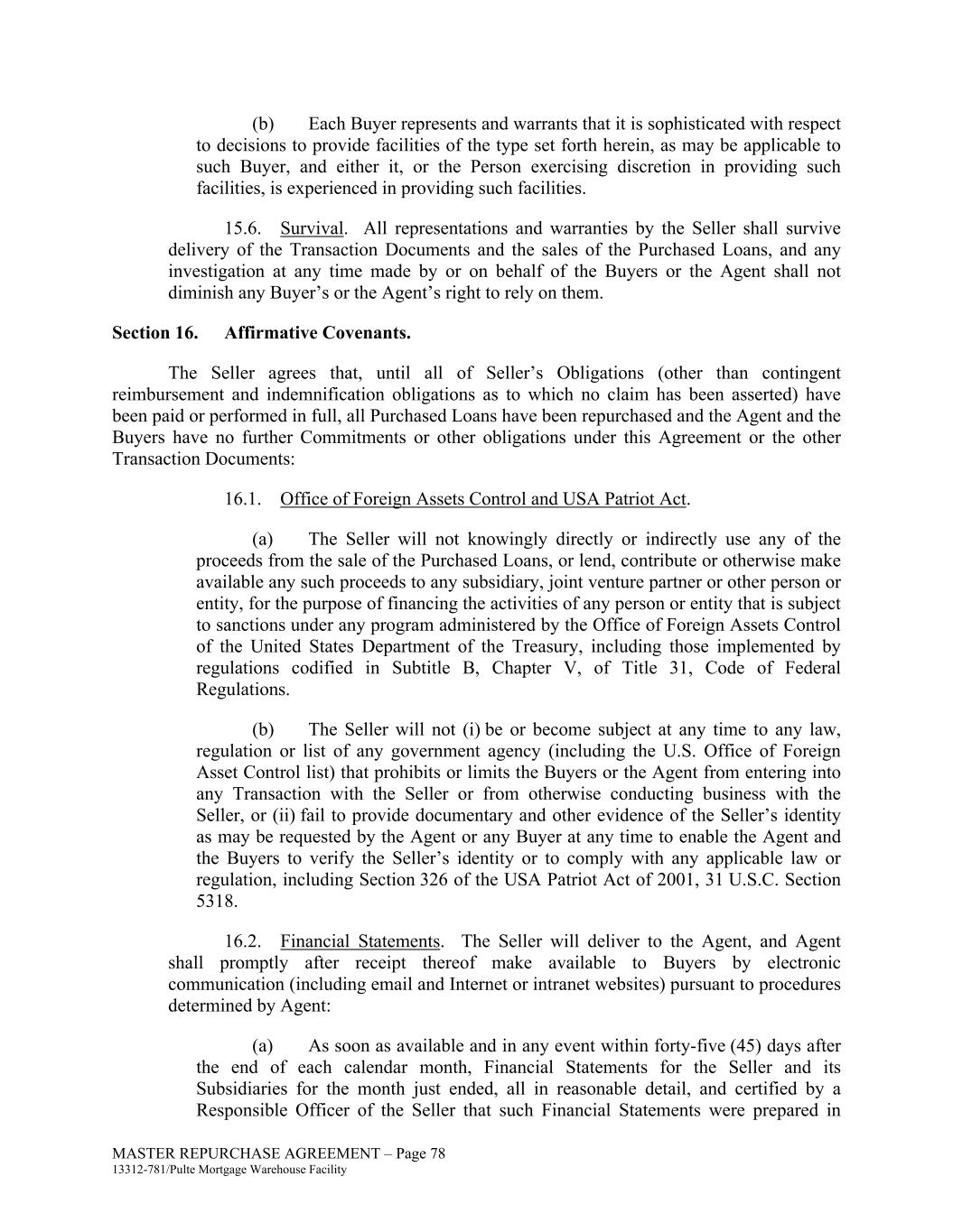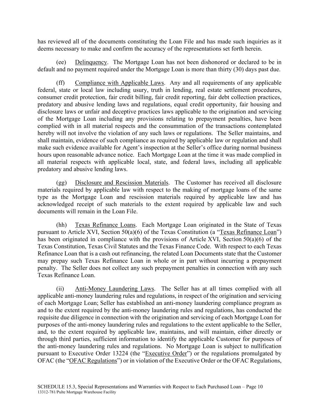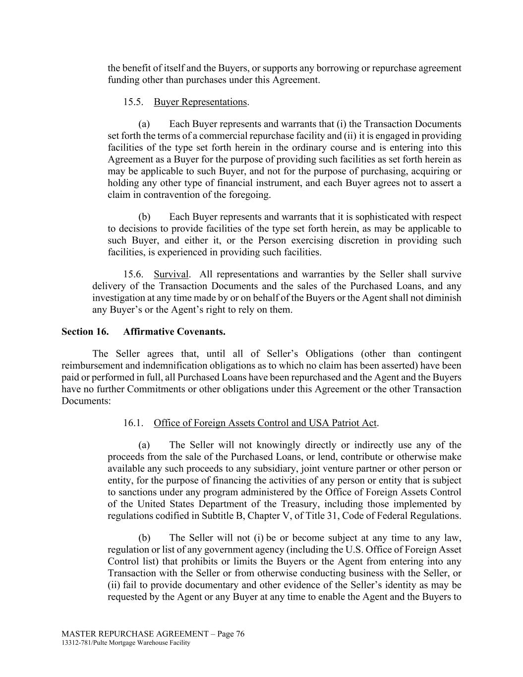 TABLE OF CONTENTS Page iii 13312-781/Pulte Mortgage Warehouse Facility Section 11. Substitution. .......................................................................................................... 64 11.1. Seller May Substitute Other Mortgage Loans with Notice to and Approval of Agent . 64 11.2. Payment to Accompany Substitution ............................................................................ 64 Section 12. Payment and Transfer. .......................................................................................... 64 12.1. Immediately Available Funds; Notice to Custodian ..................................................... 64 12.2. Payments to the Agent .................................................................................................. 64 12.3. If Payment Not Made When Due .................................................................................. 65 12.4. Payments Valid and Effective ....................................................................................... 65 12.5. Pro Rata Distribution of Payments ............................................................................... 65 Section 13. Segregation of Documents Relating to Purchased Loans. .................................... 65 Section 14. Conditions Precedent. ........................................................................................... 66 14.1. Initial Purchase .............................................................................................................. 66 14.2. Each Purchase ............................................................................................................... 68 Section 15. Representations, Warranties and Covenants. ........................................................ 69 15.1. Buyers, Agent and Seller Representations .................................................................... 69 15.2. Additional Seller Representations................................................................................. 69 15.3. Special Representations Relating to the Purchased Loans ........................................... 74 15.4. Representations and Warranties Relating to Specific Transactions ............................. 74 15.5. Buyer Representations .................................................................................................. 76 15.6. Survival ......................................................................................................................... 76 Section 16. Affirmative Covenants. ......................................................................................... 76 16.1. Office of Foreign Assets Control and USA Patriot Act ................................................ 76 16.2. Financial Statements ..................................................................................................... 77 16.3. Financial Statements Will Be Accurate ........................................................................ 78 16.4. Other Reports ................................................................................................................ 78 16.5. Maintain Existence and Statuses; Conduct of Business ............................................... 79 16.6. Compliance with Applicable Laws ............................................................................... 79 16.7. Inspection of Properties and Books; Protection of Seller’s Proprietary Information; Buyers’ Due Diligence of Seller .............................................................................................. 79 16.8. Notice of Suits, Etc ....................................................................................................... 81 16.9. Payment of Taxes, Etc .................................................................................................. 82 16.10. Insurance; Fidelity Bond ........................................................................................... 83 16.11. eMortgage Loans ...................................................................................................... 83