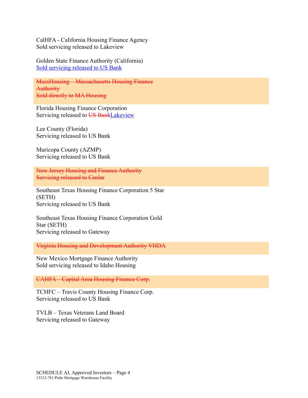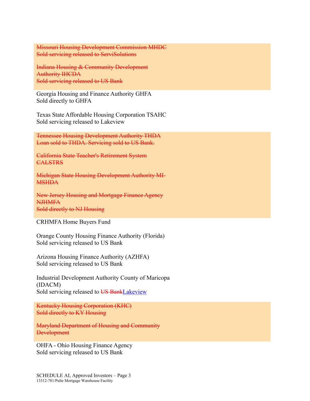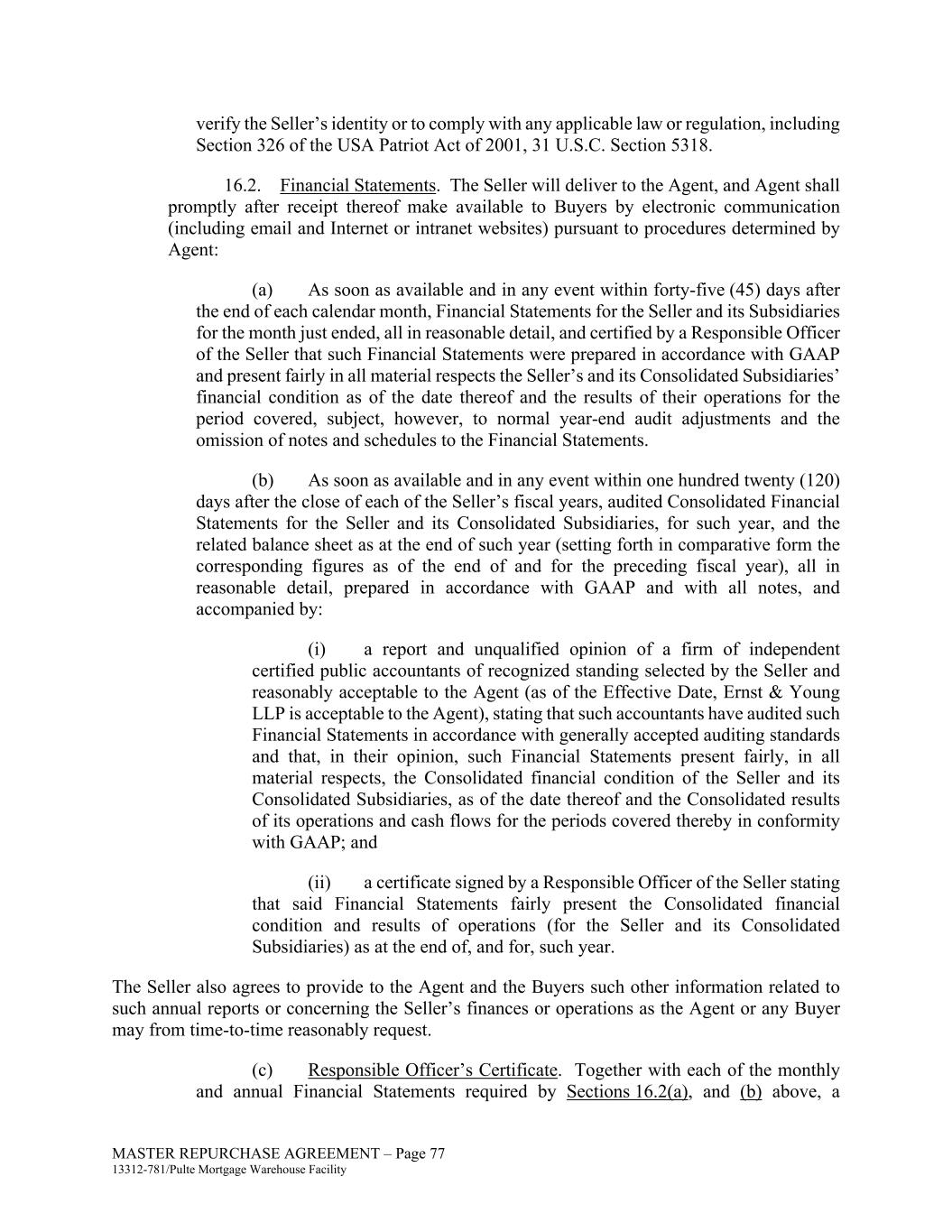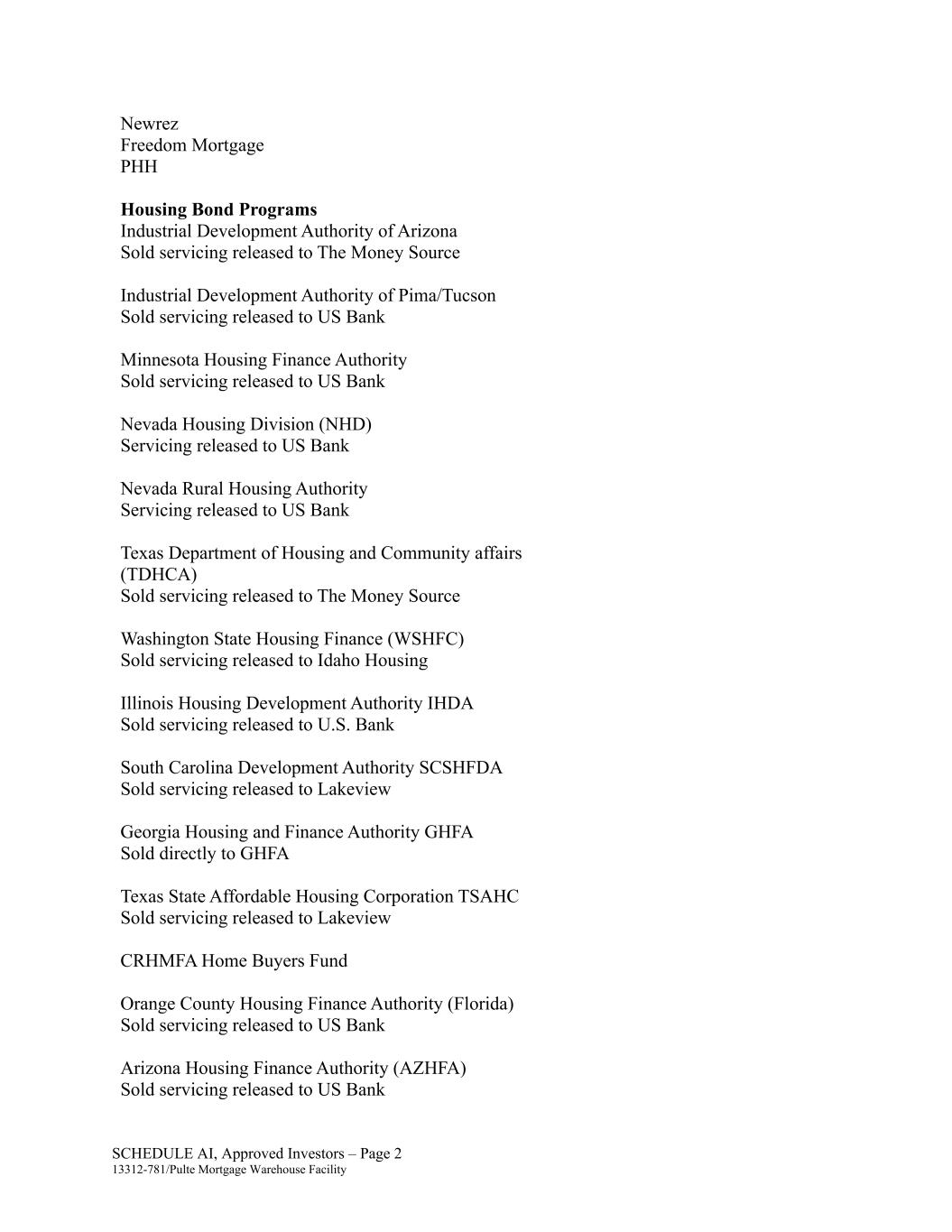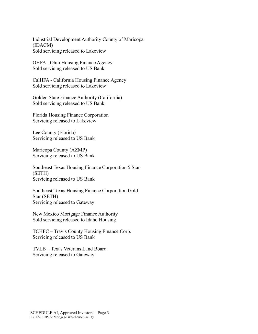 TABLE OF CONTENTS Page iii 13312-781/Pulte Mortgage Warehouse Facility Section 11. Substitution. .......................................................................................................... 64 11.1. Seller May Substitute Other Mortgage Loans with Notice to and Approval of Agent . 64 11.2. Payment to Accompany Substitution ............................................................................ 64 Section 12. Payment and Transfer. .......................................................................................... 64 12.1. Immediately Available Funds; Notice to Custodian ..................................................... 64 12.2. Payments to the Agent .................................................................................................. 64 12.3. If Payment Not Made When Due .................................................................................. 65 12.4. Payments Valid and Effective ....................................................................................... 65 12.5. Pro Rata Distribution of Payments ............................................................................... 65 Section 13. Segregation of Documents Relating to Purchased Loans. .................................... 65 Section 14. Conditions Precedent. ........................................................................................... 66 14.1. Initial Purchase .............................................................................................................. 66 14.2. Each Purchase ............................................................................................................... 68 Section 15. Representations, Warranties and Covenants. ........................................................ 69 15.1. Buyers, Agent and Seller Representations .................................................................... 69 15.2. Additional Seller Representations................................................................................. 69 15.3. Special Representations Relating to the Purchased Loans ........................................... 74 15.4. Representations and Warranties Relating to Specific Transactions ............................. 74 15.5. Buyer Representations .................................................................................................. 76 15.6. Survival ......................................................................................................................... 76 Section 16. Affirmative Covenants. ......................................................................................... 76 16.1. Office of Foreign Assets Control and USA Patriot Act ................................................ 76 16.2. Financial Statements ..................................................................................................... 77 16.3. Financial Statements Will Be Accurate ........................................................................ 78 16.4. Other Reports ................................................................................................................ 78 16.5. Maintain Existence and Statuses; Conduct of Business ............................................... 79 16.6. Compliance with Applicable Laws ............................................................................... 79 16.7. Inspection of Properties and Books; Protection of Seller’s Proprietary Information; Buyers’ Due Diligence of Seller .............................................................................................. 79 16.8. Notice of Suits, Etc ....................................................................................................... 81 16.9. Payment of Taxes, Etc .................................................................................................. 82 16.10. Insurance; Fidelity Bond ........................................................................................... 83 16.11. eMortgage Loans ...................................................................................................... 83