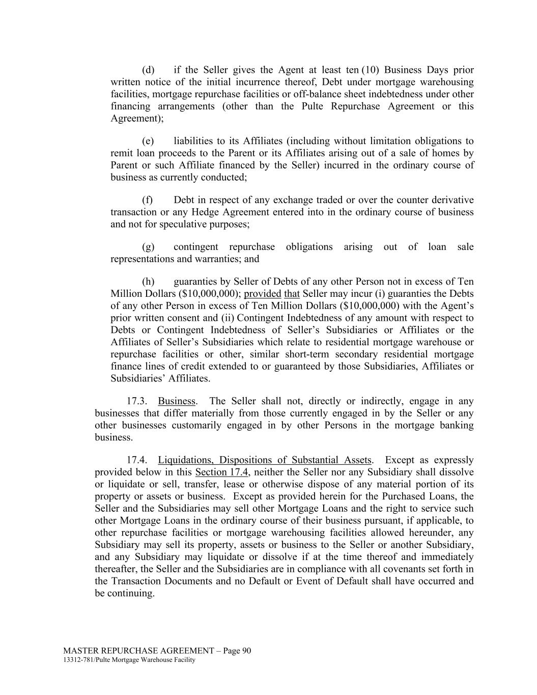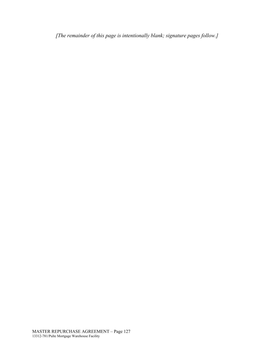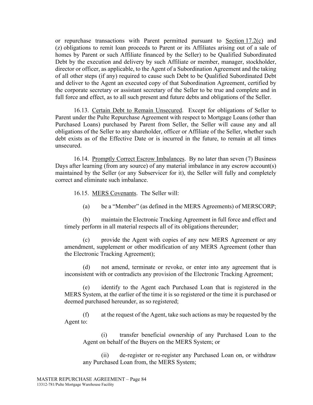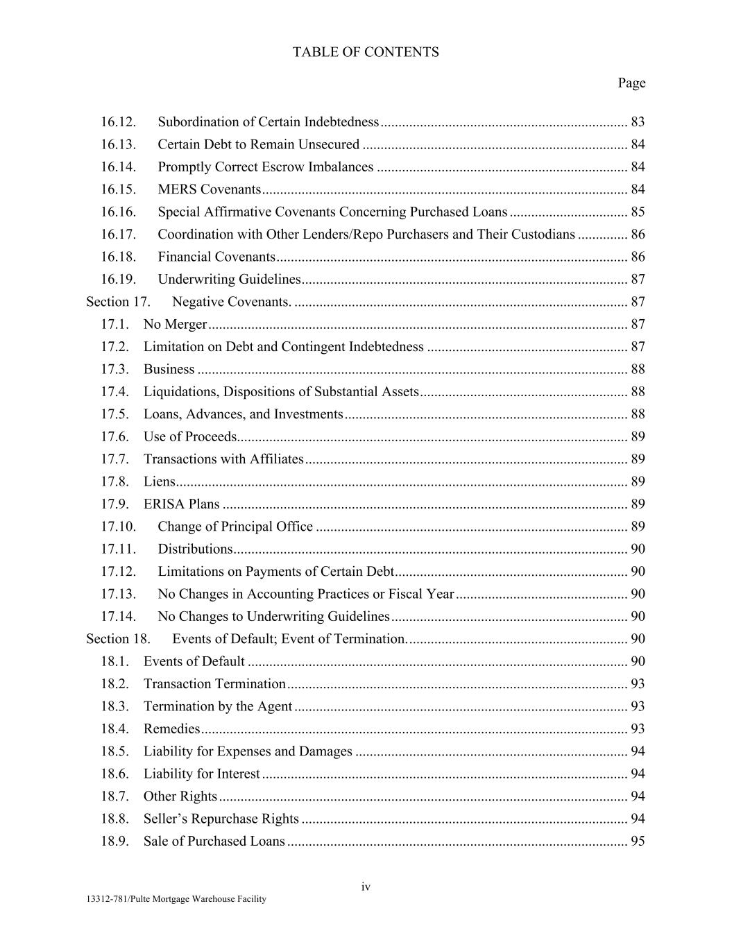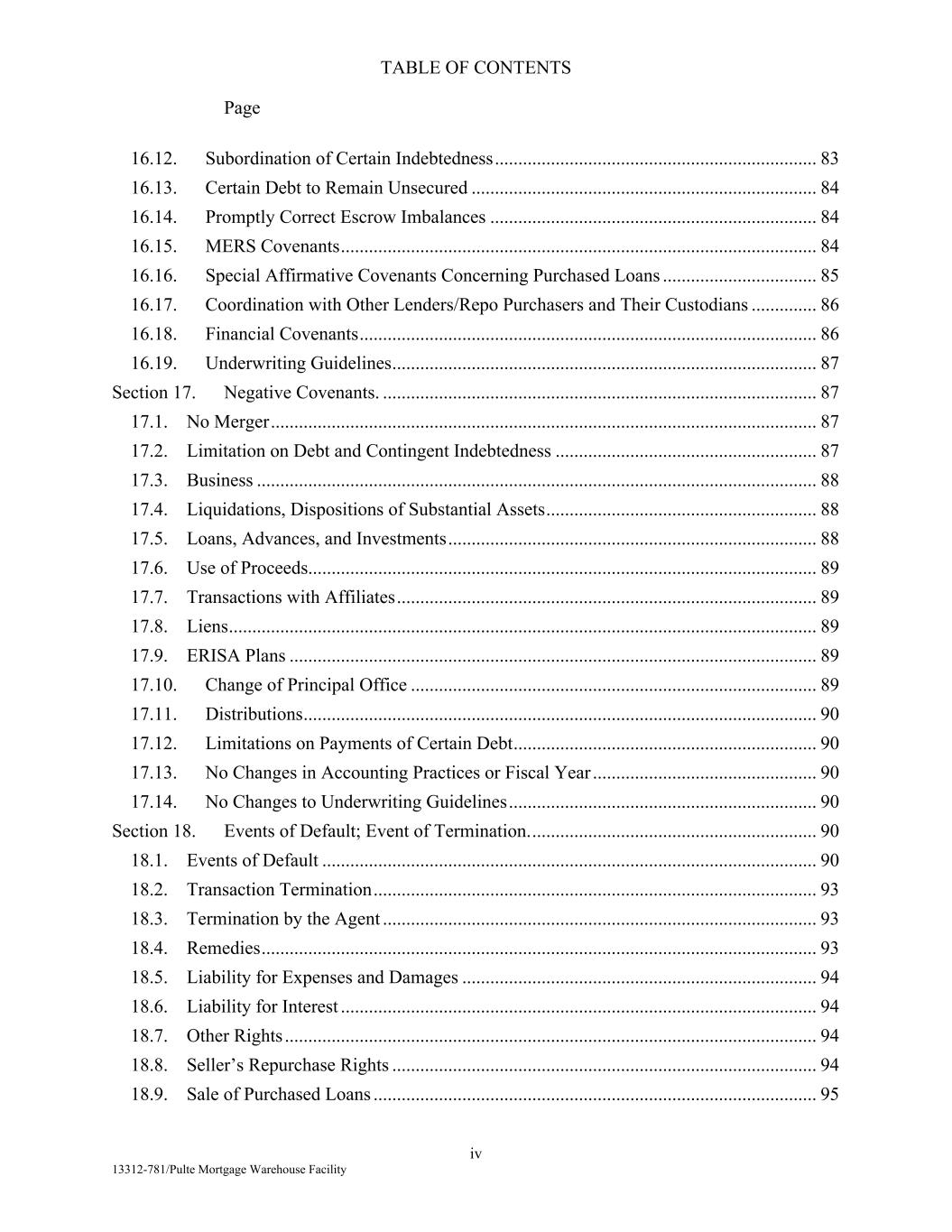 TABLE OF CONTENTS Page iv 13312-781/Pulte Mortgage Warehouse Facility 16.12. Subordination of Certain Indebtedness ..................................................................... 83 16.13. Certain Debt to Remain Unsecured .......................................................................... 84 16.14. Promptly Correct Escrow Imbalances ...................................................................... 84 16.15. MERS Covenants ...................................................................................................... 84 16.16. Special Affirmative Covenants Concerning Purchased Loans ................................. 85 16.17. Coordination with Other Lenders/Repo Purchasers and Their Custodians .............. 86 16.18. Financial Covenants .................................................................................................. 86 16.19. Underwriting Guidelines ........................................................................................... 87 Section 17. Negative Covenants. ............................................................................................. 87 17.1. No Merger ..................................................................................................................... 87 17.2. Limitation on Debt and Contingent Indebtedness ........................................................ 87 17.3. Business ........................................................................................................................ 88 17.4. Liquidations, Dispositions of Substantial Assets .......................................................... 88 17.5. Loans, Advances, and Investments ............................................................................... 88 17.6. Use of Proceeds ............................................................................................................. 89 17.7. Transactions with Affiliates .......................................................................................... 89 17.8. Liens .............................................................................................................................. 89 17.9. ERISA Plans ................................................................................................................. 89 17.10. Change of Principal Office ....................................................................................... 89 17.11. Distributions .............................................................................................................. 90 17.12. Limitations on Payments of Certain Debt ................................................................. 90 17.13. No Changes in Accounting Practices or Fiscal Year ................................................ 90 17.14. No Changes to Underwriting Guidelines .................................................................. 90 Section 18. Events of Default; Event of Termination. ............................................................. 90 18.1. Events of Default .......................................................................................................... 90 18.2. Transaction Termination ............................................................................................... 93 18.3. Termination by the Agent ............................................................................................. 93 18.4. Remedies ....................................................................................................................... 93 18.5. Liability for Expenses and Damages ............................................................................ 94 18.6. Liability for Interest ...................................................................................................... 94 18.7. Other Rights .................................................................................................................. 94 18.8. Seller’s Repurchase Rights ........................................................................................... 94 18.9. Sale of Purchased Loans ............................................................................................... 95