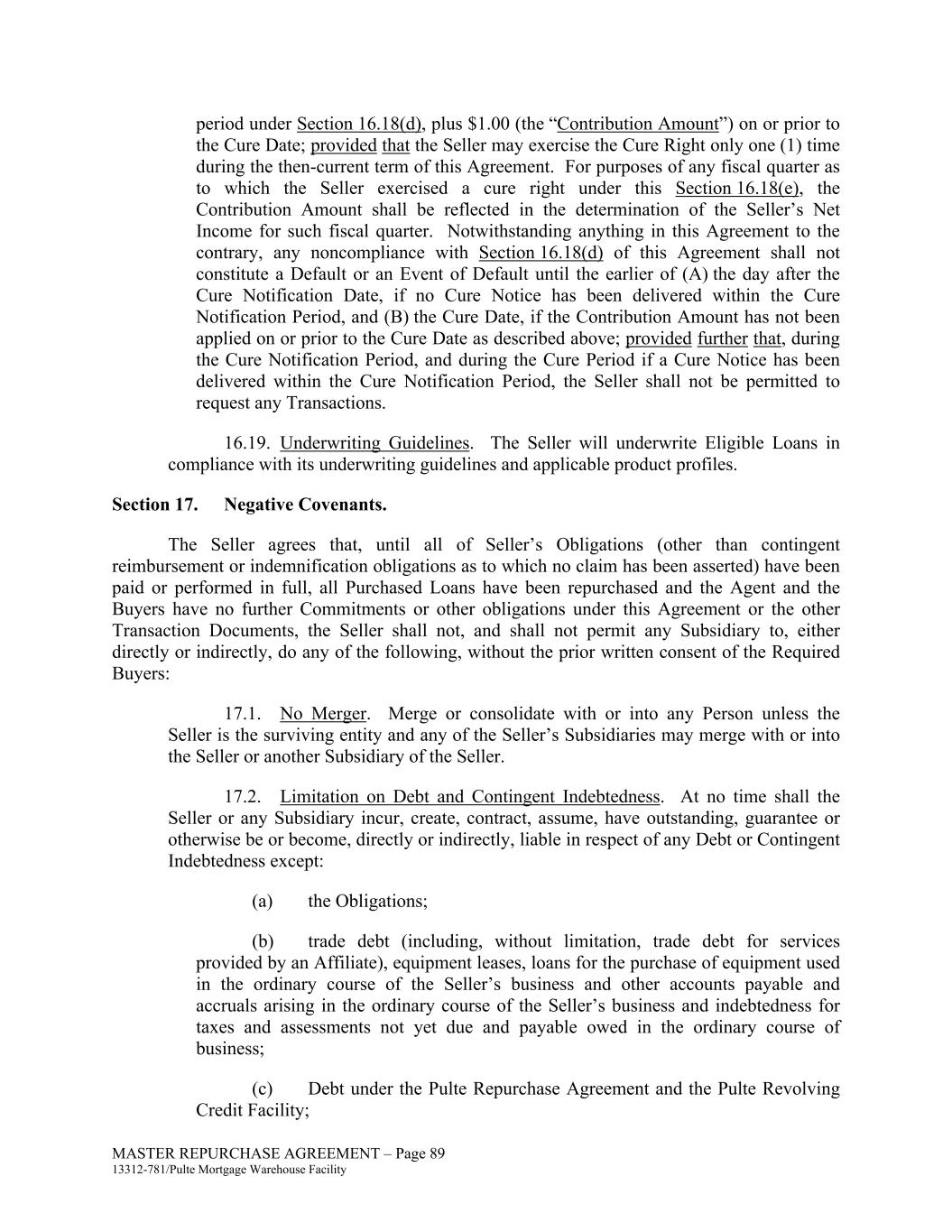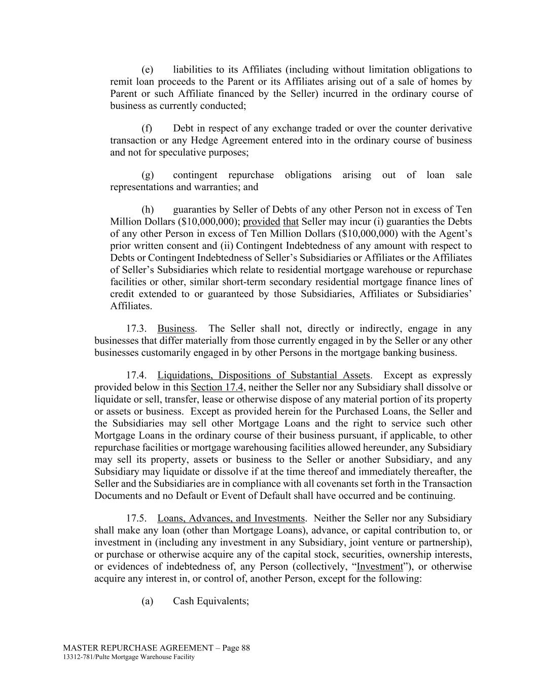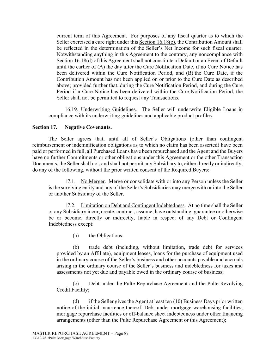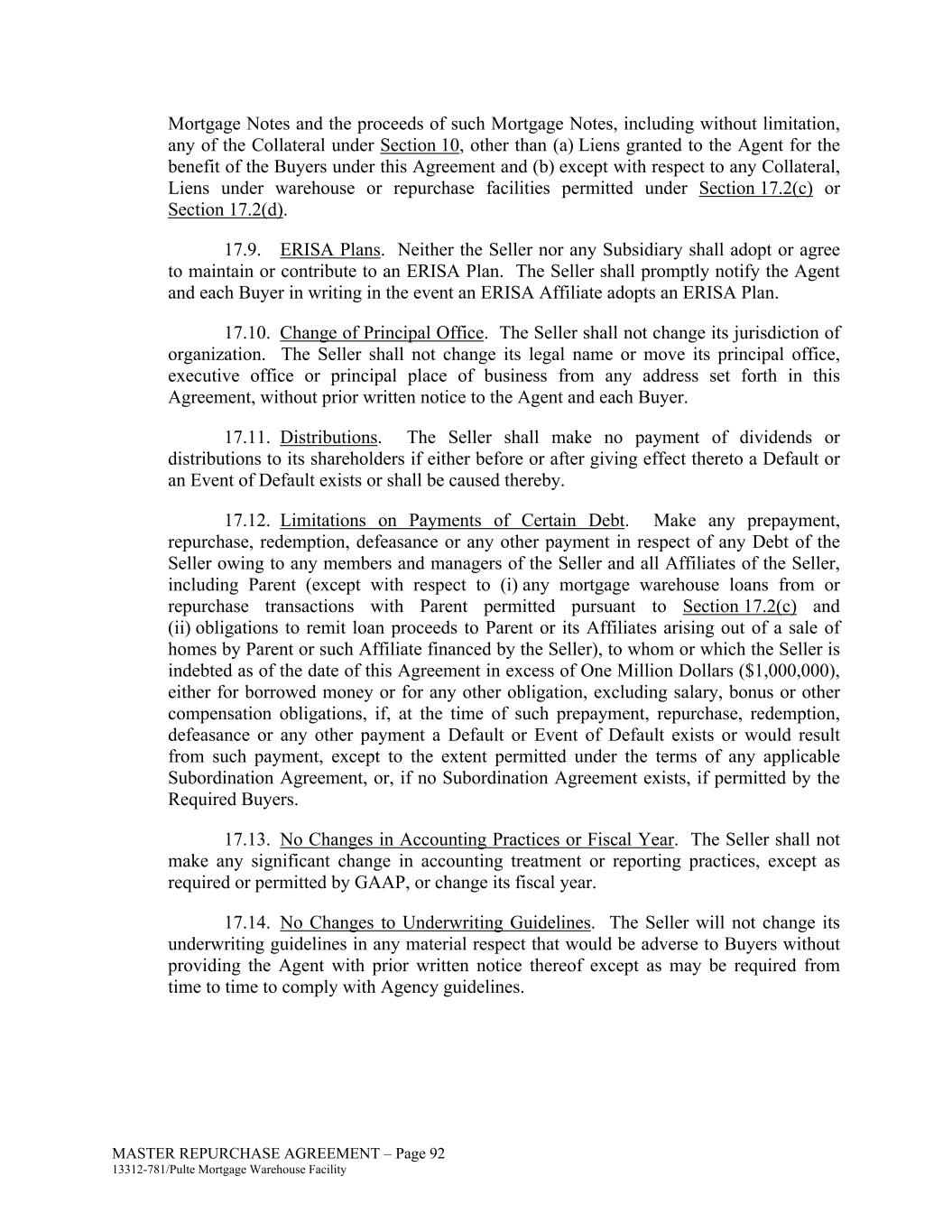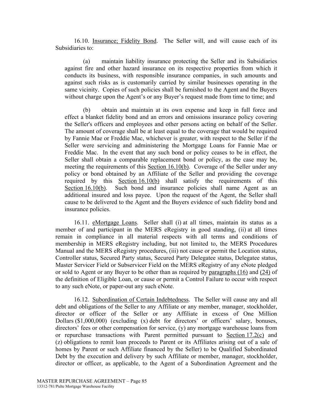 TABLE OF CONTENTS Page iv 13312-781/Pulte Mortgage Warehouse Facility 16.12. Subordination of Certain Indebtedness ..................................................................... 83 16.13. Certain Debt to Remain Unsecured .......................................................................... 84 16.14. Promptly Correct Escrow Imbalances ...................................................................... 84 16.15. MERS Covenants ...................................................................................................... 84 16.16. Special Affirmative Covenants Concerning Purchased Loans ................................. 85 16.17. Coordination with Other Lenders/Repo Purchasers and Their Custodians .............. 86 16.18. Financial Covenants .................................................................................................. 86 16.19. Underwriting Guidelines ........................................................................................... 87 Section 17. Negative Covenants. ............................................................................................. 87 17.1. No Merger ..................................................................................................................... 87 17.2. Limitation on Debt and Contingent Indebtedness ........................................................ 87 17.3. Business ........................................................................................................................ 88 17.4. Liquidations, Dispositions of Substantial Assets .......................................................... 88 17.5. Loans, Advances, and Investments ............................................................................... 88 17.6. Use of Proceeds ............................................................................................................. 89 17.7. Transactions with Affiliates .......................................................................................... 89 17.8. Liens .............................................................................................................................. 89 17.9. ERISA Plans ................................................................................................................. 89 17.10. Change of Principal Office ....................................................................................... 89 17.11. Distributions .............................................................................................................. 90 17.12. Limitations on Payments of Certain Debt ................................................................. 90 17.13. No Changes in Accounting Practices or Fiscal Year ................................................ 90 17.14. No Changes to Underwriting Guidelines .................................................................. 90 Section 18. Events of Default; Event of Termination. ............................................................. 90 18.1. Events of Default .......................................................................................................... 90 18.2. Transaction Termination ............................................................................................... 93 18.3. Termination by the Agent ............................................................................................. 93 18.4. Remedies ....................................................................................................................... 93 18.5. Liability for Expenses and Damages ............................................................................ 94 18.6. Liability for Interest ...................................................................................................... 94 18.7. Other Rights .................................................................................................................. 94 18.8. Seller’s Repurchase Rights ........................................................................................... 94 18.9. Sale of Purchased Loans ............................................................................................... 95