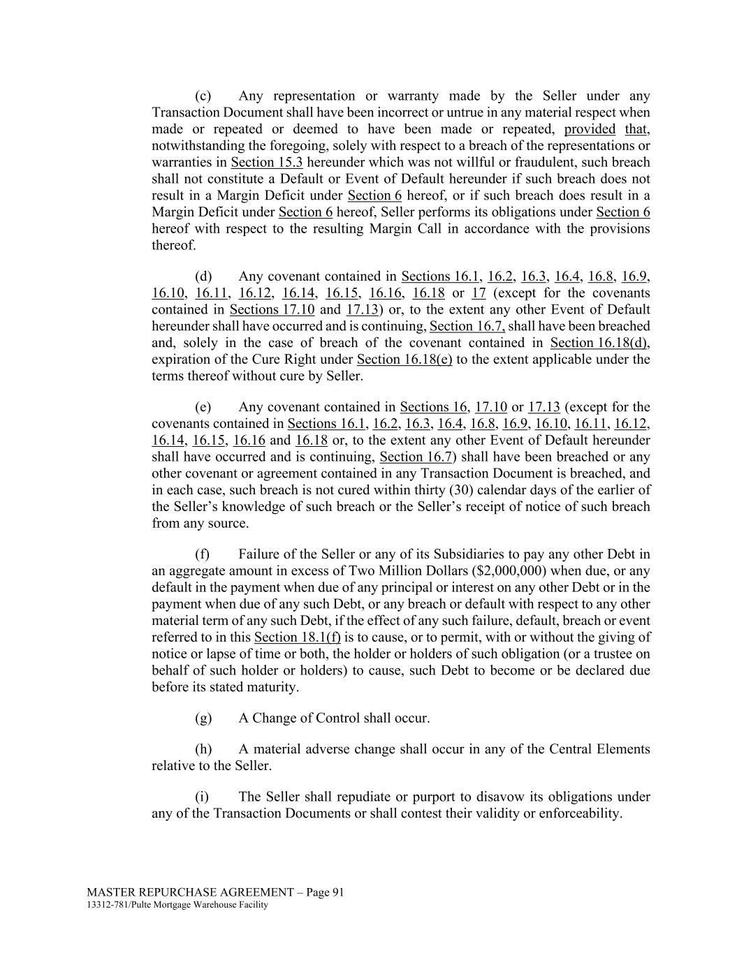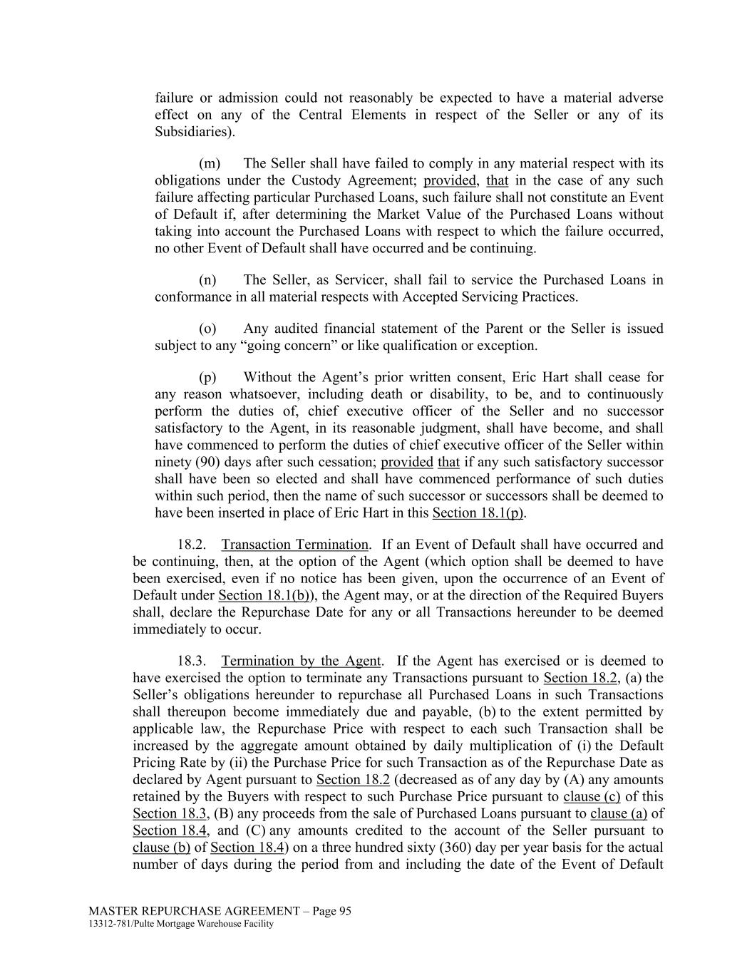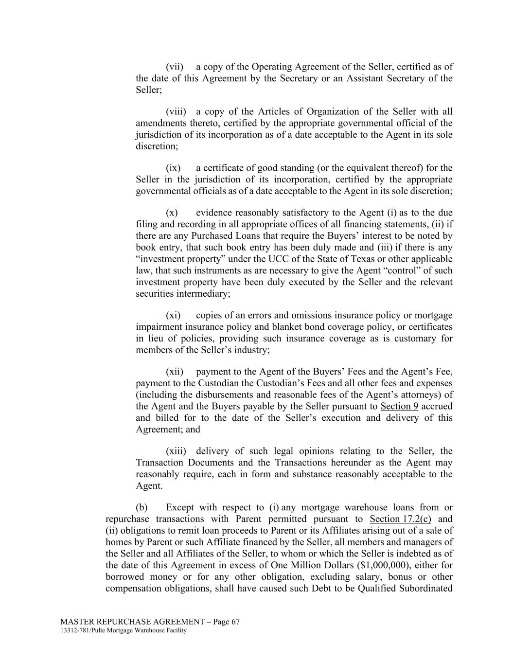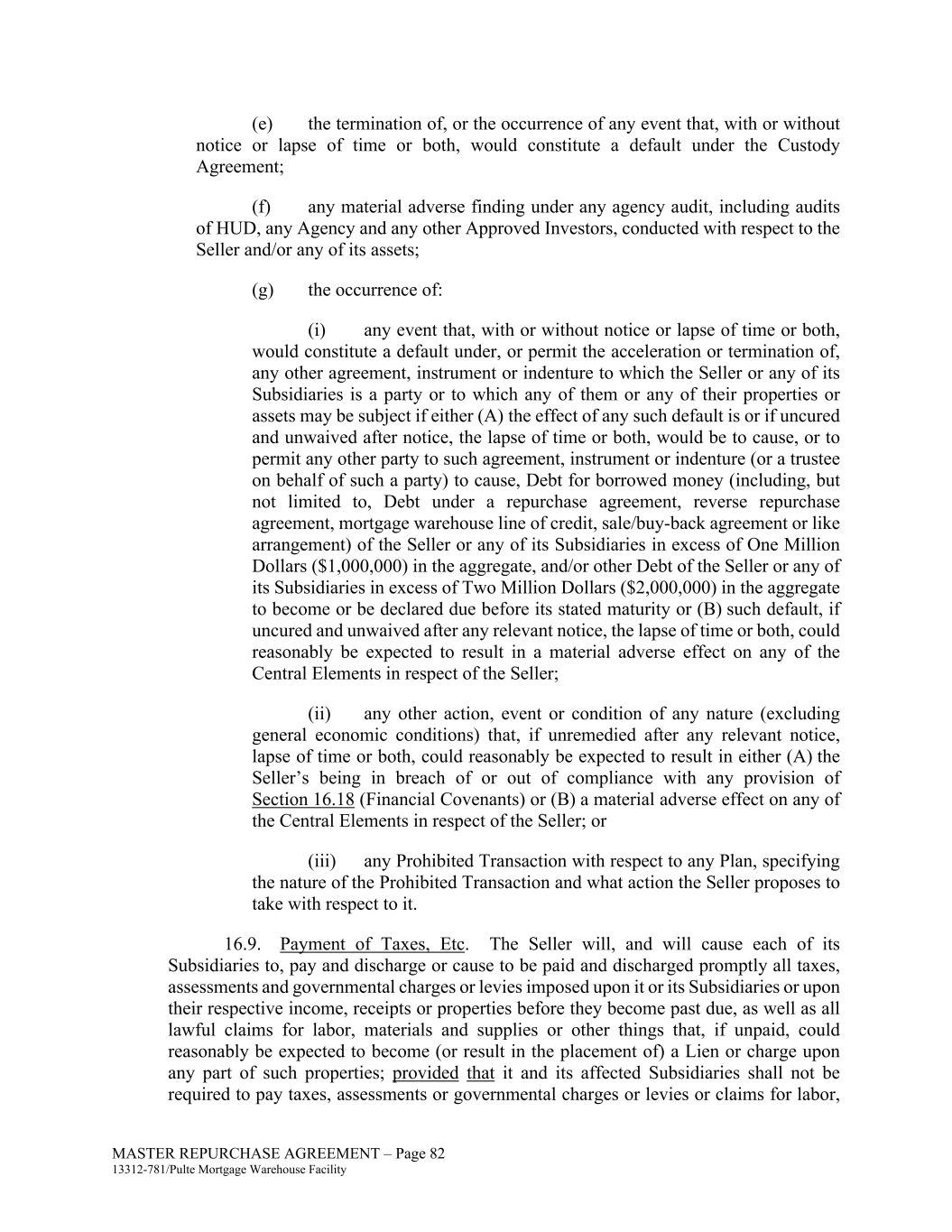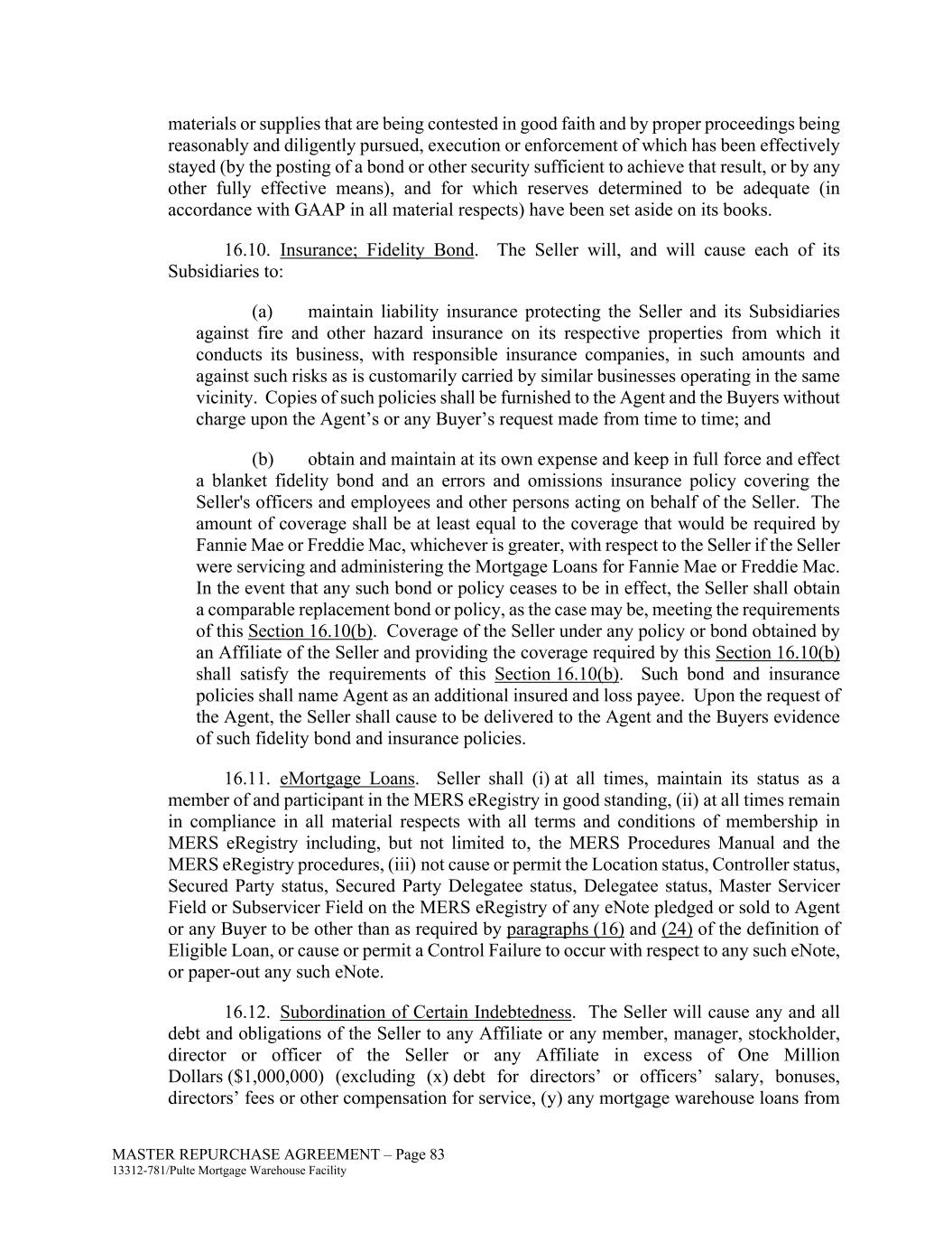 TABLE OF CONTENTS Page iv 13312-781/Pulte Mortgage Warehouse Facility 16.12. Subordination of Certain Indebtedness ..................................................................... 83 16.13. Certain Debt to Remain Unsecured .......................................................................... 84 16.14. Promptly Correct Escrow Imbalances ...................................................................... 84 16.15. MERS Covenants ...................................................................................................... 84 16.16. Special Affirmative Covenants Concerning Purchased Loans ................................. 85 16.17. Coordination with Other Lenders/Repo Purchasers and Their Custodians .............. 86 16.18. Financial Covenants .................................................................................................. 86 16.19. Underwriting Guidelines ........................................................................................... 87 Section 17. Negative Covenants. ............................................................................................. 87 17.1. No Merger ..................................................................................................................... 87 17.2. Limitation on Debt and Contingent Indebtedness ........................................................ 87 17.3. Business ........................................................................................................................ 88 17.4. Liquidations, Dispositions of Substantial Assets .......................................................... 88 17.5. Loans, Advances, and Investments ............................................................................... 88 17.6. Use of Proceeds ............................................................................................................. 89 17.7. Transactions with Affiliates .......................................................................................... 89 17.8. Liens .............................................................................................................................. 89 17.9. ERISA Plans ................................................................................................................. 89 17.10. Change of Principal Office ....................................................................................... 89 17.11. Distributions .............................................................................................................. 90 17.12. Limitations on Payments of Certain Debt ................................................................. 90 17.13. No Changes in Accounting Practices or Fiscal Year ................................................ 90 17.14. No Changes to Underwriting Guidelines .................................................................. 90 Section 18. Events of Default; Event of Termination. ............................................................. 90 18.1. Events of Default .......................................................................................................... 90 18.2. Transaction Termination ............................................................................................... 93 18.3. Termination by the Agent ............................................................................................. 93 18.4. Remedies ....................................................................................................................... 93 18.5. Liability for Expenses and Damages ............................................................................ 94 18.6. Liability for Interest ...................................................................................................... 94 18.7. Other Rights .................................................................................................................. 94 18.8. Seller’s Repurchase Rights ........................................................................................... 94 18.9. Sale of Purchased Loans ............................................................................................... 95