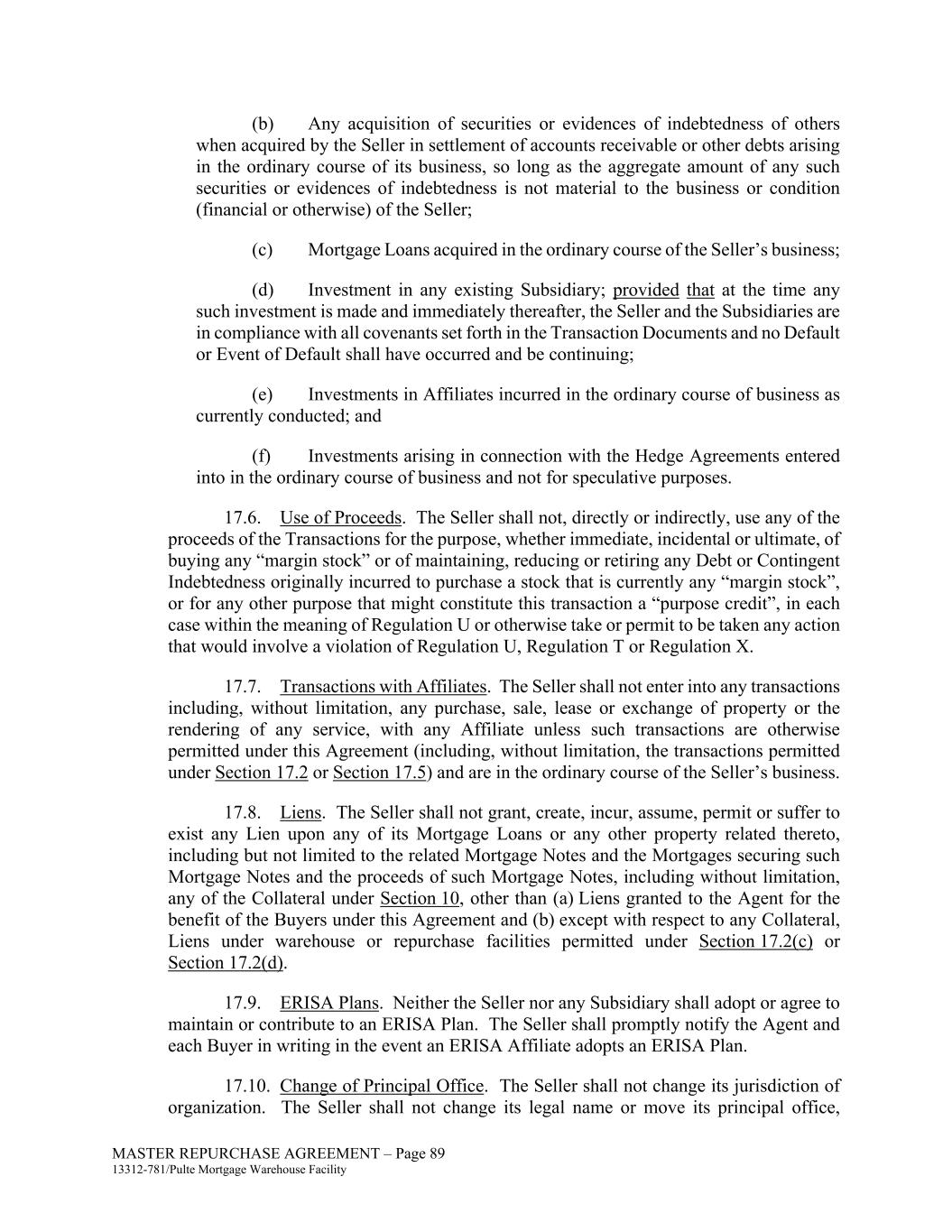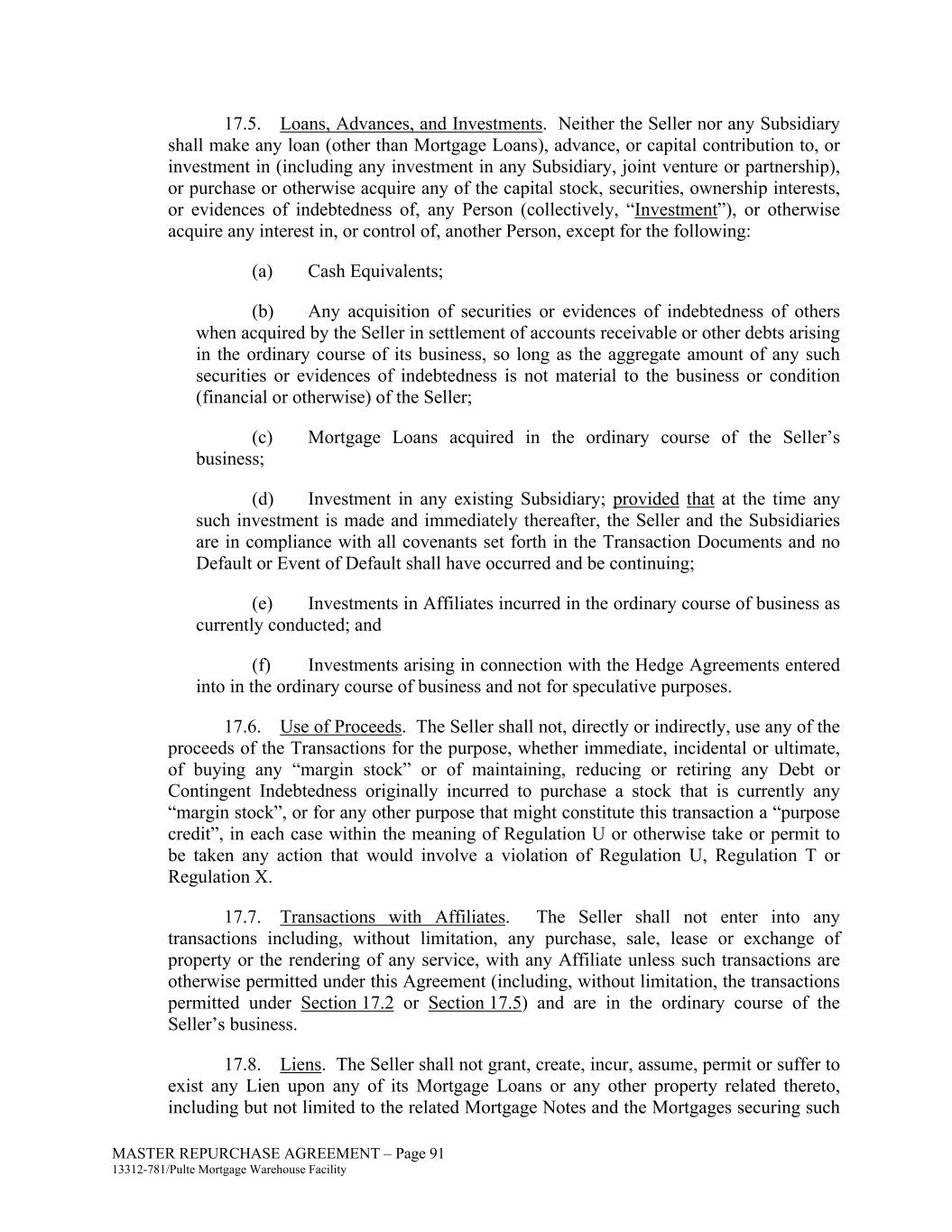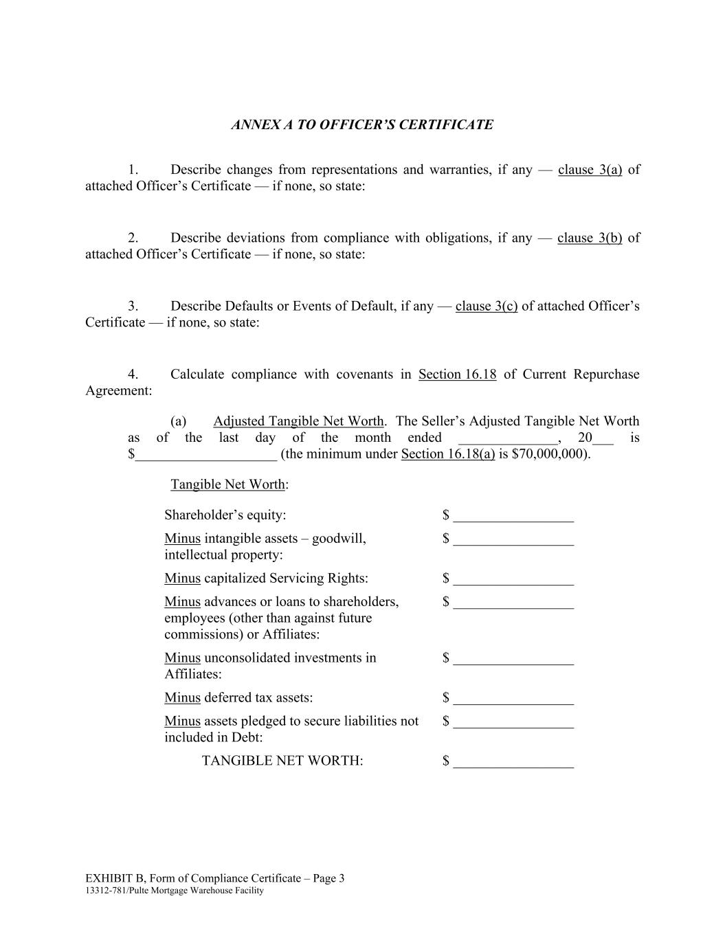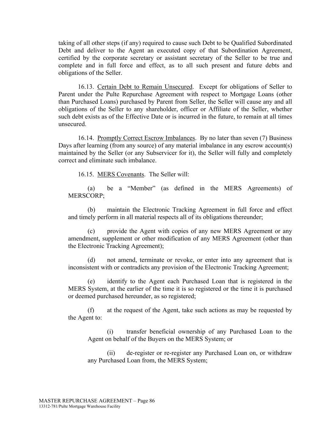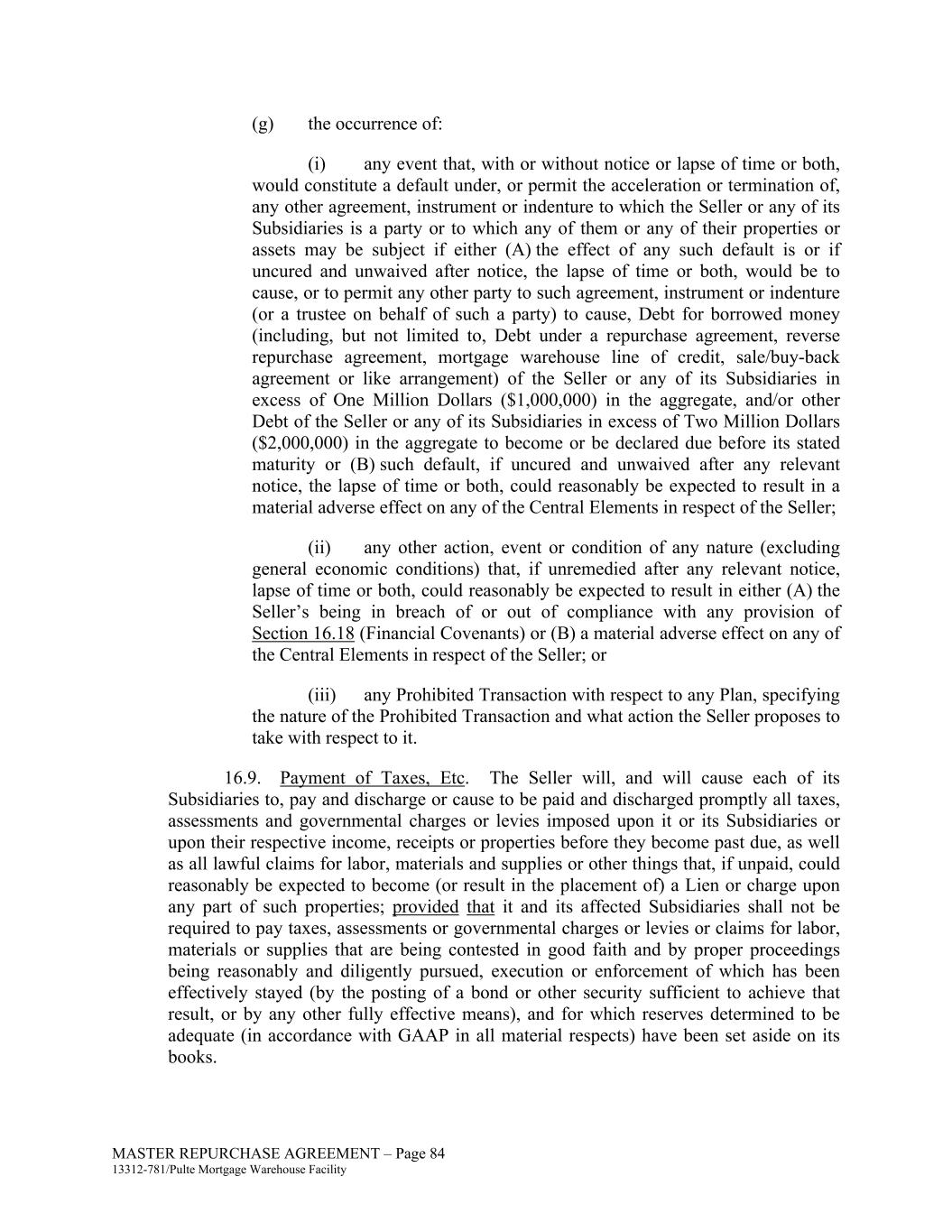 TABLE OF CONTENTS Page iv 13312-781/Pulte Mortgage Warehouse Facility 16.12. Subordination of Certain Indebtedness ..................................................................... 83 16.13. Certain Debt to Remain Unsecured .......................................................................... 84 16.14. Promptly Correct Escrow Imbalances ...................................................................... 84 16.15. MERS Covenants ...................................................................................................... 84 16.16. Special Affirmative Covenants Concerning Purchased Loans ................................. 85 16.17. Coordination with Other Lenders/Repo Purchasers and Their Custodians .............. 86 16.18. Financial Covenants .................................................................................................. 86 16.19. Underwriting Guidelines ........................................................................................... 87 Section 17. Negative Covenants. ............................................................................................. 87 17.1. No Merger ..................................................................................................................... 87 17.2. Limitation on Debt and Contingent Indebtedness ........................................................ 87 17.3. Business ........................................................................................................................ 88 17.4. Liquidations, Dispositions of Substantial Assets .......................................................... 88 17.5. Loans, Advances, and Investments ............................................................................... 88 17.6. Use of Proceeds ............................................................................................................. 89 17.7. Transactions with Affiliates .......................................................................................... 89 17.8. Liens .............................................................................................................................. 89 17.9. ERISA Plans ................................................................................................................. 89 17.10. Change of Principal Office ....................................................................................... 89 17.11. Distributions .............................................................................................................. 90 17.12. Limitations on Payments of Certain Debt ................................................................. 90 17.13. No Changes in Accounting Practices or Fiscal Year ................................................ 90 17.14. No Changes to Underwriting Guidelines .................................................................. 90 Section 18. Events of Default; Event of Termination. ............................................................. 90 18.1. Events of Default .......................................................................................................... 90 18.2. Transaction Termination ............................................................................................... 93 18.3. Termination by the Agent ............................................................................................. 93 18.4. Remedies ....................................................................................................................... 93 18.5. Liability for Expenses and Damages ............................................................................ 94 18.6. Liability for Interest ...................................................................................................... 94 18.7. Other Rights .................................................................................................................. 94 18.8. Seller’s Repurchase Rights ........................................................................................... 94 18.9. Sale of Purchased Loans ............................................................................................... 95