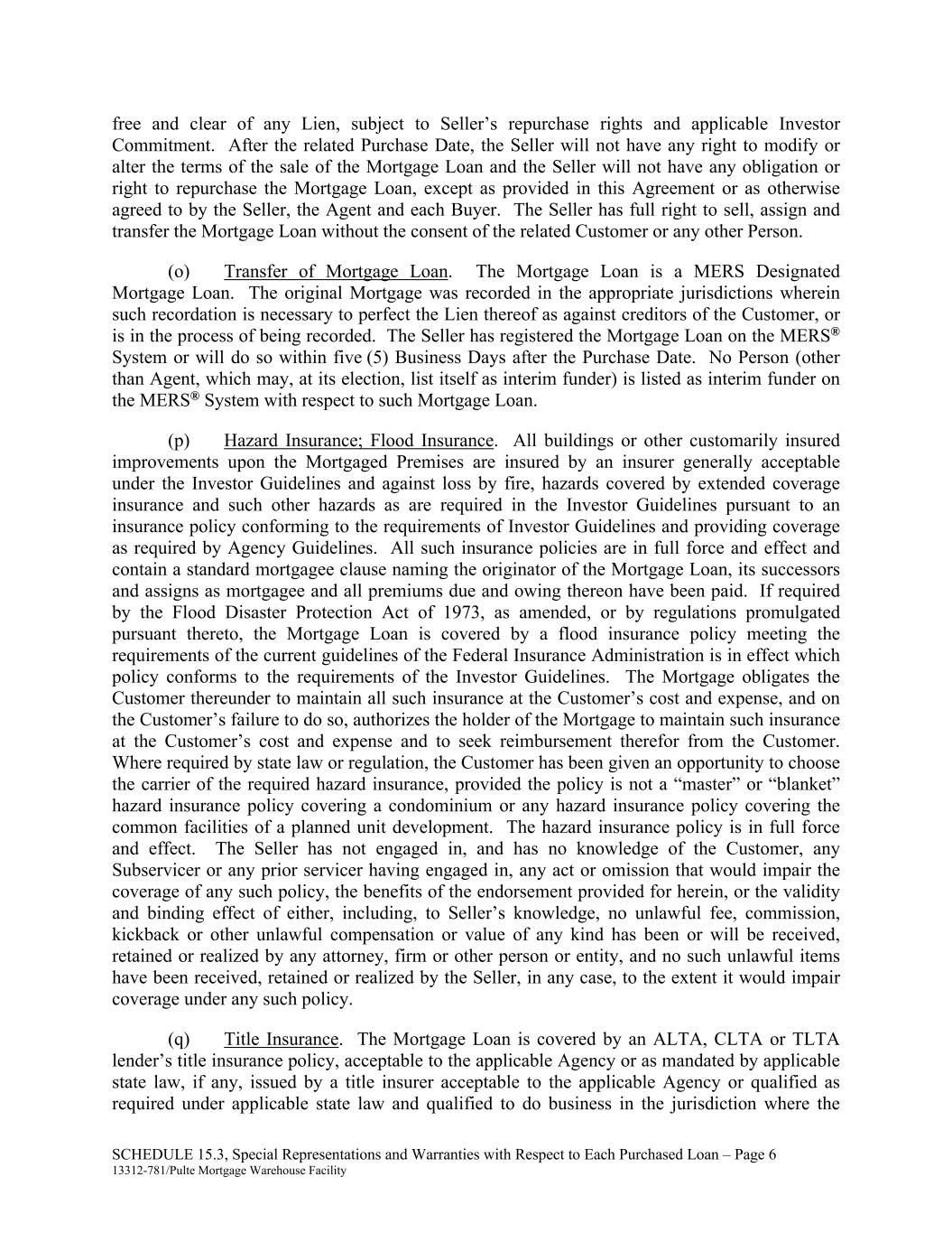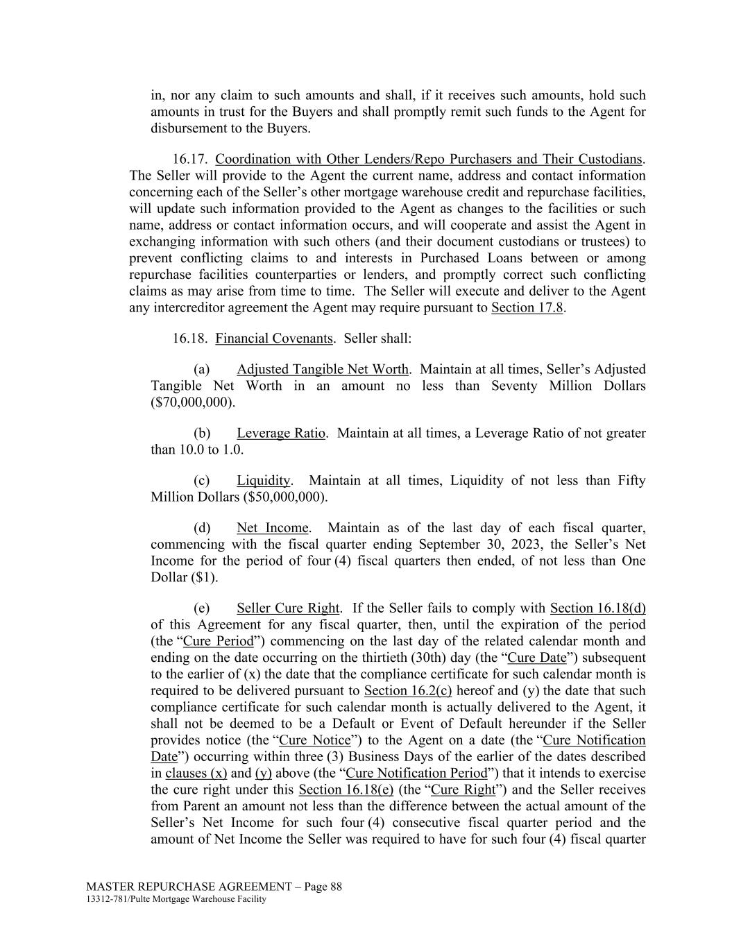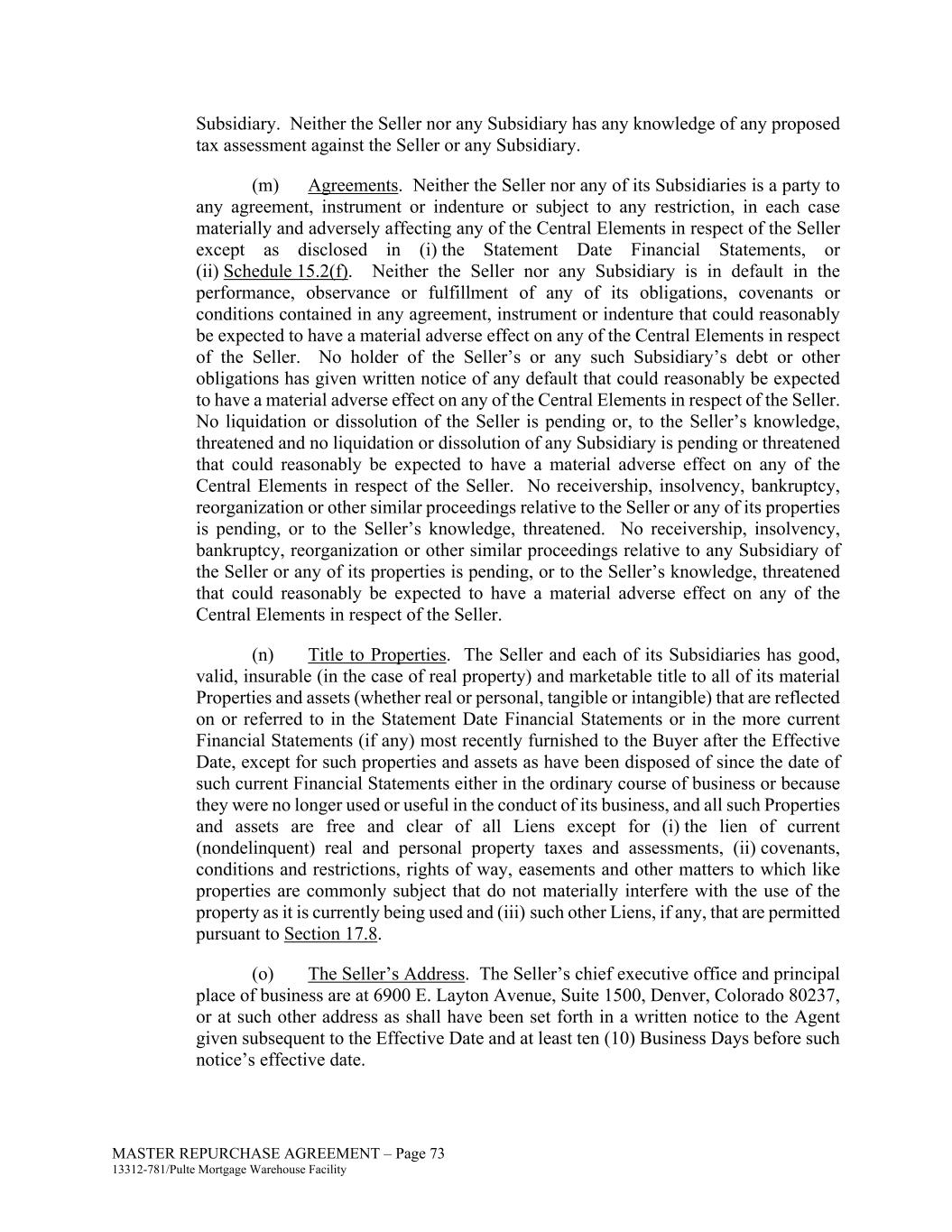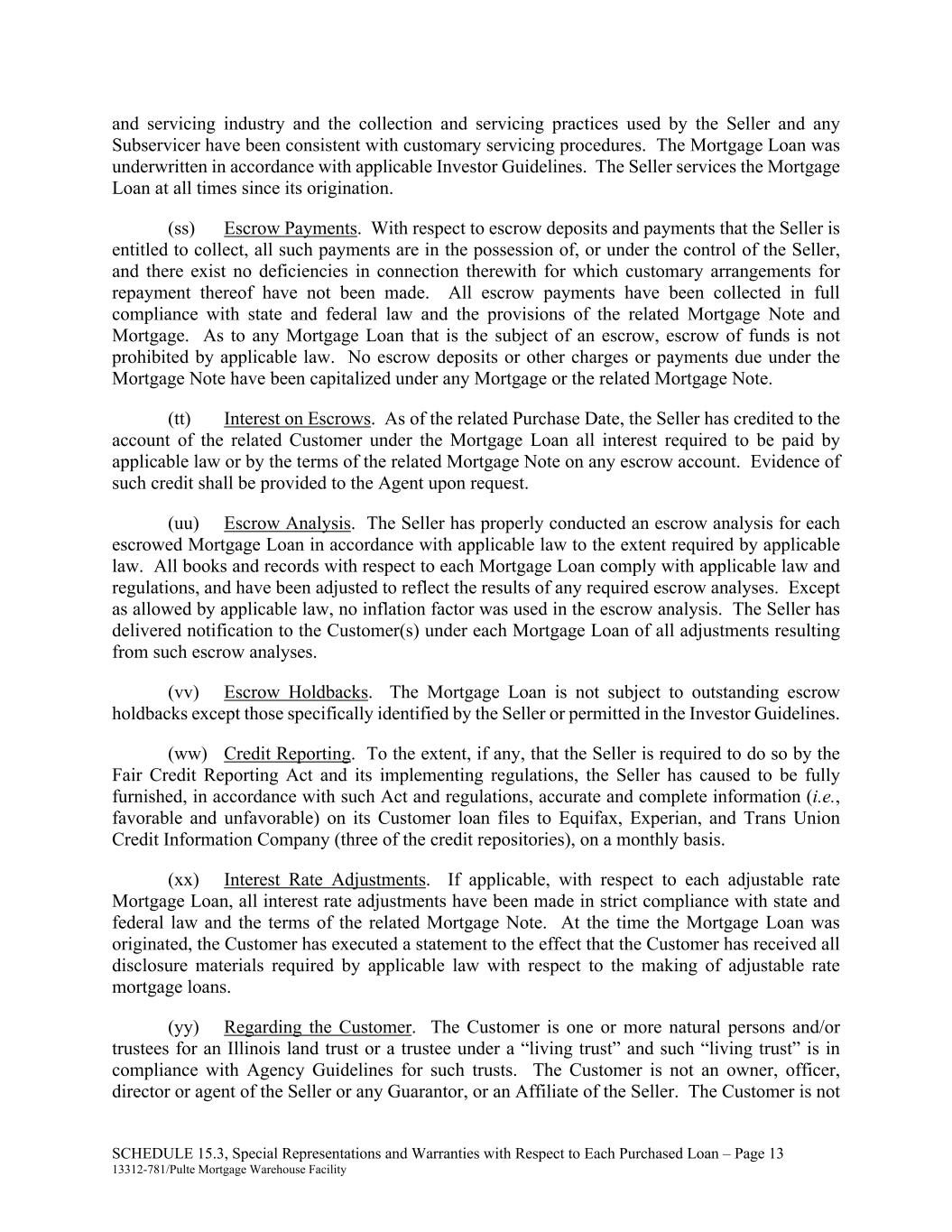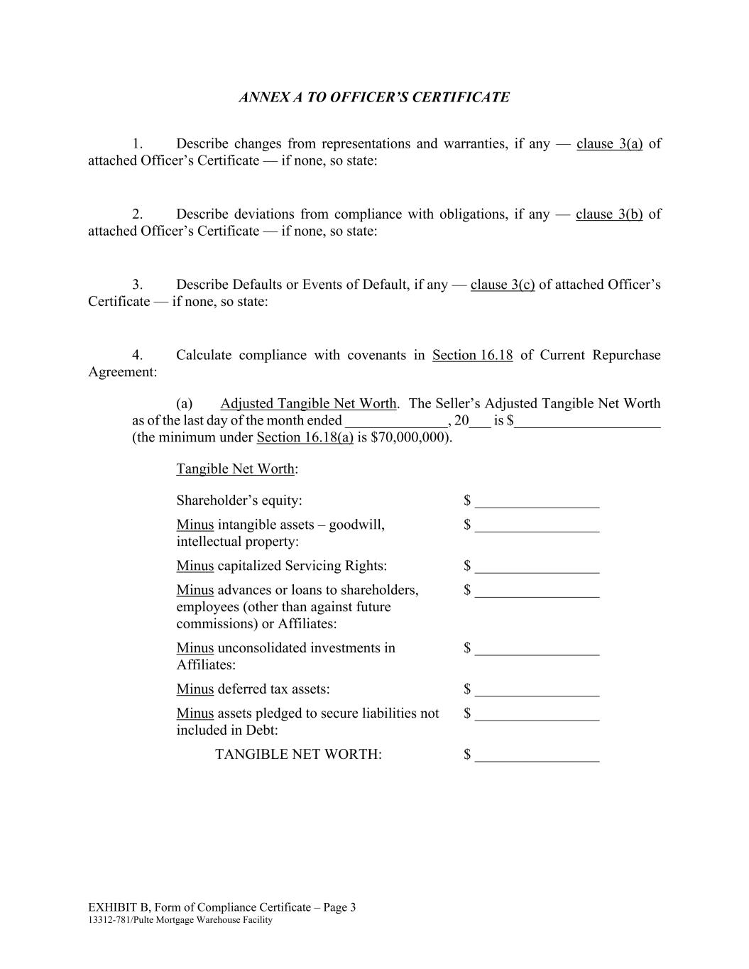 TABLE OF CONTENTS Page iv 13312-781/Pulte Mortgage Warehouse Facility 16.12. Subordination of Certain Indebtedness ..................................................................... 83 16.13. Certain Debt to Remain Unsecured .......................................................................... 84 16.14. Promptly Correct Escrow Imbalances ...................................................................... 84 16.15. MERS Covenants ...................................................................................................... 84 16.16. Special Affirmative Covenants Concerning Purchased Loans ................................. 85 16.17. Coordination with Other Lenders/Repo Purchasers and Their Custodians .............. 86 16.18. Financial Covenants .................................................................................................. 86 16.19. Underwriting Guidelines ........................................................................................... 87 Section 17. Negative Covenants. ............................................................................................. 87 17.1. No Merger ..................................................................................................................... 87 17.2. Limitation on Debt and Contingent Indebtedness ........................................................ 87 17.3. Business ........................................................................................................................ 88 17.4. Liquidations, Dispositions of Substantial Assets .......................................................... 88 17.5. Loans, Advances, and Investments ............................................................................... 88 17.6. Use of Proceeds ............................................................................................................. 89 17.7. Transactions with Affiliates .......................................................................................... 89 17.8. Liens .............................................................................................................................. 89 17.9. ERISA Plans ................................................................................................................. 89 17.10. Change of Principal Office ....................................................................................... 89 17.11. Distributions .............................................................................................................. 90 17.12. Limitations on Payments of Certain Debt ................................................................. 90 17.13. No Changes in Accounting Practices or Fiscal Year ................................................ 90 17.14. No Changes to Underwriting Guidelines .................................................................. 90 Section 18. Events of Default; Event of Termination. ............................................................. 90 18.1. Events of Default .......................................................................................................... 90 18.2. Transaction Termination ............................................................................................... 93 18.3. Termination by the Agent ............................................................................................. 93 18.4. Remedies ....................................................................................................................... 93 18.5. Liability for Expenses and Damages ............................................................................ 94 18.6. Liability for Interest ...................................................................................................... 94 18.7. Other Rights .................................................................................................................. 94 18.8. Seller’s Repurchase Rights ........................................................................................... 94 18.9. Sale of Purchased Loans ............................................................................................... 95