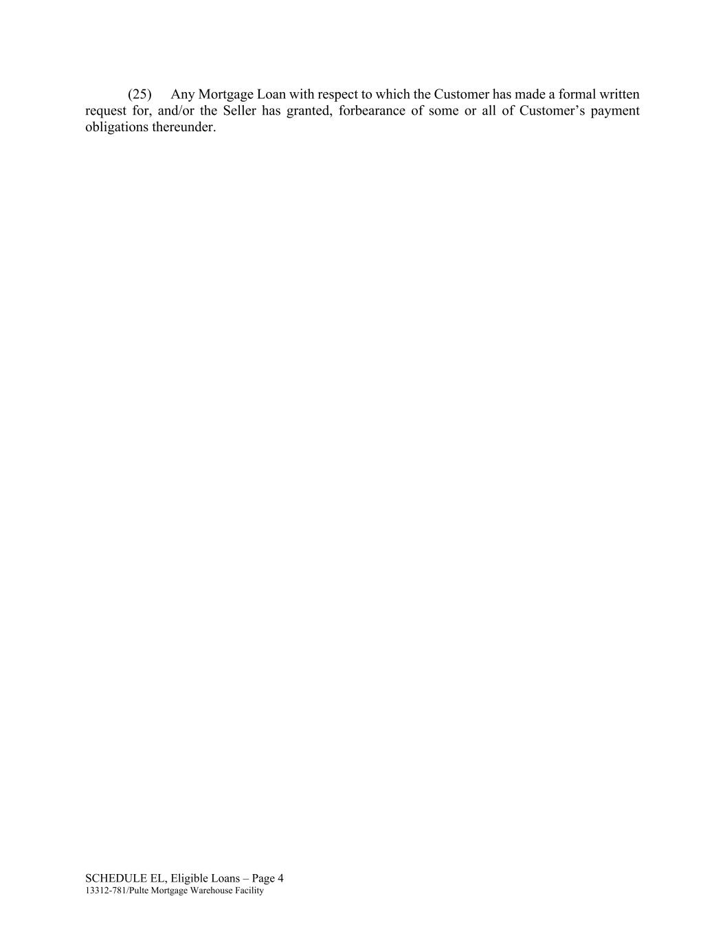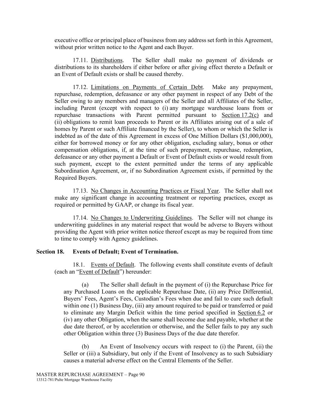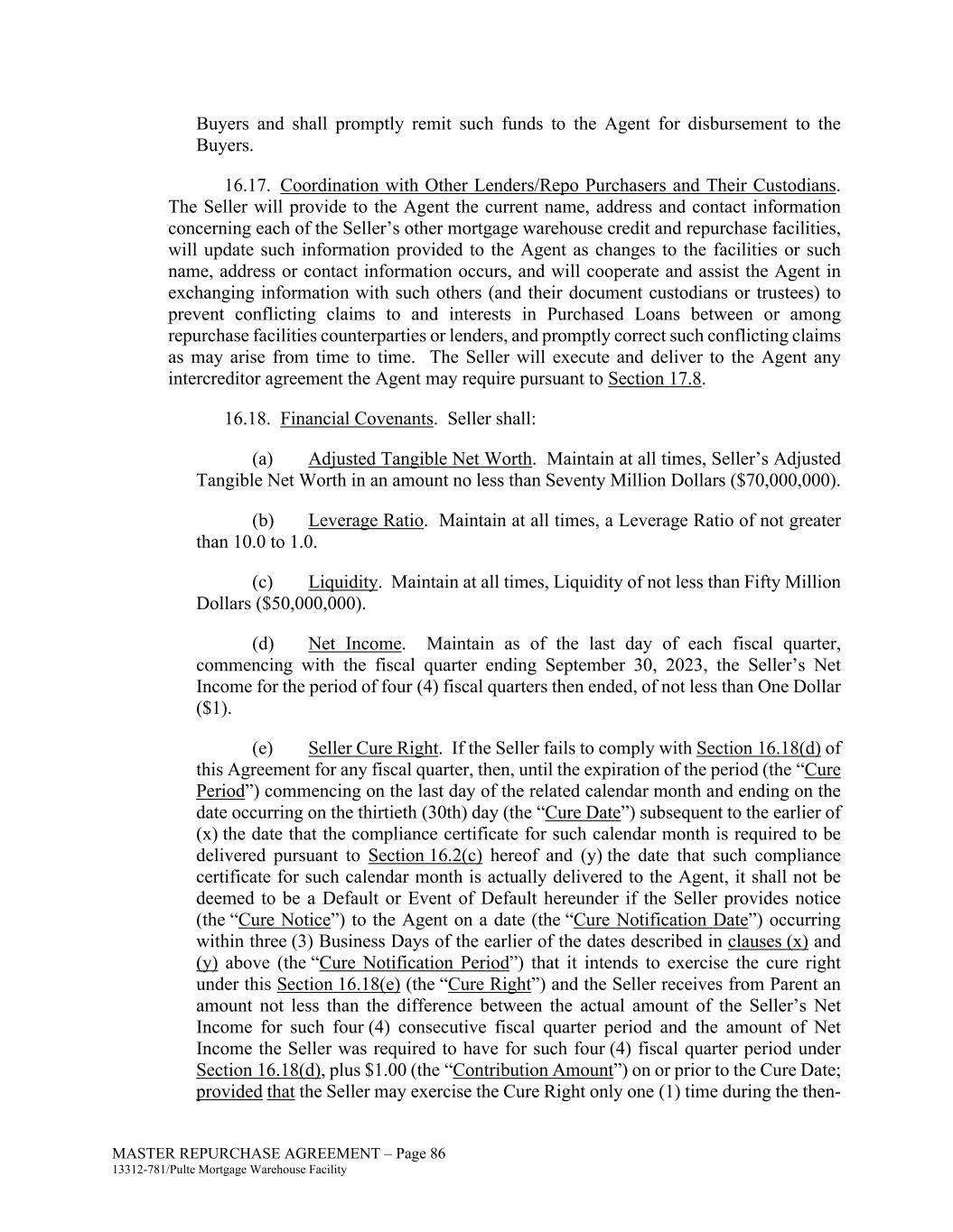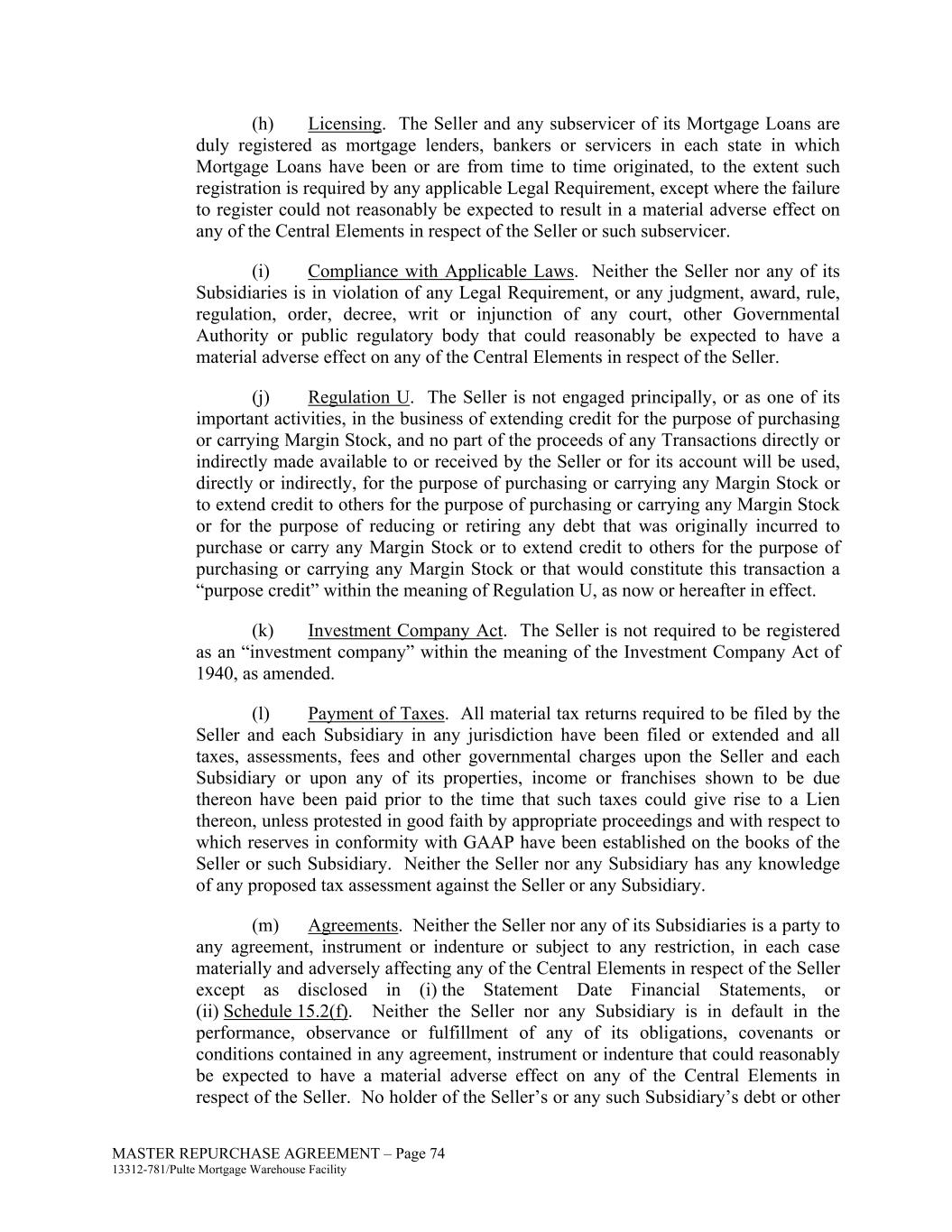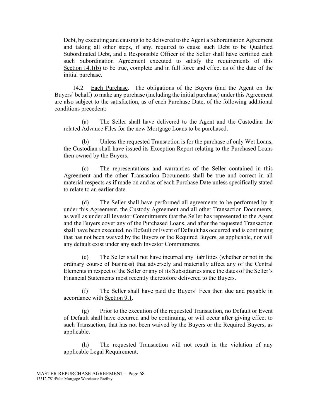 TABLE OF CONTENTS Page iv 13312-781/Pulte Mortgage Warehouse Facility 16.12. Subordination of Certain Indebtedness ..................................................................... 83 16.13. Certain Debt to Remain Unsecured .......................................................................... 84 16.14. Promptly Correct Escrow Imbalances ...................................................................... 84 16.15. MERS Covenants ...................................................................................................... 84 16.16. Special Affirmative Covenants Concerning Purchased Loans ................................. 85 16.17. Coordination with Other Lenders/Repo Purchasers and Their Custodians .............. 86 16.18. Financial Covenants .................................................................................................. 86 16.19. Underwriting Guidelines ........................................................................................... 87 Section 17. Negative Covenants. ............................................................................................. 87 17.1. No Merger ..................................................................................................................... 87 17.2. Limitation on Debt and Contingent Indebtedness ........................................................ 87 17.3. Business ........................................................................................................................ 88 17.4. Liquidations, Dispositions of Substantial Assets .......................................................... 88 17.5. Loans, Advances, and Investments ............................................................................... 88 17.6. Use of Proceeds ............................................................................................................. 89 17.7. Transactions with Affiliates .......................................................................................... 89 17.8. Liens .............................................................................................................................. 89 17.9. ERISA Plans ................................................................................................................. 89 17.10. Change of Principal Office ....................................................................................... 89 17.11. Distributions .............................................................................................................. 90 17.12. Limitations on Payments of Certain Debt ................................................................. 90 17.13. No Changes in Accounting Practices or Fiscal Year ................................................ 90 17.14. No Changes to Underwriting Guidelines .................................................................. 90 Section 18. Events of Default; Event of Termination. ............................................................. 90 18.1. Events of Default .......................................................................................................... 90 18.2. Transaction Termination ............................................................................................... 93 18.3. Termination by the Agent ............................................................................................. 93 18.4. Remedies ....................................................................................................................... 93 18.5. Liability for Expenses and Damages ............................................................................ 94 18.6. Liability for Interest ...................................................................................................... 94 18.7. Other Rights .................................................................................................................. 94 18.8. Seller’s Repurchase Rights ........................................................................................... 94 18.9. Sale of Purchased Loans ............................................................................................... 95