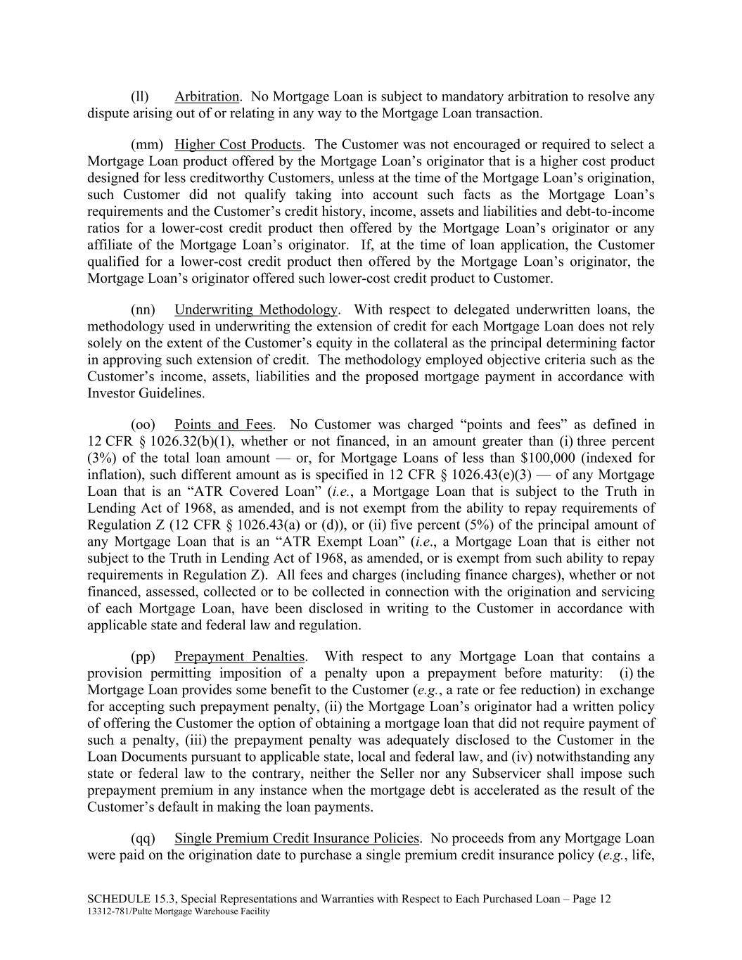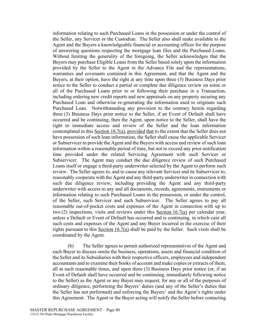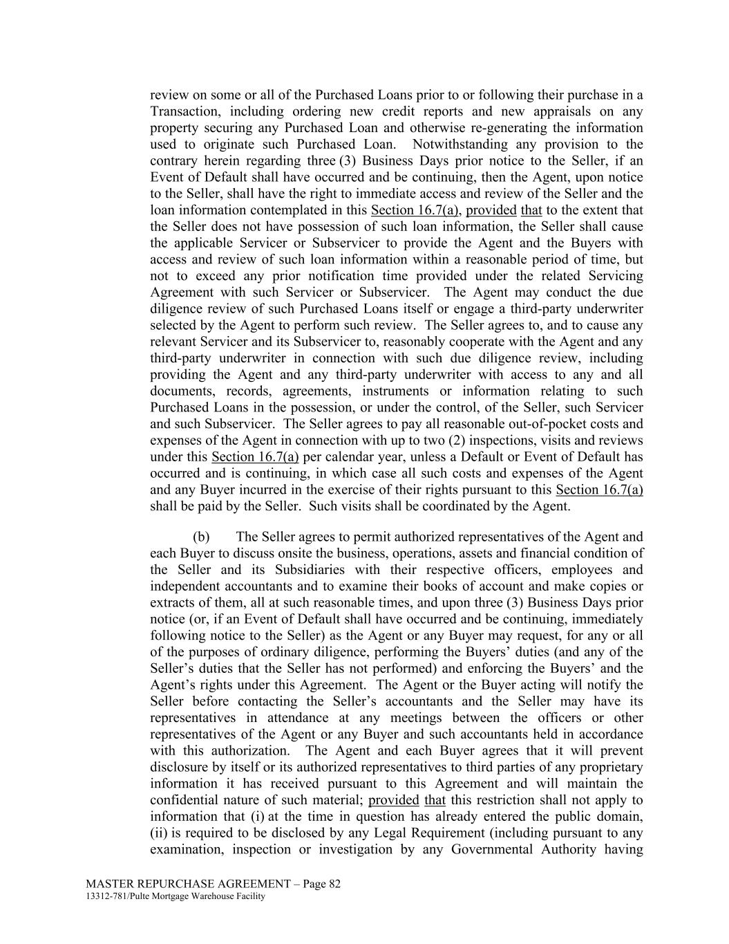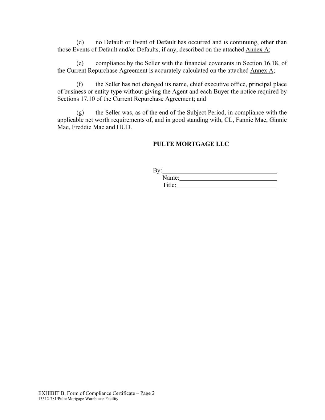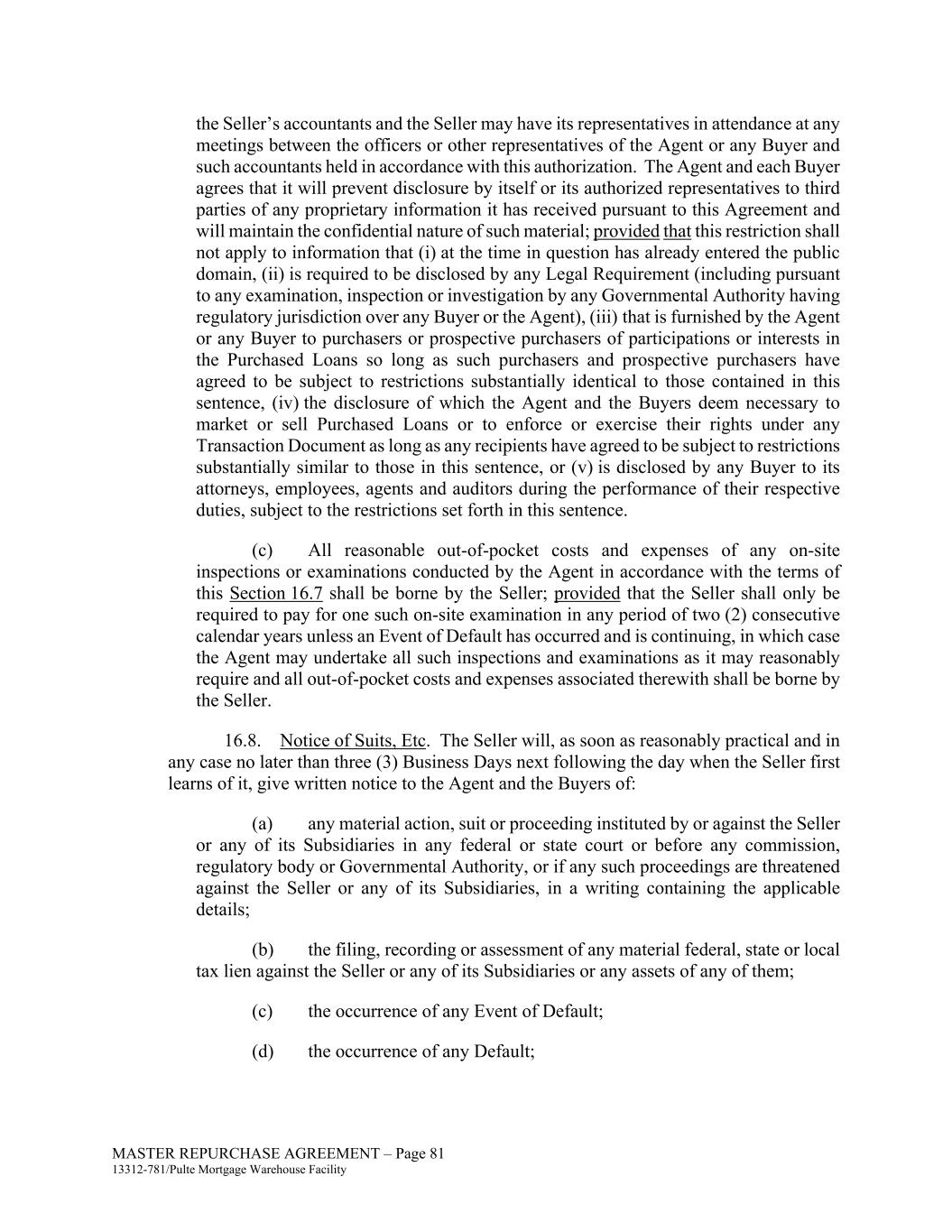 TABLE OF CONTENTS Page iv 13312-781/Pulte Mortgage Warehouse Facility 16.12. Subordination of Certain Indebtedness ..................................................................... 83 16.13. Certain Debt to Remain Unsecured .......................................................................... 84 16.14. Promptly Correct Escrow Imbalances ...................................................................... 84 16.15. MERS Covenants ...................................................................................................... 84 16.16. Special Affirmative Covenants Concerning Purchased Loans ................................. 85 16.17. Coordination with Other Lenders/Repo Purchasers and Their Custodians .............. 86 16.18. Financial Covenants .................................................................................................. 86 16.19. Underwriting Guidelines ........................................................................................... 87 Section 17. Negative Covenants. ............................................................................................. 87 17.1. No Merger ..................................................................................................................... 87 17.2. Limitation on Debt and Contingent Indebtedness ........................................................ 87 17.3. Business ........................................................................................................................ 88 17.4. Liquidations, Dispositions of Substantial Assets .......................................................... 88 17.5. Loans, Advances, and Investments ............................................................................... 88 17.6. Use of Proceeds ............................................................................................................. 89 17.7. Transactions with Affiliates .......................................................................................... 89 17.8. Liens .............................................................................................................................. 89 17.9. ERISA Plans ................................................................................................................. 89 17.10. Change of Principal Office ....................................................................................... 89 17.11. Distributions .............................................................................................................. 90 17.12. Limitations on Payments of Certain Debt ................................................................. 90 17.13. No Changes in Accounting Practices or Fiscal Year ................................................ 90 17.14. No Changes to Underwriting Guidelines .................................................................. 90 Section 18. Events of Default; Event of Termination. ............................................................. 90 18.1. Events of Default .......................................................................................................... 90 18.2. Transaction Termination ............................................................................................... 93 18.3. Termination by the Agent ............................................................................................. 93 18.4. Remedies ....................................................................................................................... 93 18.5. Liability for Expenses and Damages ............................................................................ 94 18.6. Liability for Interest ...................................................................................................... 94 18.7. Other Rights .................................................................................................................. 94 18.8. Seller’s Repurchase Rights ........................................................................................... 94 18.9. Sale of Purchased Loans ............................................................................................... 95