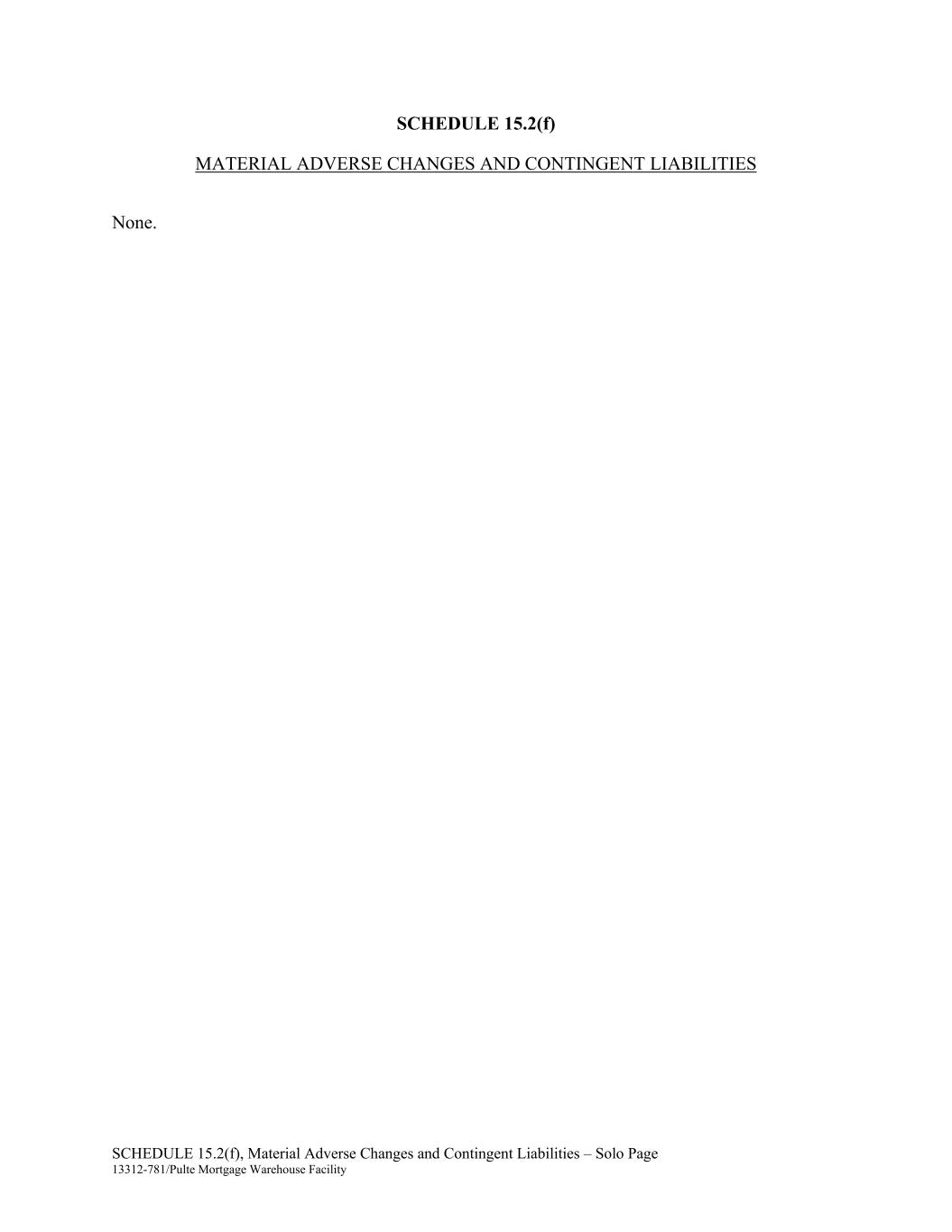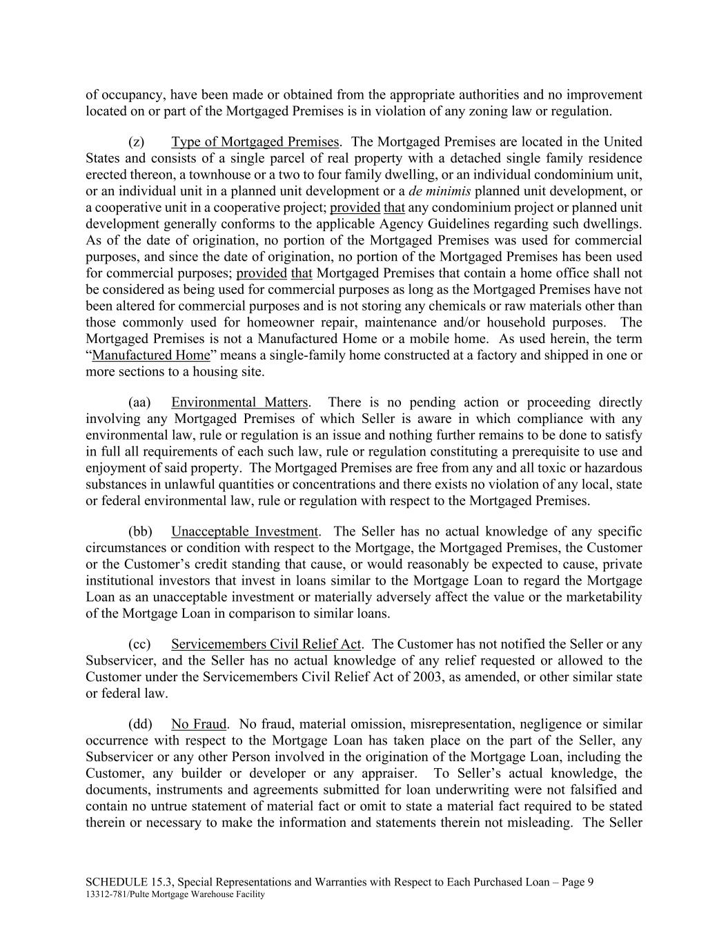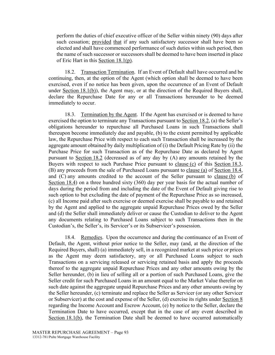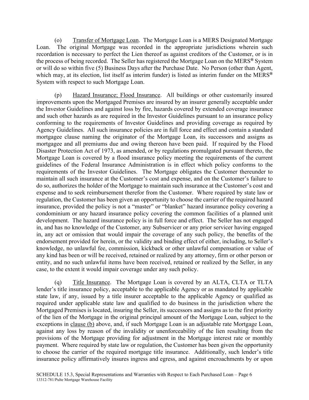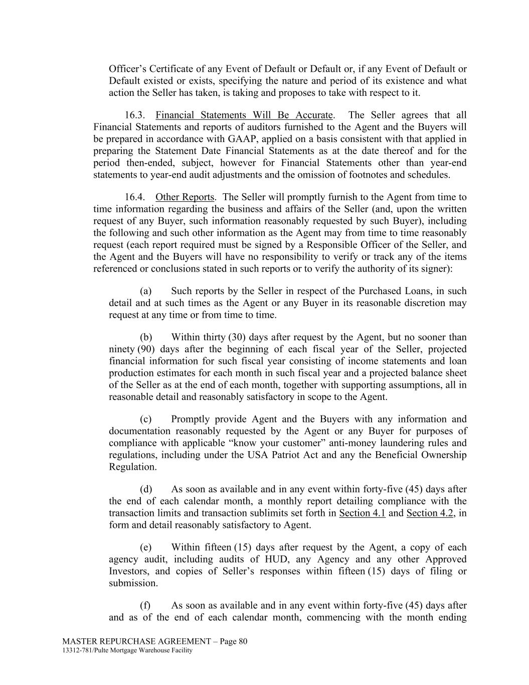 TABLE OF CONTENTS Page iv 13312-781/Pulte Mortgage Warehouse Facility 16.12. Subordination of Certain Indebtedness ..................................................................... 83 16.13. Certain Debt to Remain Unsecured .......................................................................... 84 16.14. Promptly Correct Escrow Imbalances ...................................................................... 84 16.15. MERS Covenants ...................................................................................................... 84 16.16. Special Affirmative Covenants Concerning Purchased Loans ................................. 85 16.17. Coordination with Other Lenders/Repo Purchasers and Their Custodians .............. 86 16.18. Financial Covenants .................................................................................................. 86 16.19. Underwriting Guidelines ........................................................................................... 87 Section 17. Negative Covenants. ............................................................................................. 87 17.1. No Merger ..................................................................................................................... 87 17.2. Limitation on Debt and Contingent Indebtedness ........................................................ 87 17.3. Business ........................................................................................................................ 88 17.4. Liquidations, Dispositions of Substantial Assets .......................................................... 88 17.5. Loans, Advances, and Investments ............................................................................... 88 17.6. Use of Proceeds ............................................................................................................. 89 17.7. Transactions with Affiliates .......................................................................................... 89 17.8. Liens .............................................................................................................................. 89 17.9. ERISA Plans ................................................................................................................. 89 17.10. Change of Principal Office ....................................................................................... 89 17.11. Distributions .............................................................................................................. 90 17.12. Limitations on Payments of Certain Debt ................................................................. 90 17.13. No Changes in Accounting Practices or Fiscal Year ................................................ 90 17.14. No Changes to Underwriting Guidelines .................................................................. 90 Section 18. Events of Default; Event of Termination. ............................................................. 90 18.1. Events of Default .......................................................................................................... 90 18.2. Transaction Termination ............................................................................................... 93 18.3. Termination by the Agent ............................................................................................. 93 18.4. Remedies ....................................................................................................................... 93 18.5. Liability for Expenses and Damages ............................................................................ 94 18.6. Liability for Interest ...................................................................................................... 94 18.7. Other Rights .................................................................................................................. 94 18.8. Seller’s Repurchase Rights ........................................................................................... 94 18.9. Sale of Purchased Loans ............................................................................................... 95