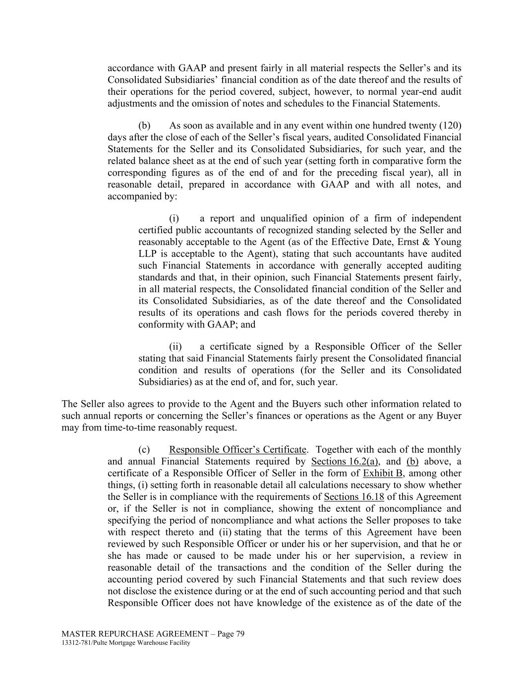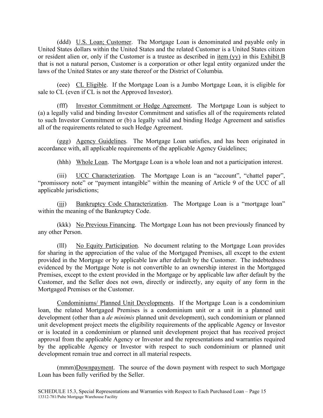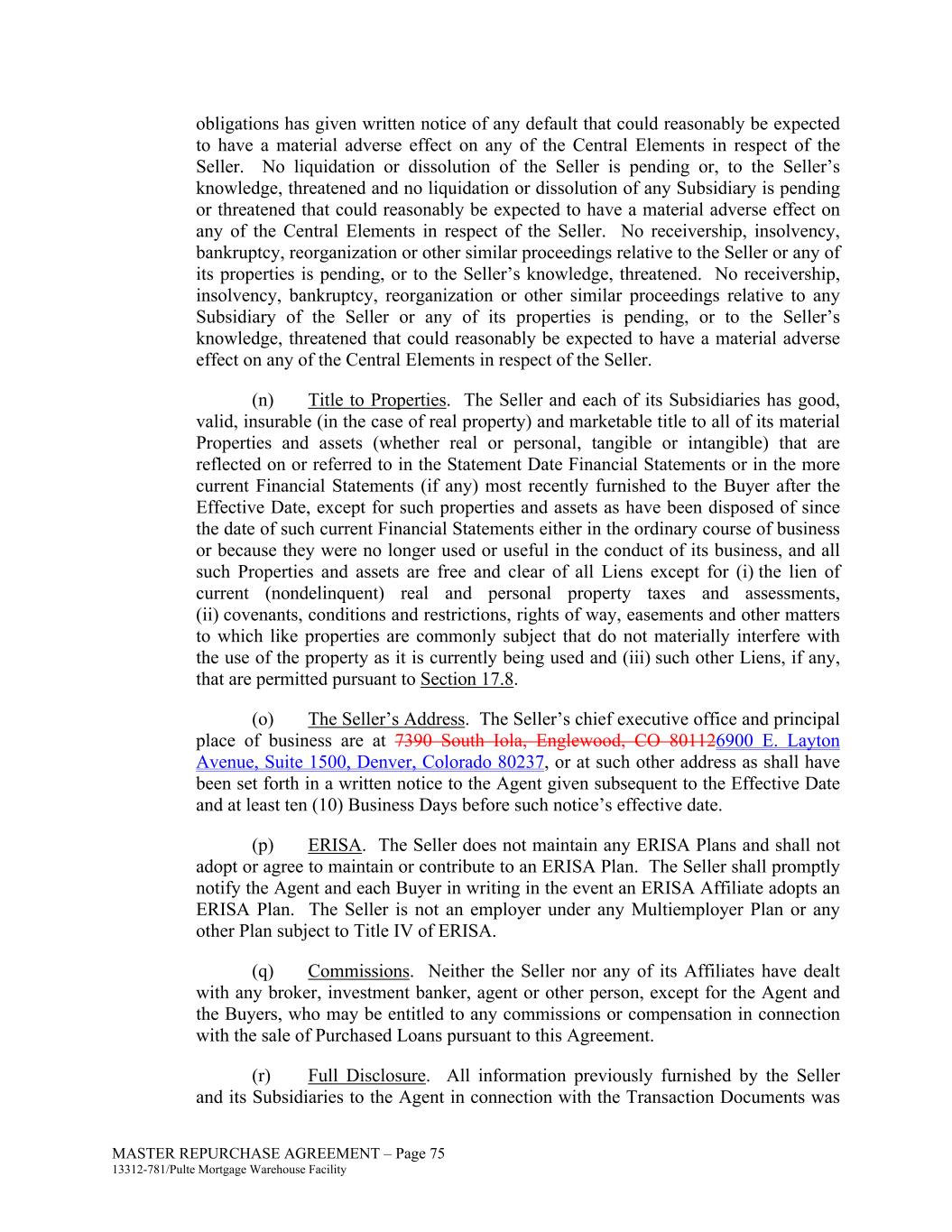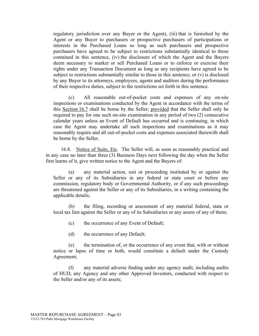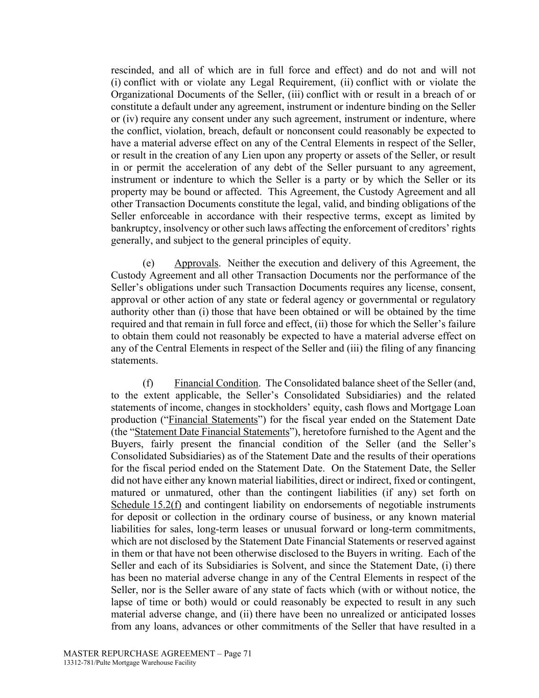 TABLE OF CONTENTS Page iv 13312-781/Pulte Mortgage Warehouse Facility 16.12. Subordination of Certain Indebtedness ..................................................................... 83 16.13. Certain Debt to Remain Unsecured .......................................................................... 84 16.14. Promptly Correct Escrow Imbalances ...................................................................... 84 16.15. MERS Covenants ...................................................................................................... 84 16.16. Special Affirmative Covenants Concerning Purchased Loans ................................. 85 16.17. Coordination with Other Lenders/Repo Purchasers and Their Custodians .............. 86 16.18. Financial Covenants .................................................................................................. 86 16.19. Underwriting Guidelines ........................................................................................... 87 Section 17. Negative Covenants. ............................................................................................. 87 17.1. No Merger ..................................................................................................................... 87 17.2. Limitation on Debt and Contingent Indebtedness ........................................................ 87 17.3. Business ........................................................................................................................ 88 17.4. Liquidations, Dispositions of Substantial Assets .......................................................... 88 17.5. Loans, Advances, and Investments ............................................................................... 88 17.6. Use of Proceeds ............................................................................................................. 89 17.7. Transactions with Affiliates .......................................................................................... 89 17.8. Liens .............................................................................................................................. 89 17.9. ERISA Plans ................................................................................................................. 89 17.10. Change of Principal Office ....................................................................................... 89 17.11. Distributions .............................................................................................................. 90 17.12. Limitations on Payments of Certain Debt ................................................................. 90 17.13. No Changes in Accounting Practices or Fiscal Year ................................................ 90 17.14. No Changes to Underwriting Guidelines .................................................................. 90 Section 18. Events of Default; Event of Termination. ............................................................. 90 18.1. Events of Default .......................................................................................................... 90 18.2. Transaction Termination ............................................................................................... 93 18.3. Termination by the Agent ............................................................................................. 93 18.4. Remedies ....................................................................................................................... 93 18.5. Liability for Expenses and Damages ............................................................................ 94 18.6. Liability for Interest ...................................................................................................... 94 18.7. Other Rights .................................................................................................................. 94 18.8. Seller’s Repurchase Rights ........................................................................................... 94 18.9. Sale of Purchased Loans ............................................................................................... 95