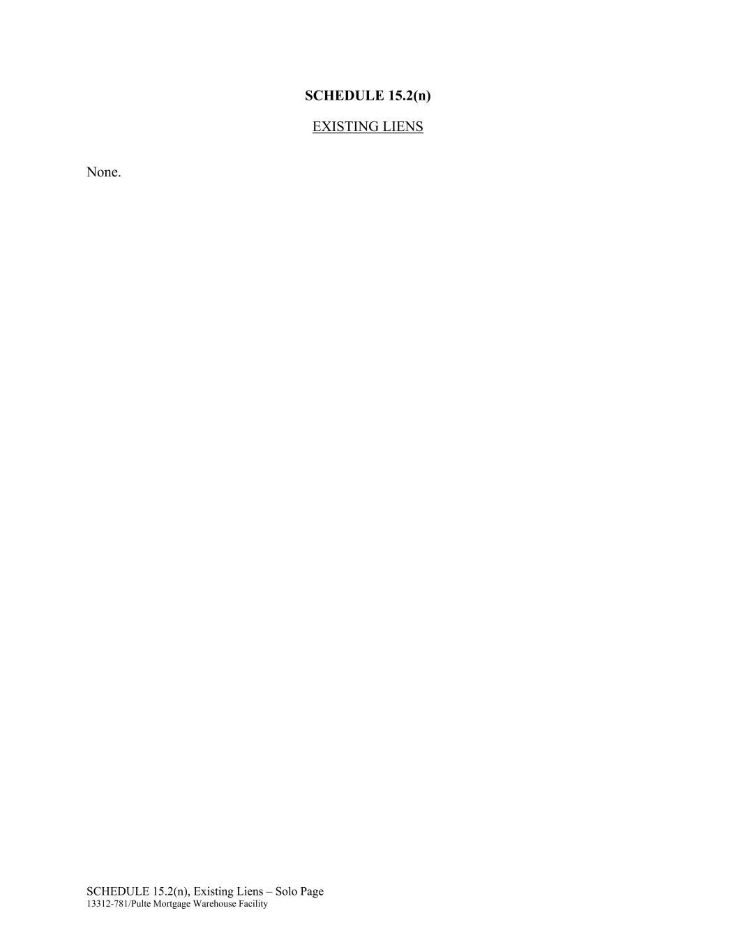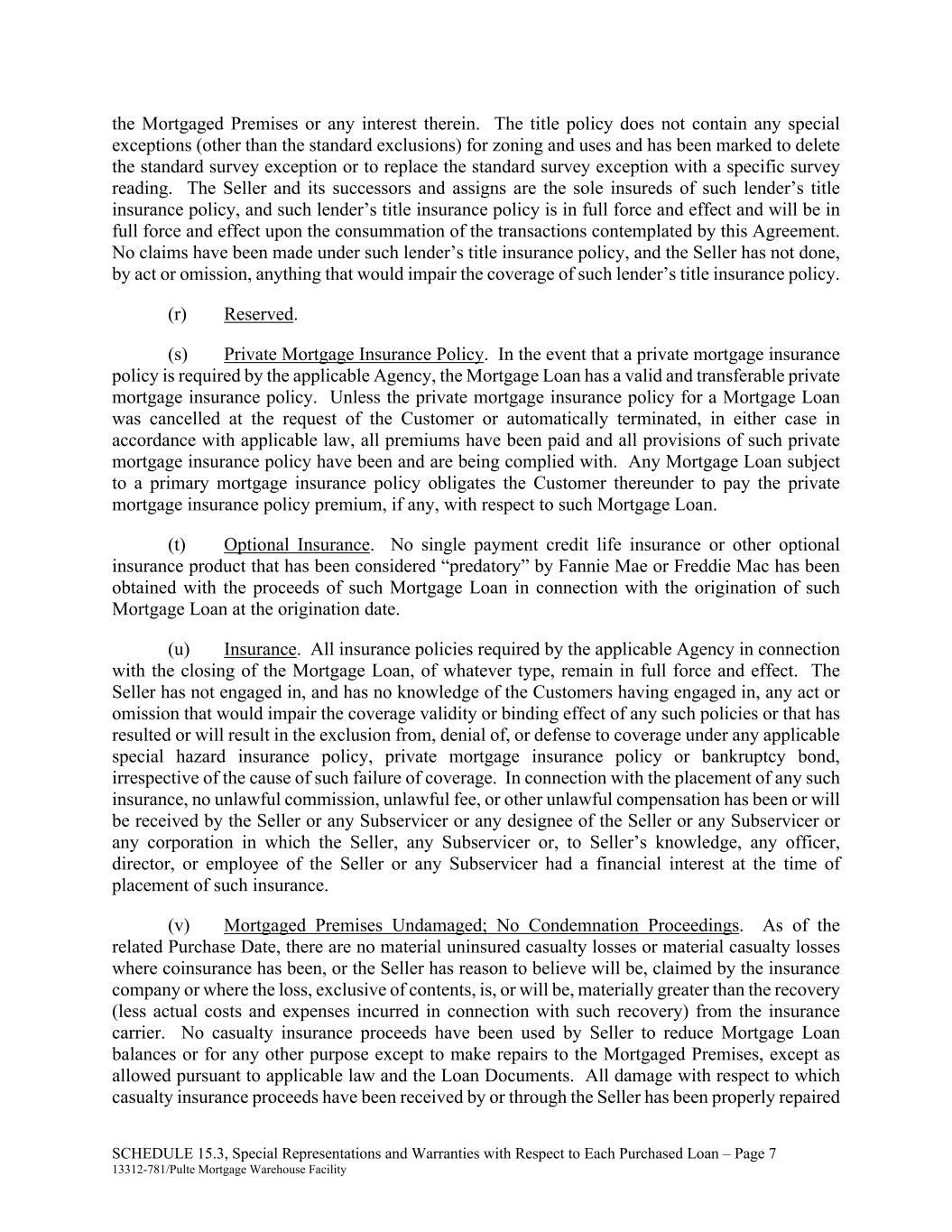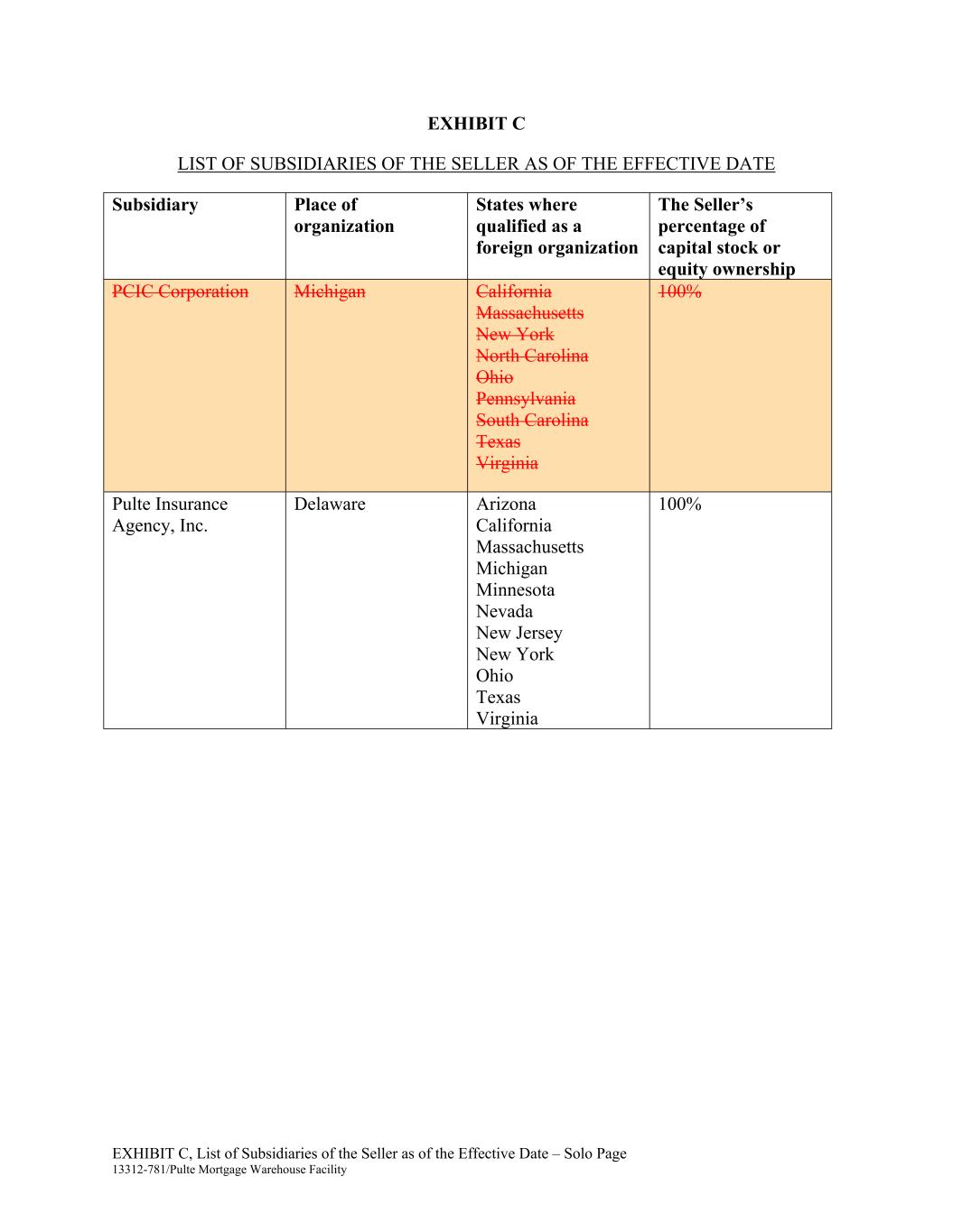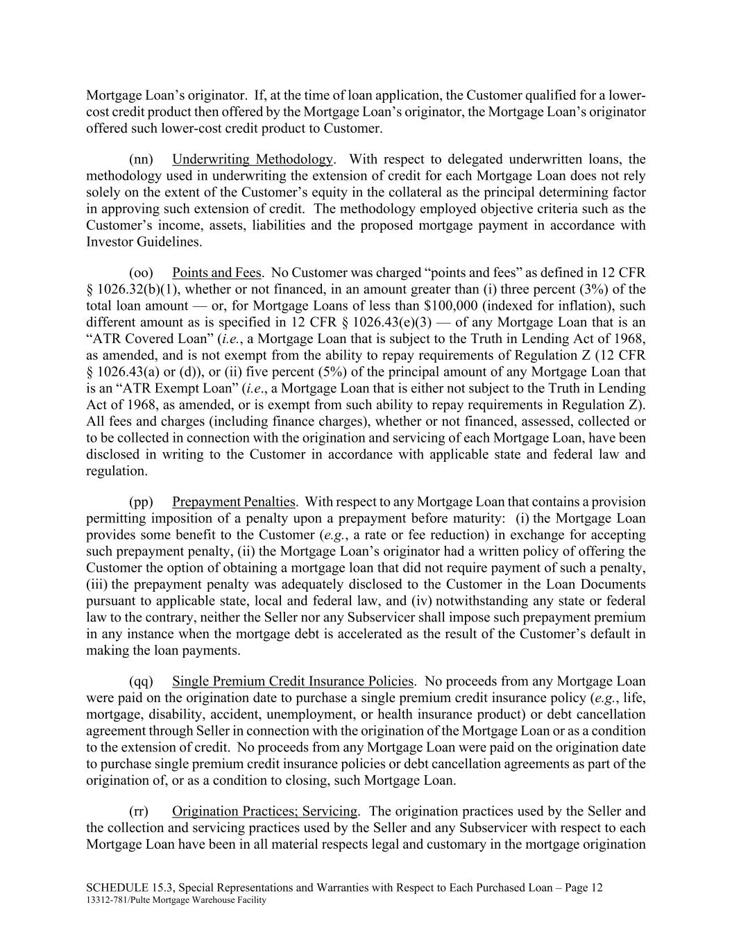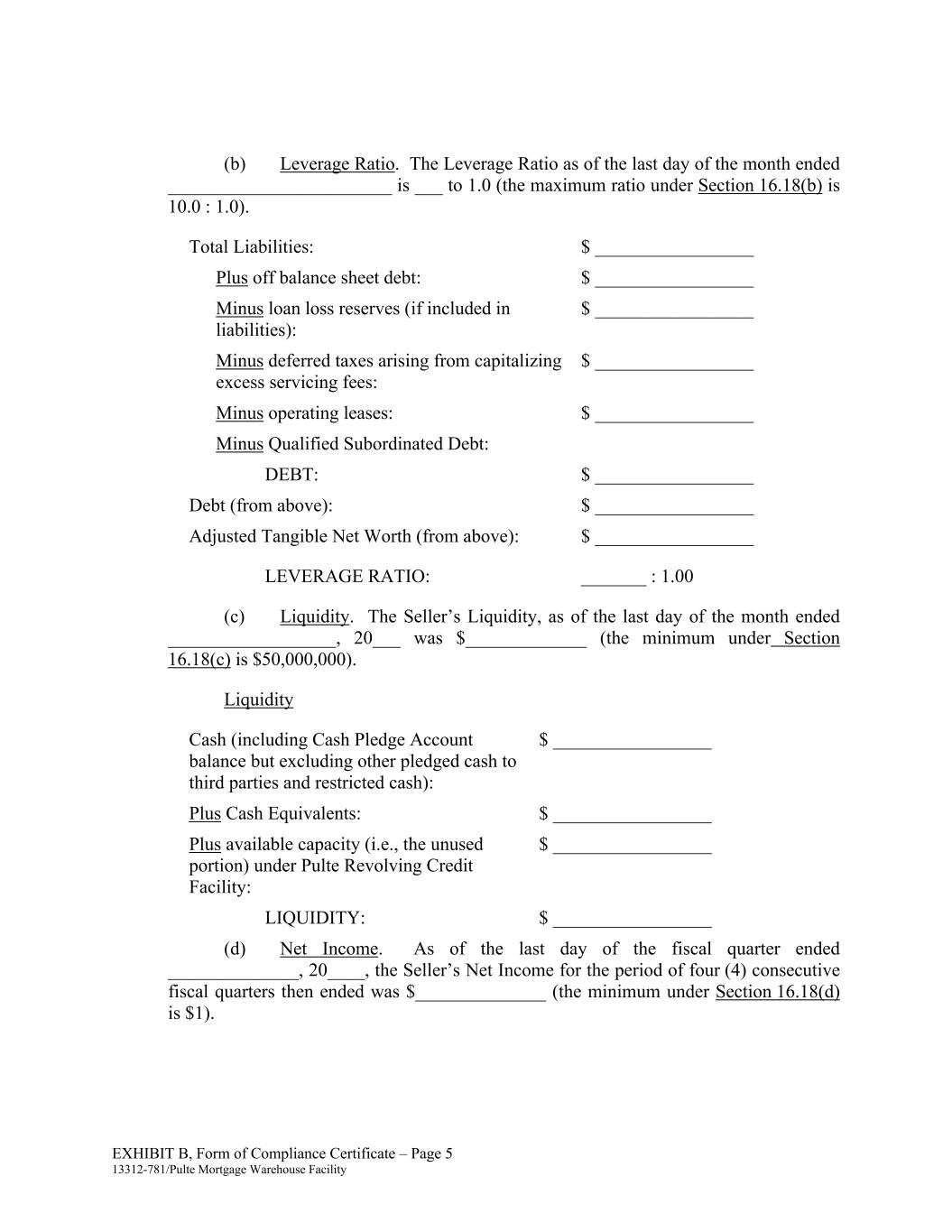 TABLE OF CONTENTS Page iv 13312-781/Pulte Mortgage Warehouse Facility 16.12. Subordination of Certain Indebtedness ..................................................................... 83 16.13. Certain Debt to Remain Unsecured .......................................................................... 84 16.14. Promptly Correct Escrow Imbalances ...................................................................... 84 16.15. MERS Covenants ...................................................................................................... 84 16.16. Special Affirmative Covenants Concerning Purchased Loans ................................. 85 16.17. Coordination with Other Lenders/Repo Purchasers and Their Custodians .............. 86 16.18. Financial Covenants .................................................................................................. 86 16.19. Underwriting Guidelines ........................................................................................... 87 Section 17. Negative Covenants. ............................................................................................. 87 17.1. No Merger ..................................................................................................................... 87 17.2. Limitation on Debt and Contingent Indebtedness ........................................................ 87 17.3. Business ........................................................................................................................ 88 17.4. Liquidations, Dispositions of Substantial Assets .......................................................... 88 17.5. Loans, Advances, and Investments ............................................................................... 88 17.6. Use of Proceeds ............................................................................................................. 89 17.7. Transactions with Affiliates .......................................................................................... 89 17.8. Liens .............................................................................................................................. 89 17.9. ERISA Plans ................................................................................................................. 89 17.10. Change of Principal Office ....................................................................................... 89 17.11. Distributions .............................................................................................................. 90 17.12. Limitations on Payments of Certain Debt ................................................................. 90 17.13. No Changes in Accounting Practices or Fiscal Year ................................................ 90 17.14. No Changes to Underwriting Guidelines .................................................................. 90 Section 18. Events of Default; Event of Termination. ............................................................. 90 18.1. Events of Default .......................................................................................................... 90 18.2. Transaction Termination ............................................................................................... 93 18.3. Termination by the Agent ............................................................................................. 93 18.4. Remedies ....................................................................................................................... 93 18.5. Liability for Expenses and Damages ............................................................................ 94 18.6. Liability for Interest ...................................................................................................... 94 18.7. Other Rights .................................................................................................................. 94 18.8. Seller’s Repurchase Rights ........................................................................................... 94 18.9. Sale of Purchased Loans ............................................................................................... 95