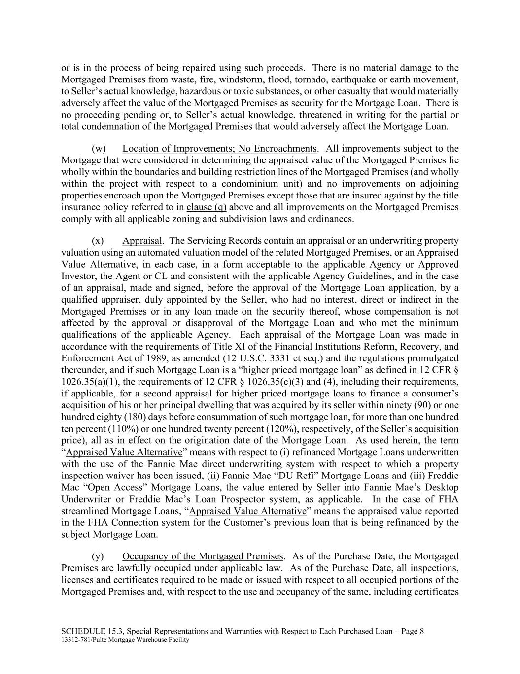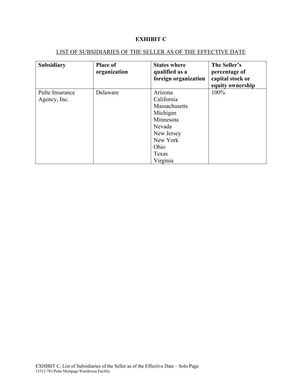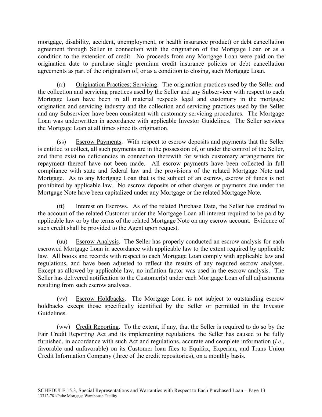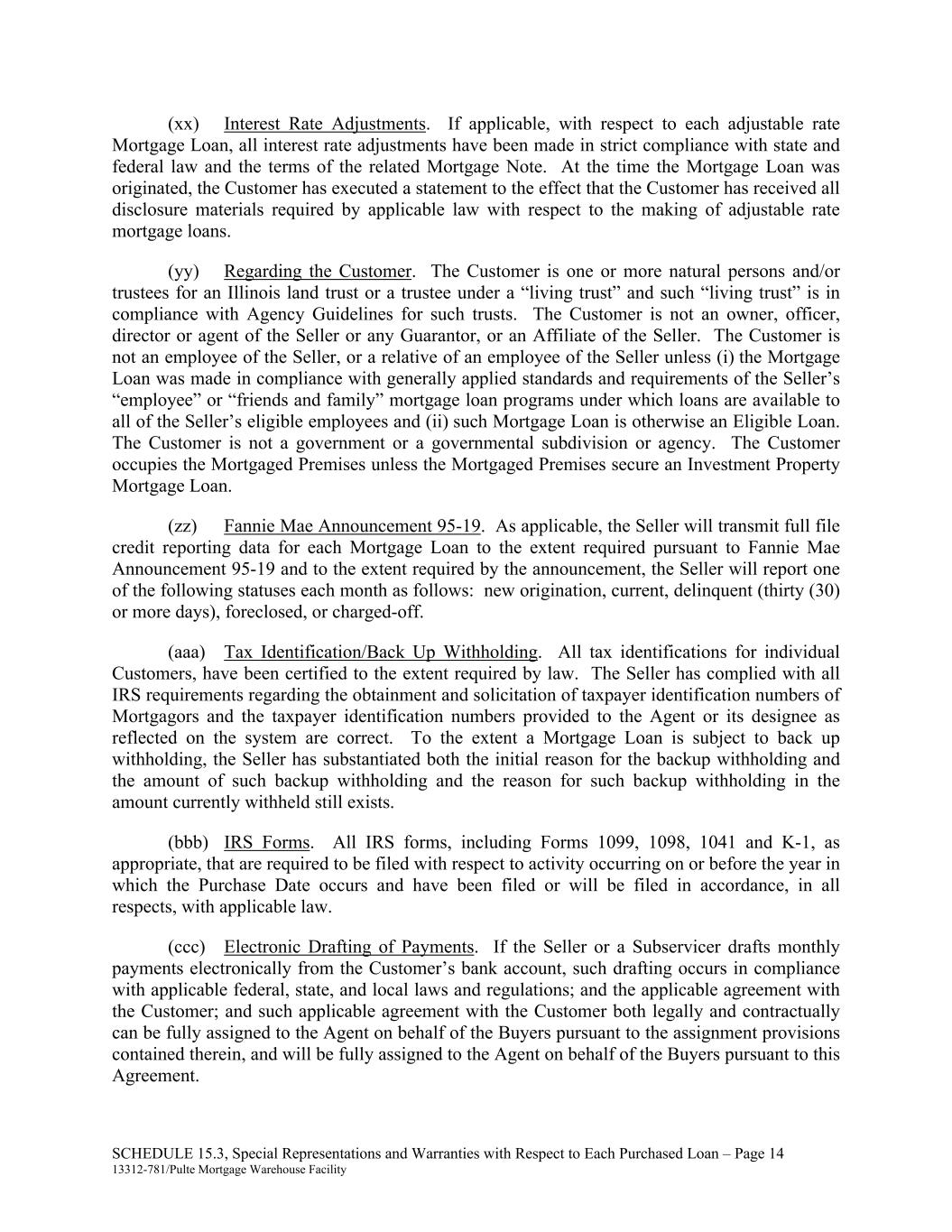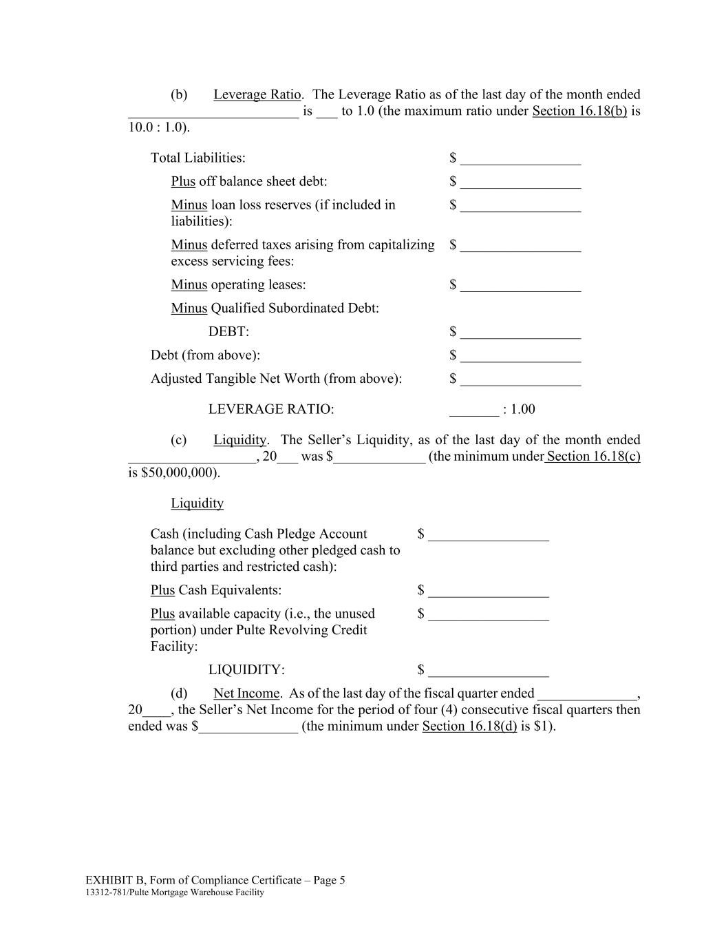 TABLE OF CONTENTS Page iv 13312-781/Pulte Mortgage Warehouse Facility 16.12. Subordination of Certain Indebtedness ..................................................................... 83 16.13. Certain Debt to Remain Unsecured .......................................................................... 84 16.14. Promptly Correct Escrow Imbalances ...................................................................... 84 16.15. MERS Covenants ...................................................................................................... 84 16.16. Special Affirmative Covenants Concerning Purchased Loans ................................. 85 16.17. Coordination with Other Lenders/Repo Purchasers and Their Custodians .............. 86 16.18. Financial Covenants .................................................................................................. 86 16.19. Underwriting Guidelines ........................................................................................... 87 Section 17. Negative Covenants. ............................................................................................. 87 17.1. No Merger ..................................................................................................................... 87 17.2. Limitation on Debt and Contingent Indebtedness ........................................................ 87 17.3. Business ........................................................................................................................ 88 17.4. Liquidations, Dispositions of Substantial Assets .......................................................... 88 17.5. Loans, Advances, and Investments ............................................................................... 88 17.6. Use of Proceeds ............................................................................................................. 89 17.7. Transactions with Affiliates .......................................................................................... 89 17.8. Liens .............................................................................................................................. 89 17.9. ERISA Plans ................................................................................................................. 89 17.10. Change of Principal Office ....................................................................................... 89 17.11. Distributions .............................................................................................................. 90 17.12. Limitations on Payments of Certain Debt ................................................................. 90 17.13. No Changes in Accounting Practices or Fiscal Year ................................................ 90 17.14. No Changes to Underwriting Guidelines .................................................................. 90 Section 18. Events of Default; Event of Termination. ............................................................. 90 18.1. Events of Default .......................................................................................................... 90 18.2. Transaction Termination ............................................................................................... 93 18.3. Termination by the Agent ............................................................................................. 93 18.4. Remedies ....................................................................................................................... 93 18.5. Liability for Expenses and Damages ............................................................................ 94 18.6. Liability for Interest ...................................................................................................... 94 18.7. Other Rights .................................................................................................................. 94 18.8. Seller’s Repurchase Rights ........................................................................................... 94 18.9. Sale of Purchased Loans ............................................................................................... 95