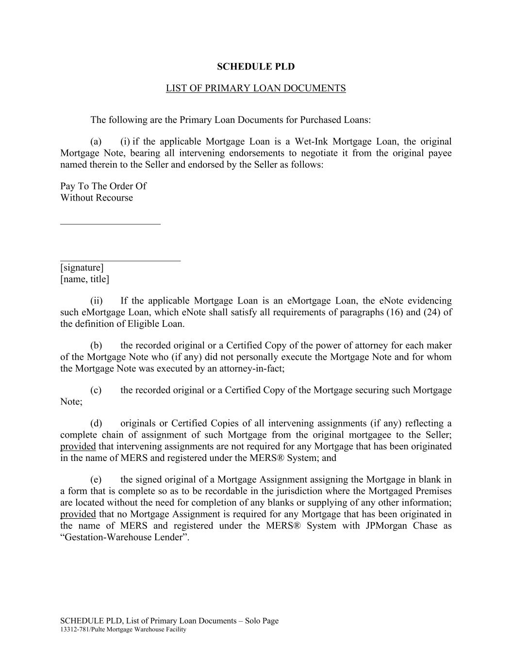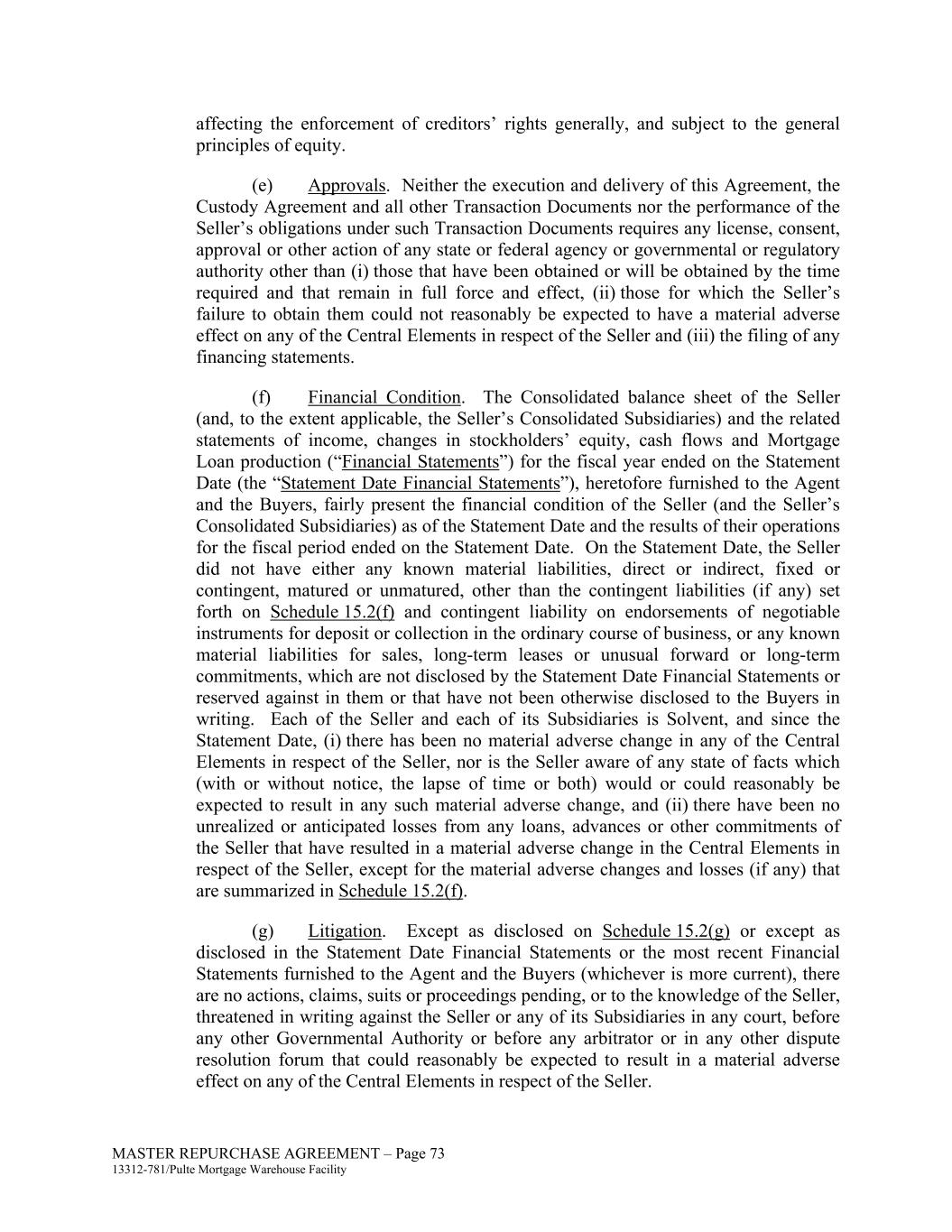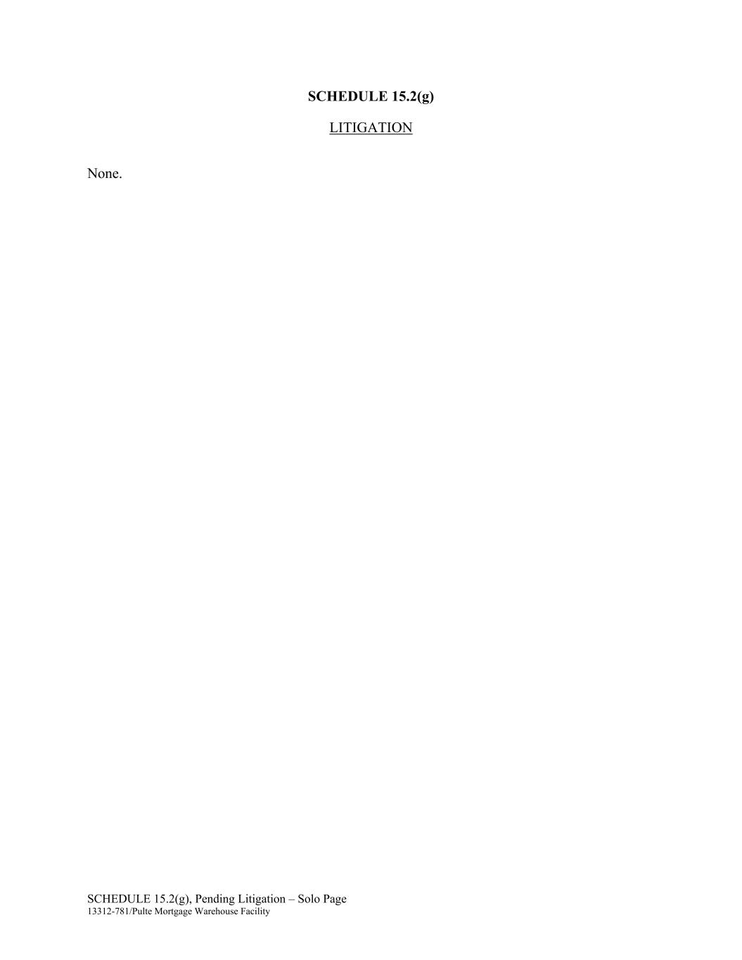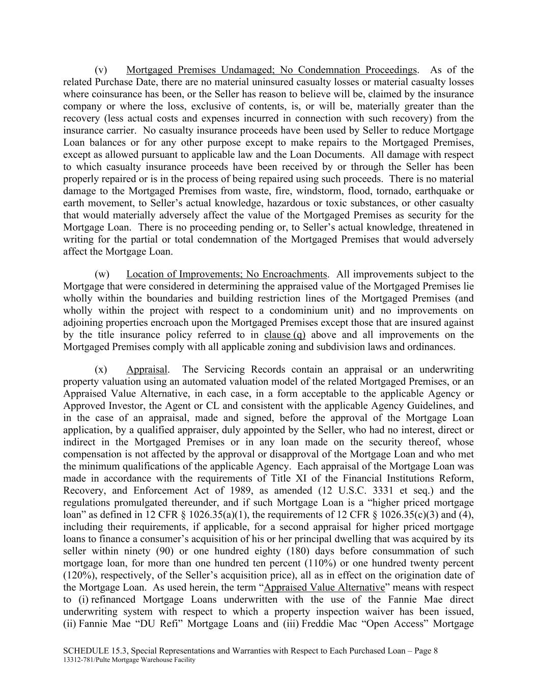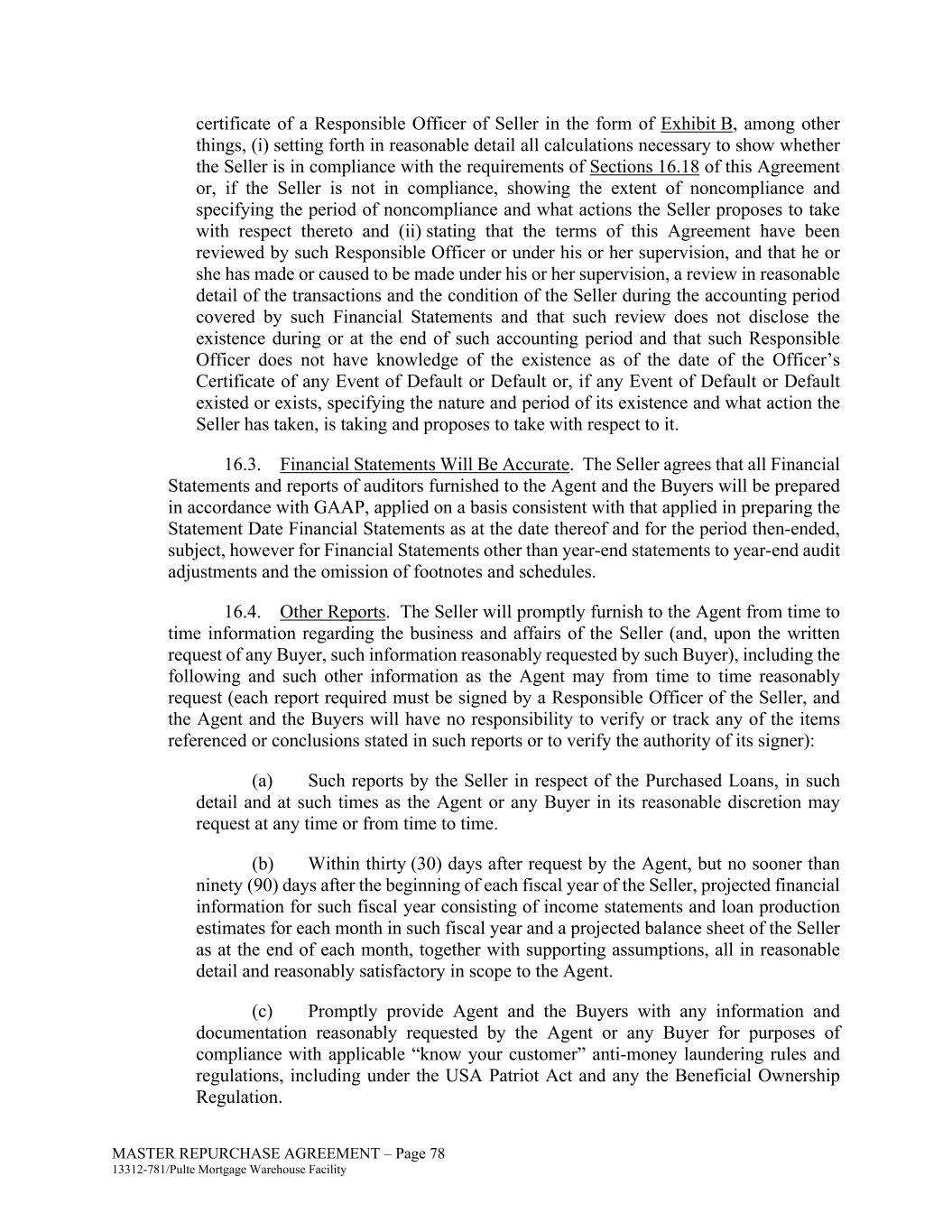 TABLE OF CONTENTS Page iv 13312-781/Pulte Mortgage Warehouse Facility 16.12. Subordination of Certain Indebtedness ..................................................................... 83 16.13. Certain Debt to Remain Unsecured .......................................................................... 84 16.14. Promptly Correct Escrow Imbalances ...................................................................... 84 16.15. MERS Covenants ...................................................................................................... 84 16.16. Special Affirmative Covenants Concerning Purchased Loans ................................. 85 16.17. Coordination with Other Lenders/Repo Purchasers and Their Custodians .............. 86 16.18. Financial Covenants .................................................................................................. 86 16.19. Underwriting Guidelines ........................................................................................... 87 Section 17. Negative Covenants. ............................................................................................. 87 17.1. No Merger ..................................................................................................................... 87 17.2. Limitation on Debt and Contingent Indebtedness ........................................................ 87 17.3. Business ........................................................................................................................ 88 17.4. Liquidations, Dispositions of Substantial Assets .......................................................... 88 17.5. Loans, Advances, and Investments ............................................................................... 88 17.6. Use of Proceeds ............................................................................................................. 89 17.7. Transactions with Affiliates .......................................................................................... 89 17.8. Liens .............................................................................................................................. 89 17.9. ERISA Plans ................................................................................................................. 89 17.10. Change of Principal Office ....................................................................................... 89 17.11. Distributions .............................................................................................................. 90 17.12. Limitations on Payments of Certain Debt ................................................................. 90 17.13. No Changes in Accounting Practices or Fiscal Year ................................................ 90 17.14. No Changes to Underwriting Guidelines .................................................................. 90 Section 18. Events of Default; Event of Termination. ............................................................. 90 18.1. Events of Default .......................................................................................................... 90 18.2. Transaction Termination ............................................................................................... 93 18.3. Termination by the Agent ............................................................................................. 93 18.4. Remedies ....................................................................................................................... 93 18.5. Liability for Expenses and Damages ............................................................................ 94 18.6. Liability for Interest ...................................................................................................... 94 18.7. Other Rights .................................................................................................................. 94 18.8. Seller’s Repurchase Rights ........................................................................................... 94 18.9. Sale of Purchased Loans ............................................................................................... 95
