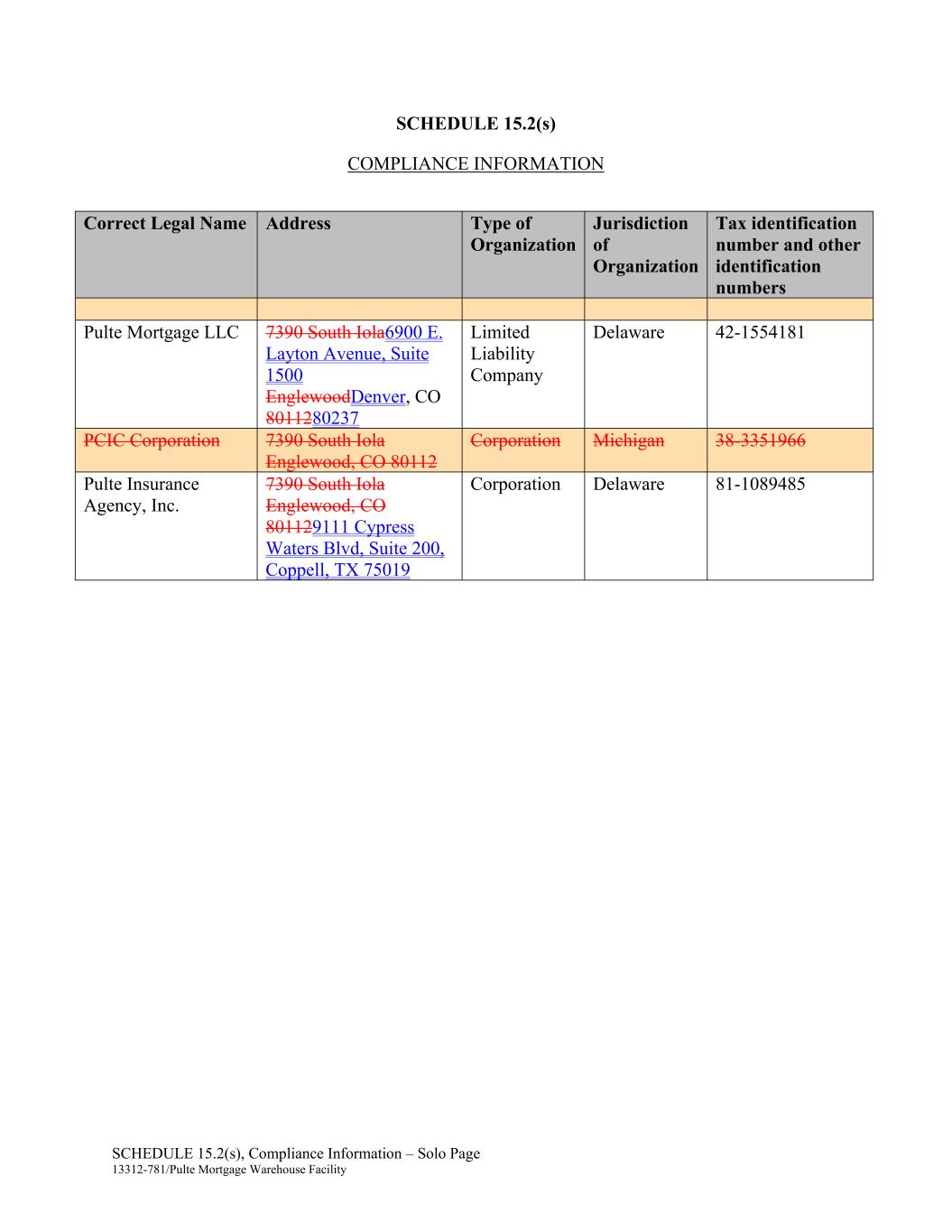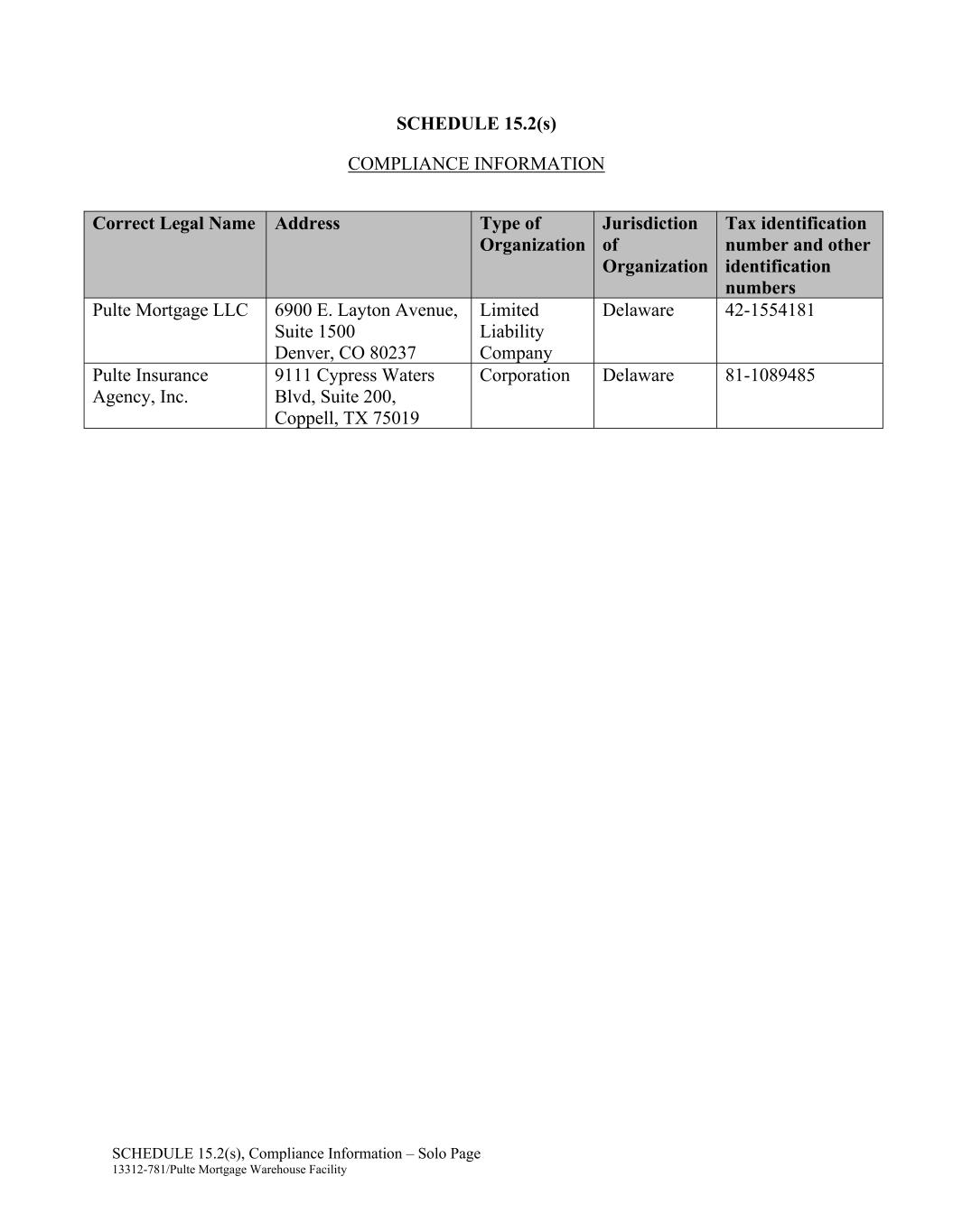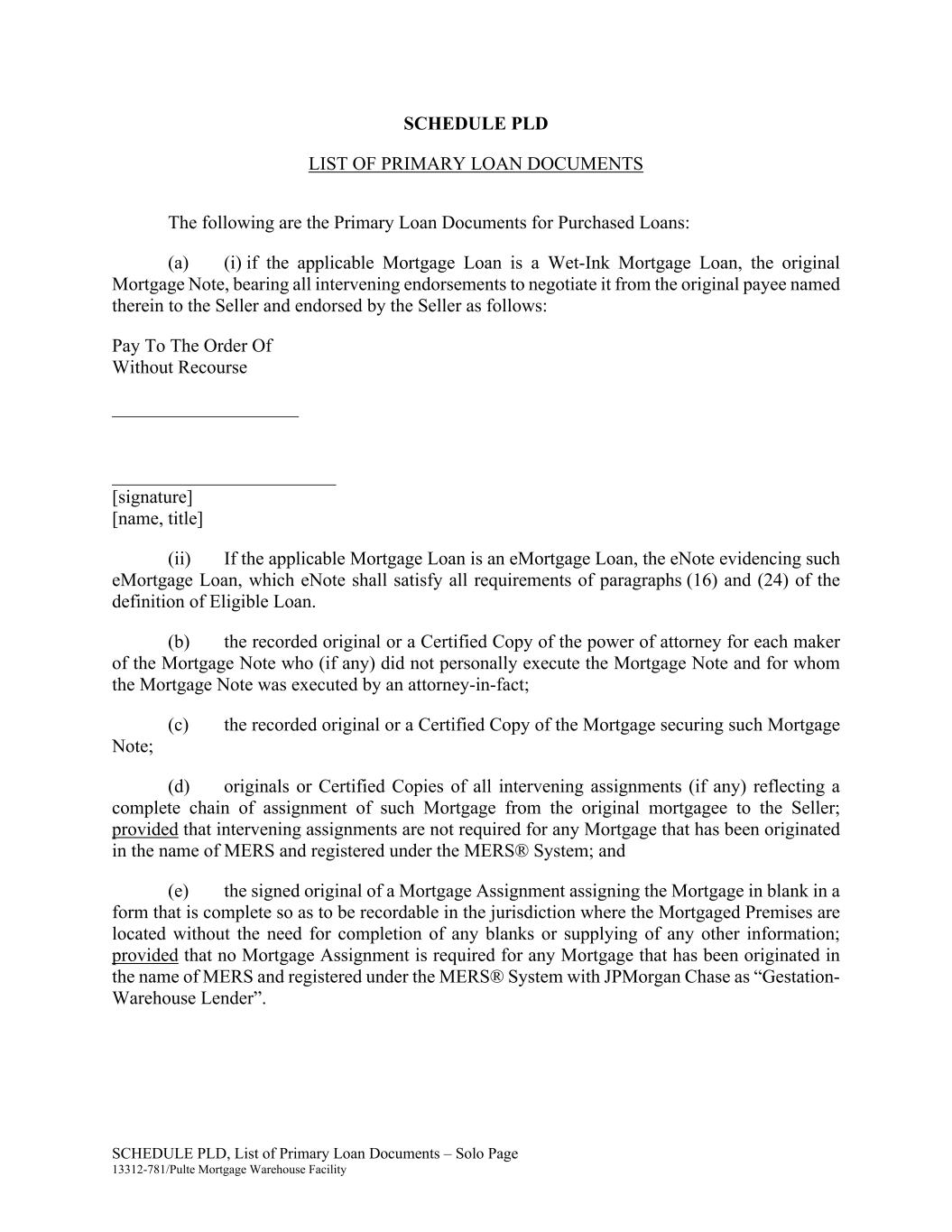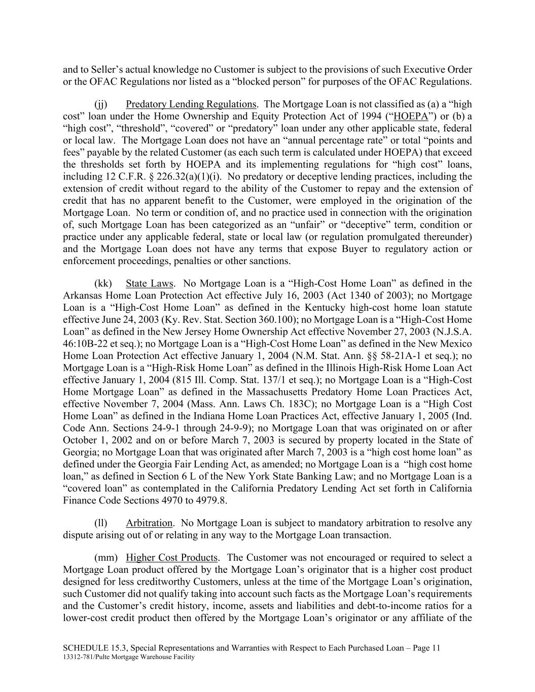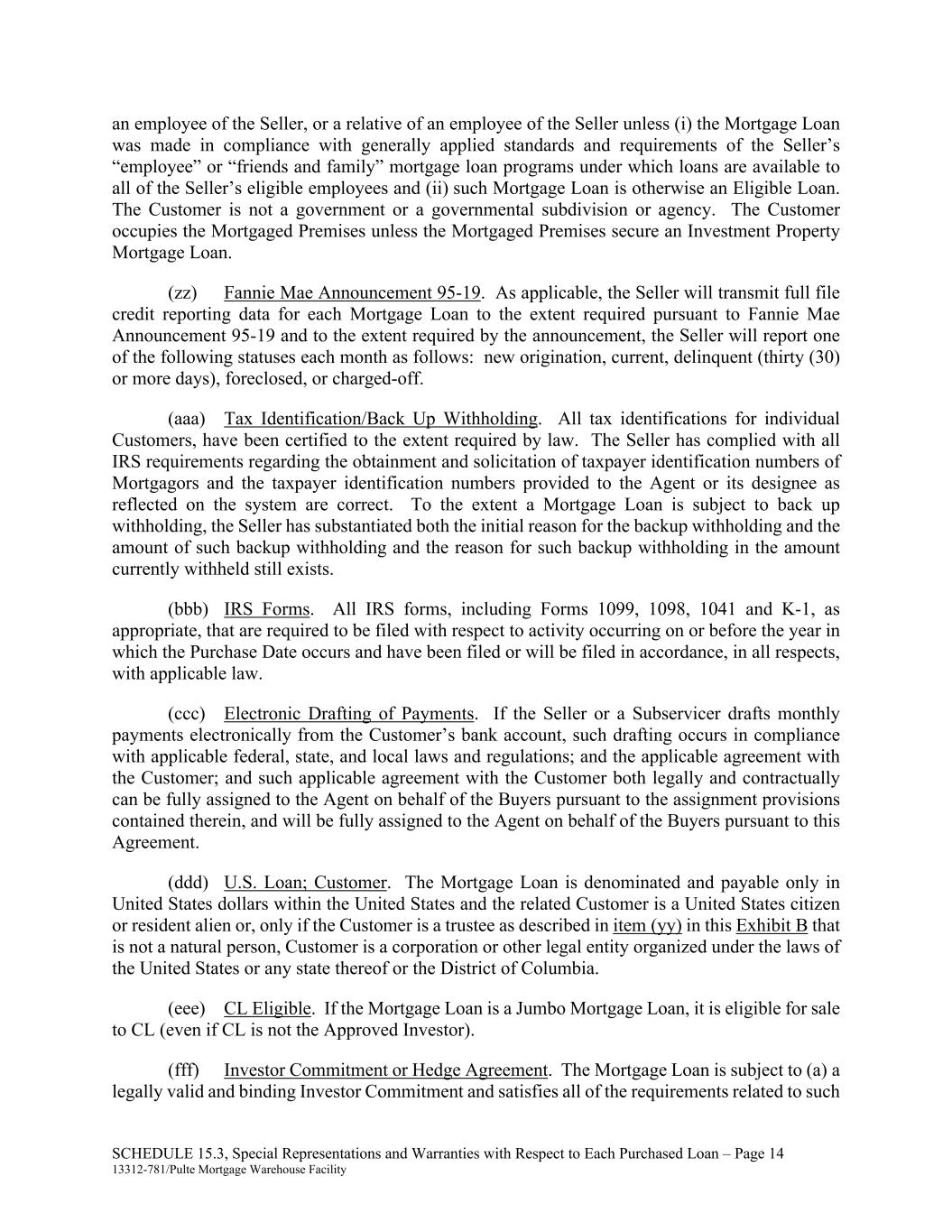 TABLE OF CONTENTS Page iv 13312-781/Pulte Mortgage Warehouse Facility 16.12. Subordination of Certain Indebtedness ..................................................................... 83 16.13. Certain Debt to Remain Unsecured .......................................................................... 84 16.14. Promptly Correct Escrow Imbalances ...................................................................... 84 16.15. MERS Covenants ...................................................................................................... 84 16.16. Special Affirmative Covenants Concerning Purchased Loans ................................. 85 16.17. Coordination with Other Lenders/Repo Purchasers and Their Custodians .............. 86 16.18. Financial Covenants .................................................................................................. 86 16.19. Underwriting Guidelines ........................................................................................... 87 Section 17. Negative Covenants. ............................................................................................. 87 17.1. No Merger ..................................................................................................................... 87 17.2. Limitation on Debt and Contingent Indebtedness ........................................................ 87 17.3. Business ........................................................................................................................ 88 17.4. Liquidations, Dispositions of Substantial Assets .......................................................... 88 17.5. Loans, Advances, and Investments ............................................................................... 88 17.6. Use of Proceeds ............................................................................................................. 89 17.7. Transactions with Affiliates .......................................................................................... 89 17.8. Liens .............................................................................................................................. 89 17.9. ERISA Plans ................................................................................................................. 89 17.10. Change of Principal Office ....................................................................................... 89 17.11. Distributions .............................................................................................................. 90 17.12. Limitations on Payments of Certain Debt ................................................................. 90 17.13. No Changes in Accounting Practices or Fiscal Year ................................................ 90 17.14. No Changes to Underwriting Guidelines .................................................................. 90 Section 18. Events of Default; Event of Termination. ............................................................. 90 18.1. Events of Default .......................................................................................................... 90 18.2. Transaction Termination ............................................................................................... 93 18.3. Termination by the Agent ............................................................................................. 93 18.4. Remedies ....................................................................................................................... 93 18.5. Liability for Expenses and Damages ............................................................................ 94 18.6. Liability for Interest ...................................................................................................... 94 18.7. Other Rights .................................................................................................................. 94 18.8. Seller’s Repurchase Rights ........................................................................................... 94 18.9. Sale of Purchased Loans ............................................................................................... 95