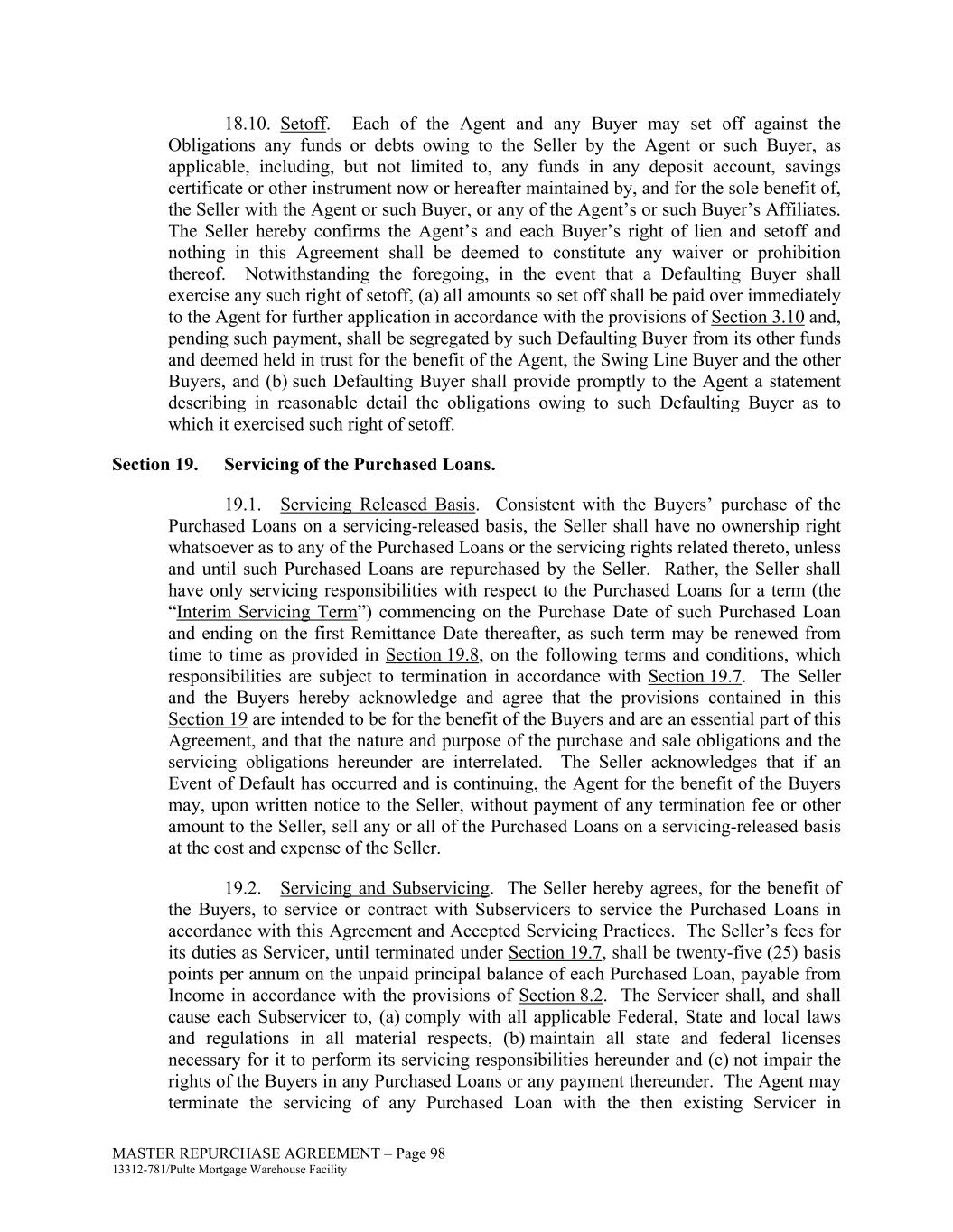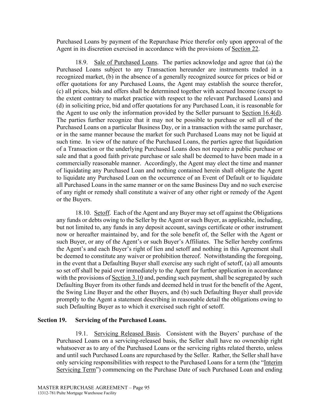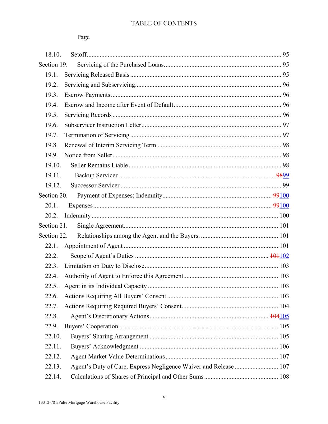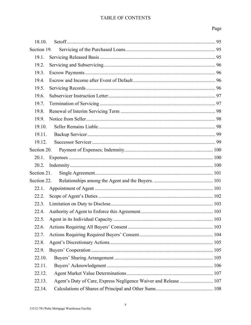 TABLE OF CONTENTS Page v 13312-781/Pulte Mortgage Warehouse Facility 18.10. Setoff ......................................................................................................................... 95 Section 19. Servicing of the Purchased Loans. ........................................................................ 95 19.1. Servicing Released Basis .............................................................................................. 95 19.2. Servicing and Subservicing ........................................................................................... 96 19.3. Escrow Payments .......................................................................................................... 96 19.4. Escrow and Income after Event of Default ................................................................... 96 19.5. Servicing Records ......................................................................................................... 96 19.6. Subservicer Instruction Letter ....................................................................................... 97 19.7. Termination of Servicing .............................................................................................. 97 19.8. Renewal of Interim Servicing Term ............................................................................. 98 19.9. Notice from Seller ......................................................................................................... 98 19.10. Seller Remains Liable ............................................................................................... 98 19.11. Backup Servicer ................................................................................................. 9899 19.12. Successor Servicer .................................................................................................... 99 Section 20. Payment of Expenses; Indemnity. ................................................................... 99100 20.1. Expenses ............................................................................................................... 99100 20.2. Indemnity .................................................................................................................... 100 Section 21. Single Agreement................................................................................................ 101 Section 22. Relationships among the Agent and the Buyers. ................................................ 101 22.1. Appointment of Agent ................................................................................................ 101 22.2. Scope of Agent’s Duties ................................................................................... 101102 22.3. Limitation on Duty to Disclose ................................................................................... 103 22.4. Authority of Agent to Enforce this Agreement ........................................................... 103 22.5. Agent in its Individual Capacity ................................................................................. 103 22.6. Actions Requiring All Buyers’ Consent ..................................................................... 103 22.7. Actions Requiring Required Buyers’ Consent ............................................................ 104 22.8. Agent’s Discretionary Actions .......................................................................... 104105 22.9. Buyers’ Cooperation ................................................................................................... 105 22.10. Buyers’ Sharing Arrangement ................................................................................ 105 22.11. Buyers’ Acknowledgment ...................................................................................... 106 22.12. Agent Market Value Determinations ...................................................................... 107 22.13. Agent’s Duty of Care, Express Negligence Waiver and Release ........................... 107 22.14. Calculations of Shares of Principal and Other Sums .............................................. 108