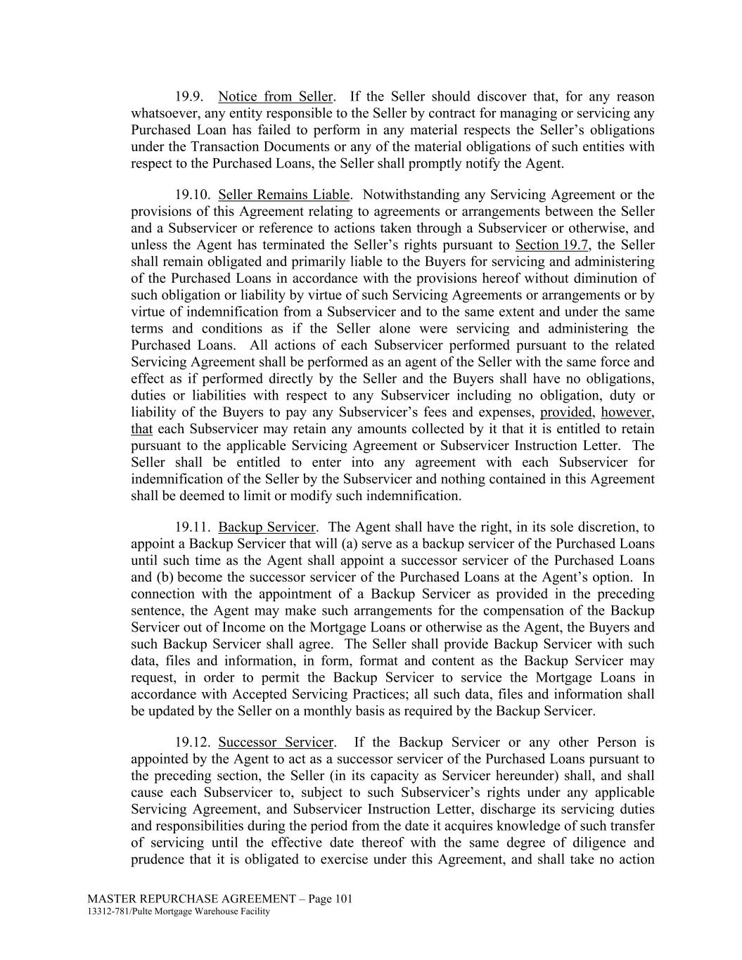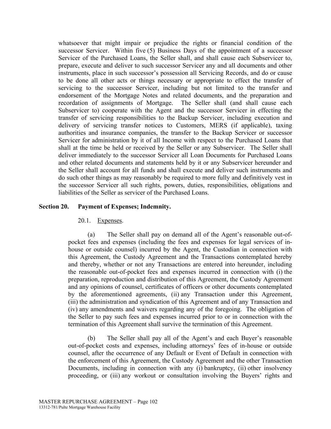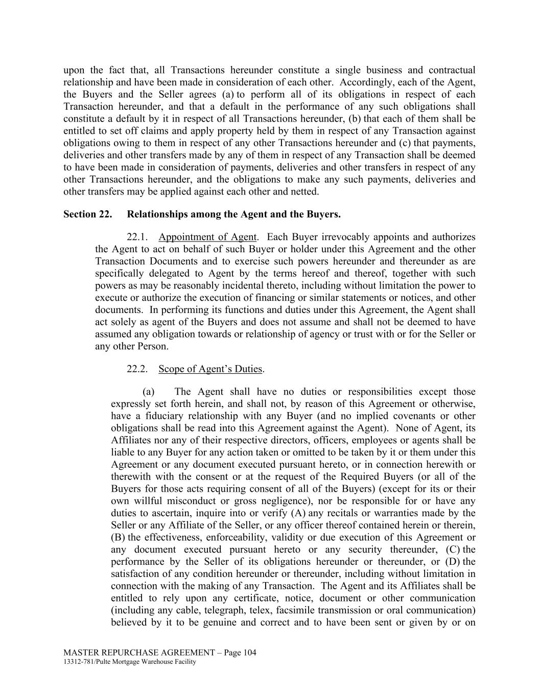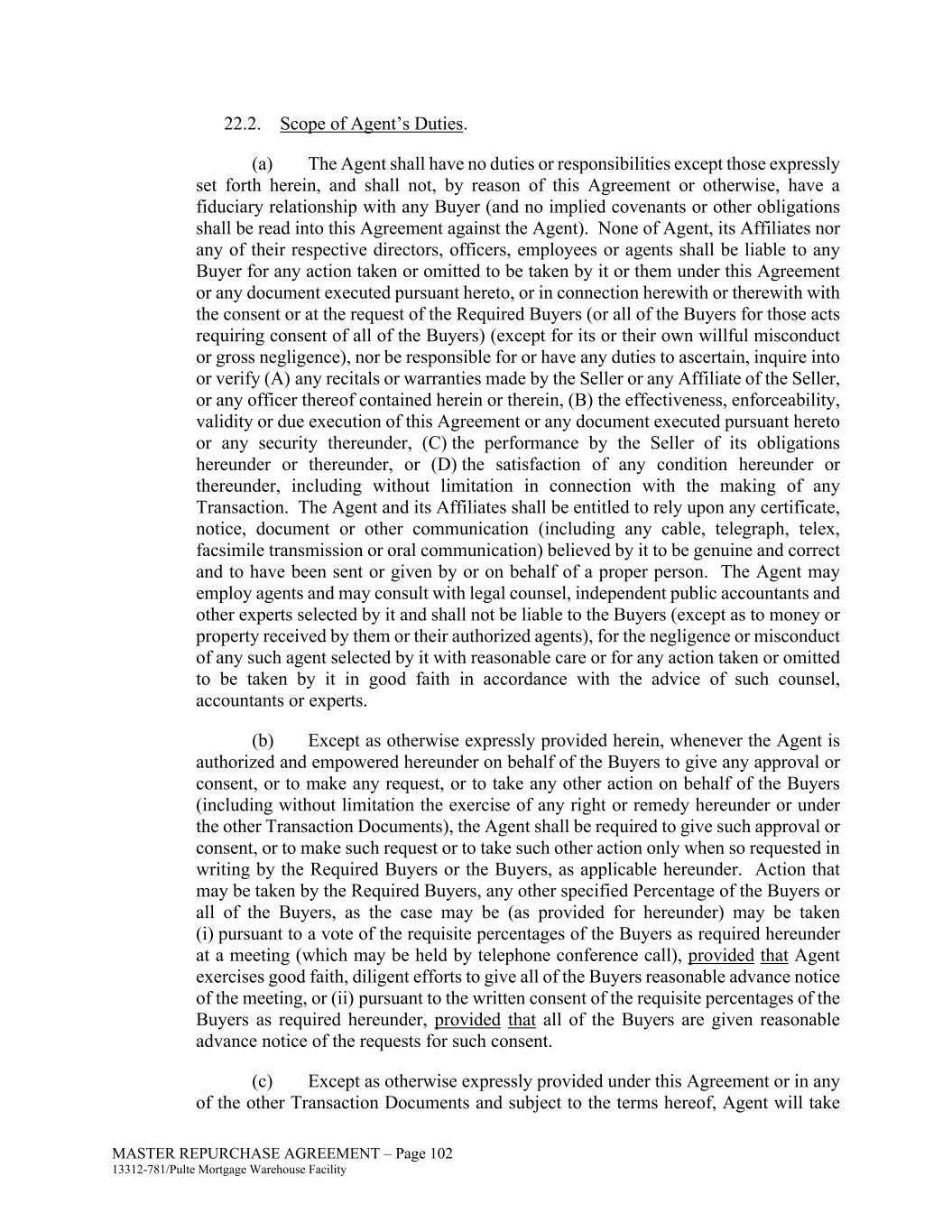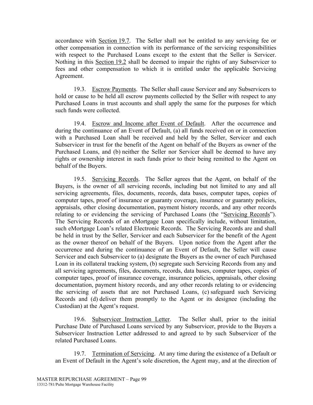 TABLE OF CONTENTS Page v 13312-781/Pulte Mortgage Warehouse Facility 18.10. Setoff ......................................................................................................................... 95 Section 19. Servicing of the Purchased Loans. ........................................................................ 95 19.1. Servicing Released Basis .............................................................................................. 95 19.2. Servicing and Subservicing ........................................................................................... 96 19.3. Escrow Payments .......................................................................................................... 96 19.4. Escrow and Income after Event of Default ................................................................... 96 19.5. Servicing Records ......................................................................................................... 96 19.6. Subservicer Instruction Letter ....................................................................................... 97 19.7. Termination of Servicing .............................................................................................. 97 19.8. Renewal of Interim Servicing Term ............................................................................. 98 19.9. Notice from Seller ......................................................................................................... 98 19.10. Seller Remains Liable ............................................................................................... 98 19.11. Backup Servicer ................................................................................................. 9899 19.12. Successor Servicer .................................................................................................... 99 Section 20. Payment of Expenses; Indemnity. ................................................................... 99100 20.1. Expenses ............................................................................................................... 99100 20.2. Indemnity .................................................................................................................... 100 Section 21. Single Agreement................................................................................................ 101 Section 22. Relationships among the Agent and the Buyers. ................................................ 101 22.1. Appointment of Agent ................................................................................................ 101 22.2. Scope of Agent’s Duties ................................................................................... 101102 22.3. Limitation on Duty to Disclose ................................................................................... 103 22.4. Authority of Agent to Enforce this Agreement ........................................................... 103 22.5. Agent in its Individual Capacity ................................................................................. 103 22.6. Actions Requiring All Buyers’ Consent ..................................................................... 103 22.7. Actions Requiring Required Buyers’ Consent ............................................................ 104 22.8. Agent’s Discretionary Actions .......................................................................... 104105 22.9. Buyers’ Cooperation ................................................................................................... 105 22.10. Buyers’ Sharing Arrangement ................................................................................ 105 22.11. Buyers’ Acknowledgment ...................................................................................... 106 22.12. Agent Market Value Determinations ...................................................................... 107 22.13. Agent’s Duty of Care, Express Negligence Waiver and Release ........................... 107 22.14. Calculations of Shares of Principal and Other Sums .............................................. 108