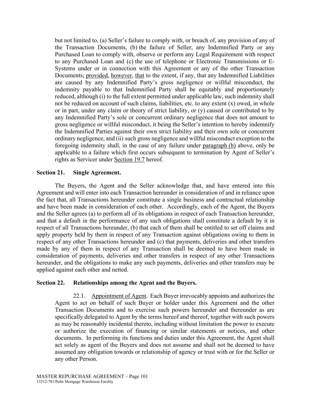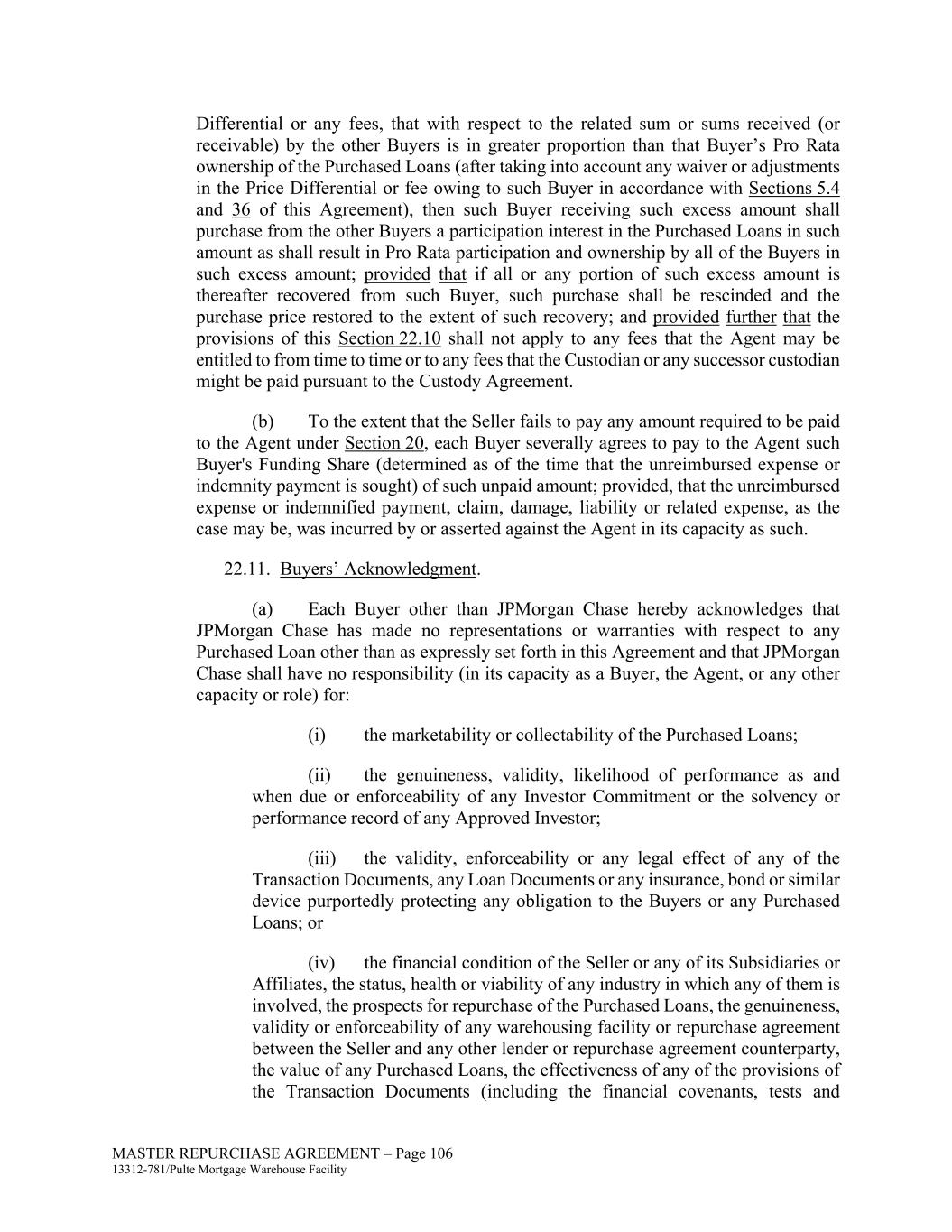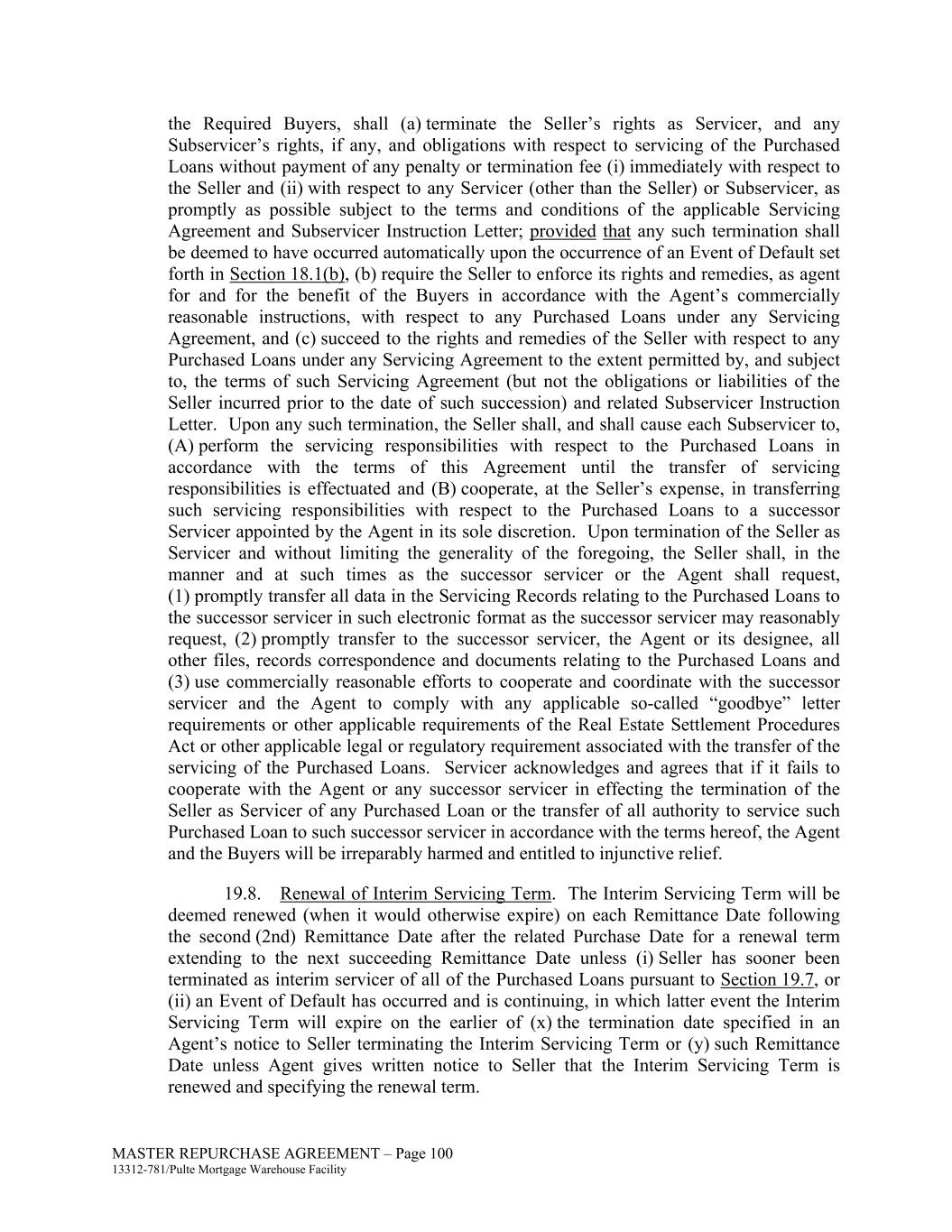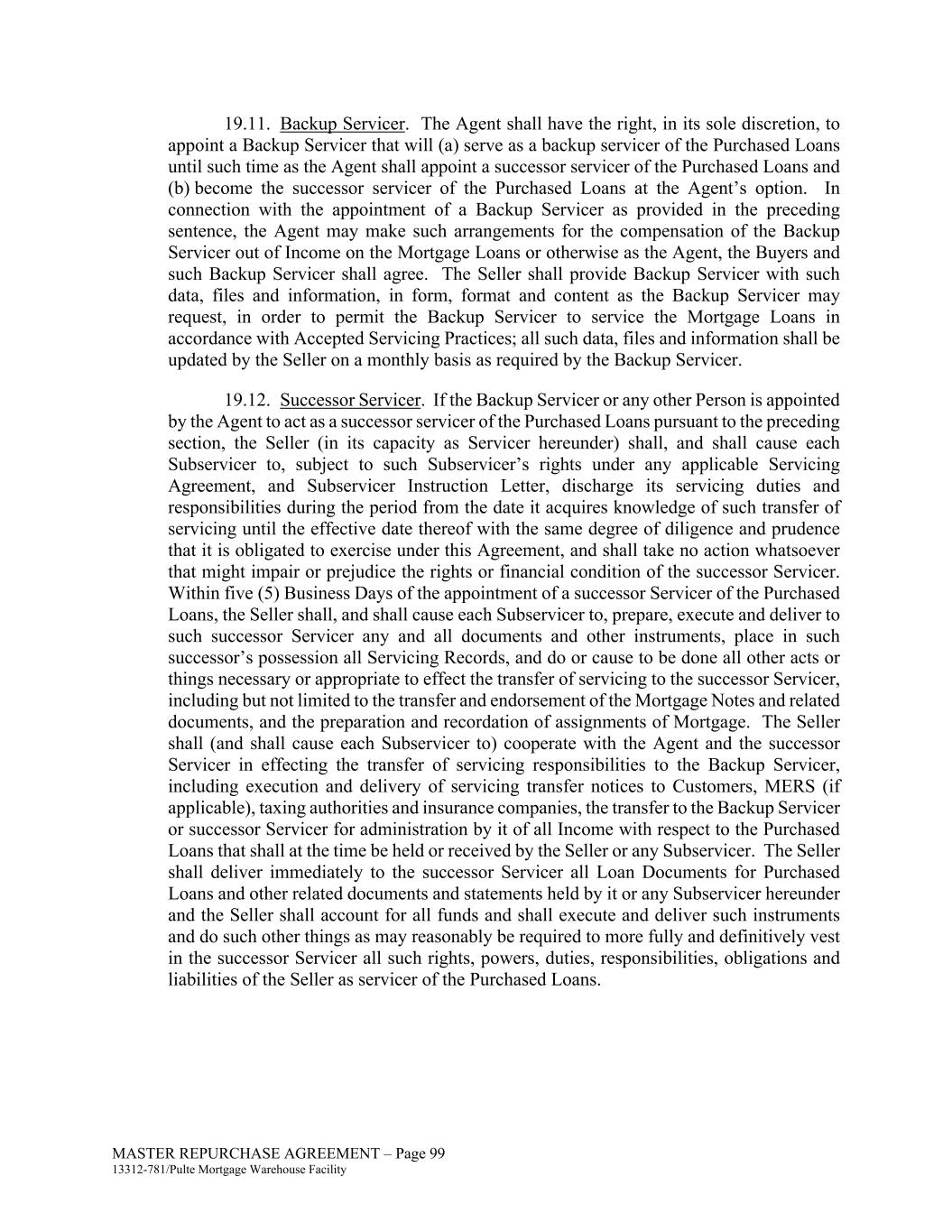 TABLE OF CONTENTS Page v 13312-781/Pulte Mortgage Warehouse Facility 18.10. Setoff ......................................................................................................................... 95 Section 19. Servicing of the Purchased Loans. ........................................................................ 95 19.1. Servicing Released Basis .............................................................................................. 95 19.2. Servicing and Subservicing ........................................................................................... 96 19.3. Escrow Payments .......................................................................................................... 96 19.4. Escrow and Income after Event of Default ................................................................... 96 19.5. Servicing Records ......................................................................................................... 96 19.6. Subservicer Instruction Letter ....................................................................................... 97 19.7. Termination of Servicing .............................................................................................. 97 19.8. Renewal of Interim Servicing Term ............................................................................. 98 19.9. Notice from Seller ......................................................................................................... 98 19.10. Seller Remains Liable ............................................................................................... 98 19.11. Backup Servicer ................................................................................................. 9899 19.12. Successor Servicer .................................................................................................... 99 Section 20. Payment of Expenses; Indemnity. ................................................................... 99100 20.1. Expenses ............................................................................................................... 99100 20.2. Indemnity .................................................................................................................... 100 Section 21. Single Agreement................................................................................................ 101 Section 22. Relationships among the Agent and the Buyers. ................................................ 101 22.1. Appointment of Agent ................................................................................................ 101 22.2. Scope of Agent’s Duties ................................................................................... 101102 22.3. Limitation on Duty to Disclose ................................................................................... 103 22.4. Authority of Agent to Enforce this Agreement ........................................................... 103 22.5. Agent in its Individual Capacity ................................................................................. 103 22.6. Actions Requiring All Buyers’ Consent ..................................................................... 103 22.7. Actions Requiring Required Buyers’ Consent ............................................................ 104 22.8. Agent’s Discretionary Actions .......................................................................... 104105 22.9. Buyers’ Cooperation ................................................................................................... 105 22.10. Buyers’ Sharing Arrangement ................................................................................ 105 22.11. Buyers’ Acknowledgment ...................................................................................... 106 22.12. Agent Market Value Determinations ...................................................................... 107 22.13. Agent’s Duty of Care, Express Negligence Waiver and Release ........................... 107 22.14. Calculations of Shares of Principal and Other Sums .............................................. 108