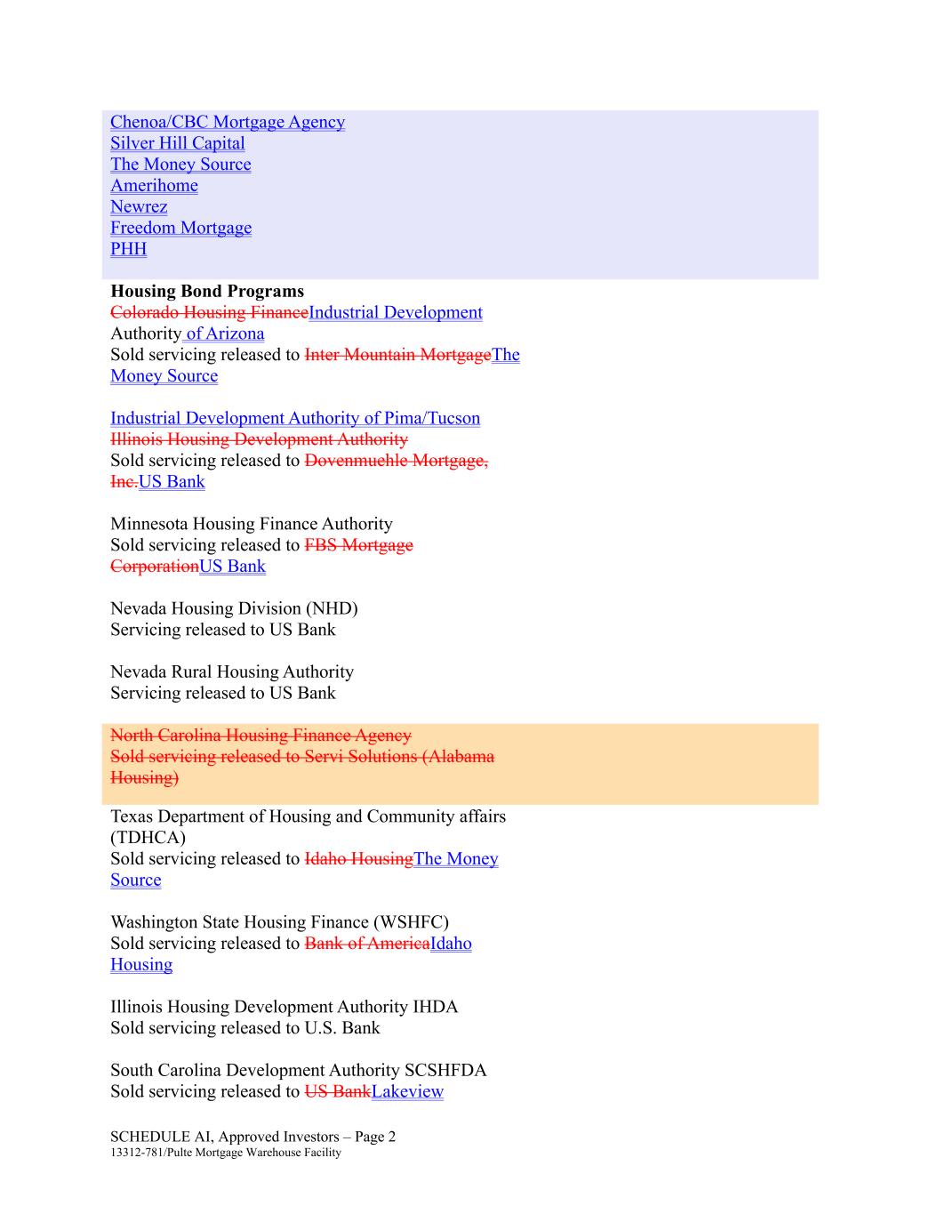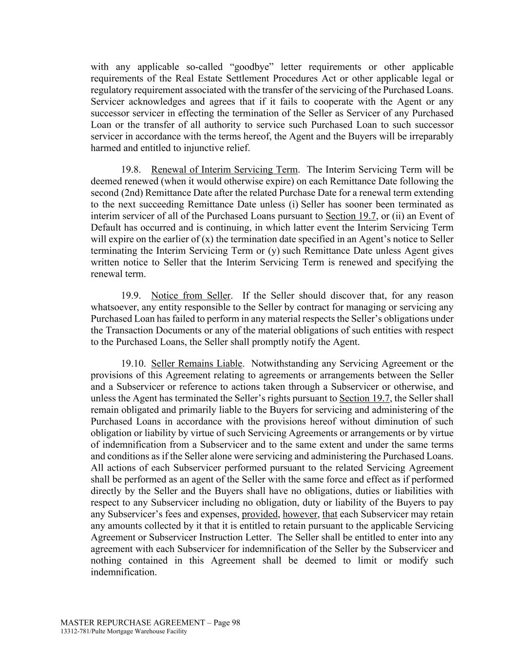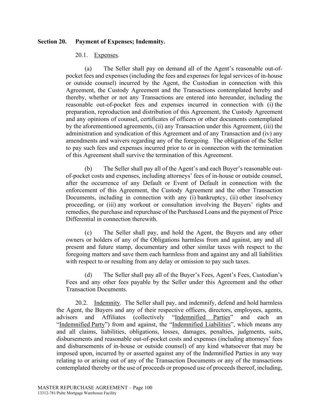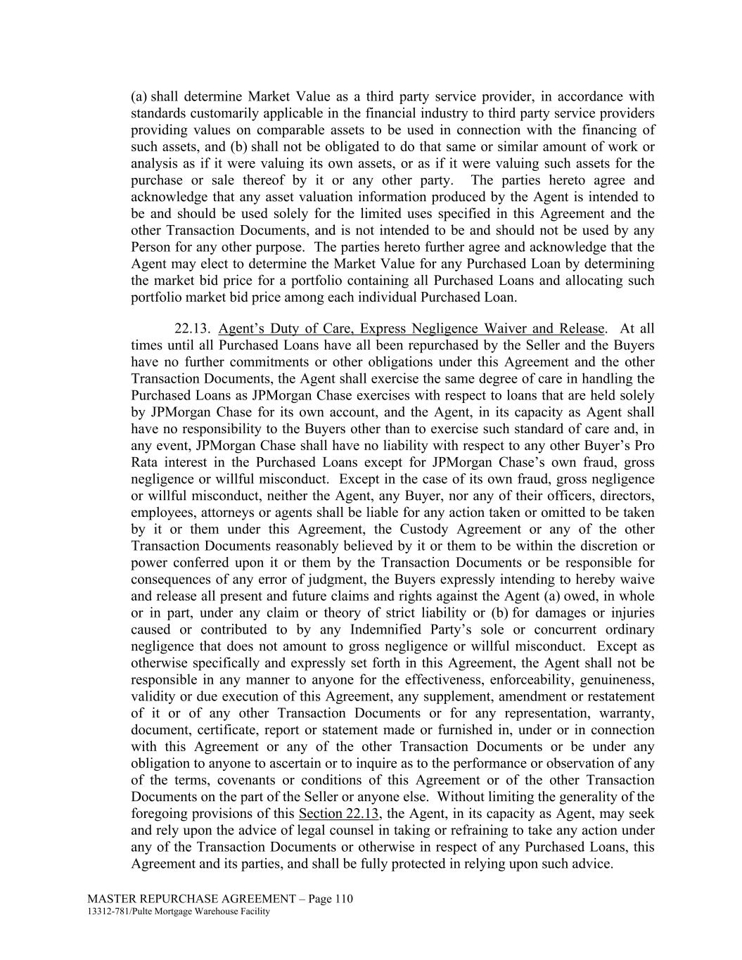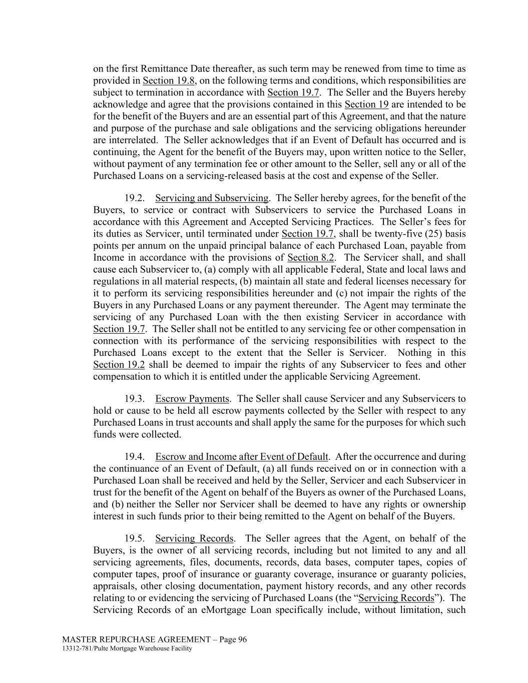 TABLE OF CONTENTS Page v 13312-781/Pulte Mortgage Warehouse Facility 18.10. Setoff ......................................................................................................................... 95 Section 19. Servicing of the Purchased Loans. ........................................................................ 95 19.1. Servicing Released Basis .............................................................................................. 95 19.2. Servicing and Subservicing ........................................................................................... 96 19.3. Escrow Payments .......................................................................................................... 96 19.4. Escrow and Income after Event of Default ................................................................... 96 19.5. Servicing Records ......................................................................................................... 96 19.6. Subservicer Instruction Letter ....................................................................................... 97 19.7. Termination of Servicing .............................................................................................. 97 19.8. Renewal of Interim Servicing Term ............................................................................. 98 19.9. Notice from Seller ......................................................................................................... 98 19.10. Seller Remains Liable ............................................................................................... 98 19.11. Backup Servicer ................................................................................................. 9899 19.12. Successor Servicer .................................................................................................... 99 Section 20. Payment of Expenses; Indemnity. ................................................................... 99100 20.1. Expenses ............................................................................................................... 99100 20.2. Indemnity .................................................................................................................... 100 Section 21. Single Agreement................................................................................................ 101 Section 22. Relationships among the Agent and the Buyers. ................................................ 101 22.1. Appointment of Agent ................................................................................................ 101 22.2. Scope of Agent’s Duties ................................................................................... 101102 22.3. Limitation on Duty to Disclose ................................................................................... 103 22.4. Authority of Agent to Enforce this Agreement ........................................................... 103 22.5. Agent in its Individual Capacity ................................................................................. 103 22.6. Actions Requiring All Buyers’ Consent ..................................................................... 103 22.7. Actions Requiring Required Buyers’ Consent ............................................................ 104 22.8. Agent’s Discretionary Actions .......................................................................... 104105 22.9. Buyers’ Cooperation ................................................................................................... 105 22.10. Buyers’ Sharing Arrangement ................................................................................ 105 22.11. Buyers’ Acknowledgment ...................................................................................... 106 22.12. Agent Market Value Determinations ...................................................................... 107 22.13. Agent’s Duty of Care, Express Negligence Waiver and Release ........................... 107 22.14. Calculations of Shares of Principal and Other Sums .............................................. 108