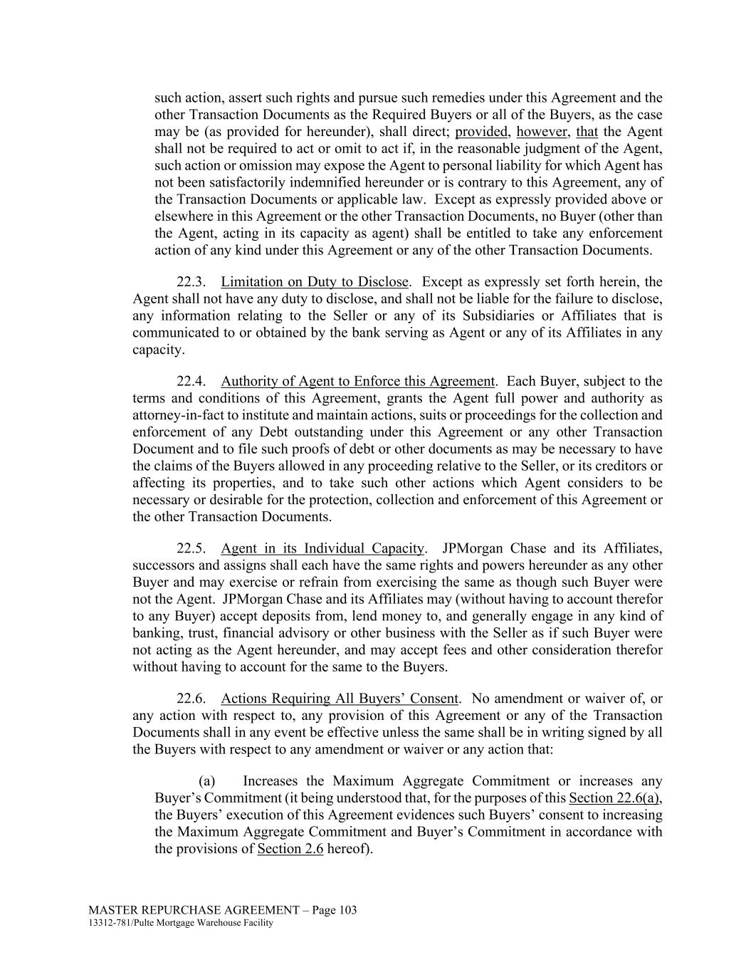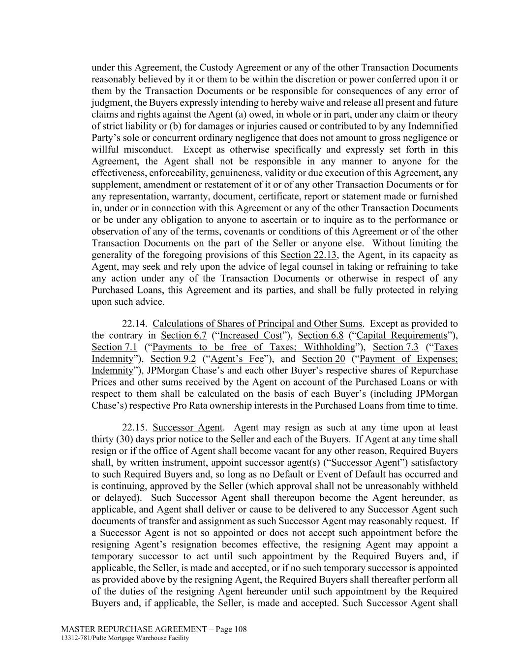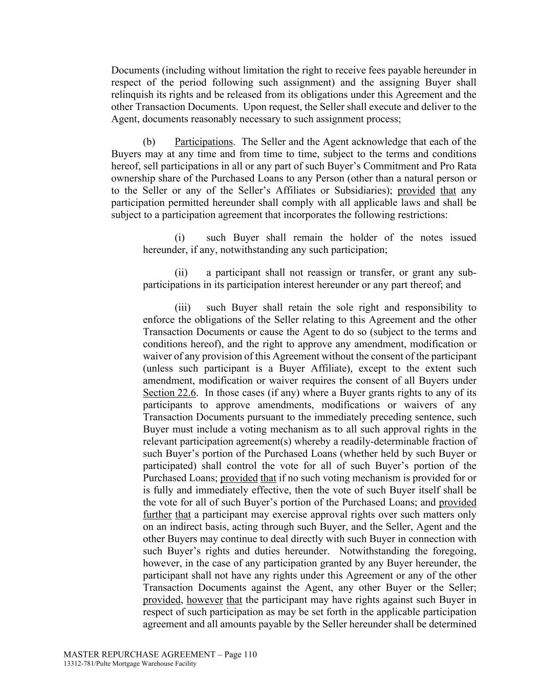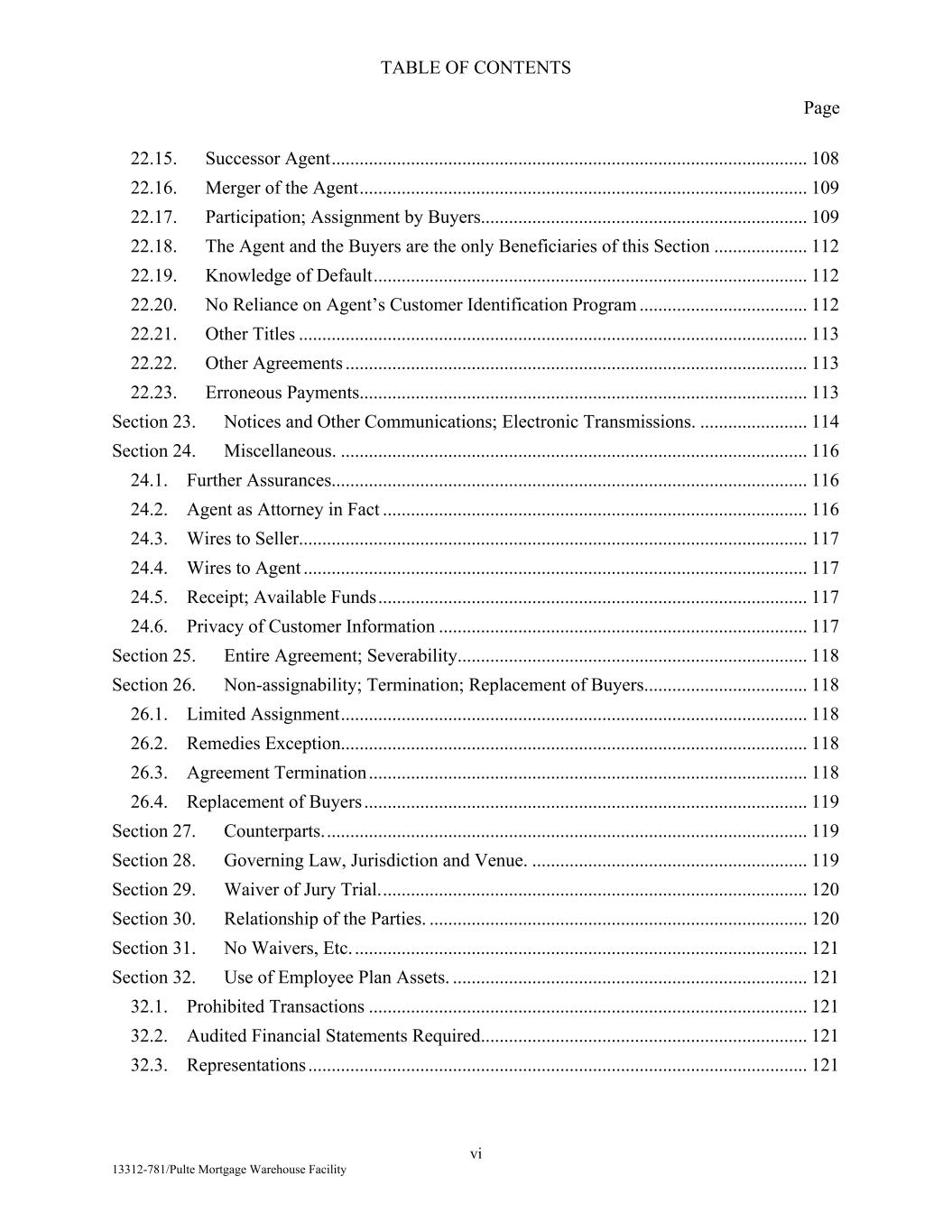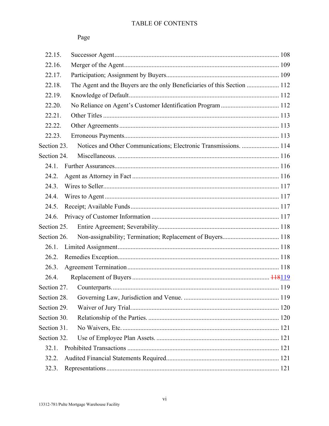 TABLE OF CONTENTS Page vi 13312-781/Pulte Mortgage Warehouse Facility 22.15. Successor Agent ...................................................................................................... 108 22.16. Merger of the Agent ................................................................................................ 109 22.17. Participation; Assignment by Buyers...................................................................... 109 22.18. The Agent and the Buyers are the only Beneficiaries of this Section .................... 112 22.19. Knowledge of Default ............................................................................................. 112 22.20. No Reliance on Agent’s Customer Identification Program .................................... 112 22.21. Other Titles ............................................................................................................. 113 22.22. Other Agreements ................................................................................................... 113 22.23. Erroneous Payments ................................................................................................ 113 Section 23. Notices and Other Communications; Electronic Transmissions. ....................... 114 Section 24. Miscellaneous. .................................................................................................... 116 24.1. Further Assurances...................................................................................................... 116 24.2. Agent as Attorney in Fact ........................................................................................... 116 24.3. Wires to Seller............................................................................................................. 117 24.4. Wires to Agent ............................................................................................................ 117 24.5. Receipt; Available Funds ............................................................................................ 117 24.6. Privacy of Customer Information ............................................................................... 117 Section 25. Entire Agreement; Severability. .......................................................................... 118 Section 26. Non-assignability; Termination; Replacement of Buyers. .................................. 118 26.1. Limited Assignment .................................................................................................... 118 26.2. Remedies Exception.................................................................................................... 118 26.3. Agreement Termination .............................................................................................. 118 26.4. Replacement of Buyers ..................................................................................... 118119 Section 27. Counterparts. ....................................................................................................... 119 Section 28. Governing Law, Jurisdiction and Venue. ........................................................... 119 Section 29. Waiver of Jury Trial. ........................................................................................... 120 Section 30. Relationship of the Parties. ................................................................................. 120 Section 31. No Waivers, Etc. ................................................................................................. 121 Section 32. Use of Employee Plan Assets. ............................................................................ 121 32.1. Prohibited Transactions .............................................................................................. 121 32.2. Audited Financial Statements Required ...................................................................... 121 32.3. Representations ........................................................................................................... 121
