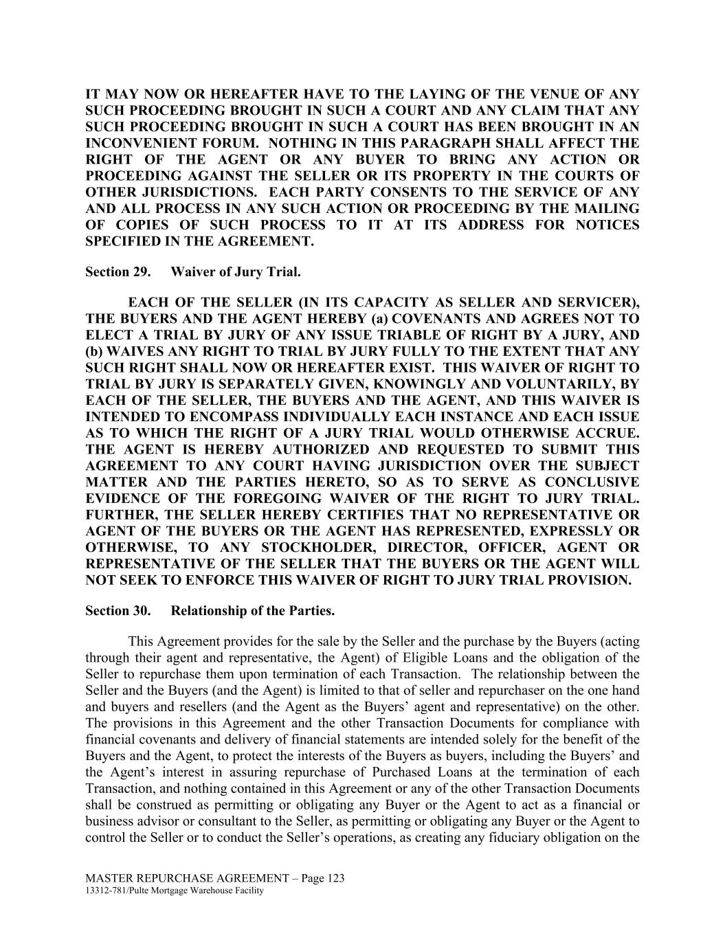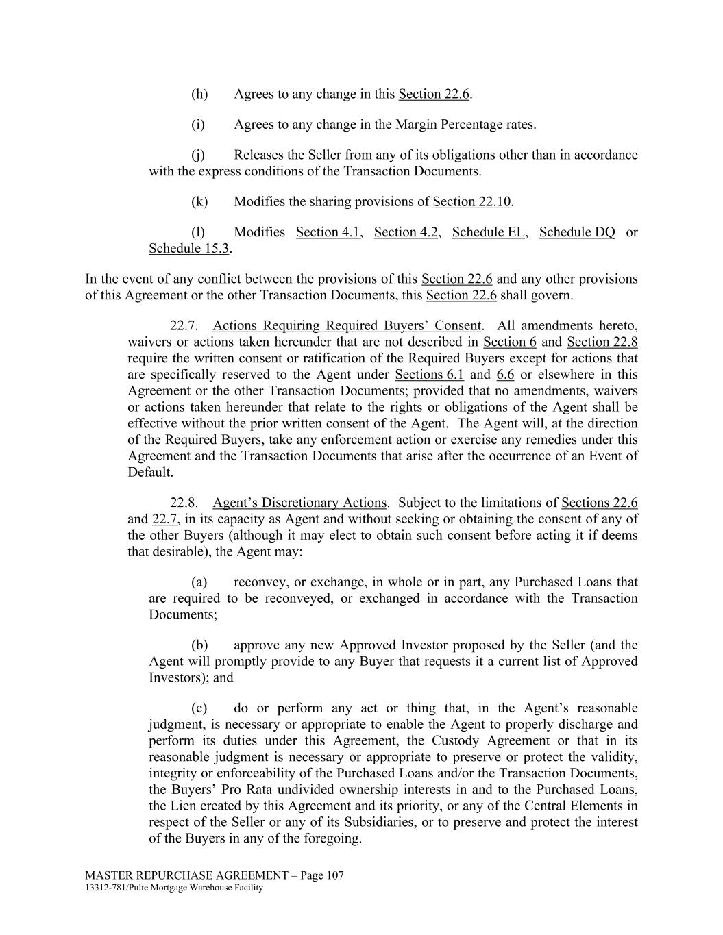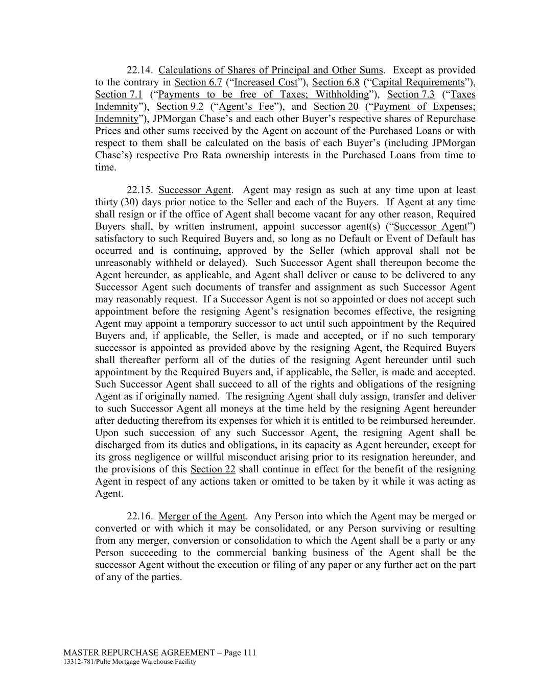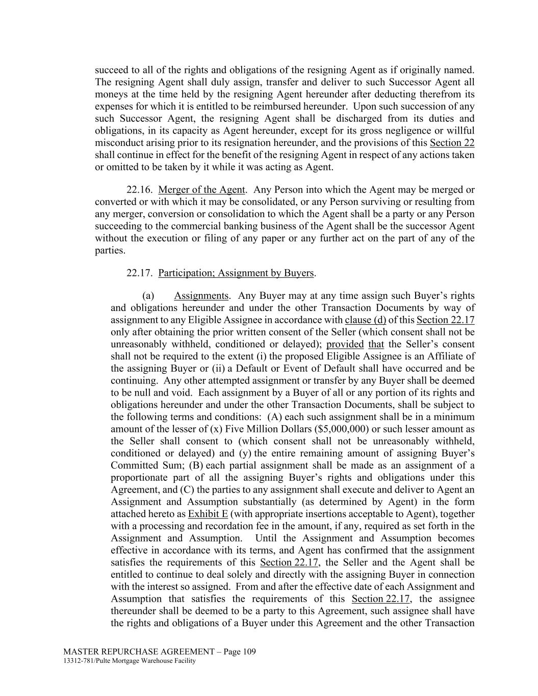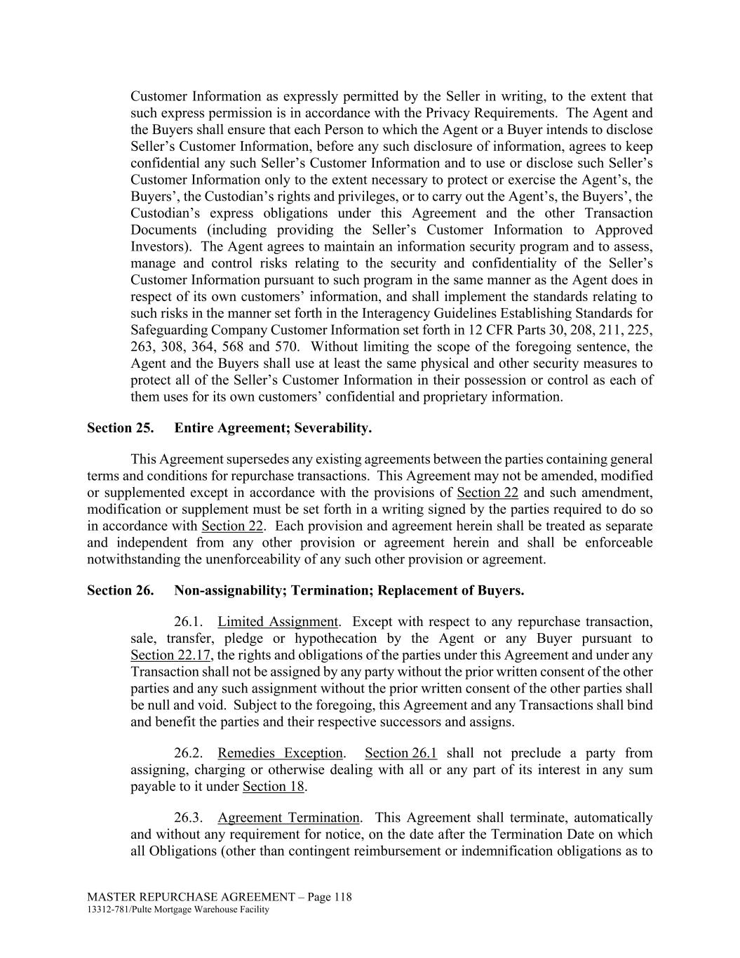 TABLE OF CONTENTS Page vi 13312-781/Pulte Mortgage Warehouse Facility 22.15. Successor Agent ...................................................................................................... 108 22.16. Merger of the Agent ................................................................................................ 109 22.17. Participation; Assignment by Buyers...................................................................... 109 22.18. The Agent and the Buyers are the only Beneficiaries of this Section .................... 112 22.19. Knowledge of Default ............................................................................................. 112 22.20. No Reliance on Agent’s Customer Identification Program .................................... 112 22.21. Other Titles ............................................................................................................. 113 22.22. Other Agreements ................................................................................................... 113 22.23. Erroneous Payments ................................................................................................ 113 Section 23. Notices and Other Communications; Electronic Transmissions. ....................... 114 Section 24. Miscellaneous. .................................................................................................... 116 24.1. Further Assurances...................................................................................................... 116 24.2. Agent as Attorney in Fact ........................................................................................... 116 24.3. Wires to Seller............................................................................................................. 117 24.4. Wires to Agent ............................................................................................................ 117 24.5. Receipt; Available Funds ............................................................................................ 117 24.6. Privacy of Customer Information ............................................................................... 117 Section 25. Entire Agreement; Severability. .......................................................................... 118 Section 26. Non-assignability; Termination; Replacement of Buyers. .................................. 118 26.1. Limited Assignment .................................................................................................... 118 26.2. Remedies Exception.................................................................................................... 118 26.3. Agreement Termination .............................................................................................. 118 26.4. Replacement of Buyers ..................................................................................... 118119 Section 27. Counterparts. ....................................................................................................... 119 Section 28. Governing Law, Jurisdiction and Venue. ........................................................... 119 Section 29. Waiver of Jury Trial. ........................................................................................... 120 Section 30. Relationship of the Parties. ................................................................................. 120 Section 31. No Waivers, Etc. ................................................................................................. 121 Section 32. Use of Employee Plan Assets. ............................................................................ 121 32.1. Prohibited Transactions .............................................................................................. 121 32.2. Audited Financial Statements Required ...................................................................... 121 32.3. Representations ........................................................................................................... 121