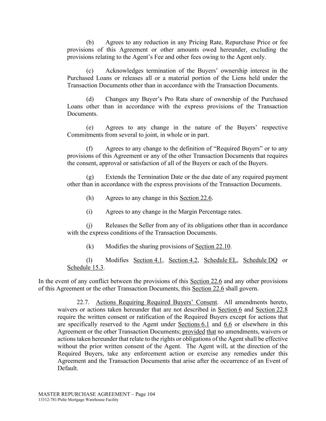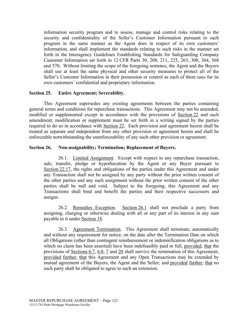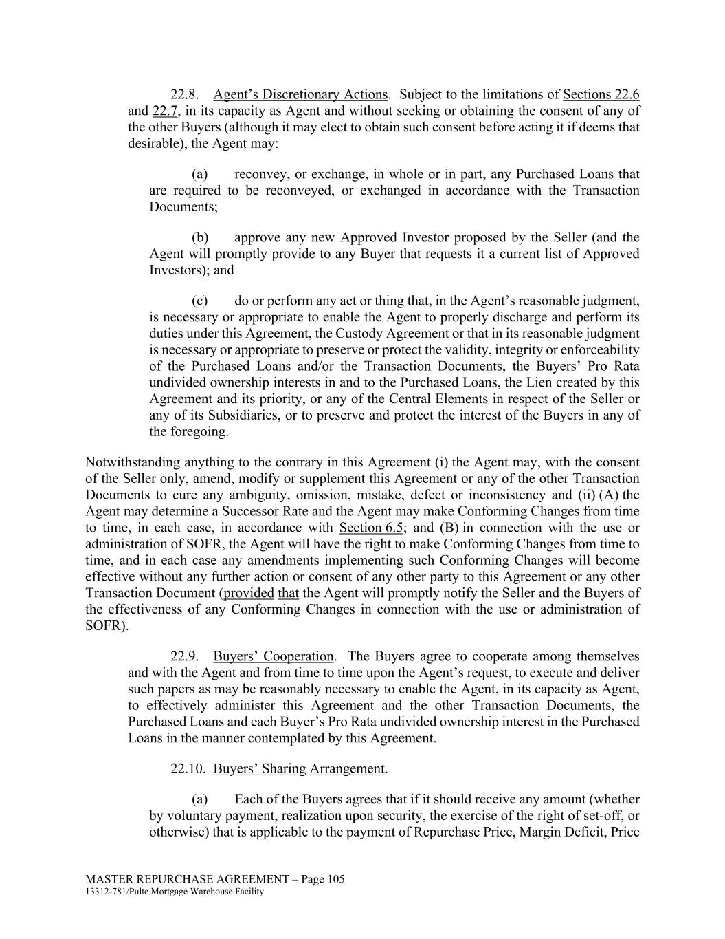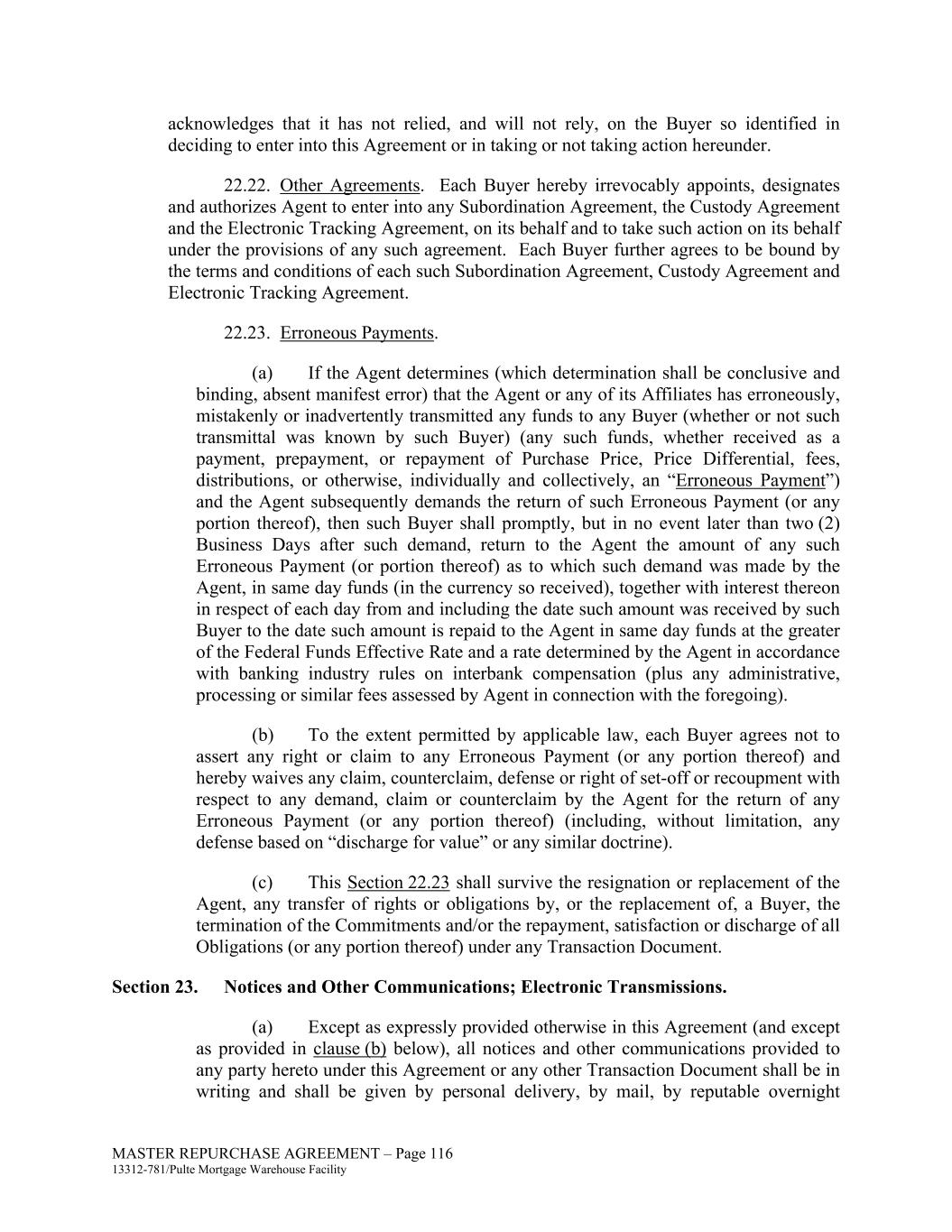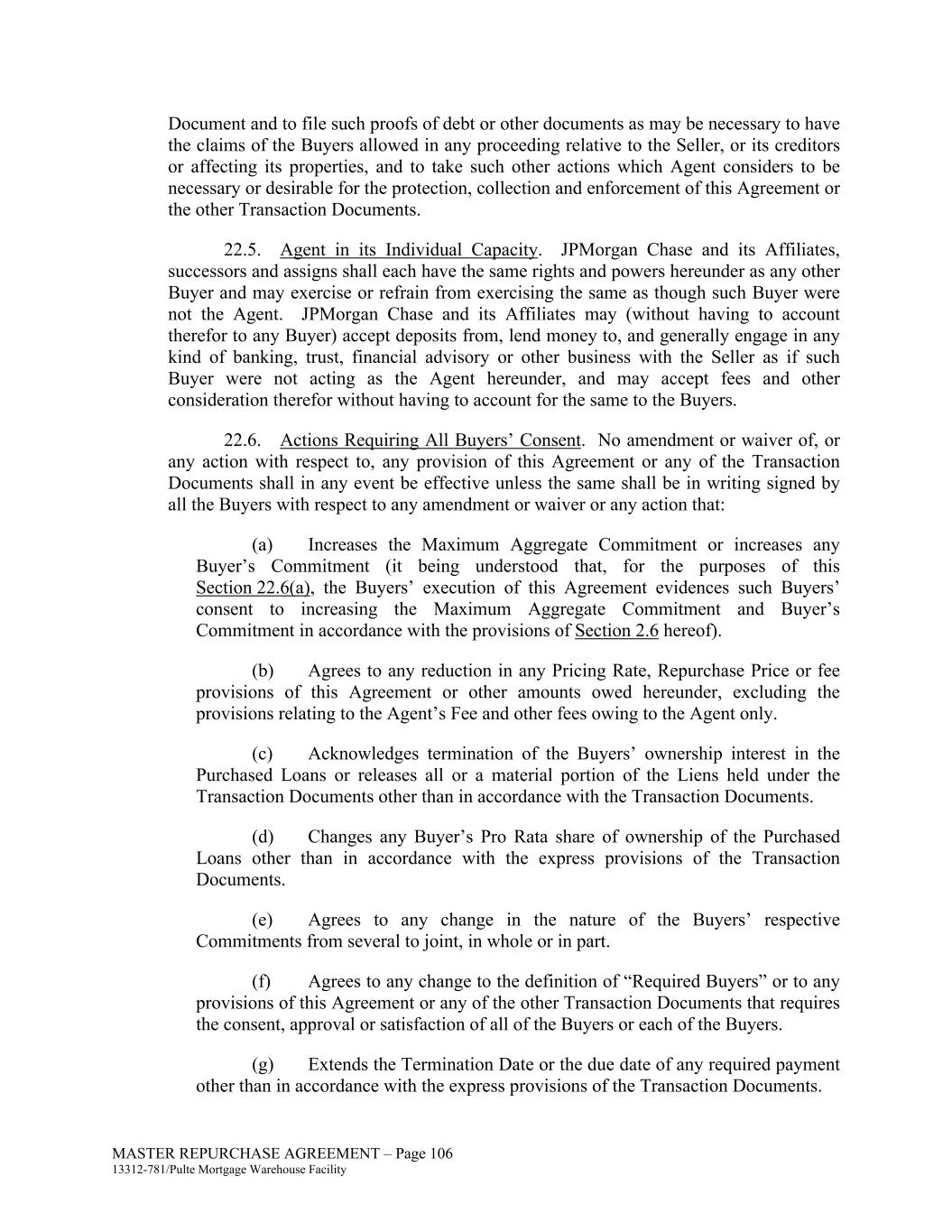 TABLE OF CONTENTS Page vi 13312-781/Pulte Mortgage Warehouse Facility 22.15. Successor Agent ...................................................................................................... 108 22.16. Merger of the Agent ................................................................................................ 109 22.17. Participation; Assignment by Buyers...................................................................... 109 22.18. The Agent and the Buyers are the only Beneficiaries of this Section .................... 112 22.19. Knowledge of Default ............................................................................................. 112 22.20. No Reliance on Agent’s Customer Identification Program .................................... 112 22.21. Other Titles ............................................................................................................. 113 22.22. Other Agreements ................................................................................................... 113 22.23. Erroneous Payments ................................................................................................ 113 Section 23. Notices and Other Communications; Electronic Transmissions. ....................... 114 Section 24. Miscellaneous. .................................................................................................... 116 24.1. Further Assurances...................................................................................................... 116 24.2. Agent as Attorney in Fact ........................................................................................... 116 24.3. Wires to Seller............................................................................................................. 117 24.4. Wires to Agent ............................................................................................................ 117 24.5. Receipt; Available Funds ............................................................................................ 117 24.6. Privacy of Customer Information ............................................................................... 117 Section 25. Entire Agreement; Severability. .......................................................................... 118 Section 26. Non-assignability; Termination; Replacement of Buyers. .................................. 118 26.1. Limited Assignment .................................................................................................... 118 26.2. Remedies Exception.................................................................................................... 118 26.3. Agreement Termination .............................................................................................. 118 26.4. Replacement of Buyers ..................................................................................... 118119 Section 27. Counterparts. ....................................................................................................... 119 Section 28. Governing Law, Jurisdiction and Venue. ........................................................... 119 Section 29. Waiver of Jury Trial. ........................................................................................... 120 Section 30. Relationship of the Parties. ................................................................................. 120 Section 31. No Waivers, Etc. ................................................................................................. 121 Section 32. Use of Employee Plan Assets. ............................................................................ 121 32.1. Prohibited Transactions .............................................................................................. 121 32.2. Audited Financial Statements Required ...................................................................... 121 32.3. Representations ........................................................................................................... 121