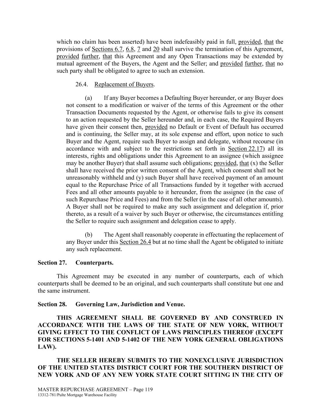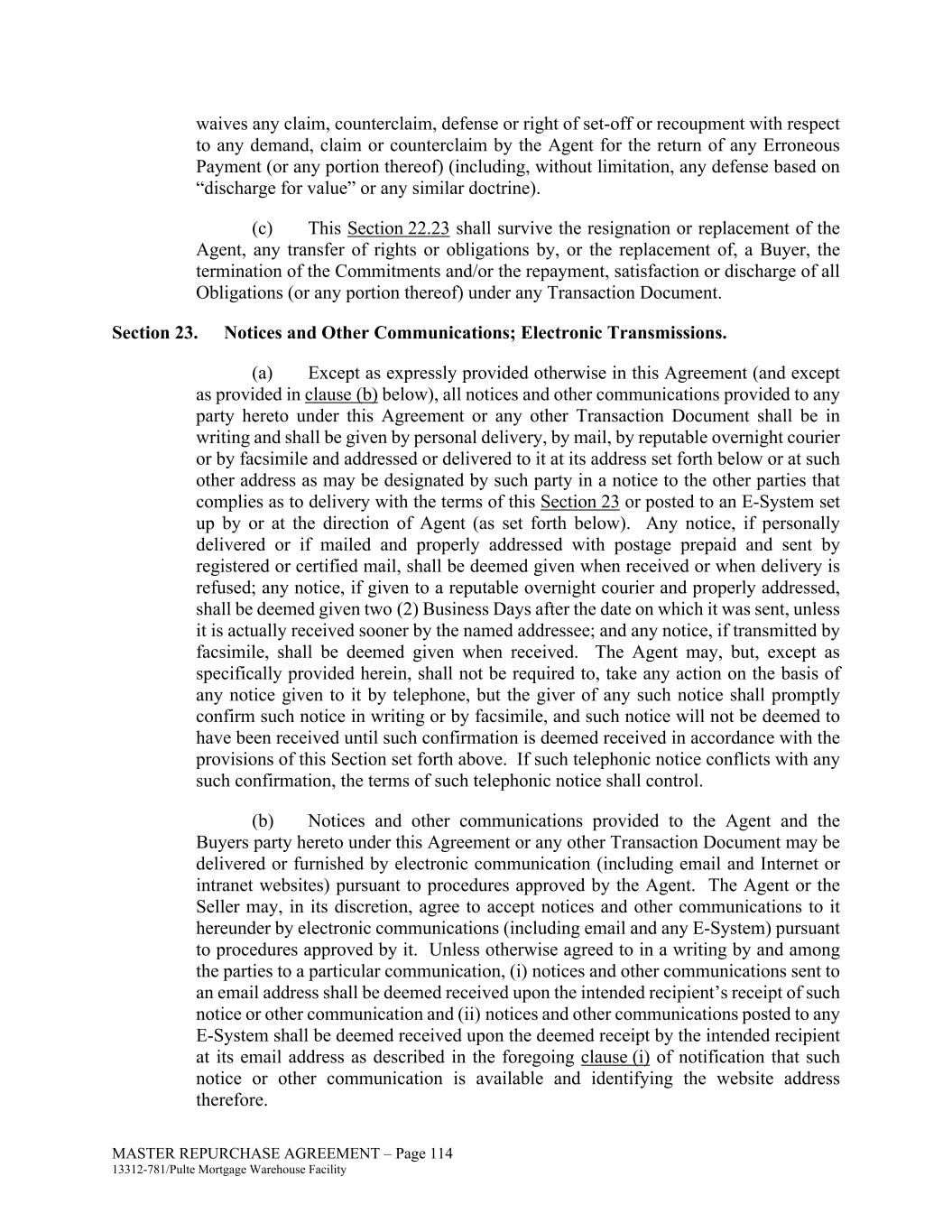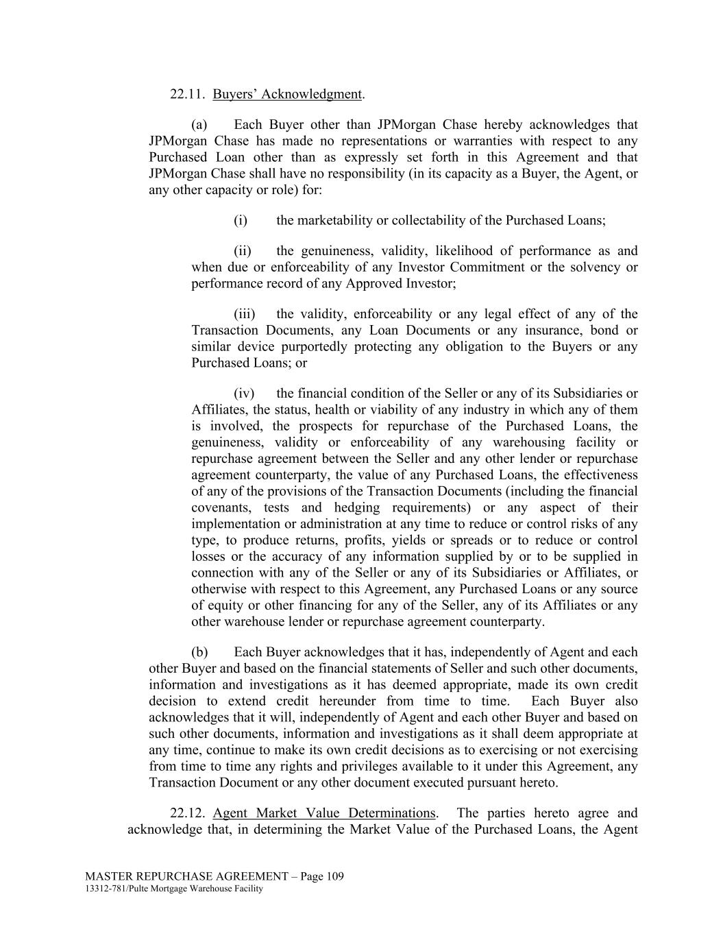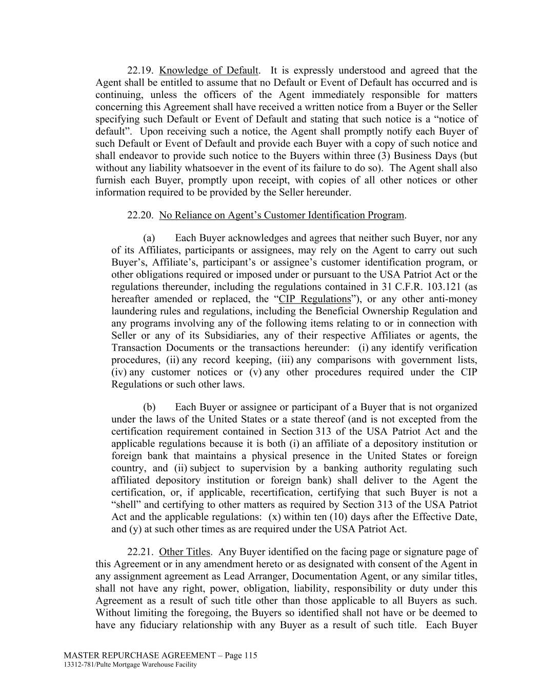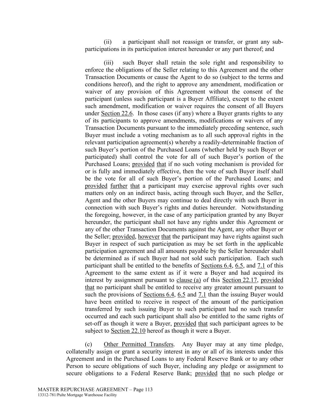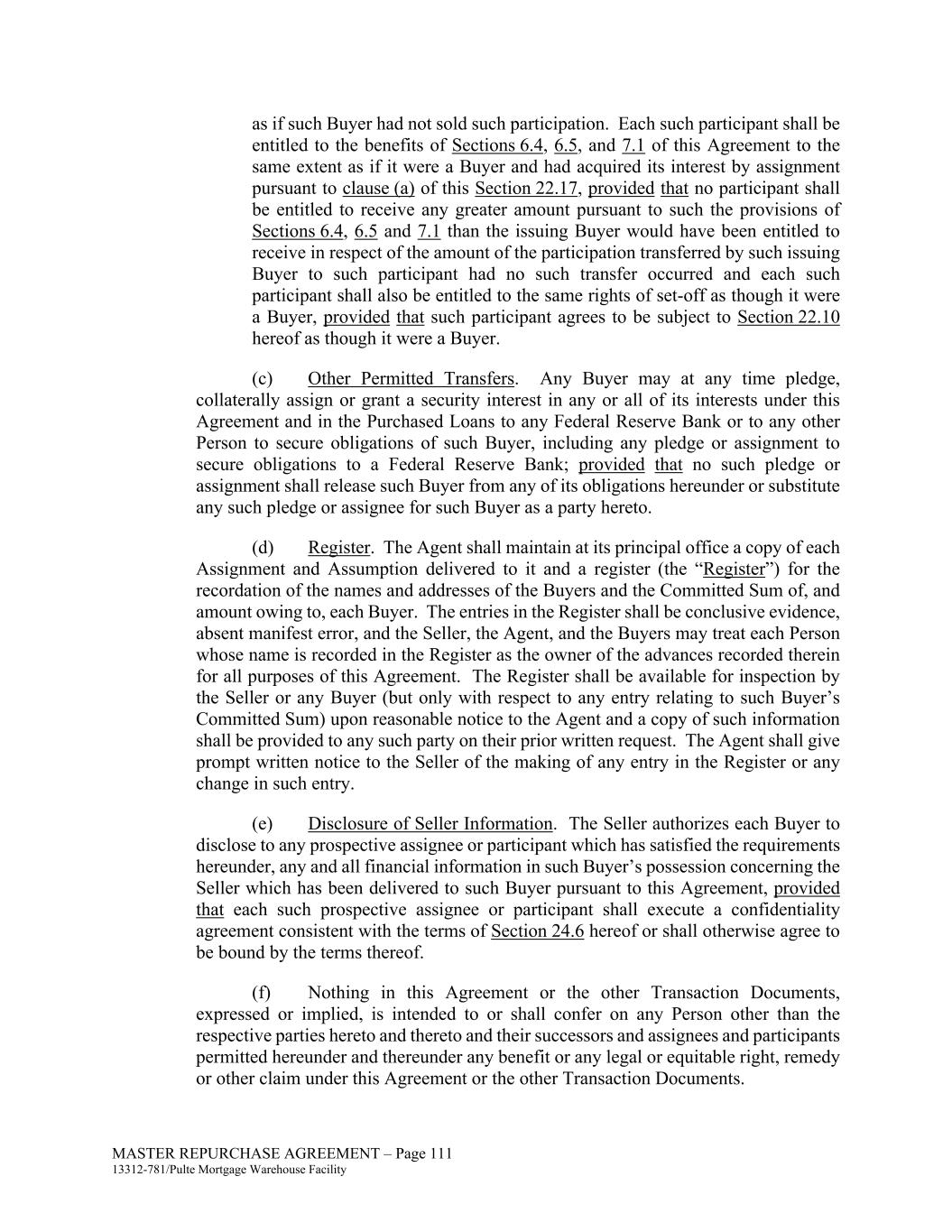 TABLE OF CONTENTS Page vi 13312-781/Pulte Mortgage Warehouse Facility 22.15. Successor Agent ...................................................................................................... 108 22.16. Merger of the Agent ................................................................................................ 109 22.17. Participation; Assignment by Buyers...................................................................... 109 22.18. The Agent and the Buyers are the only Beneficiaries of this Section .................... 112 22.19. Knowledge of Default ............................................................................................. 112 22.20. No Reliance on Agent’s Customer Identification Program .................................... 112 22.21. Other Titles ............................................................................................................. 113 22.22. Other Agreements ................................................................................................... 113 22.23. Erroneous Payments ................................................................................................ 113 Section 23. Notices and Other Communications; Electronic Transmissions. ....................... 114 Section 24. Miscellaneous. .................................................................................................... 116 24.1. Further Assurances...................................................................................................... 116 24.2. Agent as Attorney in Fact ........................................................................................... 116 24.3. Wires to Seller............................................................................................................. 117 24.4. Wires to Agent ............................................................................................................ 117 24.5. Receipt; Available Funds ............................................................................................ 117 24.6. Privacy of Customer Information ............................................................................... 117 Section 25. Entire Agreement; Severability. .......................................................................... 118 Section 26. Non-assignability; Termination; Replacement of Buyers. .................................. 118 26.1. Limited Assignment .................................................................................................... 118 26.2. Remedies Exception.................................................................................................... 118 26.3. Agreement Termination .............................................................................................. 118 26.4. Replacement of Buyers ..................................................................................... 118119 Section 27. Counterparts. ....................................................................................................... 119 Section 28. Governing Law, Jurisdiction and Venue. ........................................................... 119 Section 29. Waiver of Jury Trial. ........................................................................................... 120 Section 30. Relationship of the Parties. ................................................................................. 120 Section 31. No Waivers, Etc. ................................................................................................. 121 Section 32. Use of Employee Plan Assets. ............................................................................ 121 32.1. Prohibited Transactions .............................................................................................. 121 32.2. Audited Financial Statements Required ...................................................................... 121 32.3. Representations ........................................................................................................... 121