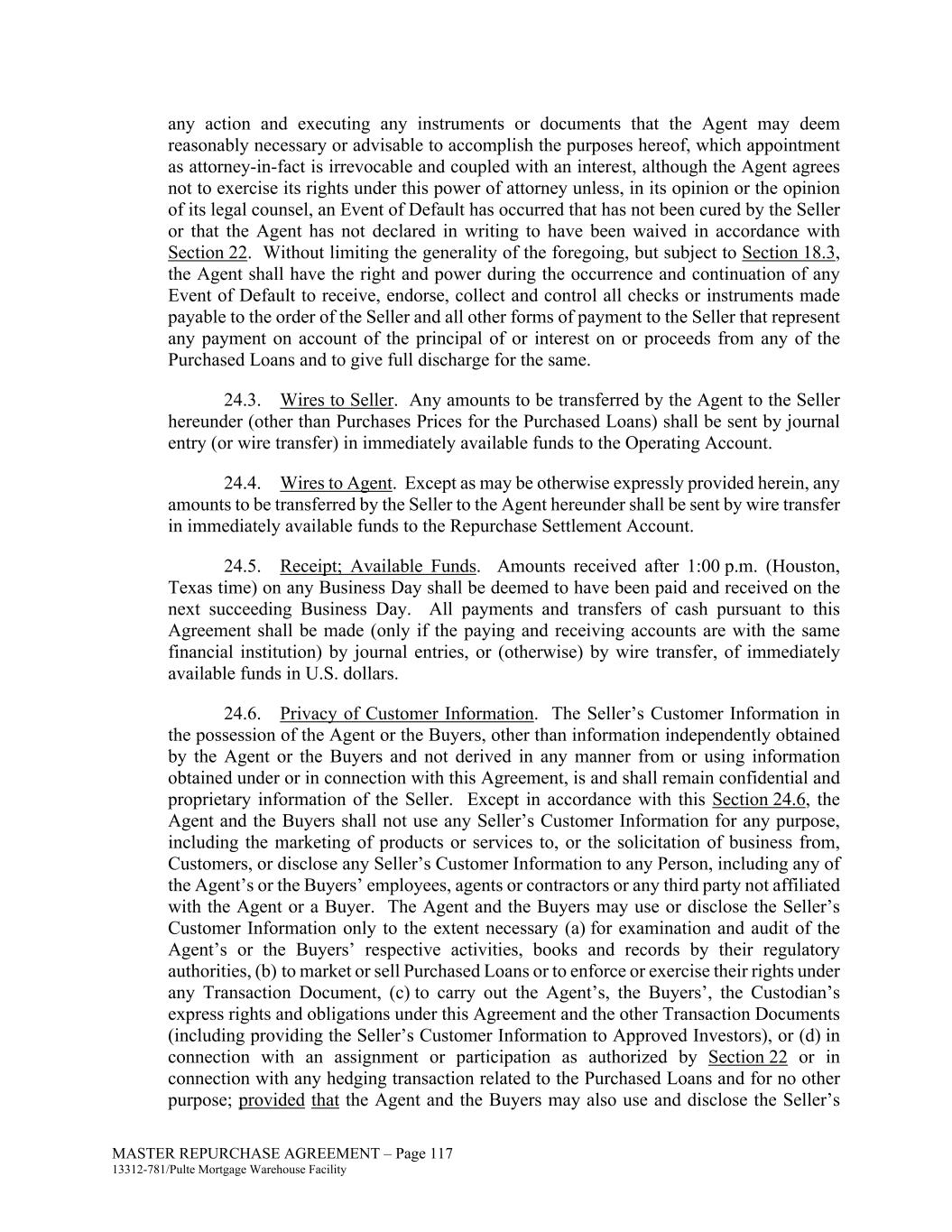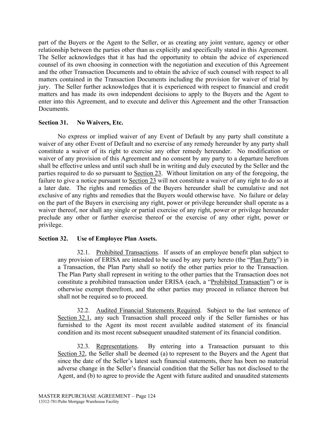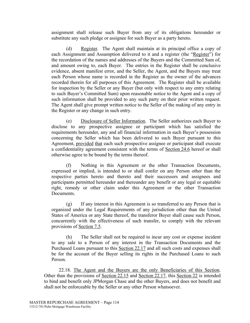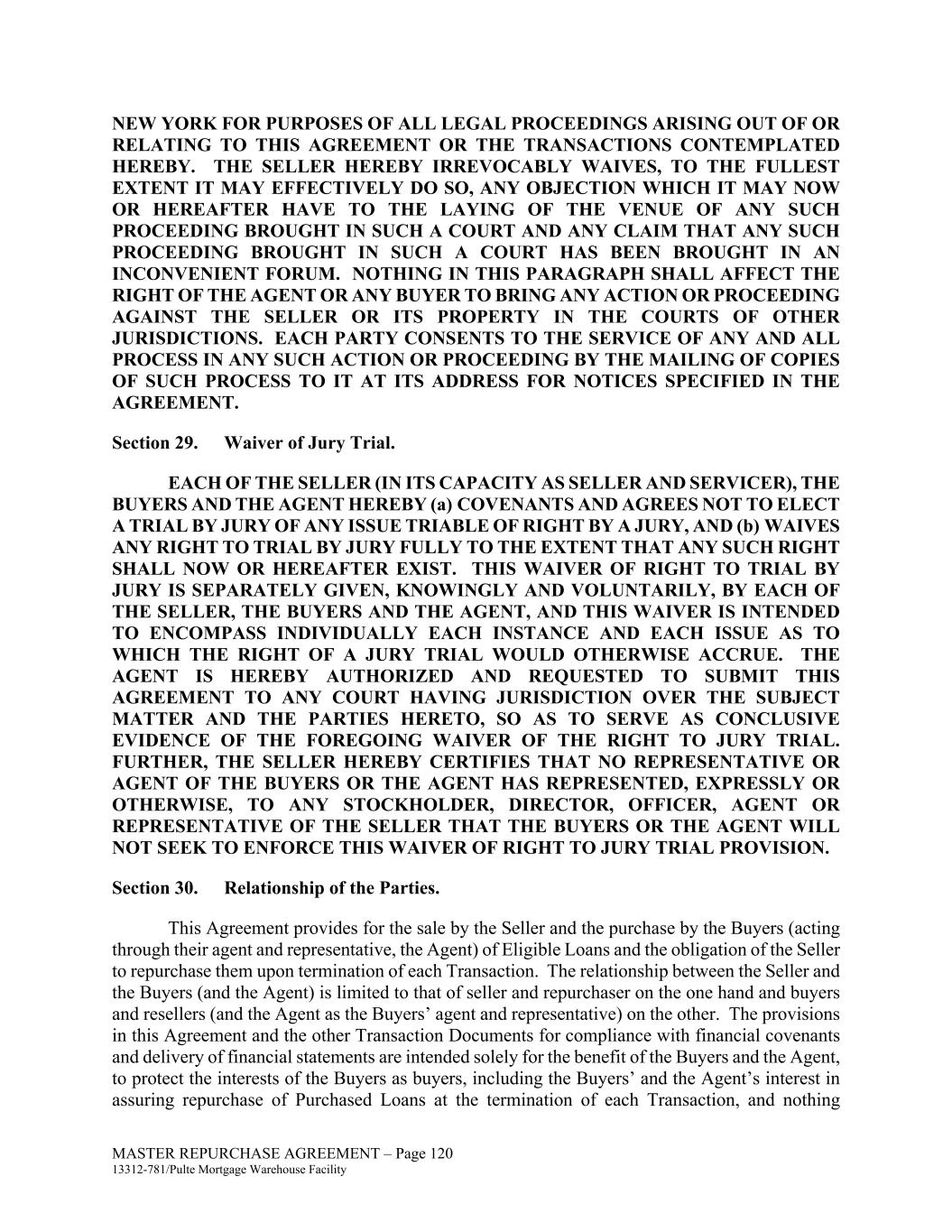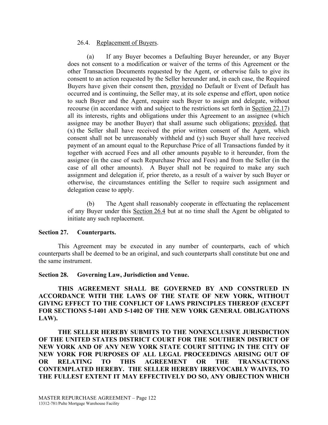 TABLE OF CONTENTS Page vi 13312-781/Pulte Mortgage Warehouse Facility 22.15. Successor Agent ...................................................................................................... 108 22.16. Merger of the Agent ................................................................................................ 109 22.17. Participation; Assignment by Buyers...................................................................... 109 22.18. The Agent and the Buyers are the only Beneficiaries of this Section .................... 112 22.19. Knowledge of Default ............................................................................................. 112 22.20. No Reliance on Agent’s Customer Identification Program .................................... 112 22.21. Other Titles ............................................................................................................. 113 22.22. Other Agreements ................................................................................................... 113 22.23. Erroneous Payments ................................................................................................ 113 Section 23. Notices and Other Communications; Electronic Transmissions. ....................... 114 Section 24. Miscellaneous. .................................................................................................... 116 24.1. Further Assurances...................................................................................................... 116 24.2. Agent as Attorney in Fact ........................................................................................... 116 24.3. Wires to Seller............................................................................................................. 117 24.4. Wires to Agent ............................................................................................................ 117 24.5. Receipt; Available Funds ............................................................................................ 117 24.6. Privacy of Customer Information ............................................................................... 117 Section 25. Entire Agreement; Severability. .......................................................................... 118 Section 26. Non-assignability; Termination; Replacement of Buyers. .................................. 118 26.1. Limited Assignment .................................................................................................... 118 26.2. Remedies Exception.................................................................................................... 118 26.3. Agreement Termination .............................................................................................. 118 26.4. Replacement of Buyers ..................................................................................... 118119 Section 27. Counterparts. ....................................................................................................... 119 Section 28. Governing Law, Jurisdiction and Venue. ........................................................... 119 Section 29. Waiver of Jury Trial. ........................................................................................... 120 Section 30. Relationship of the Parties. ................................................................................. 120 Section 31. No Waivers, Etc. ................................................................................................. 121 Section 32. Use of Employee Plan Assets. ............................................................................ 121 32.1. Prohibited Transactions .............................................................................................. 121 32.2. Audited Financial Statements Required ...................................................................... 121 32.3. Representations ........................................................................................................... 121