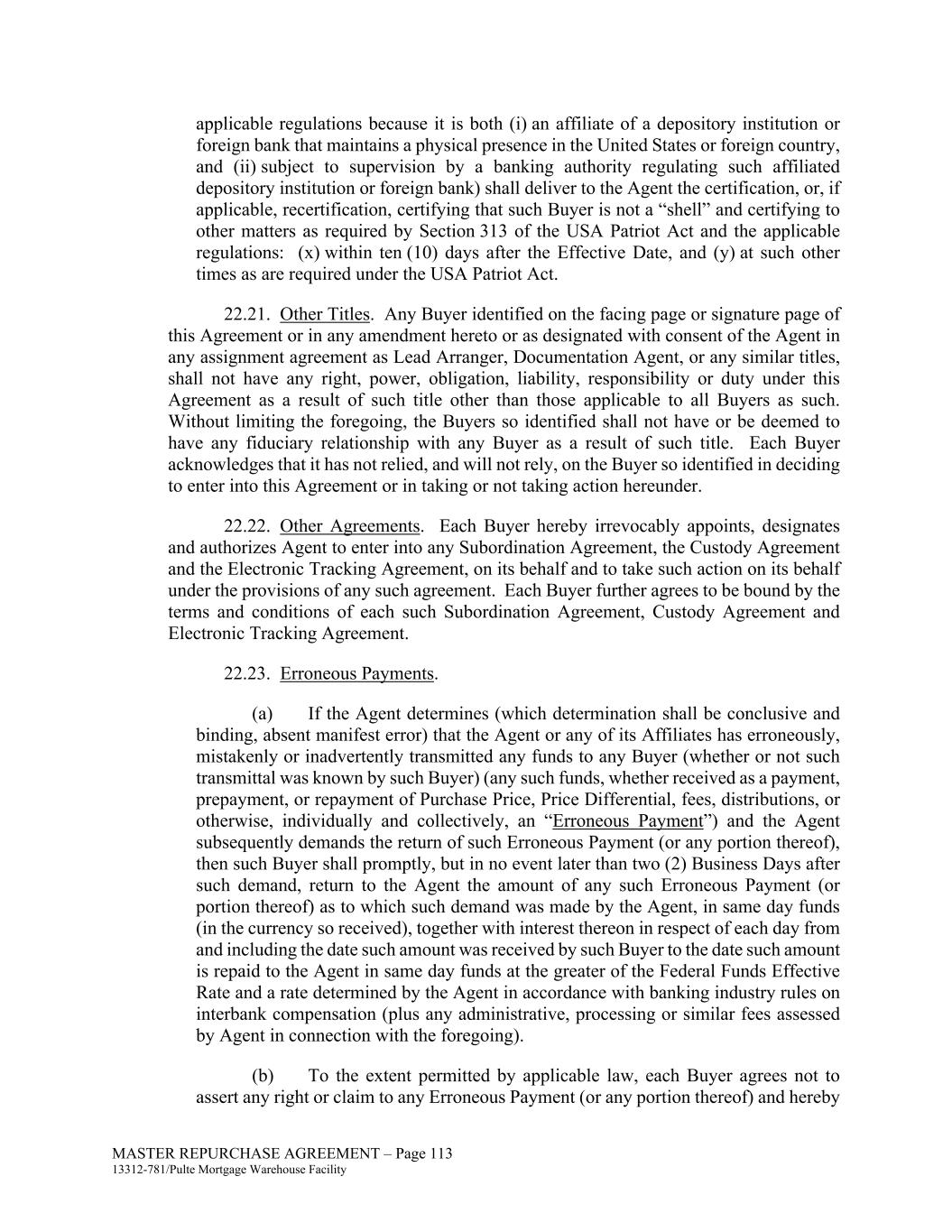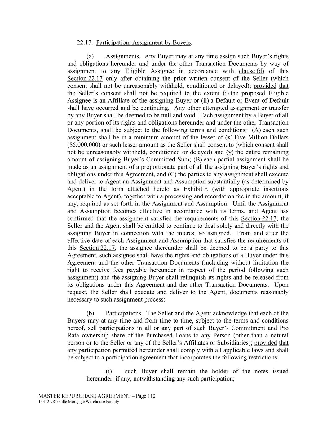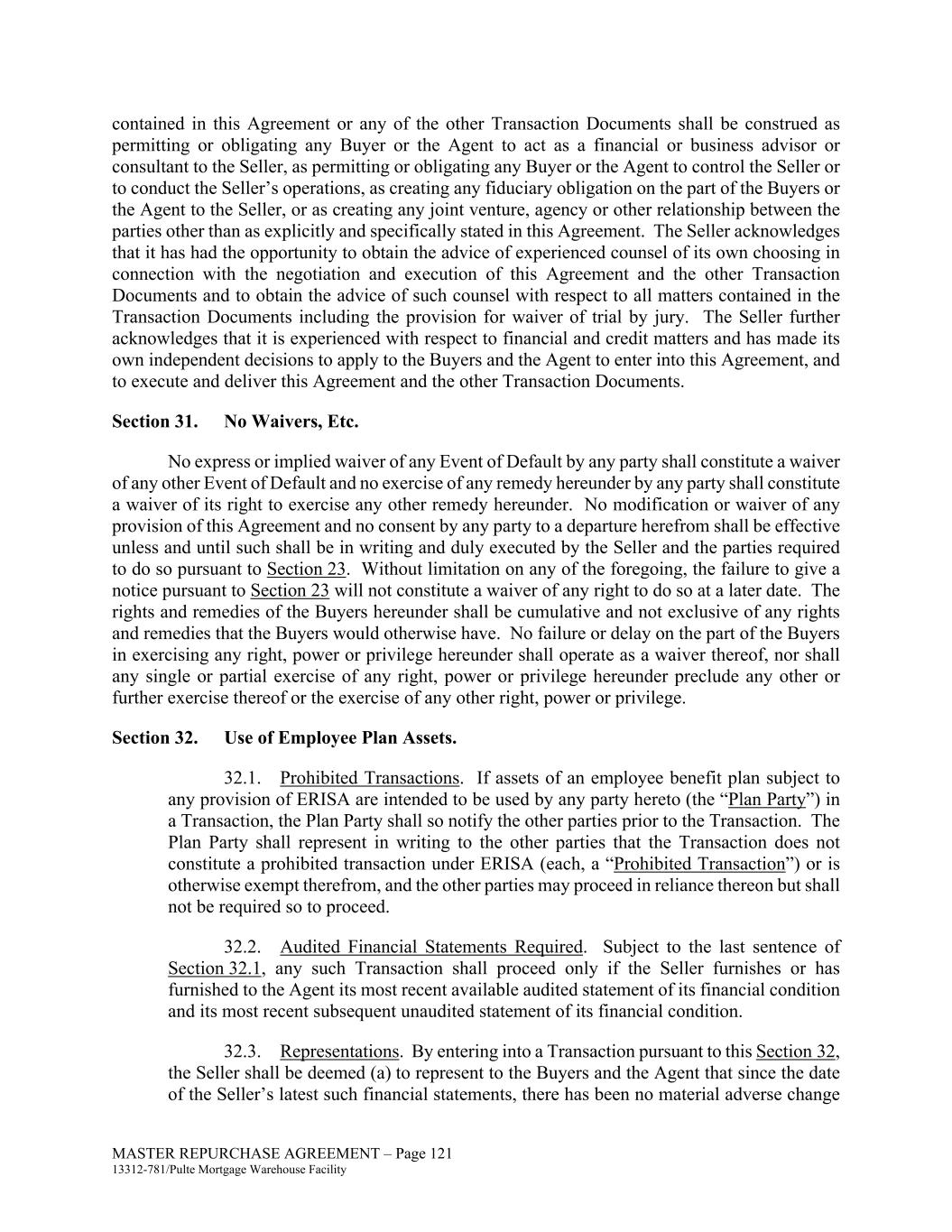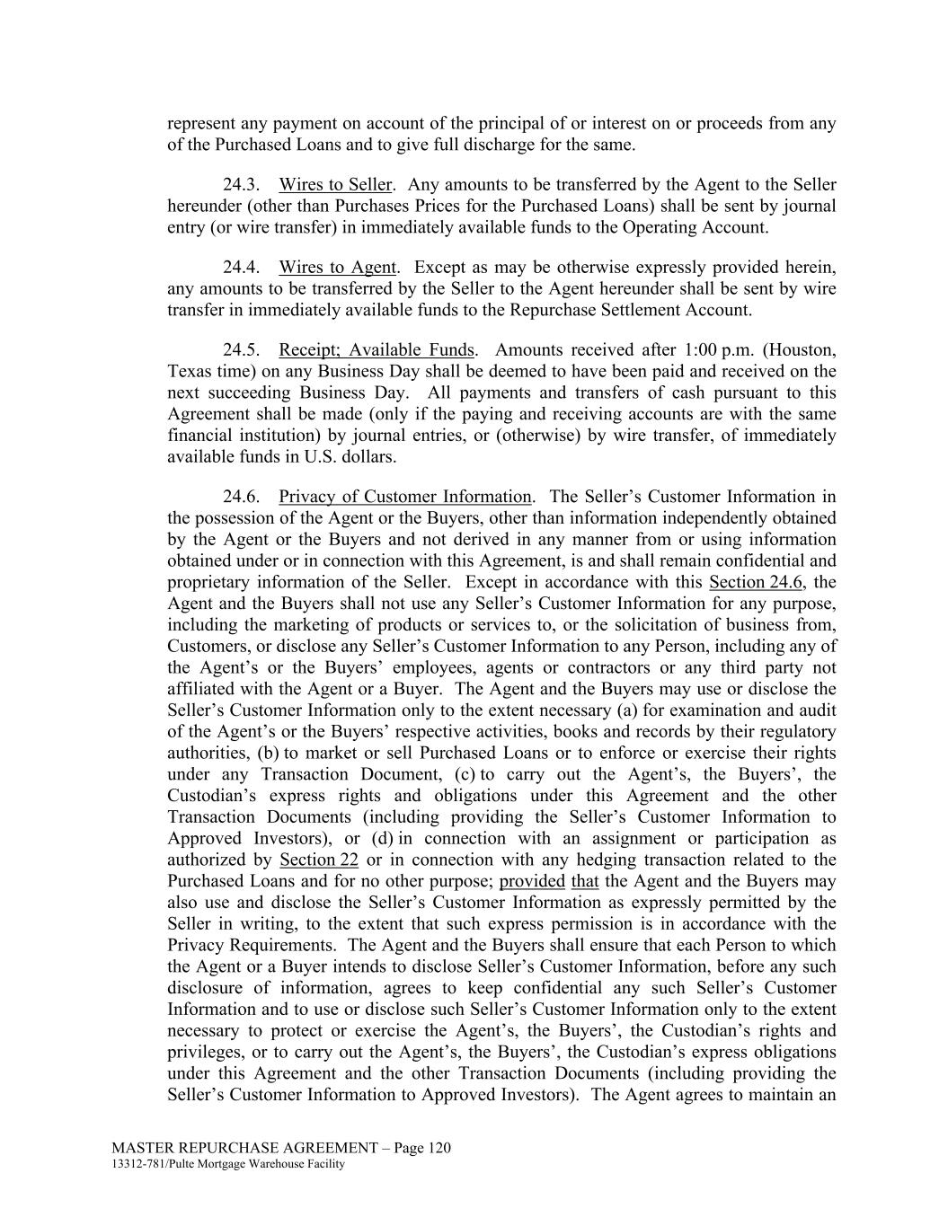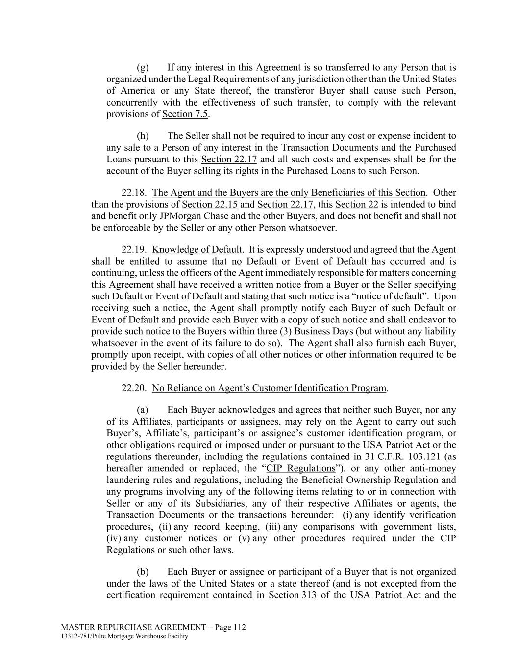 TABLE OF CONTENTS Page vi 13312-781/Pulte Mortgage Warehouse Facility 22.15. Successor Agent ...................................................................................................... 108 22.16. Merger of the Agent ................................................................................................ 109 22.17. Participation; Assignment by Buyers...................................................................... 109 22.18. The Agent and the Buyers are the only Beneficiaries of this Section .................... 112 22.19. Knowledge of Default ............................................................................................. 112 22.20. No Reliance on Agent’s Customer Identification Program .................................... 112 22.21. Other Titles ............................................................................................................. 113 22.22. Other Agreements ................................................................................................... 113 22.23. Erroneous Payments ................................................................................................ 113 Section 23. Notices and Other Communications; Electronic Transmissions. ....................... 114 Section 24. Miscellaneous. .................................................................................................... 116 24.1. Further Assurances...................................................................................................... 116 24.2. Agent as Attorney in Fact ........................................................................................... 116 24.3. Wires to Seller............................................................................................................. 117 24.4. Wires to Agent ............................................................................................................ 117 24.5. Receipt; Available Funds ............................................................................................ 117 24.6. Privacy of Customer Information ............................................................................... 117 Section 25. Entire Agreement; Severability. .......................................................................... 118 Section 26. Non-assignability; Termination; Replacement of Buyers. .................................. 118 26.1. Limited Assignment .................................................................................................... 118 26.2. Remedies Exception.................................................................................................... 118 26.3. Agreement Termination .............................................................................................. 118 26.4. Replacement of Buyers ..................................................................................... 118119 Section 27. Counterparts. ....................................................................................................... 119 Section 28. Governing Law, Jurisdiction and Venue. ........................................................... 119 Section 29. Waiver of Jury Trial. ........................................................................................... 120 Section 30. Relationship of the Parties. ................................................................................. 120 Section 31. No Waivers, Etc. ................................................................................................. 121 Section 32. Use of Employee Plan Assets. ............................................................................ 121 32.1. Prohibited Transactions .............................................................................................. 121 32.2. Audited Financial Statements Required ...................................................................... 121 32.3. Representations ........................................................................................................... 121