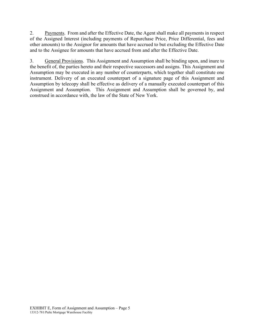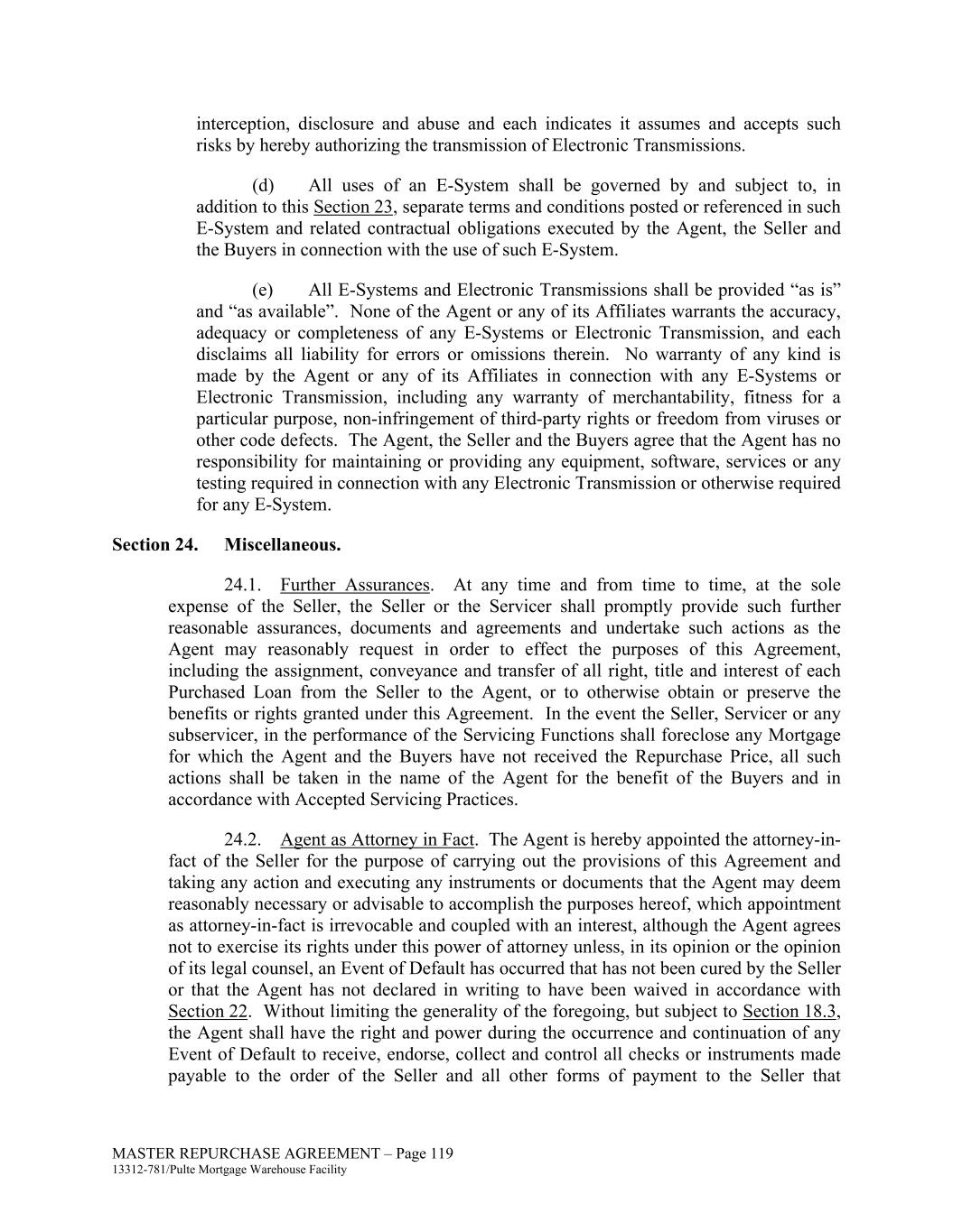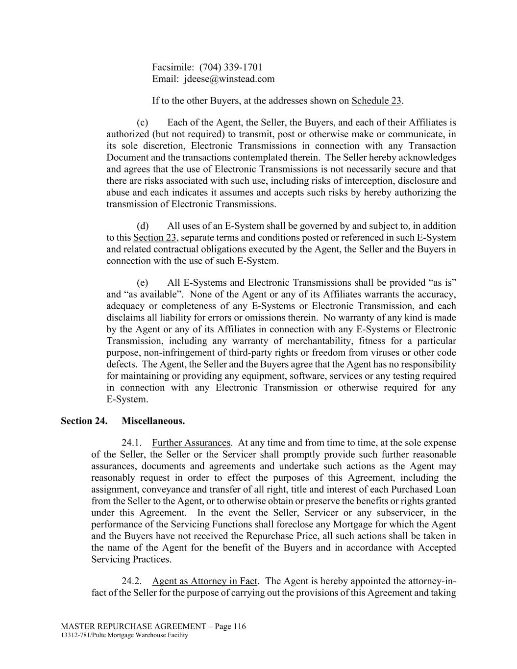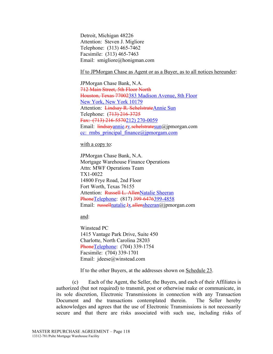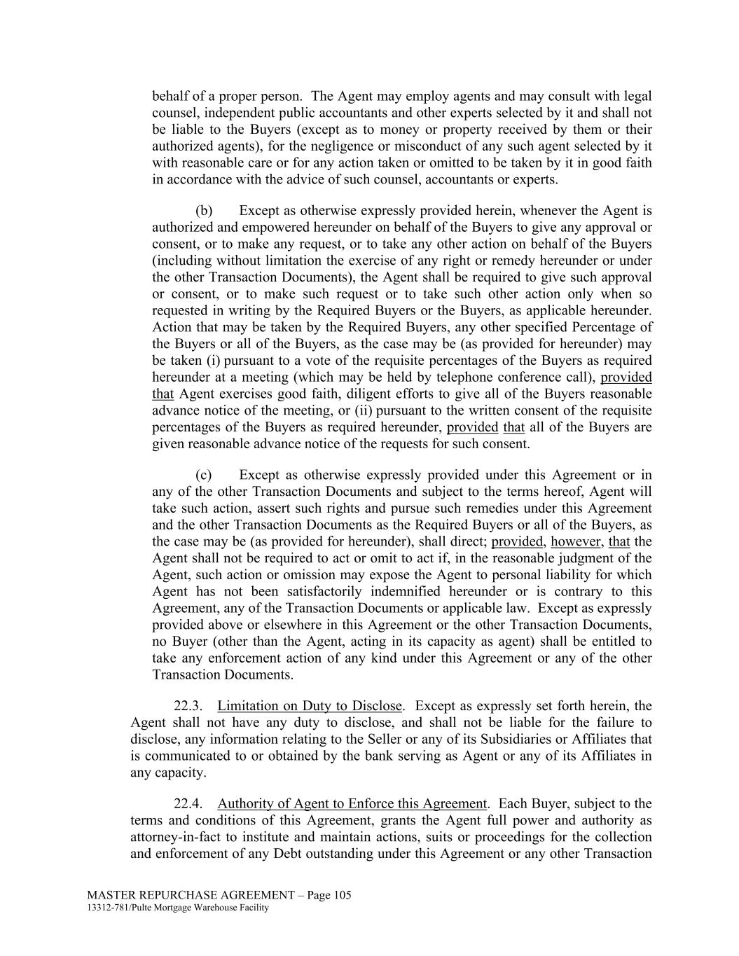 TABLE OF CONTENTS Page vi 13312-781/Pulte Mortgage Warehouse Facility 22.15. Successor Agent ...................................................................................................... 108 22.16. Merger of the Agent ................................................................................................ 109 22.17. Participation; Assignment by Buyers...................................................................... 109 22.18. The Agent and the Buyers are the only Beneficiaries of this Section .................... 112 22.19. Knowledge of Default ............................................................................................. 112 22.20. No Reliance on Agent’s Customer Identification Program .................................... 112 22.21. Other Titles ............................................................................................................. 113 22.22. Other Agreements ................................................................................................... 113 22.23. Erroneous Payments ................................................................................................ 113 Section 23. Notices and Other Communications; Electronic Transmissions. ....................... 114 Section 24. Miscellaneous. .................................................................................................... 116 24.1. Further Assurances...................................................................................................... 116 24.2. Agent as Attorney in Fact ........................................................................................... 116 24.3. Wires to Seller............................................................................................................. 117 24.4. Wires to Agent ............................................................................................................ 117 24.5. Receipt; Available Funds ............................................................................................ 117 24.6. Privacy of Customer Information ............................................................................... 117 Section 25. Entire Agreement; Severability. .......................................................................... 118 Section 26. Non-assignability; Termination; Replacement of Buyers. .................................. 118 26.1. Limited Assignment .................................................................................................... 118 26.2. Remedies Exception.................................................................................................... 118 26.3. Agreement Termination .............................................................................................. 118 26.4. Replacement of Buyers ..................................................................................... 118119 Section 27. Counterparts. ....................................................................................................... 119 Section 28. Governing Law, Jurisdiction and Venue. ........................................................... 119 Section 29. Waiver of Jury Trial. ........................................................................................... 120 Section 30. Relationship of the Parties. ................................................................................. 120 Section 31. No Waivers, Etc. ................................................................................................. 121 Section 32. Use of Employee Plan Assets. ............................................................................ 121 32.1. Prohibited Transactions .............................................................................................. 121 32.2. Audited Financial Statements Required ...................................................................... 121 32.3. Representations ........................................................................................................... 121