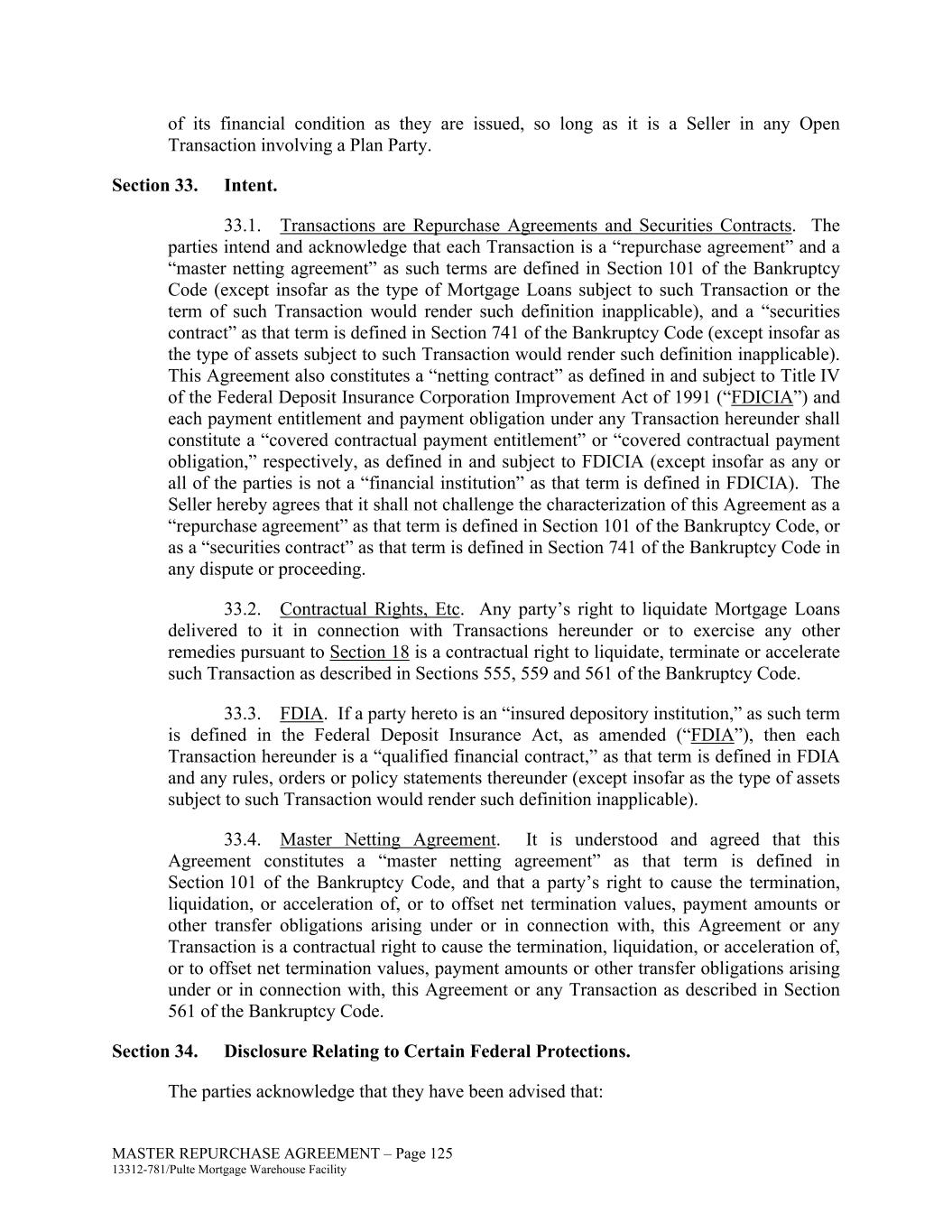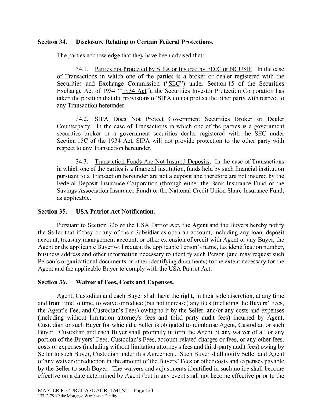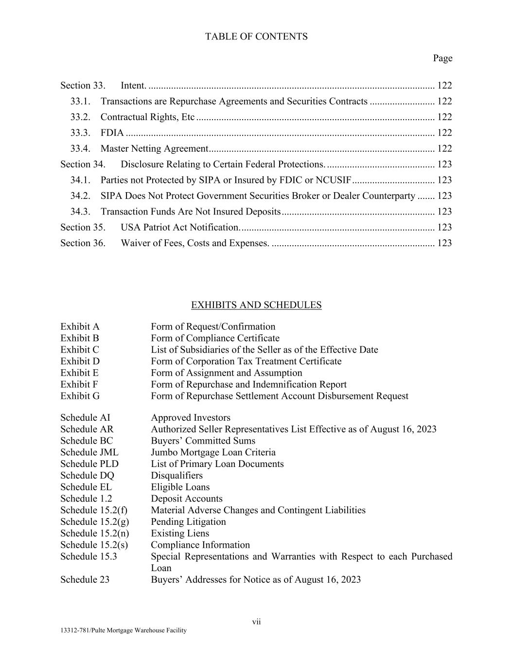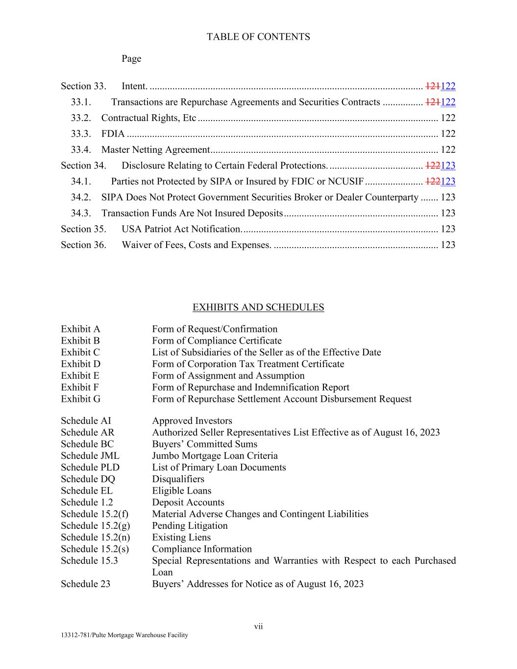 TABLE OF CONTENTS Page vii 13312-781/Pulte Mortgage Warehouse Facility Section 33. Intent. ............................................................................................................ 121122 33.1. Transactions are Repurchase Agreements and Securities Contracts ................ 121122 33.2. Contractual Rights, Etc ............................................................................................... 122 33.3. FDIA ........................................................................................................................... 122 33.4. Master Netting Agreement .......................................................................................... 122 Section 34. Disclosure Relating to Certain Federal Protections. ..................................... 122123 34.1. Parties not Protected by SIPA or Insured by FDIC or NCUSIF ....................... 122123 34.2. SIPA Does Not Protect Government Securities Broker or Dealer Counterparty ....... 123 34.3. Transaction Funds Are Not Insured Deposits ............................................................. 123 Section 35. USA Patriot Act Notification. ............................................................................. 123 Section 36. Waiver of Fees, Costs and Expenses. ................................................................. 123 EXHIBITS AND SCHEDULES Exhibit A Form of Request/Confirmation Exhibit B Form of Compliance Certificate Exhibit C List of Subsidiaries of the Seller as of the Effective Date Exhibit D Form of Corporation Tax Treatment Certificate Exhibit E Form of Assignment and Assumption Exhibit F Form of Repurchase and Indemnification Report Exhibit G Form of Repurchase Settlement Account Disbursement Request Schedule AI Approved Investors Schedule AR Authorized Seller Representatives List Effective as of August 16, 2023 Schedule BC Buyers’ Committed Sums Schedule JML Jumbo Mortgage Loan Criteria Schedule PLD List of Primary Loan Documents Schedule DQ Disqualifiers Schedule EL Eligible Loans Schedule 1.2 Deposit Accounts Schedule 15.2(f) Material Adverse Changes and Contingent Liabilities Schedule 15.2(g) Pending Litigation Schedule 15.2(n) Existing Liens Schedule 15.2(s) Compliance Information Schedule 15.3 Special Representations and Warranties with Respect to each Purchased Loan Schedule 23 Buyers’ Addresses for Notice as of August 16, 2023