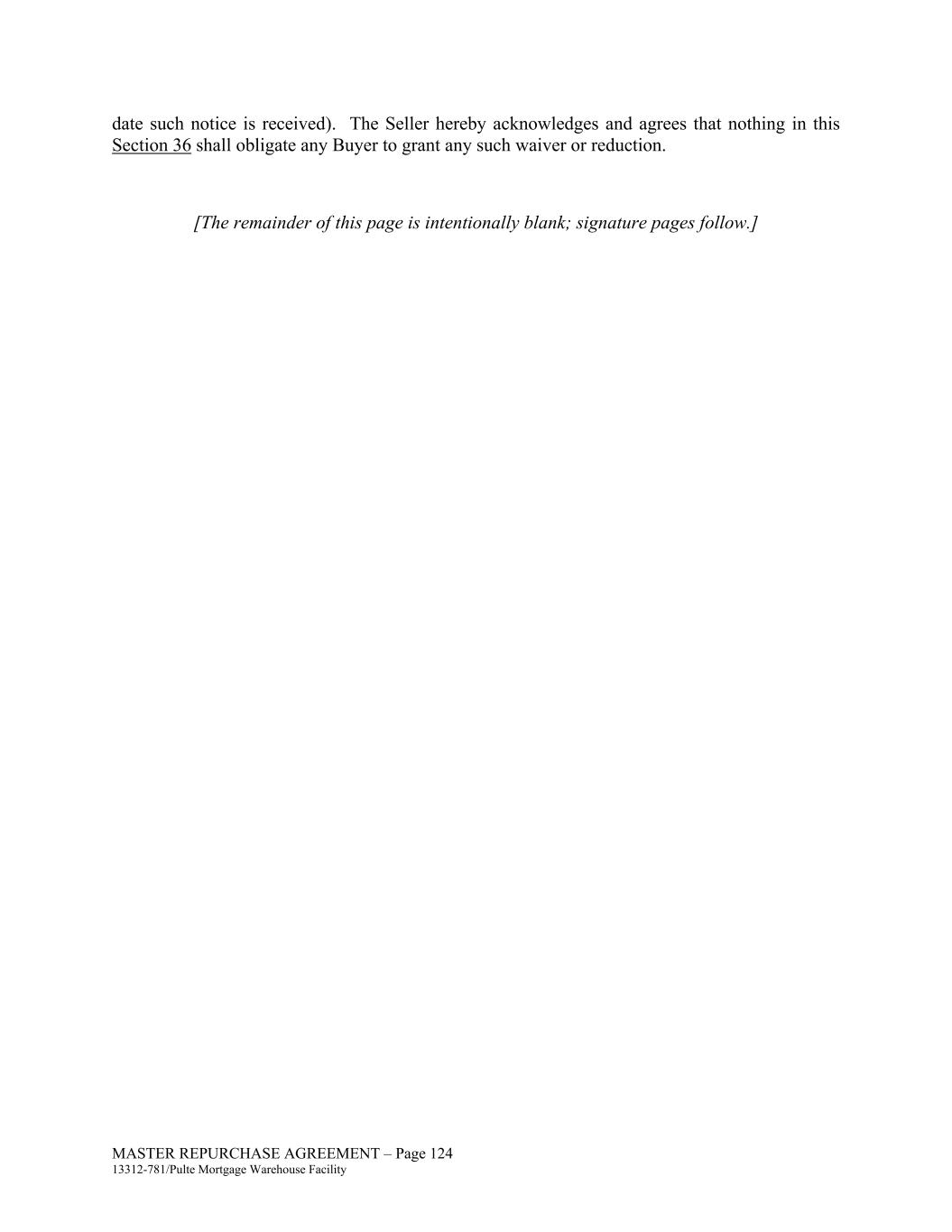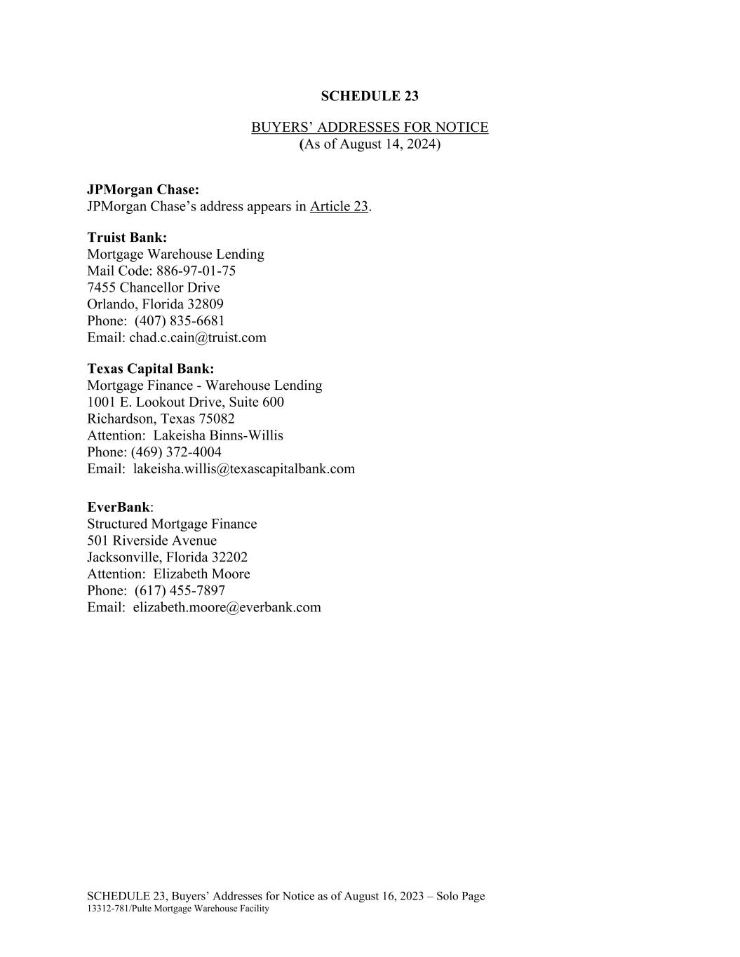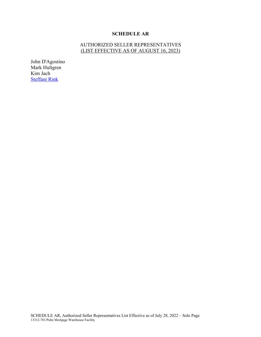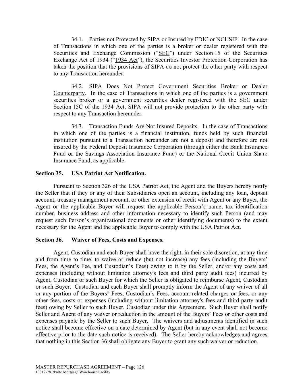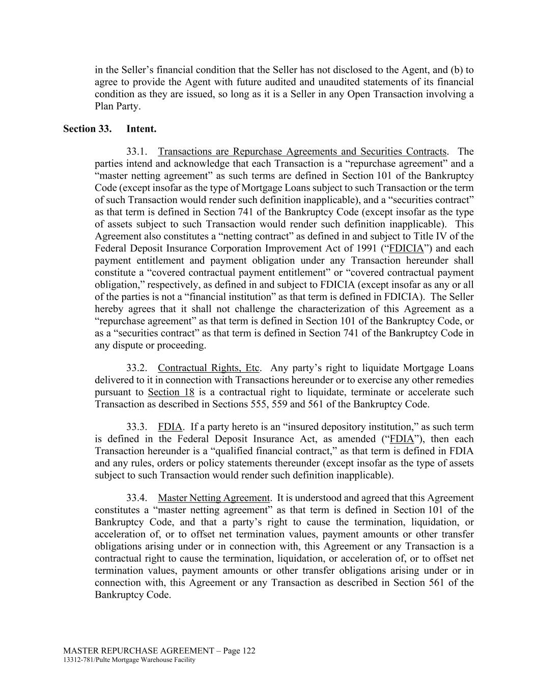 TABLE OF CONTENTS Page vii 13312-781/Pulte Mortgage Warehouse Facility Section 33. Intent. ............................................................................................................ 121122 33.1. Transactions are Repurchase Agreements and Securities Contracts ................ 121122 33.2. Contractual Rights, Etc ............................................................................................... 122 33.3. FDIA ........................................................................................................................... 122 33.4. Master Netting Agreement .......................................................................................... 122 Section 34. Disclosure Relating to Certain Federal Protections. ..................................... 122123 34.1. Parties not Protected by SIPA or Insured by FDIC or NCUSIF ....................... 122123 34.2. SIPA Does Not Protect Government Securities Broker or Dealer Counterparty ....... 123 34.3. Transaction Funds Are Not Insured Deposits ............................................................. 123 Section 35. USA Patriot Act Notification. ............................................................................. 123 Section 36. Waiver of Fees, Costs and Expenses. ................................................................. 123 EXHIBITS AND SCHEDULES Exhibit A Form of Request/Confirmation Exhibit B Form of Compliance Certificate Exhibit C List of Subsidiaries of the Seller as of the Effective Date Exhibit D Form of Corporation Tax Treatment Certificate Exhibit E Form of Assignment and Assumption Exhibit F Form of Repurchase and Indemnification Report Exhibit G Form of Repurchase Settlement Account Disbursement Request Schedule AI Approved Investors Schedule AR Authorized Seller Representatives List Effective as of August 16, 2023 Schedule BC Buyers’ Committed Sums Schedule JML Jumbo Mortgage Loan Criteria Schedule PLD List of Primary Loan Documents Schedule DQ Disqualifiers Schedule EL Eligible Loans Schedule 1.2 Deposit Accounts Schedule 15.2(f) Material Adverse Changes and Contingent Liabilities Schedule 15.2(g) Pending Litigation Schedule 15.2(n) Existing Liens Schedule 15.2(s) Compliance Information Schedule 15.3 Special Representations and Warranties with Respect to each Purchased Loan Schedule 23 Buyers’ Addresses for Notice as of August 16, 2023