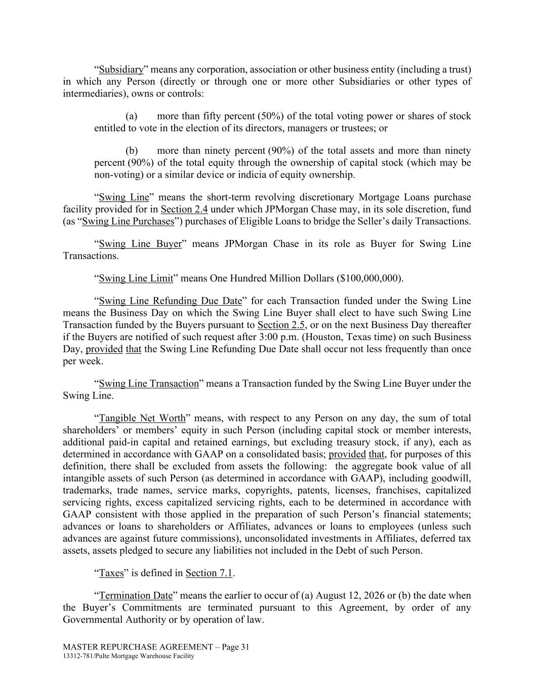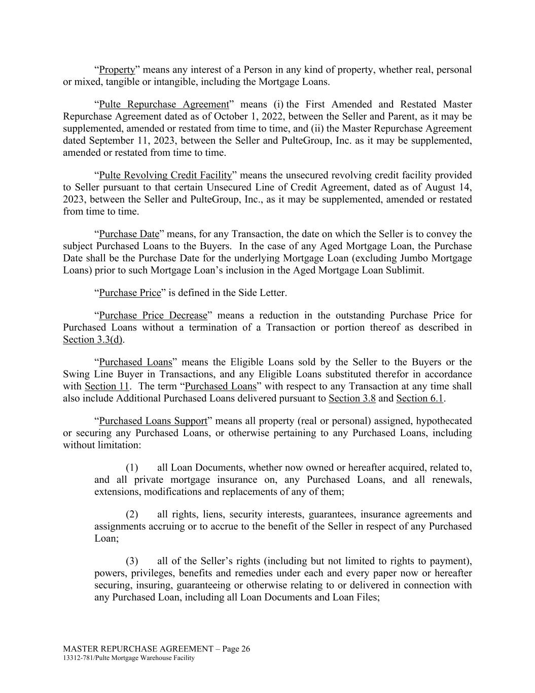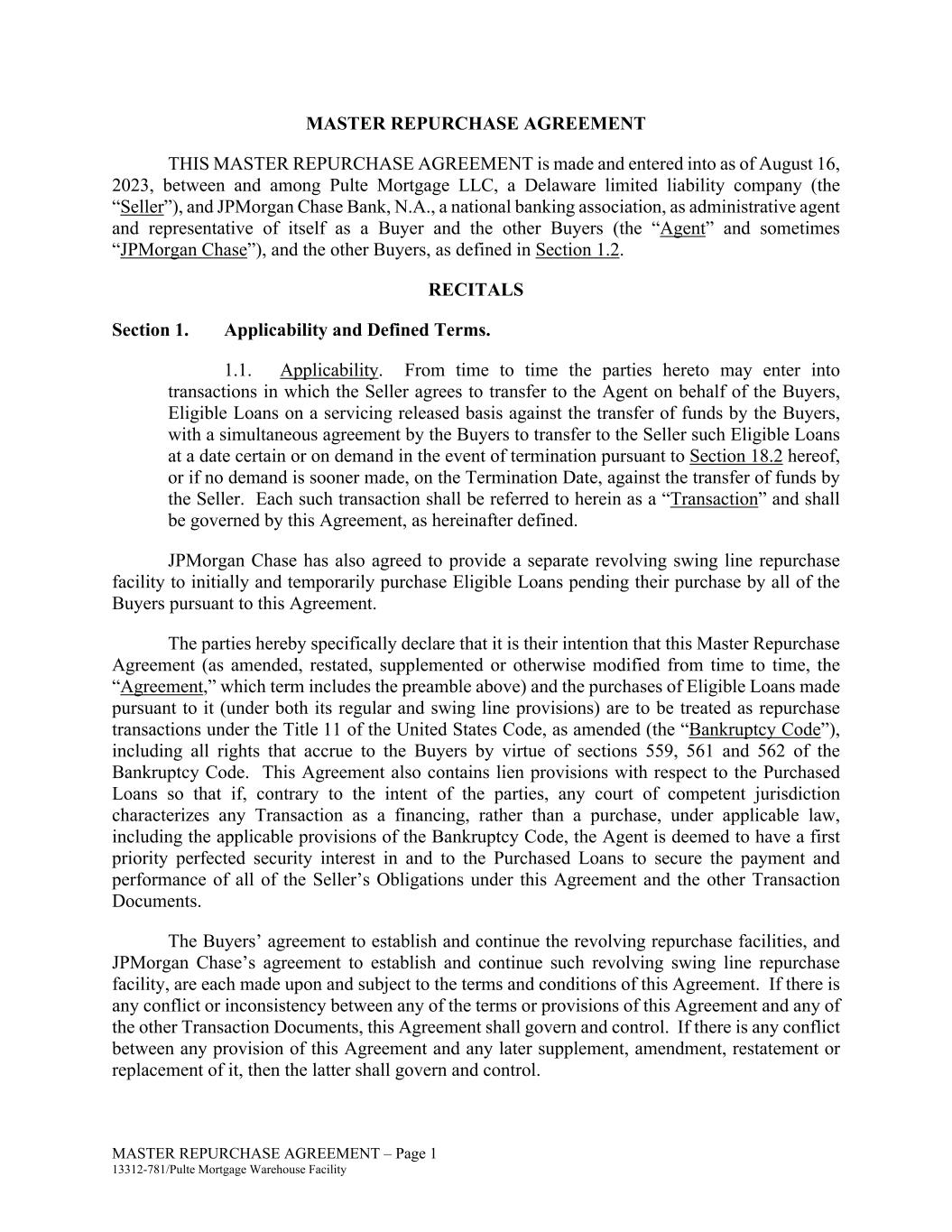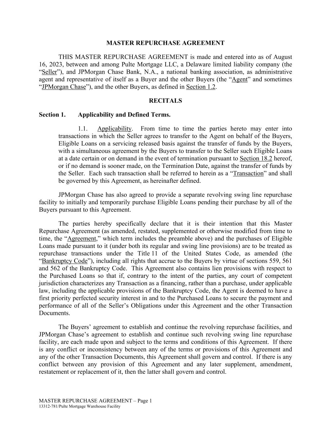 MASTER REPURCHASE AGREEMENT – Page 1 13312-781/Pulte Mortgage Warehouse Facility MASTER REPURCHASE AGREEMENT THIS MASTER REPURCHASE AGREEMENT is made and entered into as of August 16, 2023, between and among Pulte Mortgage LLC, a Delaware limited liability company (the “Seller”), and JPMorgan Chase Bank, N.A., a national banking association, as administrative agent and representative of itself as a Buyer and the other Buyers (the “Agent” and sometimes “JPMorgan Chase”), and the other Buyers, as defined in Section 1.2. RECITALS Section 1. Applicability and Defined Terms. 1.1. Applicability. From time to time the parties hereto may enter into transactions in which the Seller agrees to transfer to the Agent on behalf of the Buyers, Eligible Loans on a servicing released basis against the transfer of funds by the Buyers, with a simultaneous agreement by the Buyers to transfer to the Seller such Eligible Loans at a date certain or on demand in the event of termination pursuant to Section 18.2 hereof, or if no demand is sooner made, on the Termination Date, against the transfer of funds by the Seller. Each such transaction shall be referred to herein as a “Transaction” and shall be governed by this Agreement, as hereinafter defined. JPMorgan Chase has also agreed to provide a separate revolving swing line repurchase facility to initially and temporarily purchase Eligible Loans pending their purchase by all of the Buyers pursuant to this Agreement. The parties hereby specifically declare that it is their intention that this Master Repurchase Agreement (as amended, restated, supplemented or otherwise modified from time to time, the “Agreement,” which term includes the preamble above) and the purchases of Eligible Loans made pursuant to it (under both its regular and swing line provisions) are to be treated as repurchase transactions under the Title 11 of the United States Code, as amended (the “Bankruptcy Code”), including all rights that accrue to the Buyers by virtue of sections 559, 561 and 562 of the Bankruptcy Code. This Agreement also contains lien provisions with respect to the Purchased Loans so that if, contrary to the intent of the parties, any court of competent jurisdiction characterizes any Transaction as a financing, rather than a purchase, under applicable law, including the applicable provisions of the Bankruptcy Code, the Agent is deemed to have a first priority perfected security interest in and to the Purchased Loans to secure the payment and performance of all of the Seller’s Obligations under this Agreement and the other Transaction Documents. The Buyers’ agreement to establish and continue the revolving repurchase facilities, and JPMorgan Chase’s agreement to establish and continue such revolving swing line repurchase facility, are each made upon and subject to the terms and conditions of this Agreement. If there is any conflict or inconsistency between any of the terms or provisions of this Agreement and any of the other Transaction Documents, this Agreement shall govern and control. If there is any conflict between any provision of this Agreement and any later supplement, amendment, restatement or replacement of it, then the latter shall govern and control.