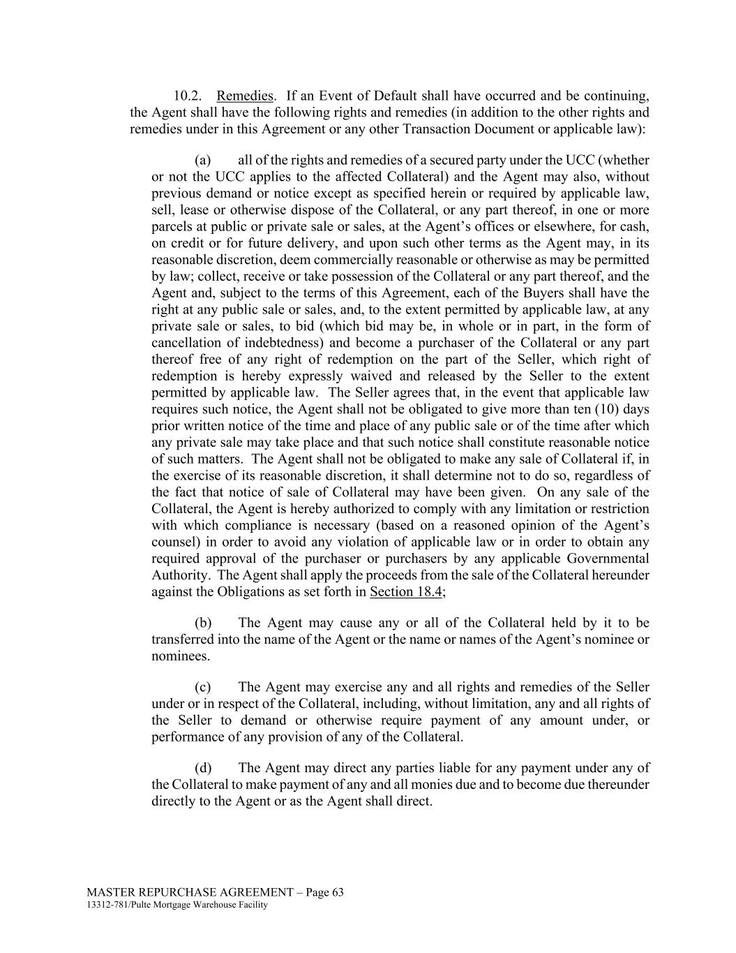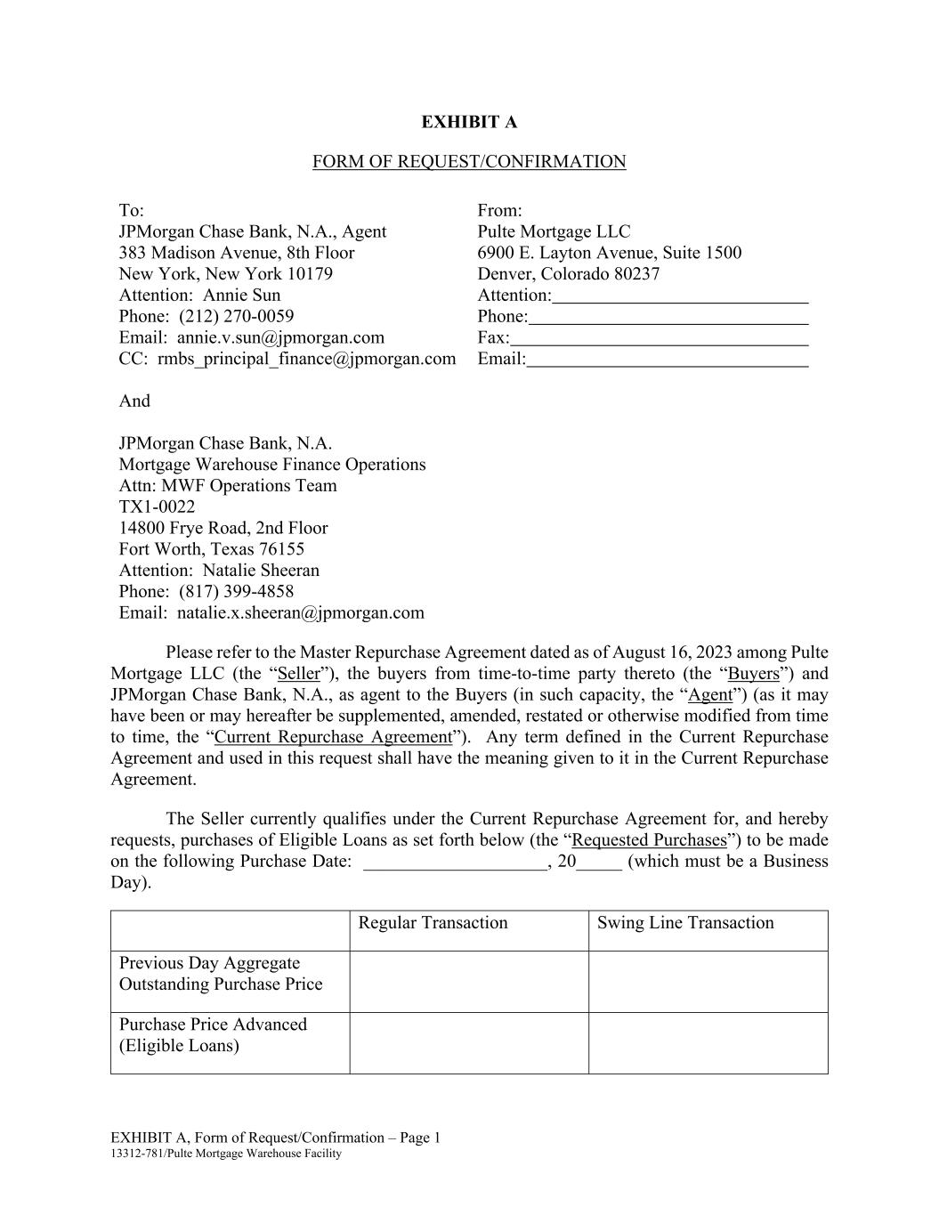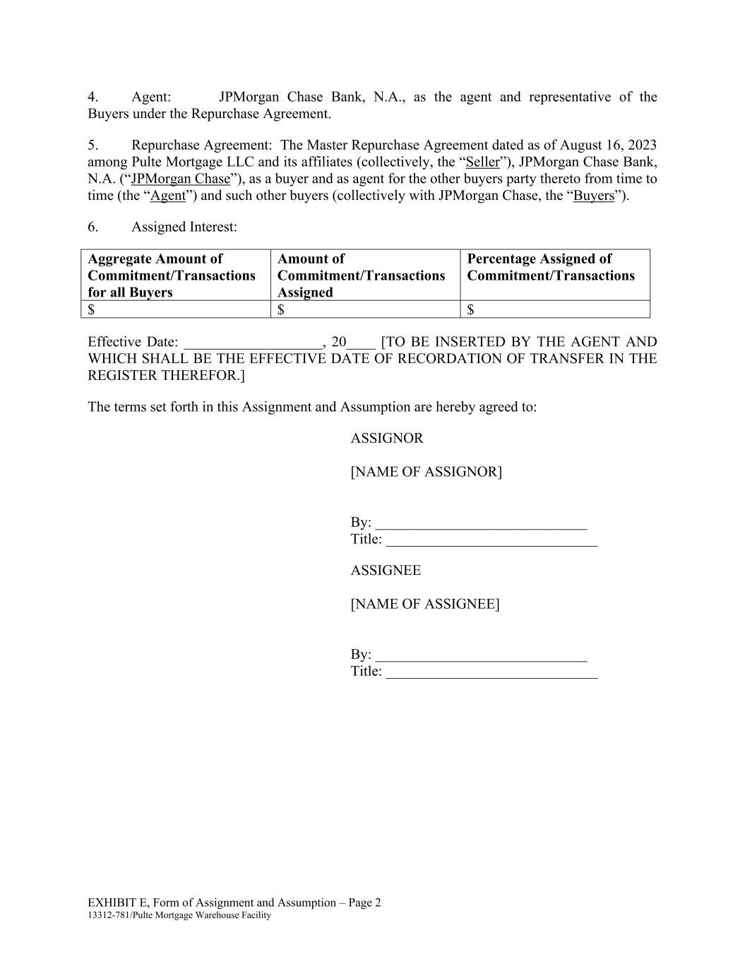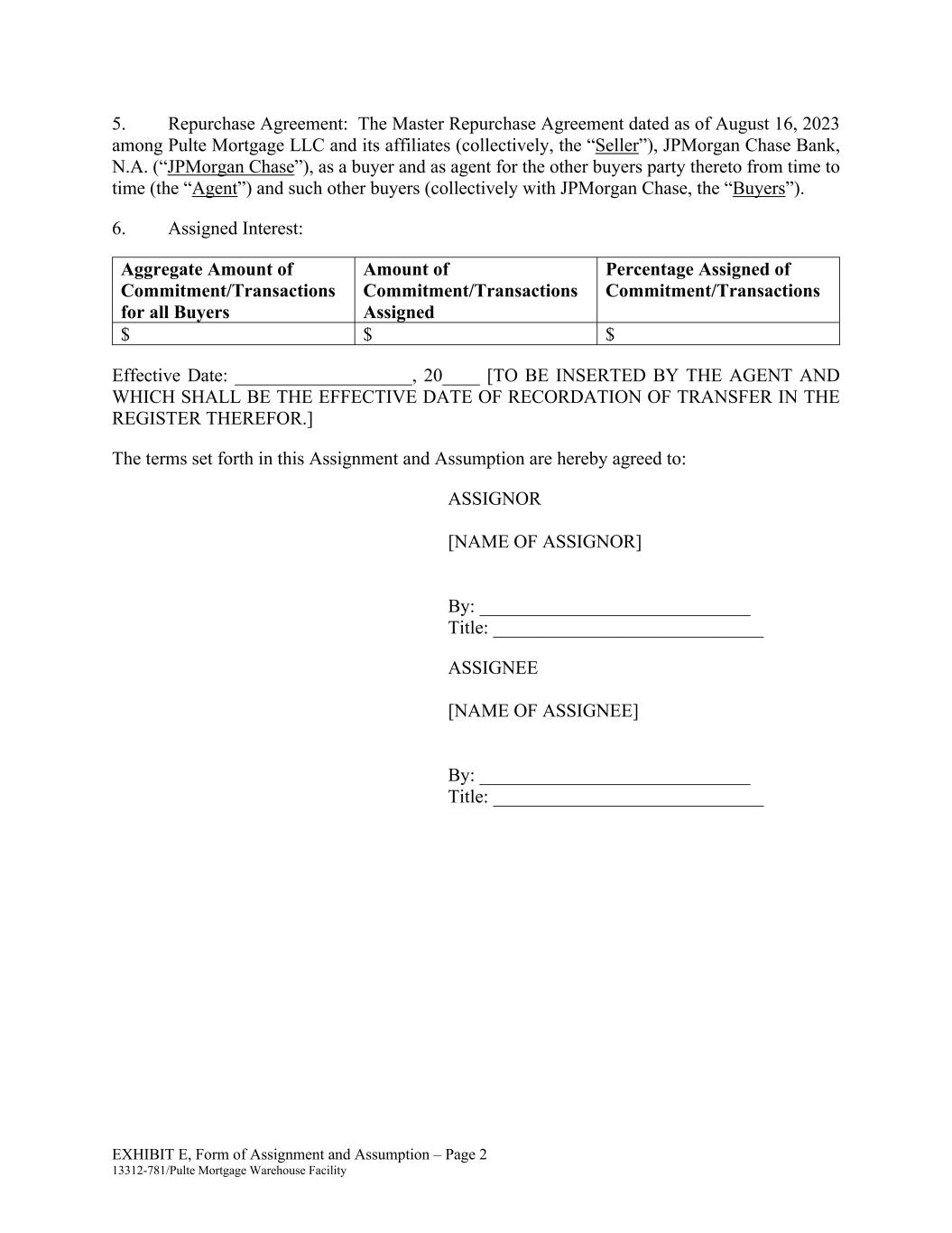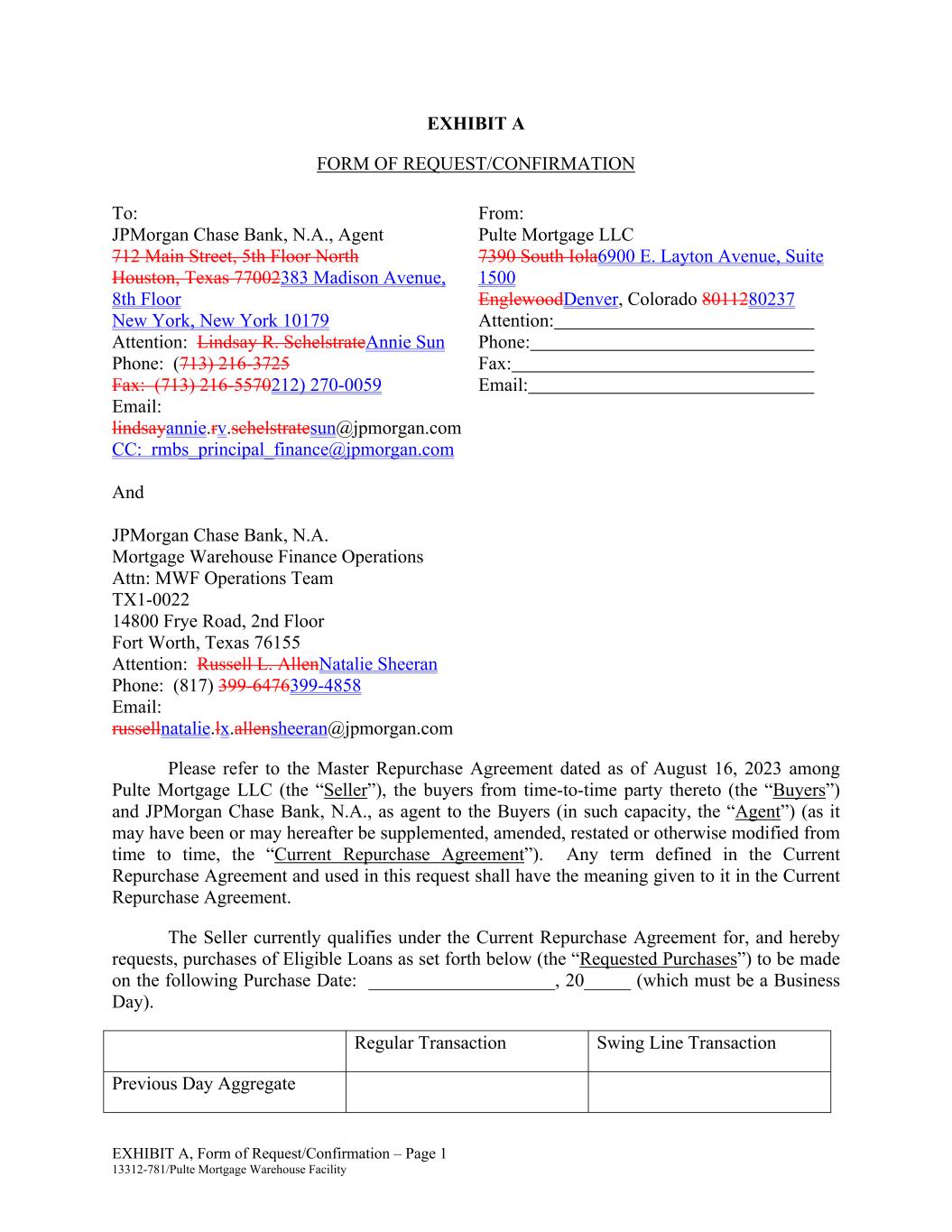 MASTER REPURCHASE AGREEMENT – Page 1 13312-781/Pulte Mortgage Warehouse Facility MASTER REPURCHASE AGREEMENT THIS MASTER REPURCHASE AGREEMENT is made and entered into as of August 16, 2023, between and among Pulte Mortgage LLC, a Delaware limited liability company (the “Seller”), and JPMorgan Chase Bank, N.A., a national banking association, as administrative agent and representative of itself as a Buyer and the other Buyers (the “Agent” and sometimes “JPMorgan Chase”), and the other Buyers, as defined in Section 1.2. RECITALS Section 1. Applicability and Defined Terms. 1.1. Applicability. From time to time the parties hereto may enter into transactions in which the Seller agrees to transfer to the Agent on behalf of the Buyers, Eligible Loans on a servicing released basis against the transfer of funds by the Buyers, with a simultaneous agreement by the Buyers to transfer to the Seller such Eligible Loans at a date certain or on demand in the event of termination pursuant to Section 18.2 hereof, or if no demand is sooner made, on the Termination Date, against the transfer of funds by the Seller. Each such transaction shall be referred to herein as a “Transaction” and shall be governed by this Agreement, as hereinafter defined. JPMorgan Chase has also agreed to provide a separate revolving swing line repurchase facility to initially and temporarily purchase Eligible Loans pending their purchase by all of the Buyers pursuant to this Agreement. The parties hereby specifically declare that it is their intention that this Master Repurchase Agreement (as amended, restated, supplemented or otherwise modified from time to time, the “Agreement,” which term includes the preamble above) and the purchases of Eligible Loans made pursuant to it (under both its regular and swing line provisions) are to be treated as repurchase transactions under the Title 11 of the United States Code, as amended (the “Bankruptcy Code”), including all rights that accrue to the Buyers by virtue of sections 559, 561 and 562 of the Bankruptcy Code. This Agreement also contains lien provisions with respect to the Purchased Loans so that if, contrary to the intent of the parties, any court of competent jurisdiction characterizes any Transaction as a financing, rather than a purchase, under applicable law, including the applicable provisions of the Bankruptcy Code, the Agent is deemed to have a first priority perfected security interest in and to the Purchased Loans to secure the payment and performance of all of the Seller’s Obligations under this Agreement and the other Transaction Documents. The Buyers’ agreement to establish and continue the revolving repurchase facilities, and JPMorgan Chase’s agreement to establish and continue such revolving swing line repurchase facility, are each made upon and subject to the terms and conditions of this Agreement. If there is any conflict or inconsistency between any of the terms or provisions of this Agreement and any of the other Transaction Documents, this Agreement shall govern and control. If there is any conflict between any provision of this Agreement and any later supplement, amendment, restatement or replacement of it, then the latter shall govern and control.