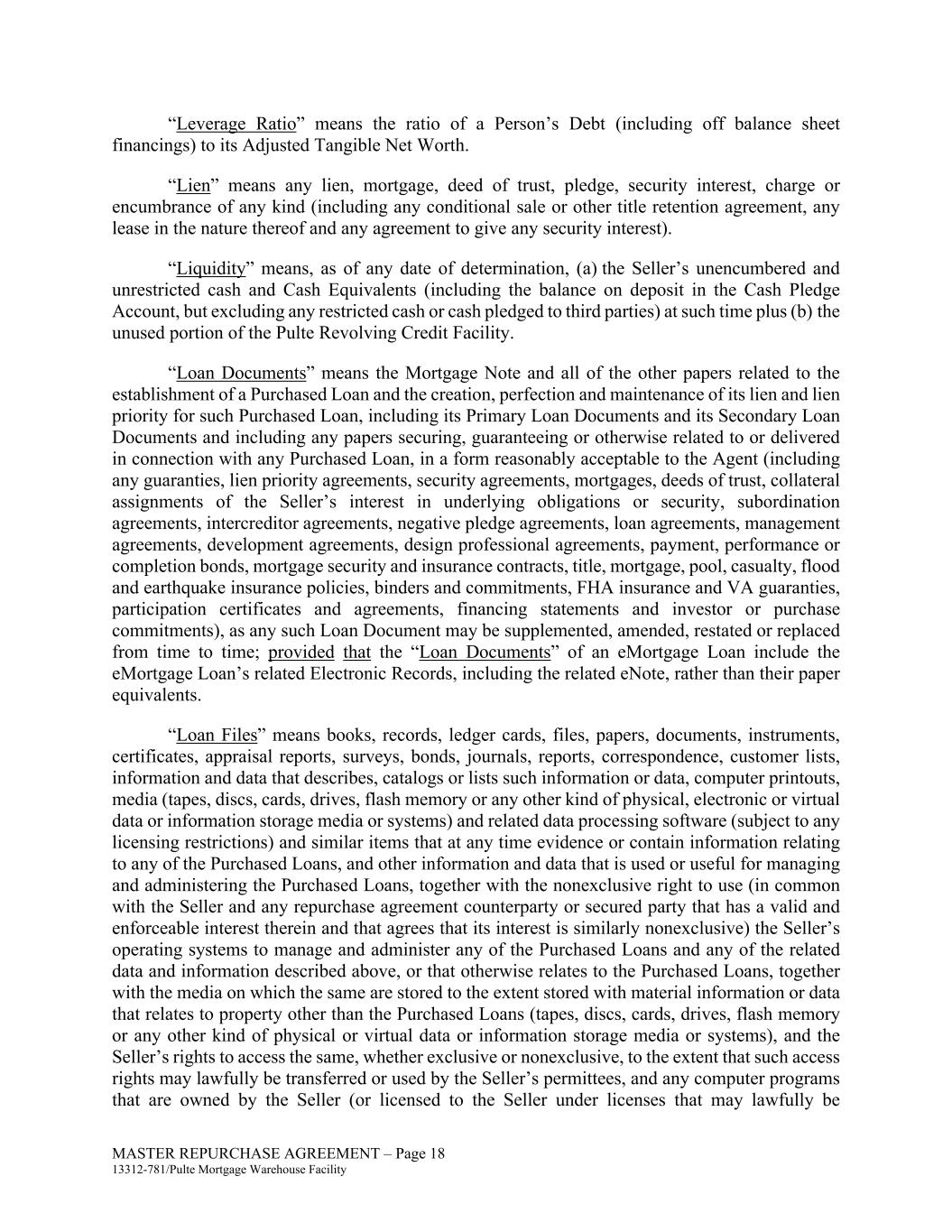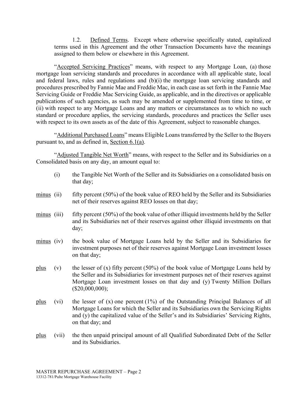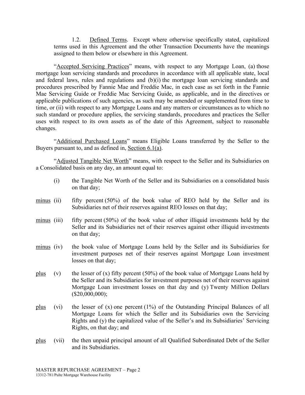 MASTER REPURCHASE AGREEMENT – Page 2 13312-781/Pulte Mortgage Warehouse Facility 1.2. Defined Terms. Except where otherwise specifically stated, capitalized terms used in this Agreement and the other Transaction Documents have the meanings assigned to them below or elsewhere in this Agreement. “Accepted Servicing Practices” means, with respect to any Mortgage Loan, (a) those mortgage loan servicing standards and procedures in accordance with all applicable state, local and federal laws, rules and regulations and (b)(i) the mortgage loan servicing standards and procedures prescribed by Fannie Mae and Freddie Mac, in each case as set forth in the Fannie Mae Servicing Guide or Freddie Mac Servicing Guide, as applicable, and in the directives or applicable publications of such agencies, as such may be amended or supplemented from time to time, or (ii) with respect to any Mortgage Loans and any matters or circumstances as to which no such standard or procedure applies, the servicing standards, procedures and practices the Seller uses with respect to its own assets as of the date of this Agreement, subject to reasonable changes. “Additional Purchased Loans” means Eligible Loans transferred by the Seller to the Buyers pursuant to, and as defined in, Section 6.1(a). “Adjusted Tangible Net Worth” means, with respect to the Seller and its Subsidiaries on a Consolidated basis on any day, an amount equal to: (i) the Tangible Net Worth of the Seller and its Subsidiaries on a consolidated basis on that day; minus (ii) fifty percent (50%) of the book value of REO held by the Seller and its Subsidiaries net of their reserves against REO losses on that day; minus (iii) fifty percent (50%) of the book value of other illiquid investments held by the Seller and its Subsidiaries net of their reserves against other illiquid investments on that day; minus (iv) the book value of Mortgage Loans held by the Seller and its Subsidiaries for investment purposes net of their reserves against Mortgage Loan investment losses on that day; plus (v) the lesser of (x) fifty percent (50%) of the book value of Mortgage Loans held by the Seller and its Subsidiaries for investment purposes net of their reserves against Mortgage Loan investment losses on that day and (y) Twenty Million Dollars ($20,000,000); plus (vi) the lesser of (x) one percent (1%) of the Outstanding Principal Balances of all Mortgage Loans for which the Seller and its Subsidiaries own the Servicing Rights and (y) the capitalized value of the Seller’s and its Subsidiaries’ Servicing Rights, on that day; and plus (vii) the then unpaid principal amount of all Qualified Subordinated Debt of the Seller and its Subsidiaries.