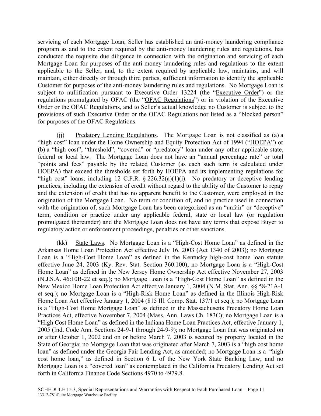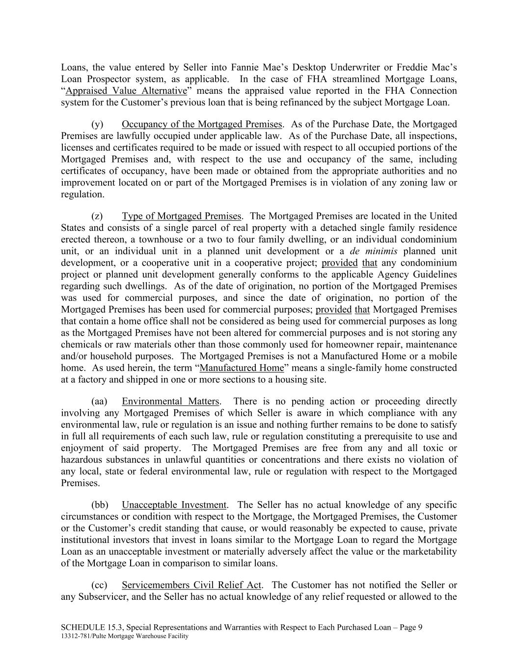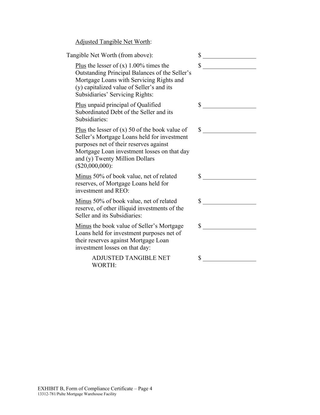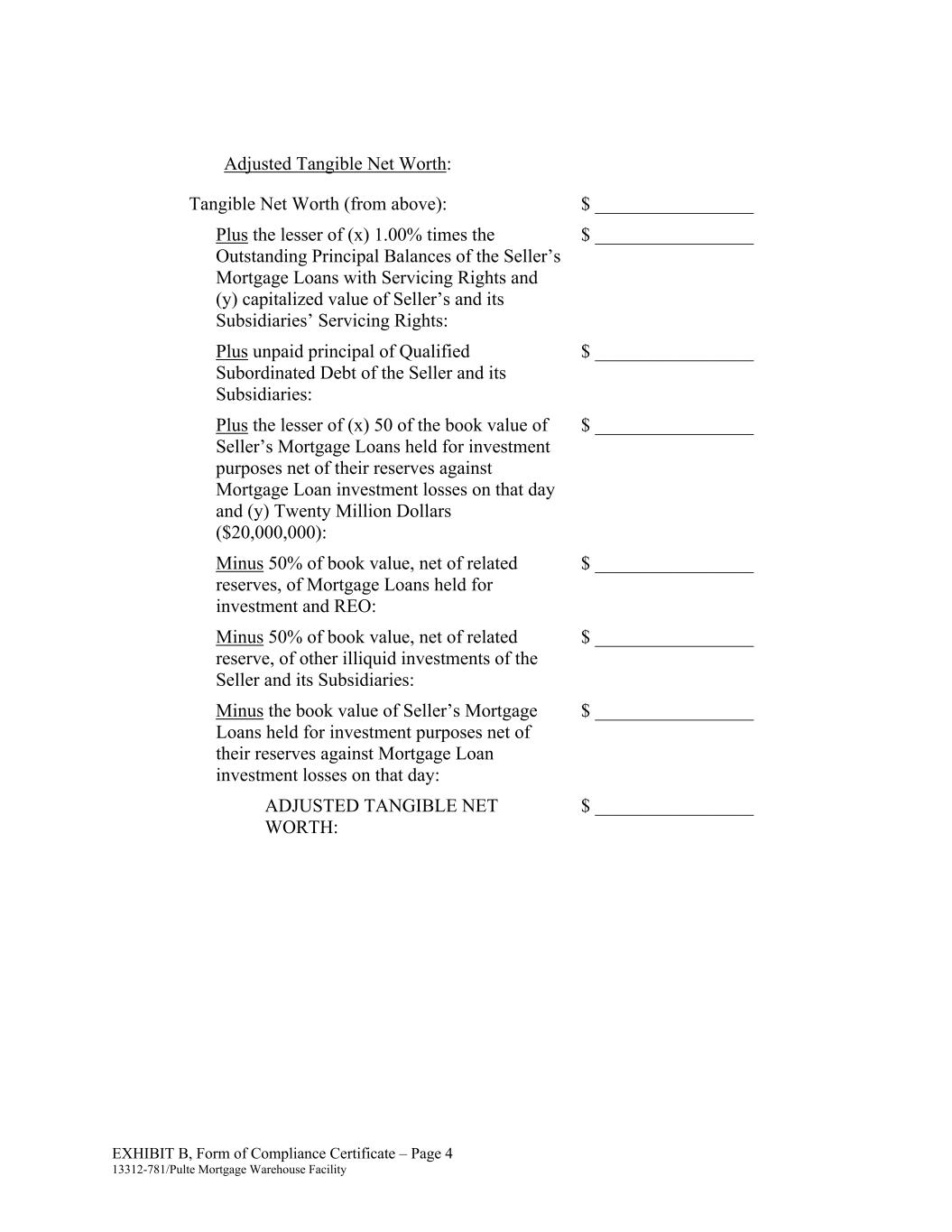 MASTER REPURCHASE AGREEMENT – Page 2 13312-781/Pulte Mortgage Warehouse Facility 1.2. Defined Terms. Except where otherwise specifically stated, capitalized terms used in this Agreement and the other Transaction Documents have the meanings assigned to them below or elsewhere in this Agreement. “Accepted Servicing Practices” means, with respect to any Mortgage Loan, (a) those mortgage loan servicing standards and procedures in accordance with all applicable state, local and federal laws, rules and regulations and (b)(i) the mortgage loan servicing standards and procedures prescribed by Fannie Mae and Freddie Mac, in each case as set forth in the Fannie Mae Servicing Guide or Freddie Mac Servicing Guide, as applicable, and in the directives or applicable publications of such agencies, as such may be amended or supplemented from time to time, or (ii) with respect to any Mortgage Loans and any matters or circumstances as to which no such standard or procedure applies, the servicing standards, procedures and practices the Seller uses with respect to its own assets as of the date of this Agreement, subject to reasonable changes. “Additional Purchased Loans” means Eligible Loans transferred by the Seller to the Buyers pursuant to, and as defined in, Section 6.1(a). “Adjusted Tangible Net Worth” means, with respect to the Seller and its Subsidiaries on a Consolidated basis on any day, an amount equal to: (i) the Tangible Net Worth of the Seller and its Subsidiaries on a consolidated basis on that day; minus (ii) fifty percent (50%) of the book value of REO held by the Seller and its Subsidiaries net of their reserves against REO losses on that day; minus (iii) fifty percent (50%) of the book value of other illiquid investments held by the Seller and its Subsidiaries net of their reserves against other illiquid investments on that day; minus (iv) the book value of Mortgage Loans held by the Seller and its Subsidiaries for investment purposes net of their reserves against Mortgage Loan investment losses on that day; plus (v) the lesser of (x) fifty percent (50%) of the book value of Mortgage Loans held by the Seller and its Subsidiaries for investment purposes net of their reserves against Mortgage Loan investment losses on that day and (y) Twenty Million Dollars ($20,000,000); plus (vi) the lesser of (x) one percent (1%) of the Outstanding Principal Balances of all Mortgage Loans for which the Seller and its Subsidiaries own the Servicing Rights and (y) the capitalized value of the Seller’s and its Subsidiaries’ Servicing Rights, on that day; and plus (vii) the then unpaid principal amount of all Qualified Subordinated Debt of the Seller and its Subsidiaries.