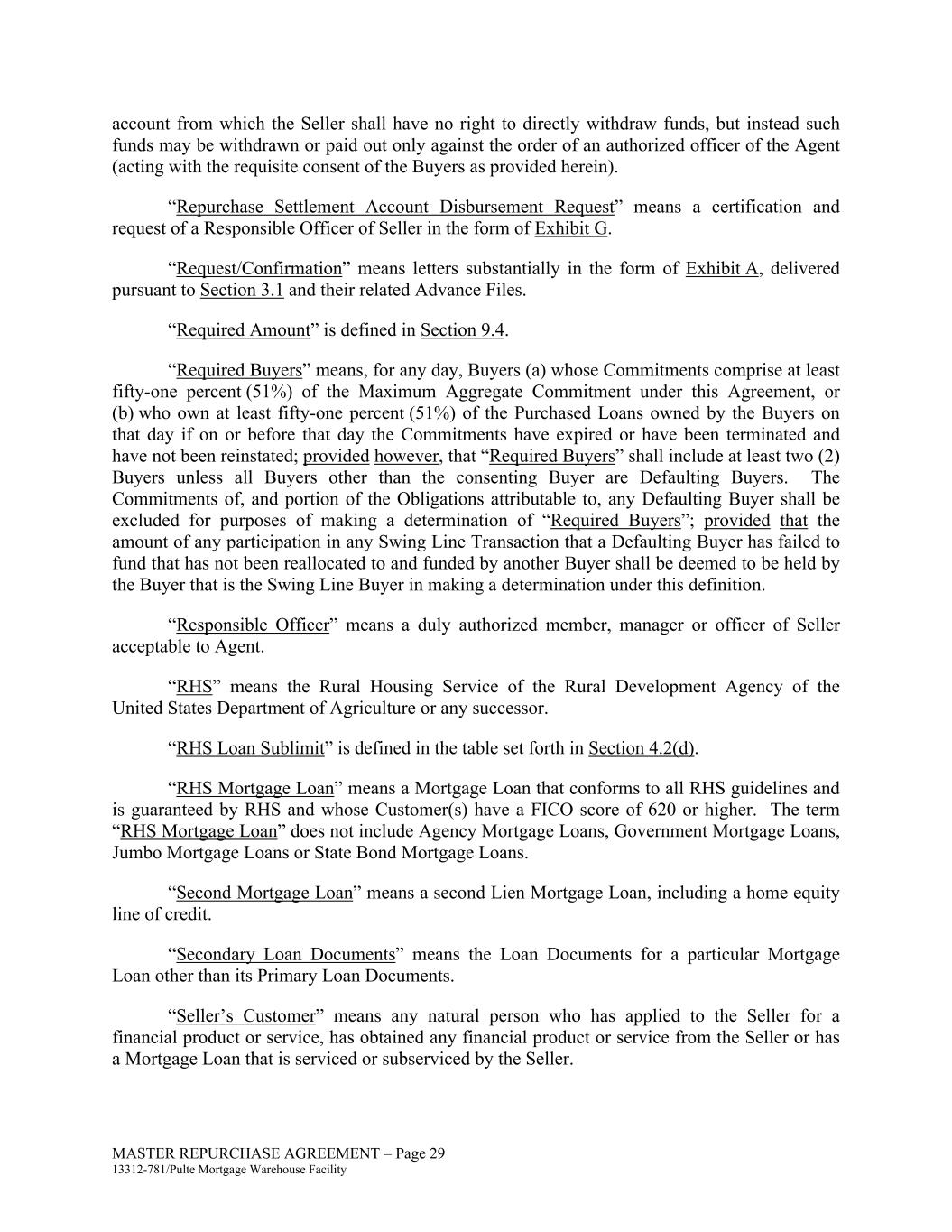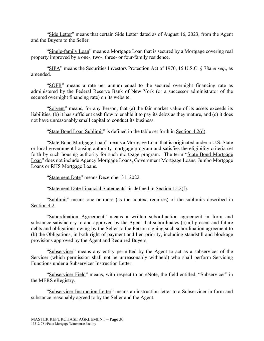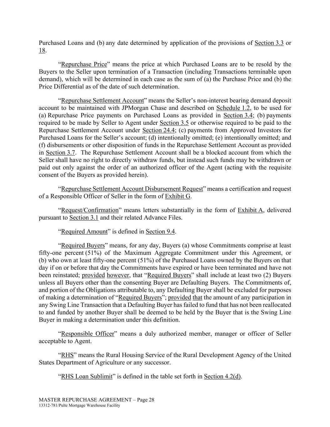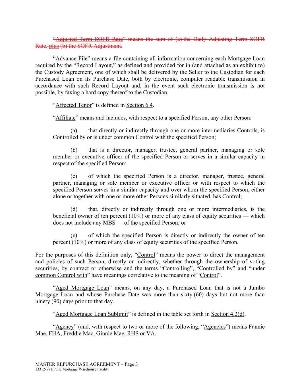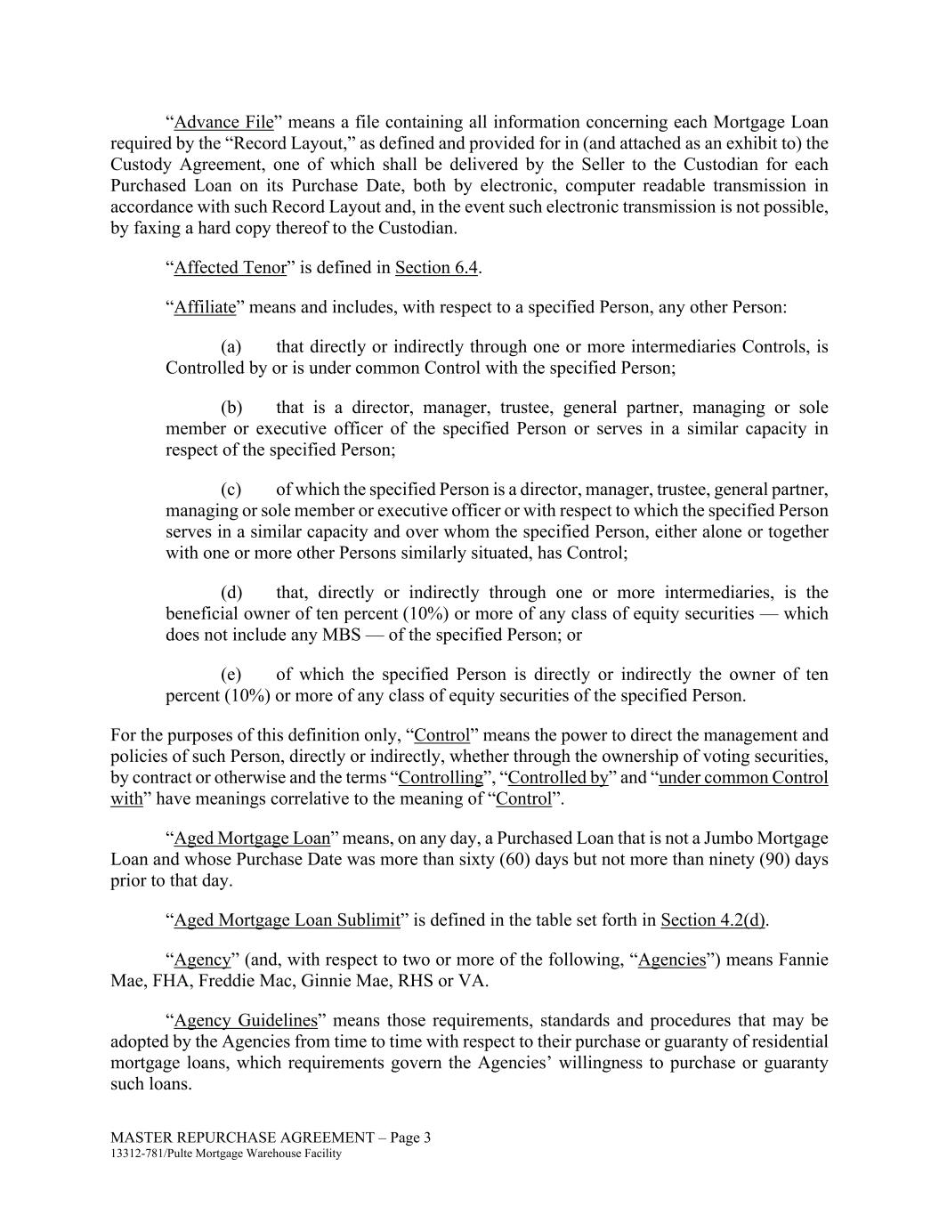 MASTER REPURCHASE AGREEMENT – Page 3 13312-781/Pulte Mortgage Warehouse Facility “Adjusted Term SOFR Rate” means the sum of (a) the Daily Adjusting Term SOFR Rate, plus (b) the SOFR Adjustment. “Advance File” means a file containing all information concerning each Mortgage Loan required by the “Record Layout,” as defined and provided for in (and attached as an exhibit to) the Custody Agreement, one of which shall be delivered by the Seller to the Custodian for each Purchased Loan on its Purchase Date, both by electronic, computer readable transmission in accordance with such Record Layout and, in the event such electronic transmission is not possible, by faxing a hard copy thereof to the Custodian. “Affected Tenor” is defined in Section 6.4. “Affiliate” means and includes, with respect to a specified Person, any other Person: (a) that directly or indirectly through one or more intermediaries Controls, is Controlled by or is under common Control with the specified Person; (b) that is a director, manager, trustee, general partner, managing or sole member or executive officer of the specified Person or serves in a similar capacity in respect of the specified Person; (c) of which the specified Person is a director, manager, trustee, general partner, managing or sole member or executive officer or with respect to which the specified Person serves in a similar capacity and over whom the specified Person, either alone or together with one or more other Persons similarly situated, has Control; (d) that, directly or indirectly through one or more intermediaries, is the beneficial owner of ten percent (10%) or more of any class of equity securities — which does not include any MBS — of the specified Person; or (e) of which the specified Person is directly or indirectly the owner of ten percent (10%) or more of any class of equity securities of the specified Person. For the purposes of this definition only, “Control” means the power to direct the management and policies of such Person, directly or indirectly, whether through the ownership of voting securities, by contract or otherwise and the terms “Controlling”, “Controlled by” and “under common Control with” have meanings correlative to the meaning of “Control”. “Aged Mortgage Loan” means, on any day, a Purchased Loan that is not a Jumbo Mortgage Loan and whose Purchase Date was more than sixty (60) days but not more than ninety (90) days prior to that day. “Aged Mortgage Loan Sublimit” is defined in the table set forth in Section 4.2(d). “Agency” (and, with respect to two or more of the following, “Agencies”) means Fannie Mae, FHA, Freddie Mac, Ginnie Mae, RHS or VA.