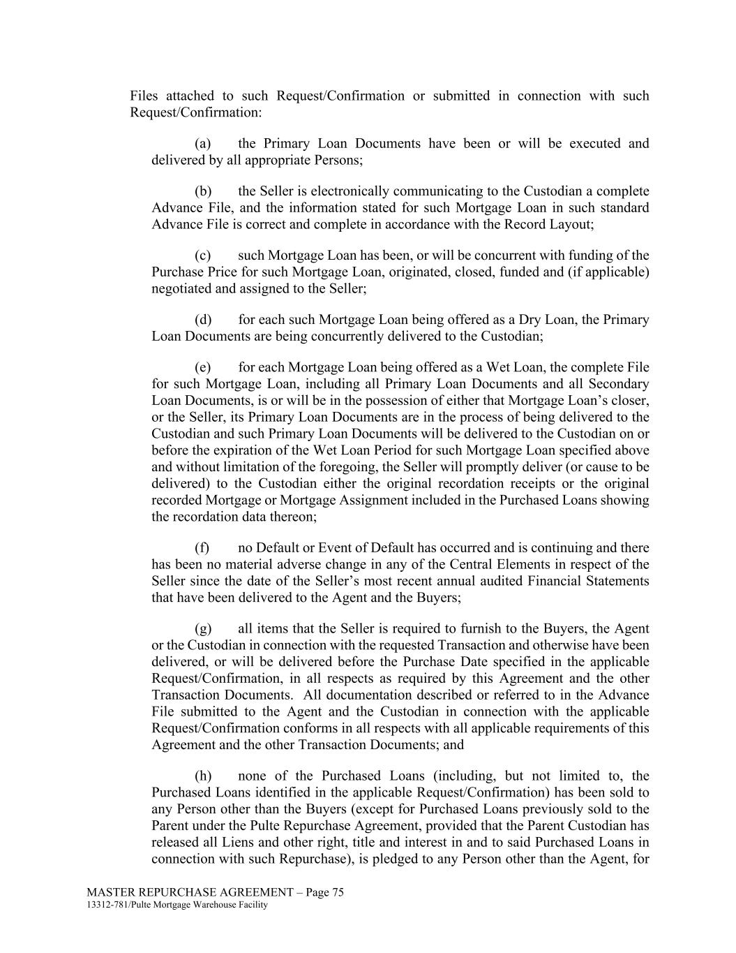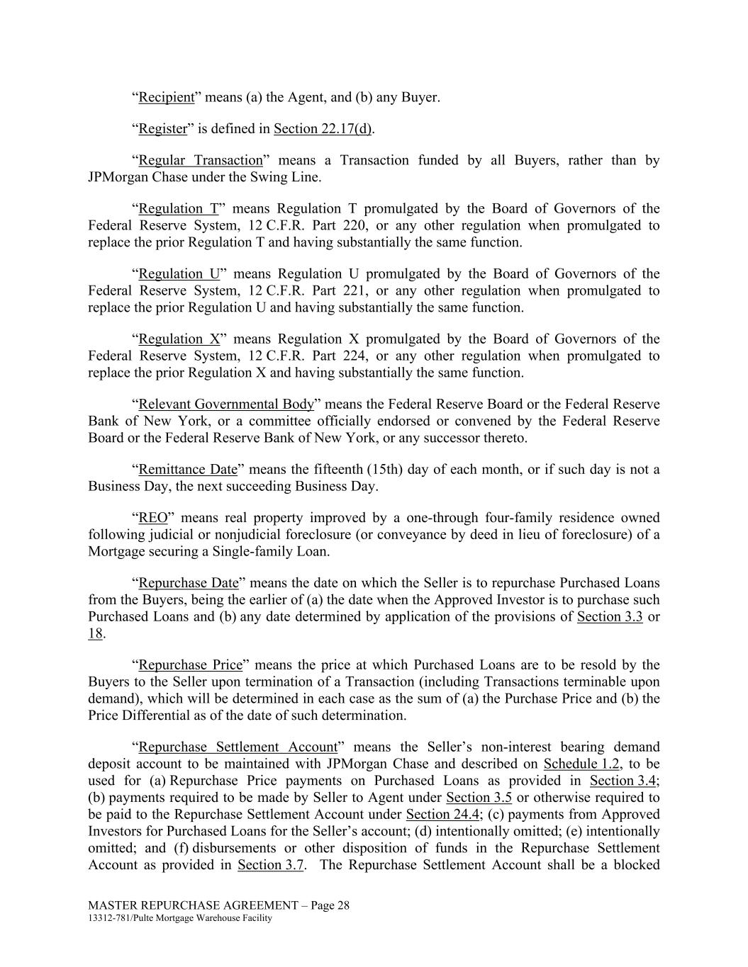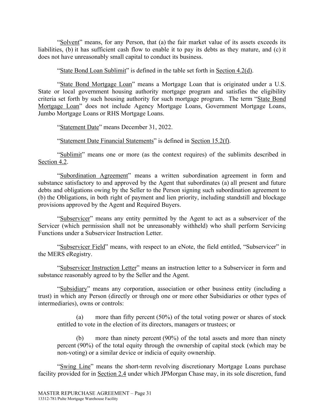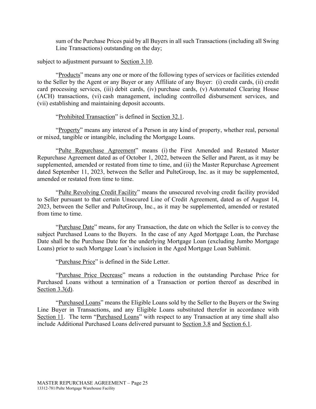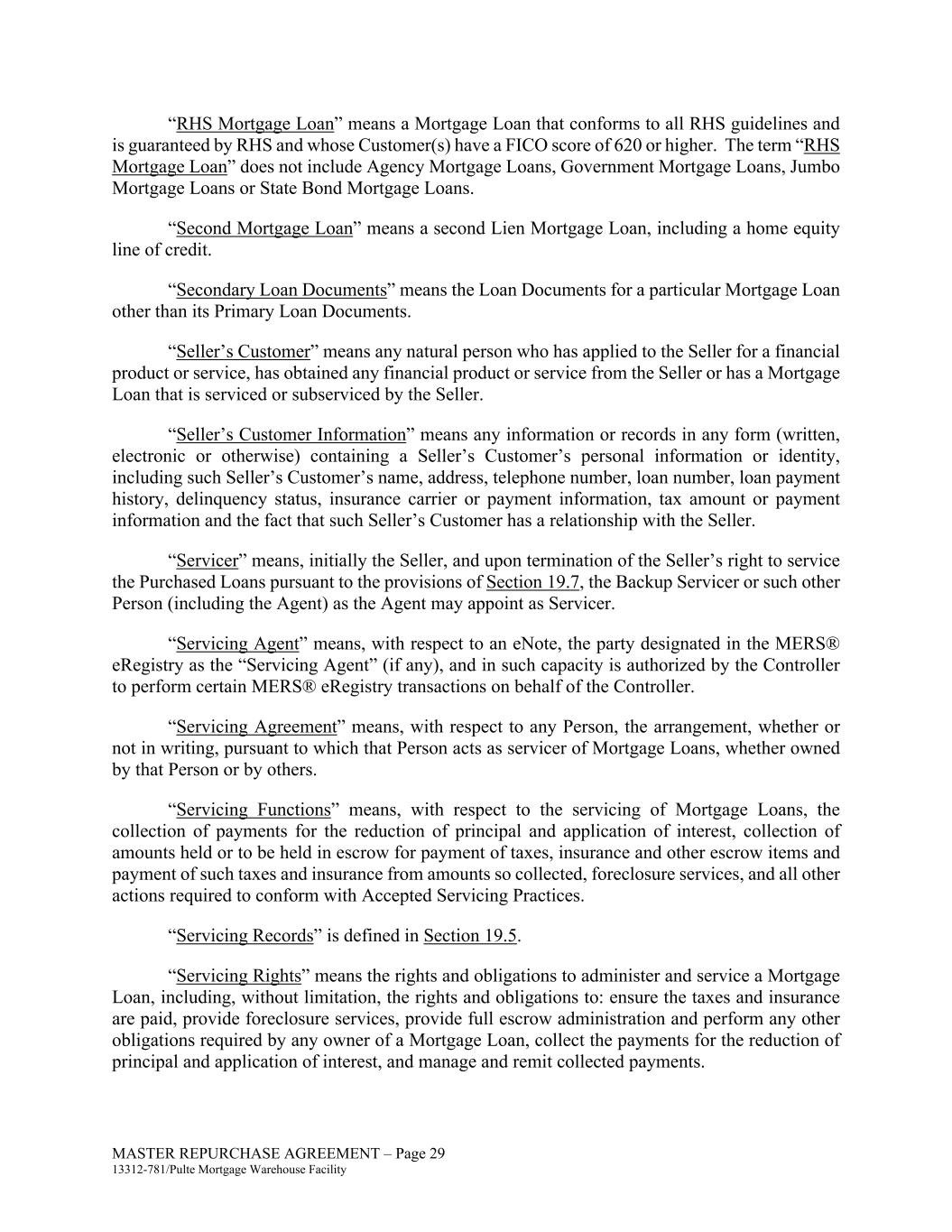 MASTER REPURCHASE AGREEMENT – Page 3 13312-781/Pulte Mortgage Warehouse Facility “Adjusted Term SOFR Rate” means the sum of (a) the Daily Adjusting Term SOFR Rate, plus (b) the SOFR Adjustment. “Advance File” means a file containing all information concerning each Mortgage Loan required by the “Record Layout,” as defined and provided for in (and attached as an exhibit to) the Custody Agreement, one of which shall be delivered by the Seller to the Custodian for each Purchased Loan on its Purchase Date, both by electronic, computer readable transmission in accordance with such Record Layout and, in the event such electronic transmission is not possible, by faxing a hard copy thereof to the Custodian. “Affected Tenor” is defined in Section 6.4. “Affiliate” means and includes, with respect to a specified Person, any other Person: (a) that directly or indirectly through one or more intermediaries Controls, is Controlled by or is under common Control with the specified Person; (b) that is a director, manager, trustee, general partner, managing or sole member or executive officer of the specified Person or serves in a similar capacity in respect of the specified Person; (c) of which the specified Person is a director, manager, trustee, general partner, managing or sole member or executive officer or with respect to which the specified Person serves in a similar capacity and over whom the specified Person, either alone or together with one or more other Persons similarly situated, has Control; (d) that, directly or indirectly through one or more intermediaries, is the beneficial owner of ten percent (10%) or more of any class of equity securities — which does not include any MBS — of the specified Person; or (e) of which the specified Person is directly or indirectly the owner of ten percent (10%) or more of any class of equity securities of the specified Person. For the purposes of this definition only, “Control” means the power to direct the management and policies of such Person, directly or indirectly, whether through the ownership of voting securities, by contract or otherwise and the terms “Controlling”, “Controlled by” and “under common Control with” have meanings correlative to the meaning of “Control”. “Aged Mortgage Loan” means, on any day, a Purchased Loan that is not a Jumbo Mortgage Loan and whose Purchase Date was more than sixty (60) days but not more than ninety (90) days prior to that day. “Aged Mortgage Loan Sublimit” is defined in the table set forth in Section 4.2(d). “Agency” (and, with respect to two or more of the following, “Agencies”) means Fannie Mae, FHA, Freddie Mac, Ginnie Mae, RHS or VA.