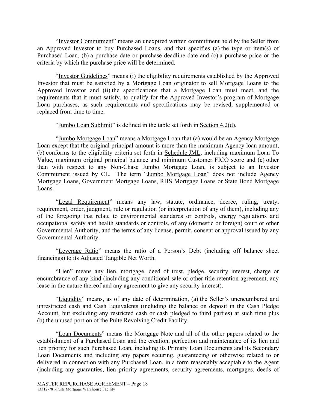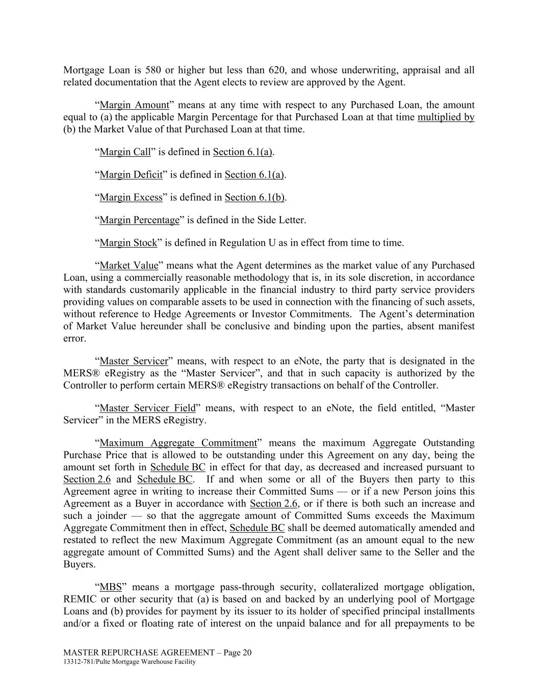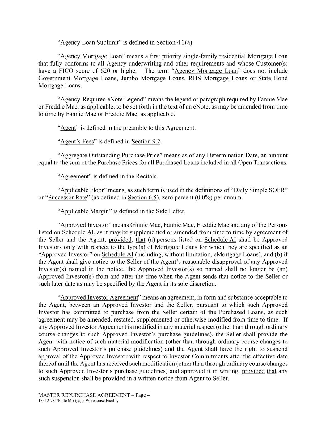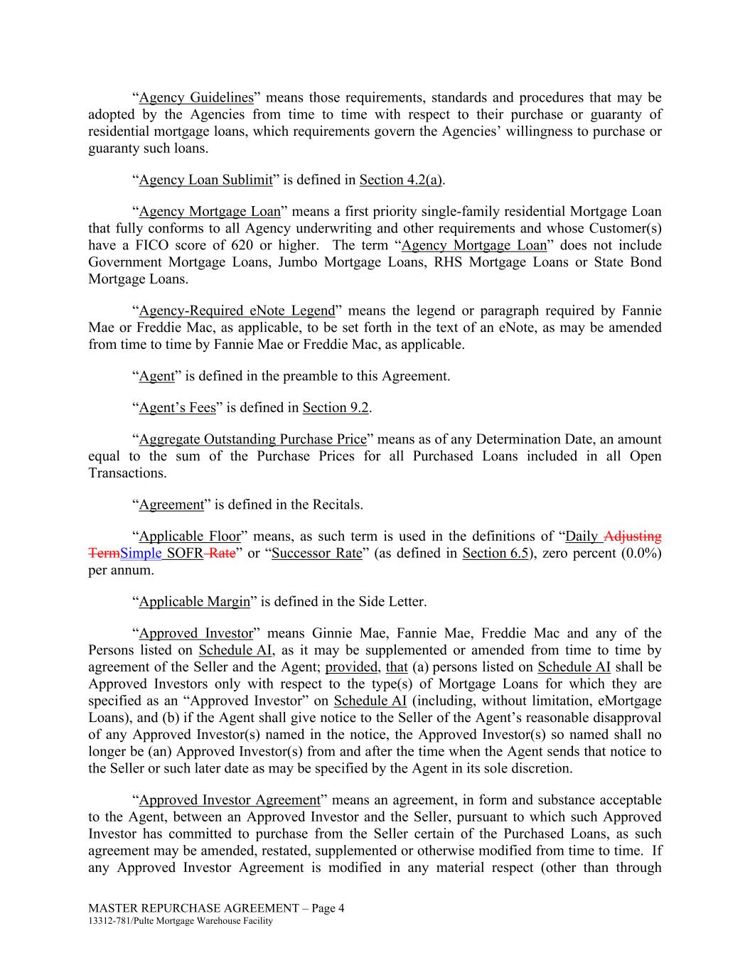 MASTER REPURCHASE AGREEMENT – Page 4 13312-781/Pulte Mortgage Warehouse Facility “Agency Guidelines” means those requirements, standards and procedures that may be adopted by the Agencies from time to time with respect to their purchase or guaranty of residential mortgage loans, which requirements govern the Agencies’ willingness to purchase or guaranty such loans. “Agency Loan Sublimit” is defined in Section 4.2(a). “Agency Mortgage Loan” means a first priority single-family residential Mortgage Loan that fully conforms to all Agency underwriting and other requirements and whose Customer(s) have a FICO score of 620 or higher. The term “Agency Mortgage Loan” does not include Government Mortgage Loans, Jumbo Mortgage Loans, RHS Mortgage Loans or State Bond Mortgage Loans. “Agency-Required eNote Legend” means the legend or paragraph required by Fannie Mae or Freddie Mac, as applicable, to be set forth in the text of an eNote, as may be amended from time to time by Fannie Mae or Freddie Mac, as applicable. “Agent” is defined in the preamble to this Agreement. “Agent’s Fees” is defined in Section 9.2. “Aggregate Outstanding Purchase Price” means as of any Determination Date, an amount equal to the sum of the Purchase Prices for all Purchased Loans included in all Open Transactions. “Agreement” is defined in the Recitals. “Applicable Floor” means, as such term is used in the definitions of “Daily Adjusting TermSimple SOFR Rate” or “Successor Rate” (as defined in Section 6.5), zero percent (0.0%) per annum. “Applicable Margin” is defined in the Side Letter. “Approved Investor” means Ginnie Mae, Fannie Mae, Freddie Mac and any of the Persons listed on Schedule AI, as it may be supplemented or amended from time to time by agreement of the Seller and the Agent; provided, that (a) persons listed on Schedule AI shall be Approved Investors only with respect to the type(s) of Mortgage Loans for which they are specified as an “Approved Investor” on Schedule AI (including, without limitation, eMortgage Loans), and (b) if the Agent shall give notice to the Seller of the Agent’s reasonable disapproval of any Approved Investor(s) named in the notice, the Approved Investor(s) so named shall no longer be (an) Approved Investor(s) from and after the time when the Agent sends that notice to the Seller or such later date as may be specified by the Agent in its sole discretion. “Approved Investor Agreement” means an agreement, in form and substance acceptable to the Agent, between an Approved Investor and the Seller, pursuant to which such Approved Investor has committed to purchase from the Seller certain of the Purchased Loans, as such agreement may be amended, restated, supplemented or otherwise modified from time to time. If any Approved Investor Agreement is modified in any material respect (other than through