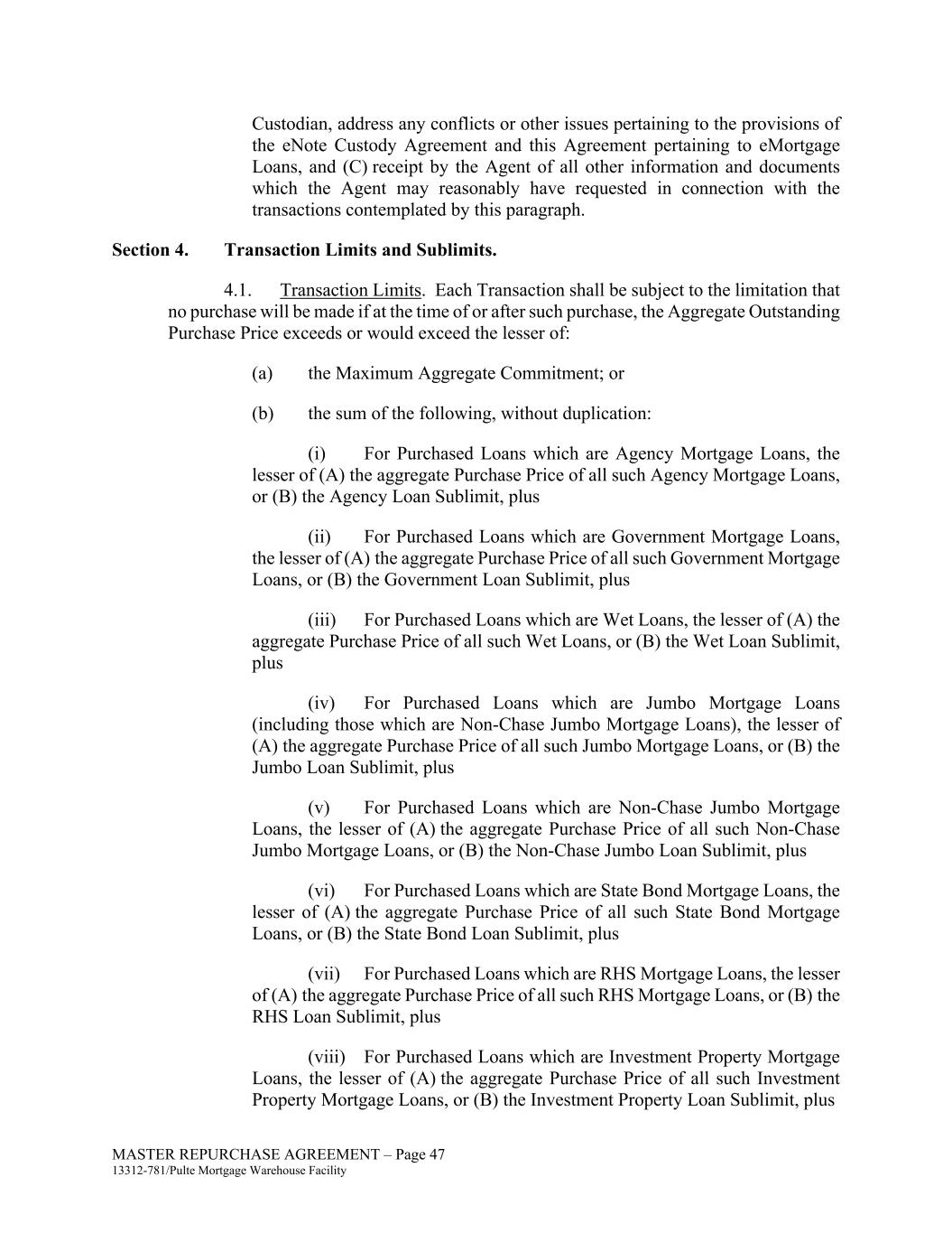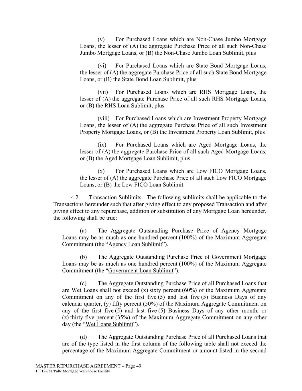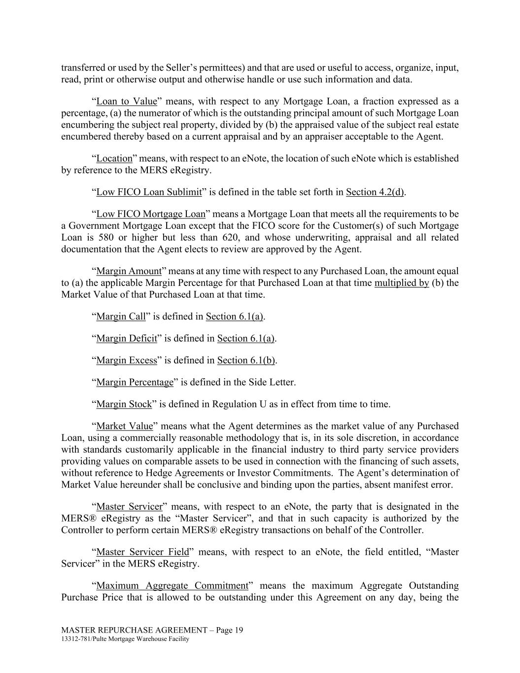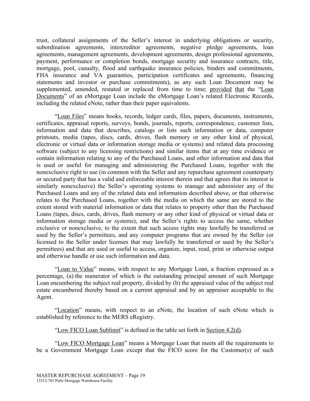 MASTER REPURCHASE AGREEMENT – Page 4 13312-781/Pulte Mortgage Warehouse Facility “Agency Guidelines” means those requirements, standards and procedures that may be adopted by the Agencies from time to time with respect to their purchase or guaranty of residential mortgage loans, which requirements govern the Agencies’ willingness to purchase or guaranty such loans. “Agency Loan Sublimit” is defined in Section 4.2(a). “Agency Mortgage Loan” means a first priority single-family residential Mortgage Loan that fully conforms to all Agency underwriting and other requirements and whose Customer(s) have a FICO score of 620 or higher. The term “Agency Mortgage Loan” does not include Government Mortgage Loans, Jumbo Mortgage Loans, RHS Mortgage Loans or State Bond Mortgage Loans. “Agency-Required eNote Legend” means the legend or paragraph required by Fannie Mae or Freddie Mac, as applicable, to be set forth in the text of an eNote, as may be amended from time to time by Fannie Mae or Freddie Mac, as applicable. “Agent” is defined in the preamble to this Agreement. “Agent’s Fees” is defined in Section 9.2. “Aggregate Outstanding Purchase Price” means as of any Determination Date, an amount equal to the sum of the Purchase Prices for all Purchased Loans included in all Open Transactions. “Agreement” is defined in the Recitals. “Applicable Floor” means, as such term is used in the definitions of “Daily Adjusting TermSimple SOFR Rate” or “Successor Rate” (as defined in Section 6.5), zero percent (0.0%) per annum. “Applicable Margin” is defined in the Side Letter. “Approved Investor” means Ginnie Mae, Fannie Mae, Freddie Mac and any of the Persons listed on Schedule AI, as it may be supplemented or amended from time to time by agreement of the Seller and the Agent; provided, that (a) persons listed on Schedule AI shall be Approved Investors only with respect to the type(s) of Mortgage Loans for which they are specified as an “Approved Investor” on Schedule AI (including, without limitation, eMortgage Loans), and (b) if the Agent shall give notice to the Seller of the Agent’s reasonable disapproval of any Approved Investor(s) named in the notice, the Approved Investor(s) so named shall no longer be (an) Approved Investor(s) from and after the time when the Agent sends that notice to the Seller or such later date as may be specified by the Agent in its sole discretion. “Approved Investor Agreement” means an agreement, in form and substance acceptable to the Agent, between an Approved Investor and the Seller, pursuant to which such Approved Investor has committed to purchase from the Seller certain of the Purchased Loans, as such agreement may be amended, restated, supplemented or otherwise modified from time to time. If any Approved Investor Agreement is modified in any material respect (other than through
