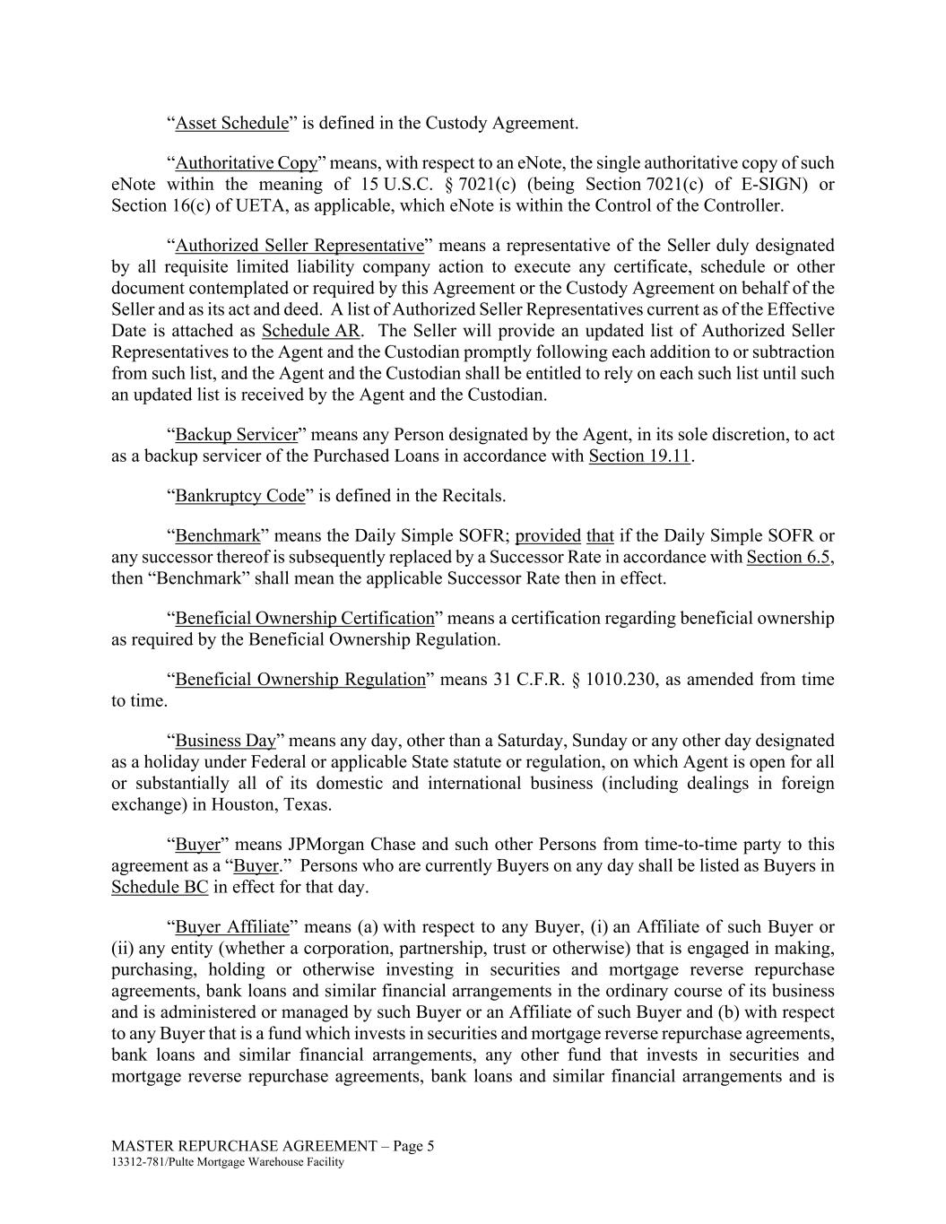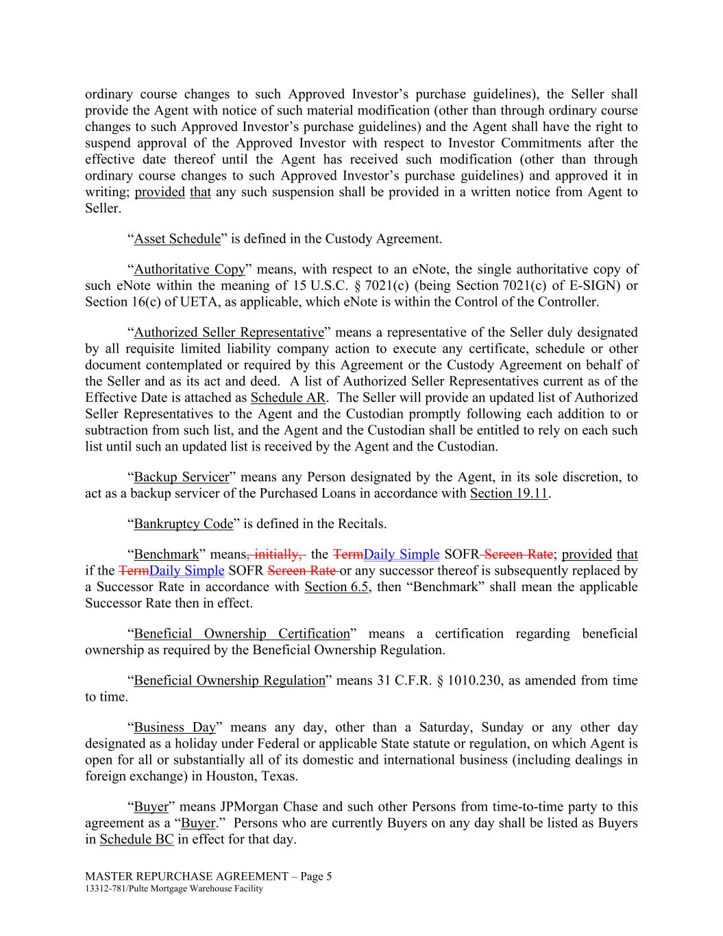 MASTER REPURCHASE AGREEMENT – Page 5 13312-781/Pulte Mortgage Warehouse Facility ordinary course changes to such Approved Investor’s purchase guidelines), the Seller shall provide the Agent with notice of such material modification (other than through ordinary course changes to such Approved Investor’s purchase guidelines) and the Agent shall have the right to suspend approval of the Approved Investor with respect to Investor Commitments after the effective date thereof until the Agent has received such modification (other than through ordinary course changes to such Approved Investor’s purchase guidelines) and approved it in writing; provided that any such suspension shall be provided in a written notice from Agent to Seller. “Asset Schedule” is defined in the Custody Agreement. “Authoritative Copy” means, with respect to an eNote, the single authoritative copy of such eNote within the meaning of 15 U.S.C. § 7021(c) (being Section 7021(c) of E-SIGN) or Section 16(c) of UETA, as applicable, which eNote is within the Control of the Controller. “Authorized Seller Representative” means a representative of the Seller duly designated by all requisite limited liability company action to execute any certificate, schedule or other document contemplated or required by this Agreement or the Custody Agreement on behalf of the Seller and as its act and deed. A list of Authorized Seller Representatives current as of the Effective Date is attached as Schedule AR. The Seller will provide an updated list of Authorized Seller Representatives to the Agent and the Custodian promptly following each addition to or subtraction from such list, and the Agent and the Custodian shall be entitled to rely on each such list until such an updated list is received by the Agent and the Custodian. “Backup Servicer” means any Person designated by the Agent, in its sole discretion, to act as a backup servicer of the Purchased Loans in accordance with Section 19.11. “Bankruptcy Code” is defined in the Recitals. “Benchmark” means, initially, the TermDaily Simple SOFR Screen Rate; provided that if the TermDaily Simple SOFR Screen Rate or any successor thereof is subsequently replaced by a Successor Rate in accordance with Section 6.5, then “Benchmark” shall mean the applicable Successor Rate then in effect. “Beneficial Ownership Certification” means a certification regarding beneficial ownership as required by the Beneficial Ownership Regulation. “Beneficial Ownership Regulation” means 31 C.F.R. § 1010.230, as amended from time to time. “Business Day” means any day, other than a Saturday, Sunday or any other day designated as a holiday under Federal or applicable State statute or regulation, on which Agent is open for all or substantially all of its domestic and international business (including dealings in foreign exchange) in Houston, Texas. “Buyer” means JPMorgan Chase and such other Persons from time-to-time party to this agreement as a “Buyer.” Persons who are currently Buyers on any day shall be listed as Buyers in Schedule BC in effect for that day.