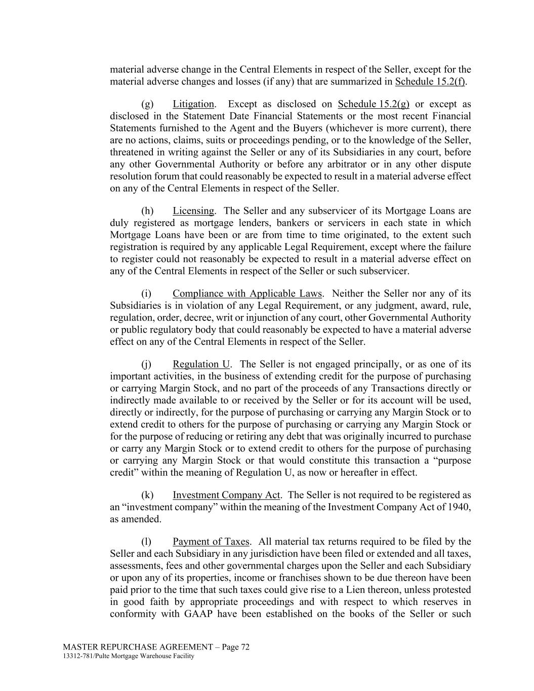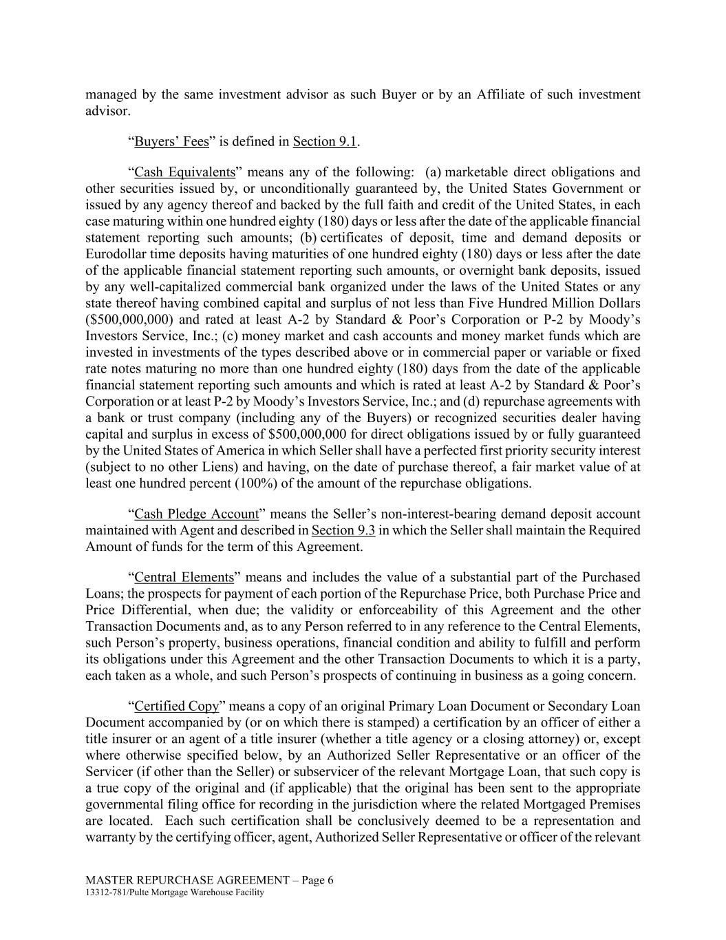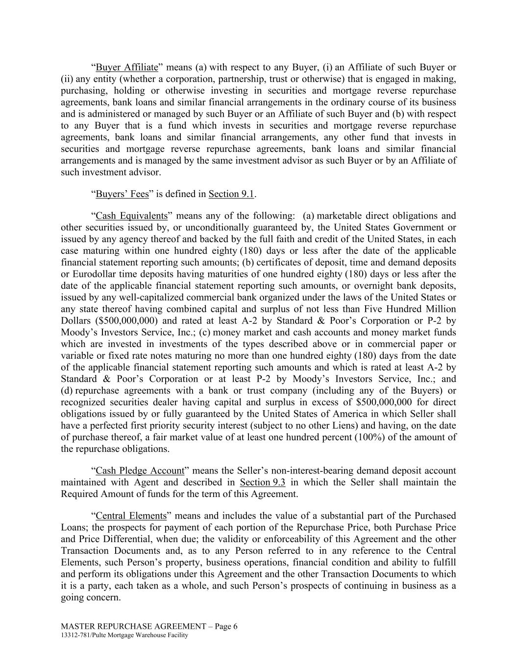 MASTER REPURCHASE AGREEMENT – Page 6 13312-781/Pulte Mortgage Warehouse Facility “Buyer Affiliate” means (a) with respect to any Buyer, (i) an Affiliate of such Buyer or (ii) any entity (whether a corporation, partnership, trust or otherwise) that is engaged in making, purchasing, holding or otherwise investing in securities and mortgage reverse repurchase agreements, bank loans and similar financial arrangements in the ordinary course of its business and is administered or managed by such Buyer or an Affiliate of such Buyer and (b) with respect to any Buyer that is a fund which invests in securities and mortgage reverse repurchase agreements, bank loans and similar financial arrangements, any other fund that invests in securities and mortgage reverse repurchase agreements, bank loans and similar financial arrangements and is managed by the same investment advisor as such Buyer or by an Affiliate of such investment advisor. “Buyers’ Fees” is defined in Section 9.1. “Cash Equivalents” means any of the following: (a) marketable direct obligations and other securities issued by, or unconditionally guaranteed by, the United States Government or issued by any agency thereof and backed by the full faith and credit of the United States, in each case maturing within one hundred eighty (180) days or less after the date of the applicable financial statement reporting such amounts; (b) certificates of deposit, time and demand deposits or Eurodollar time deposits having maturities of one hundred eighty (180) days or less after the date of the applicable financial statement reporting such amounts, or overnight bank deposits, issued by any well-capitalized commercial bank organized under the laws of the United States or any state thereof having combined capital and surplus of not less than Five Hundred Million Dollars ($500,000,000) and rated at least A-2 by Standard & Poor’s Corporation or P-2 by Moody’s Investors Service, Inc.; (c) money market and cash accounts and money market funds which are invested in investments of the types described above or in commercial paper or variable or fixed rate notes maturing no more than one hundred eighty (180) days from the date of the applicable financial statement reporting such amounts and which is rated at least A-2 by Standard & Poor’s Corporation or at least P-2 by Moody’s Investors Service, Inc.; and (d) repurchase agreements with a bank or trust company (including any of the Buyers) or recognized securities dealer having capital and surplus in excess of $500,000,000 for direct obligations issued by or fully guaranteed by the United States of America in which Seller shall have a perfected first priority security interest (subject to no other Liens) and having, on the date of purchase thereof, a fair market value of at least one hundred percent (100%) of the amount of the repurchase obligations. “Cash Pledge Account” means the Seller’s non-interest-bearing demand deposit account maintained with Agent and described in Section 9.3 in which the Seller shall maintain the Required Amount of funds for the term of this Agreement. “Central Elements” means and includes the value of a substantial part of the Purchased Loans; the prospects for payment of each portion of the Repurchase Price, both Purchase Price and Price Differential, when due; the validity or enforceability of this Agreement and the other Transaction Documents and, as to any Person referred to in any reference to the Central Elements, such Person’s property, business operations, financial condition and ability to fulfill and perform its obligations under this Agreement and the other Transaction Documents to which it is a party, each taken as a whole, and such Person’s prospects of continuing in business as a going concern.
