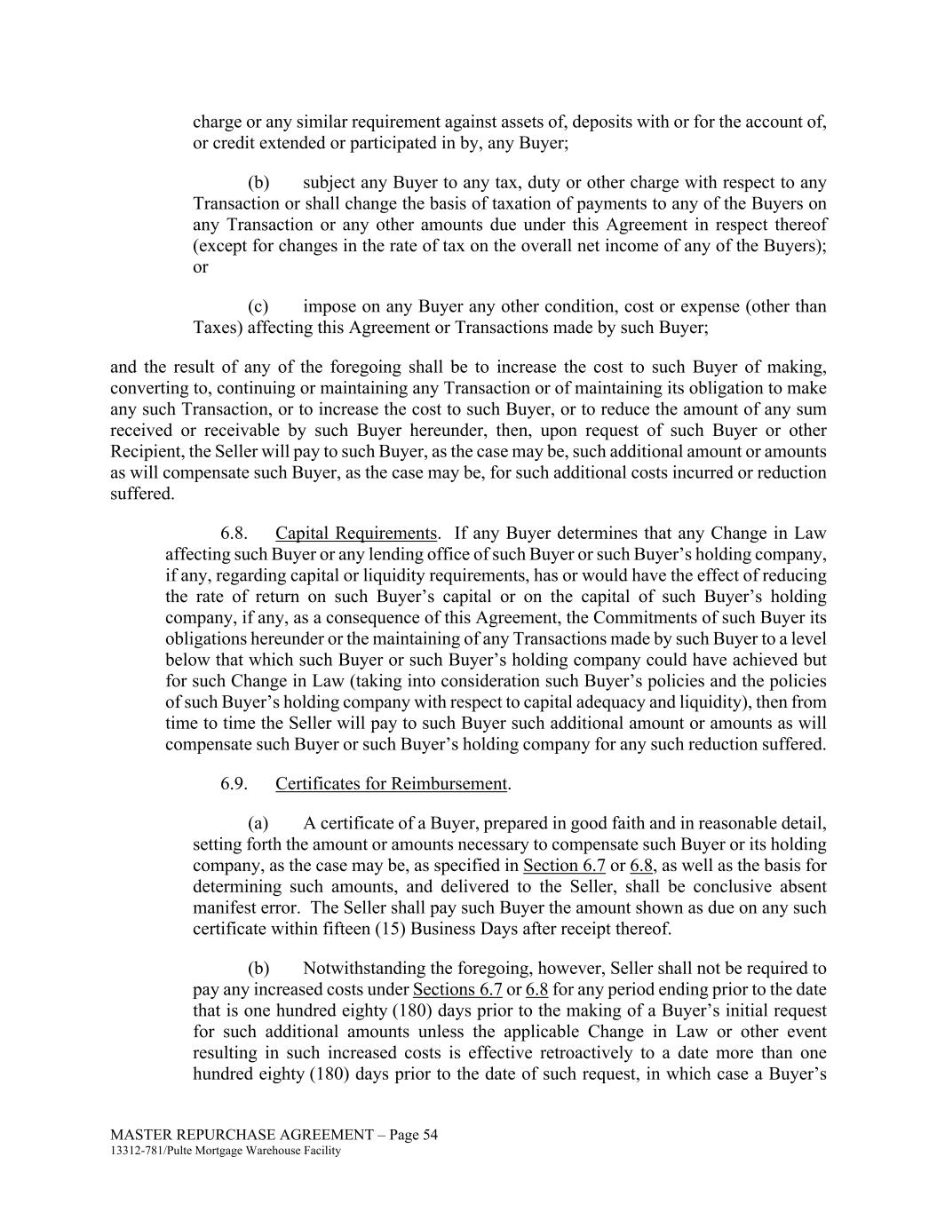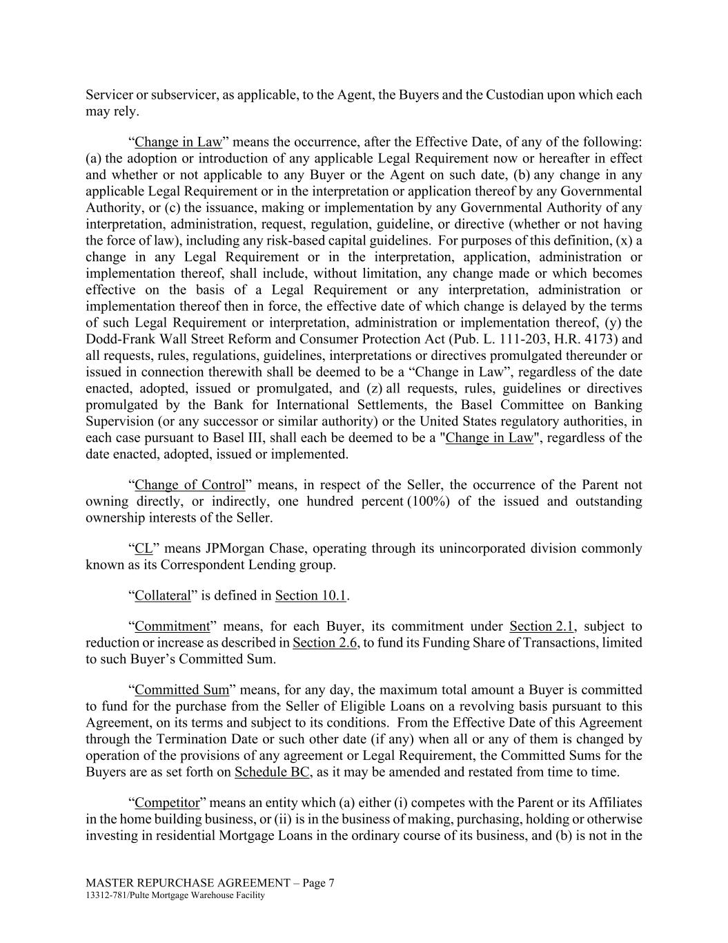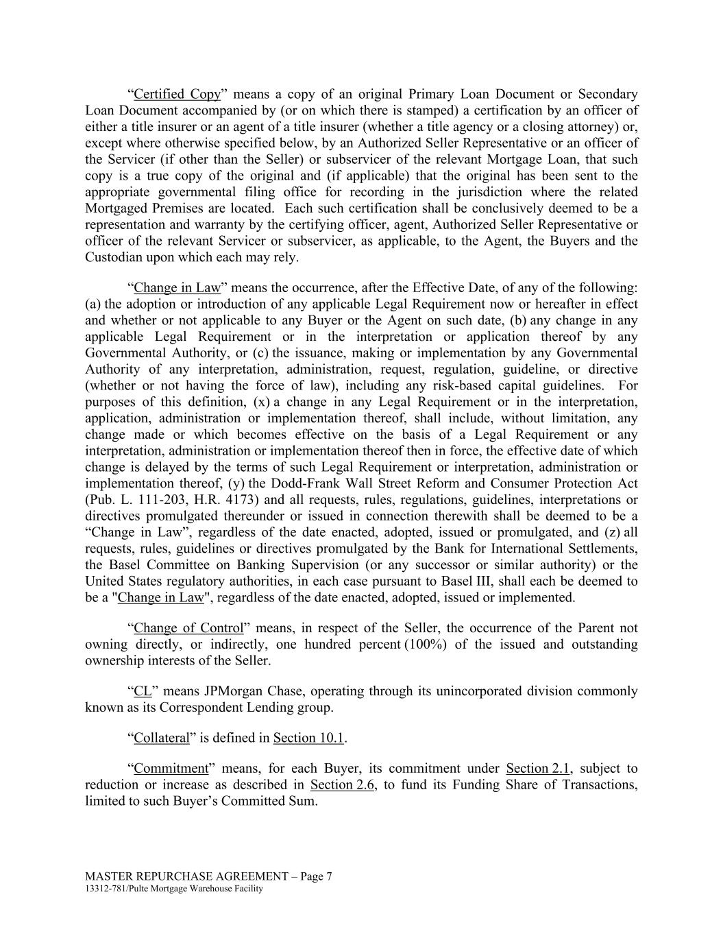 MASTER REPURCHASE AGREEMENT – Page 7 13312-781/Pulte Mortgage Warehouse Facility “Certified Copy” means a copy of an original Primary Loan Document or Secondary Loan Document accompanied by (or on which there is stamped) a certification by an officer of either a title insurer or an agent of a title insurer (whether a title agency or a closing attorney) or, except where otherwise specified below, by an Authorized Seller Representative or an officer of the Servicer (if other than the Seller) or subservicer of the relevant Mortgage Loan, that such copy is a true copy of the original and (if applicable) that the original has been sent to the appropriate governmental filing office for recording in the jurisdiction where the related Mortgaged Premises are located. Each such certification shall be conclusively deemed to be a representation and warranty by the certifying officer, agent, Authorized Seller Representative or officer of the relevant Servicer or subservicer, as applicable, to the Agent, the Buyers and the Custodian upon which each may rely. “Change in Law” means the occurrence, after the Effective Date, of any of the following: (a) the adoption or introduction of any applicable Legal Requirement now or hereafter in effect and whether or not applicable to any Buyer or the Agent on such date, (b) any change in any applicable Legal Requirement or in the interpretation or application thereof by any Governmental Authority, or (c) the issuance, making or implementation by any Governmental Authority of any interpretation, administration, request, regulation, guideline, or directive (whether or not having the force of law), including any risk-based capital guidelines. For purposes of this definition, (x) a change in any Legal Requirement or in the interpretation, application, administration or implementation thereof, shall include, without limitation, any change made or which becomes effective on the basis of a Legal Requirement or any interpretation, administration or implementation thereof then in force, the effective date of which change is delayed by the terms of such Legal Requirement or interpretation, administration or implementation thereof, (y) the Dodd-Frank Wall Street Reform and Consumer Protection Act (Pub. L. 111-203, H.R. 4173) and all requests, rules, regulations, guidelines, interpretations or directives promulgated thereunder or issued in connection therewith shall be deemed to be a “Change in Law”, regardless of the date enacted, adopted, issued or promulgated, and (z) all requests, rules, guidelines or directives promulgated by the Bank for International Settlements, the Basel Committee on Banking Supervision (or any successor or similar authority) or the United States regulatory authorities, in each case pursuant to Basel III, shall each be deemed to be a "Change in Law", regardless of the date enacted, adopted, issued or implemented. “Change of Control” means, in respect of the Seller, the occurrence of the Parent not owning directly, or indirectly, one hundred percent (100%) of the issued and outstanding ownership interests of the Seller. “CL” means JPMorgan Chase, operating through its unincorporated division commonly known as its Correspondent Lending group. “Collateral” is defined in Section 10.1. “Commitment” means, for each Buyer, its commitment under Section 2.1, subject to reduction or increase as described in Section 2.6, to fund its Funding Share of Transactions, limited to such Buyer’s Committed Sum.