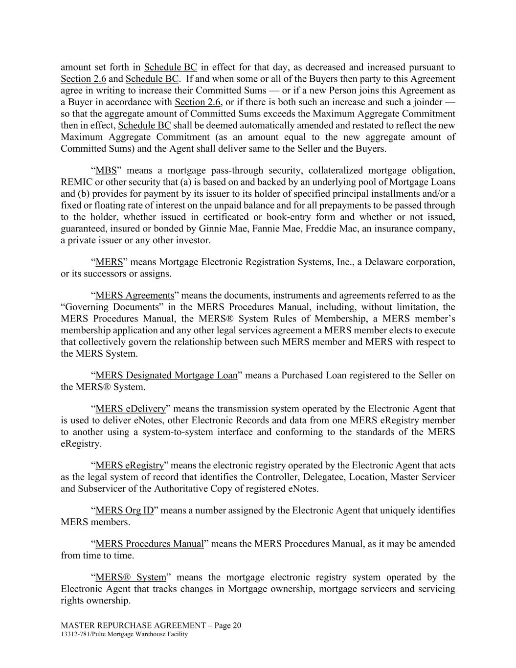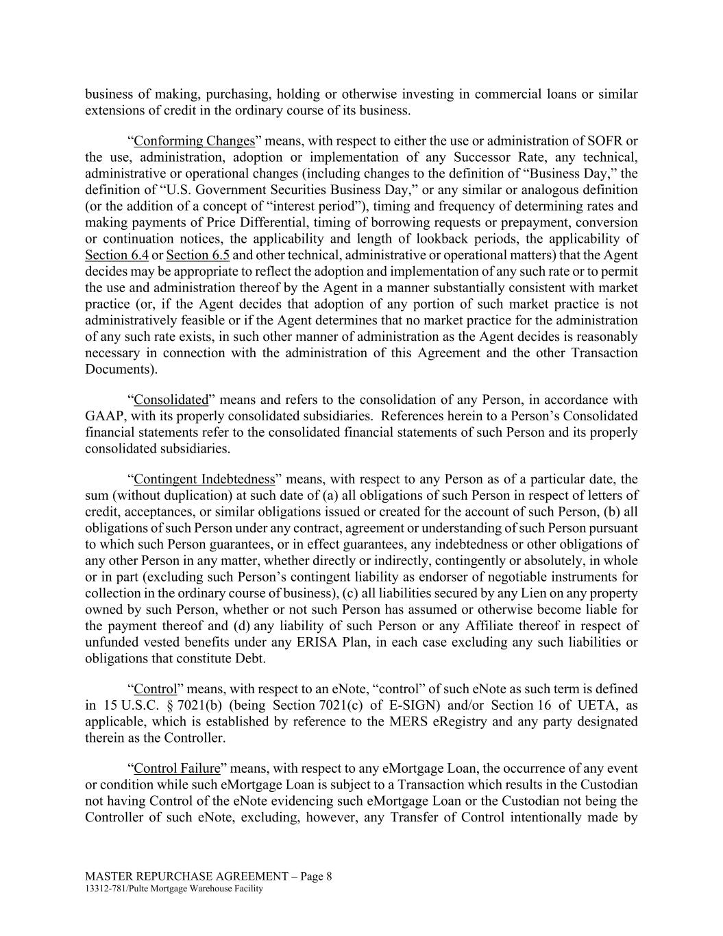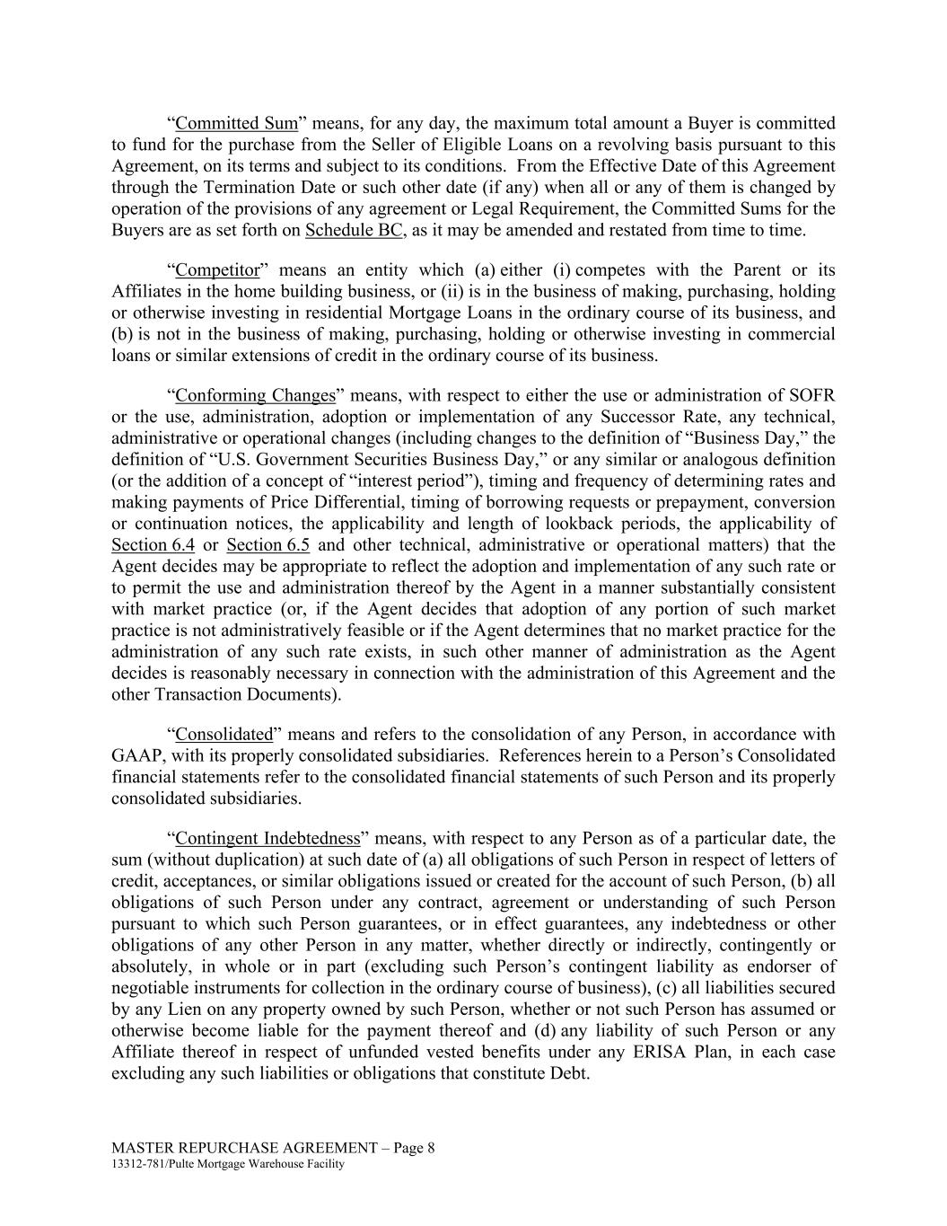 MASTER REPURCHASE AGREEMENT – Page 8 13312-781/Pulte Mortgage Warehouse Facility “Committed Sum” means, for any day, the maximum total amount a Buyer is committed to fund for the purchase from the Seller of Eligible Loans on a revolving basis pursuant to this Agreement, on its terms and subject to its conditions. From the Effective Date of this Agreement through the Termination Date or such other date (if any) when all or any of them is changed by operation of the provisions of any agreement or Legal Requirement, the Committed Sums for the Buyers are as set forth on Schedule BC, as it may be amended and restated from time to time. “Competitor” means an entity which (a) either (i) competes with the Parent or its Affiliates in the home building business, or (ii) is in the business of making, purchasing, holding or otherwise investing in residential Mortgage Loans in the ordinary course of its business, and (b) is not in the business of making, purchasing, holding or otherwise investing in commercial loans or similar extensions of credit in the ordinary course of its business. “Conforming Changes” means, with respect to either the use or administration of SOFR or the use, administration, adoption or implementation of any Successor Rate, any technical, administrative or operational changes (including changes to the definition of “Business Day,” the definition of “U.S. Government Securities Business Day,” or any similar or analogous definition (or the addition of a concept of “interest period”), timing and frequency of determining rates and making payments of Price Differential, timing of borrowing requests or prepayment, conversion or continuation notices, the applicability and length of lookback periods, the applicability of Section 6.4 or Section 6.5 and other technical, administrative or operational matters) that the Agent decides may be appropriate to reflect the adoption and implementation of any such rate or to permit the use and administration thereof by the Agent in a manner substantially consistent with market practice (or, if the Agent decides that adoption of any portion of such market practice is not administratively feasible or if the Agent determines that no market practice for the administration of any such rate exists, in such other manner of administration as the Agent decides is reasonably necessary in connection with the administration of this Agreement and the other Transaction Documents). “Consolidated” means and refers to the consolidation of any Person, in accordance with GAAP, with its properly consolidated subsidiaries. References herein to a Person’s Consolidated financial statements refer to the consolidated financial statements of such Person and its properly consolidated subsidiaries. “Contingent Indebtedness” means, with respect to any Person as of a particular date, the sum (without duplication) at such date of (a) all obligations of such Person in respect of letters of credit, acceptances, or similar obligations issued or created for the account of such Person, (b) all obligations of such Person under any contract, agreement or understanding of such Person pursuant to which such Person guarantees, or in effect guarantees, any indebtedness or other obligations of any other Person in any matter, whether directly or indirectly, contingently or absolutely, in whole or in part (excluding such Person’s contingent liability as endorser of negotiable instruments for collection in the ordinary course of business), (c) all liabilities secured by any Lien on any property owned by such Person, whether or not such Person has assumed or otherwise become liable for the payment thereof and (d) any liability of such Person or any Affiliate thereof in respect of unfunded vested benefits under any ERISA Plan, in each case excluding any such liabilities or obligations that constitute Debt.