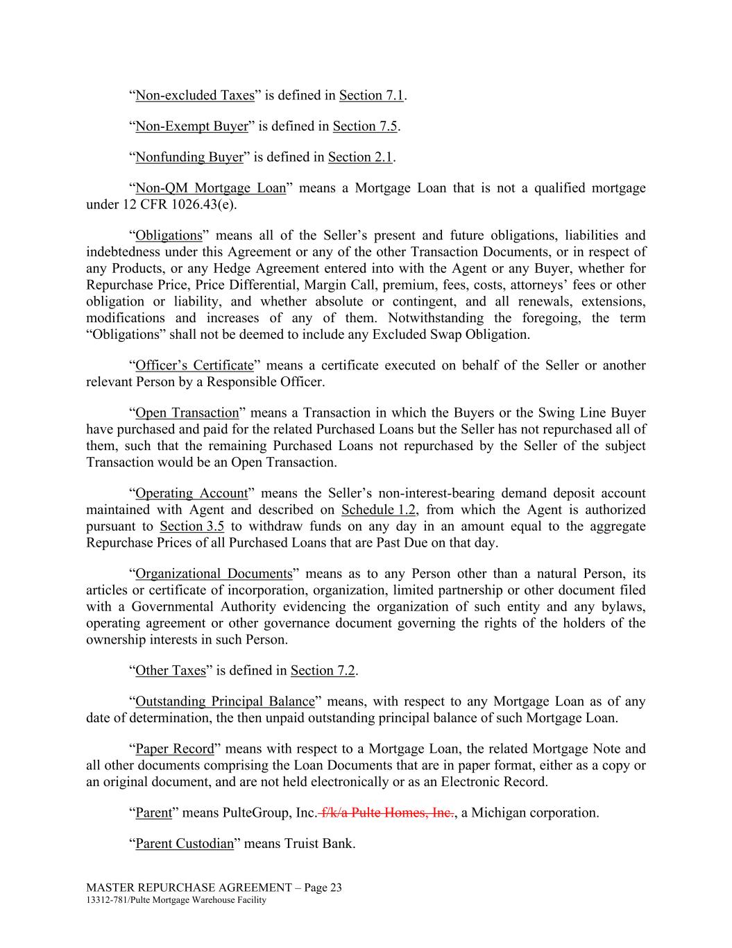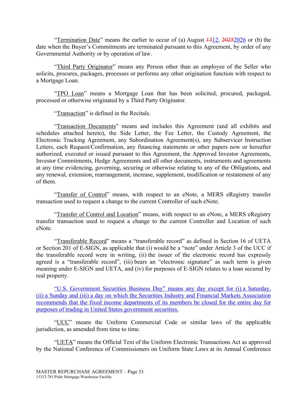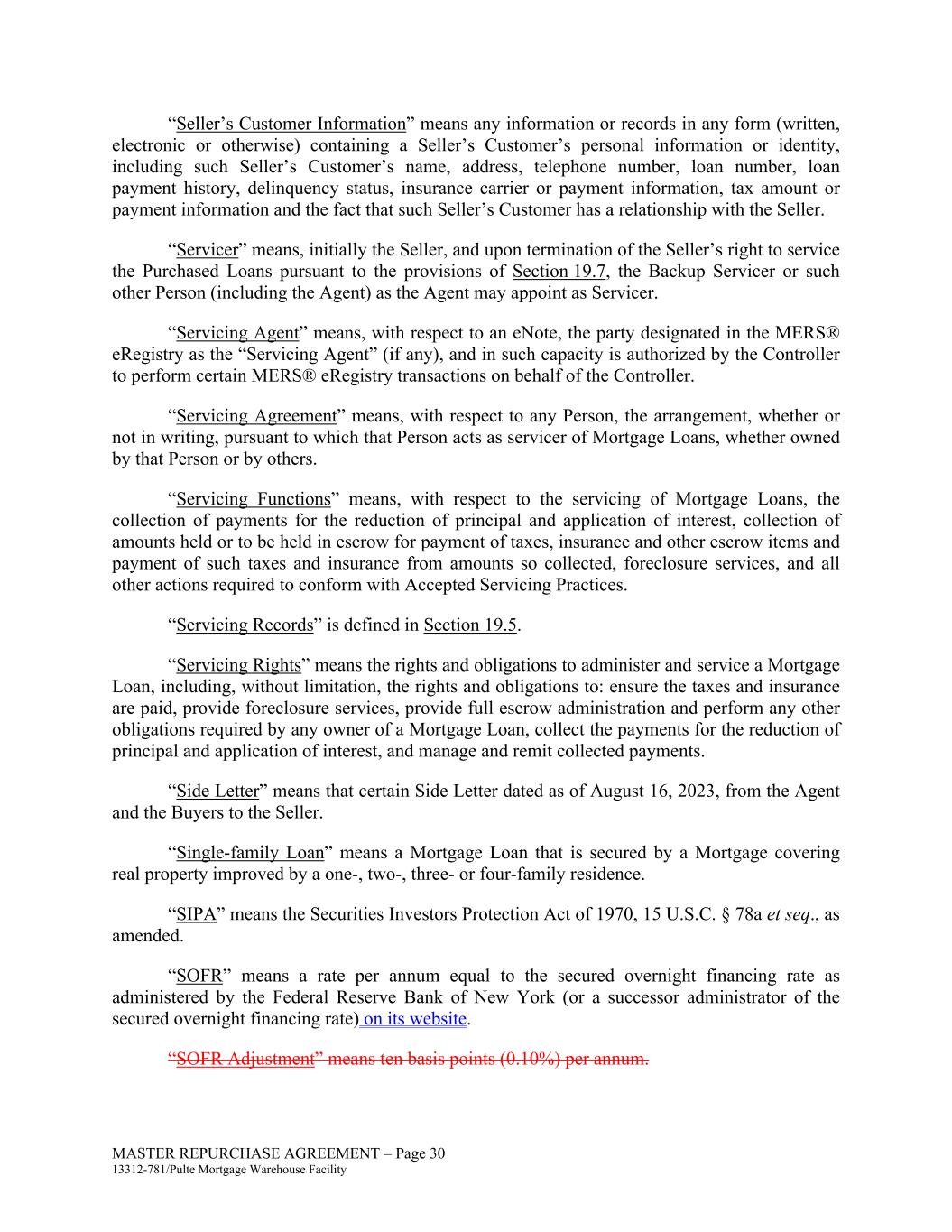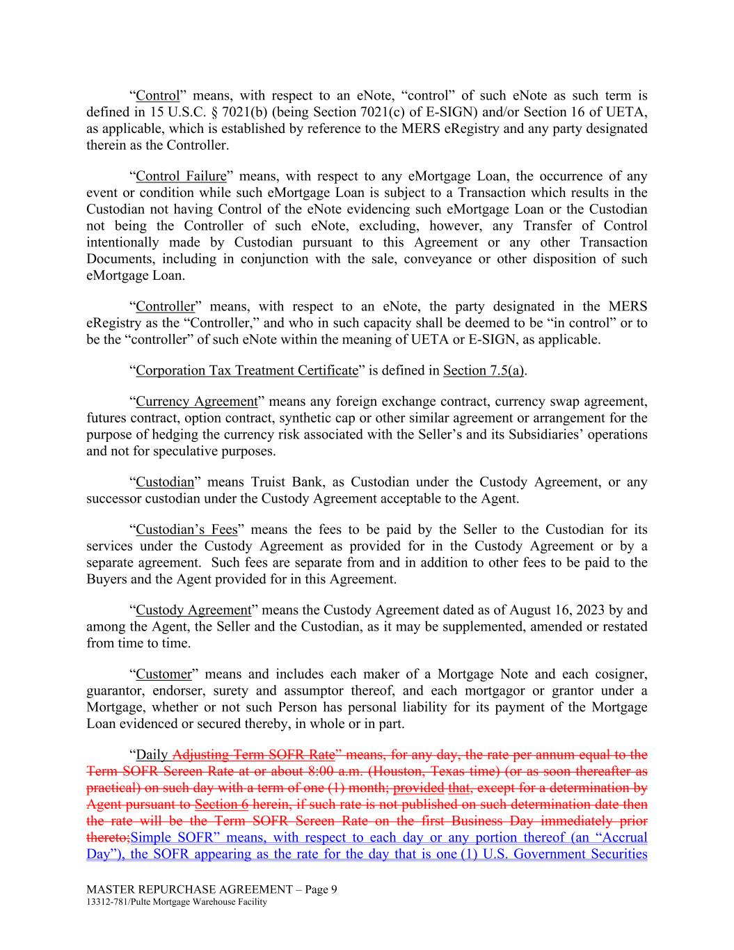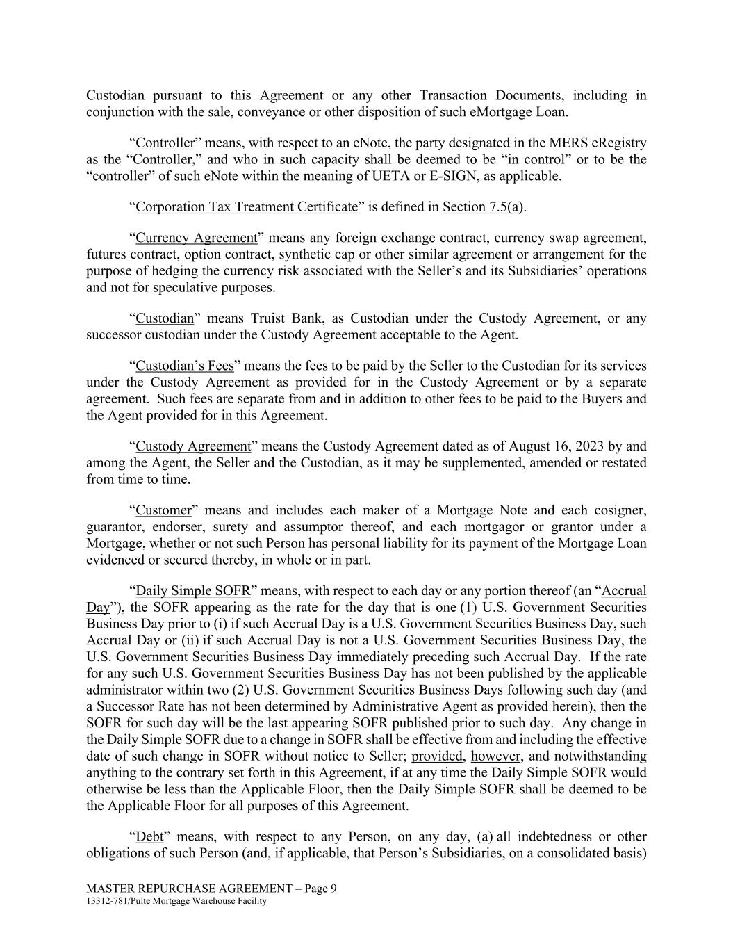 MASTER REPURCHASE AGREEMENT – Page 9 13312-781/Pulte Mortgage Warehouse Facility “Control” means, with respect to an eNote, “control” of such eNote as such term is defined in 15 U.S.C. § 7021(b) (being Section 7021(c) of E-SIGN) and/or Section 16 of UETA, as applicable, which is established by reference to the MERS eRegistry and any party designated therein as the Controller. “Control Failure” means, with respect to any eMortgage Loan, the occurrence of any event or condition while such eMortgage Loan is subject to a Transaction which results in the Custodian not having Control of the eNote evidencing such eMortgage Loan or the Custodian not being the Controller of such eNote, excluding, however, any Transfer of Control intentionally made by Custodian pursuant to this Agreement or any other Transaction Documents, including in conjunction with the sale, conveyance or other disposition of such eMortgage Loan. “Controller” means, with respect to an eNote, the party designated in the MERS eRegistry as the “Controller,” and who in such capacity shall be deemed to be “in control” or to be the “controller” of such eNote within the meaning of UETA or E-SIGN, as applicable. “Corporation Tax Treatment Certificate” is defined in Section 7.5(a). “Currency Agreement” means any foreign exchange contract, currency swap agreement, futures contract, option contract, synthetic cap or other similar agreement or arrangement for the purpose of hedging the currency risk associated with the Seller’s and its Subsidiaries’ operations and not for speculative purposes. “Custodian” means Truist Bank, as Custodian under the Custody Agreement, or any successor custodian under the Custody Agreement acceptable to the Agent. “Custodian’s Fees” means the fees to be paid by the Seller to the Custodian for its services under the Custody Agreement as provided for in the Custody Agreement or by a separate agreement. Such fees are separate from and in addition to other fees to be paid to the Buyers and the Agent provided for in this Agreement. “Custody Agreement” means the Custody Agreement dated as of August 16, 2023 by and among the Agent, the Seller and the Custodian, as it may be supplemented, amended or restated from time to time. “Customer” means and includes each maker of a Mortgage Note and each cosigner, guarantor, endorser, surety and assumptor thereof, and each mortgagor or grantor under a Mortgage, whether or not such Person has personal liability for its payment of the Mortgage Loan evidenced or secured thereby, in whole or in part. “Daily Adjusting Term SOFR Rate” means, for any day, the rate per annum equal to the Term SOFR Screen Rate at or about 8:00 a.m. (Houston, Texas time) (or as soon thereafter as practical) on such day with a term of one (1) month; provided that, except for a determination by Agent pursuant to Section 6 herein, if such rate is not published on such determination date then the rate will be the Term SOFR Screen Rate on the first Business Day immediately prior thereto;Simple SOFR” means, with respect to each day or any portion thereof (an “Accrual Day”), the SOFR appearing as the rate for the day that is one (1) U.S. Government Securities