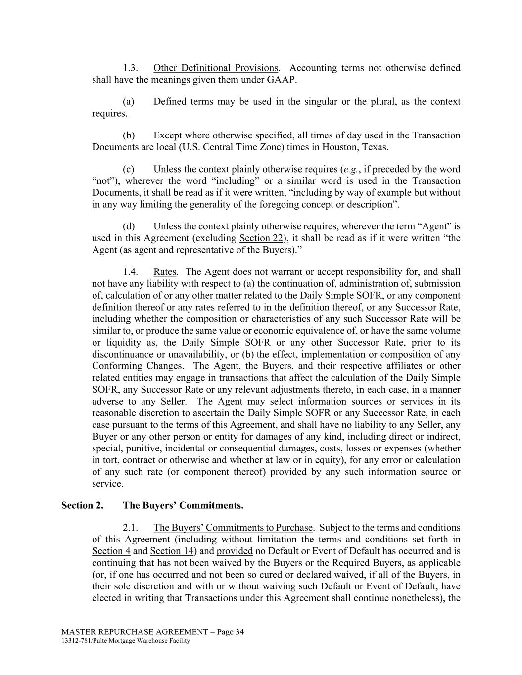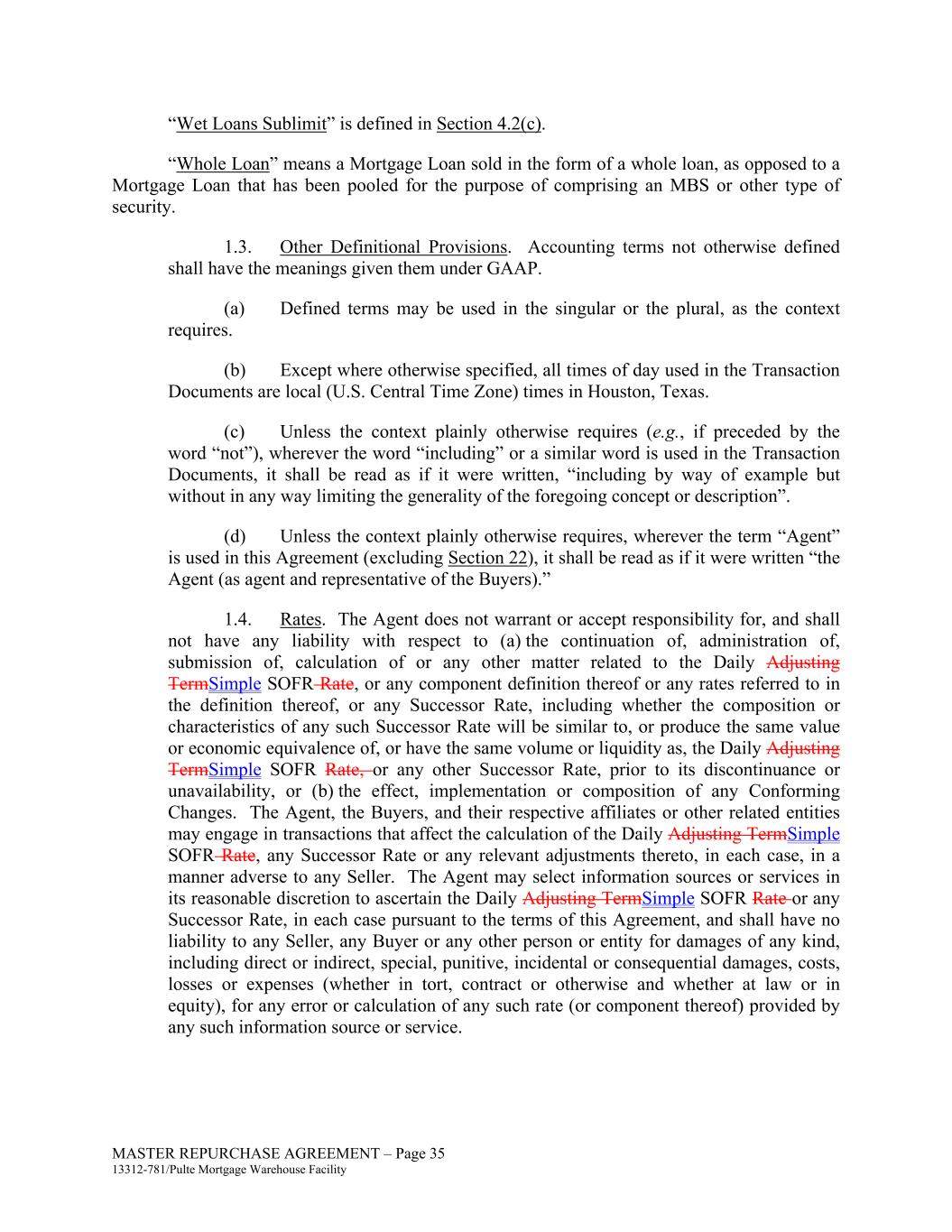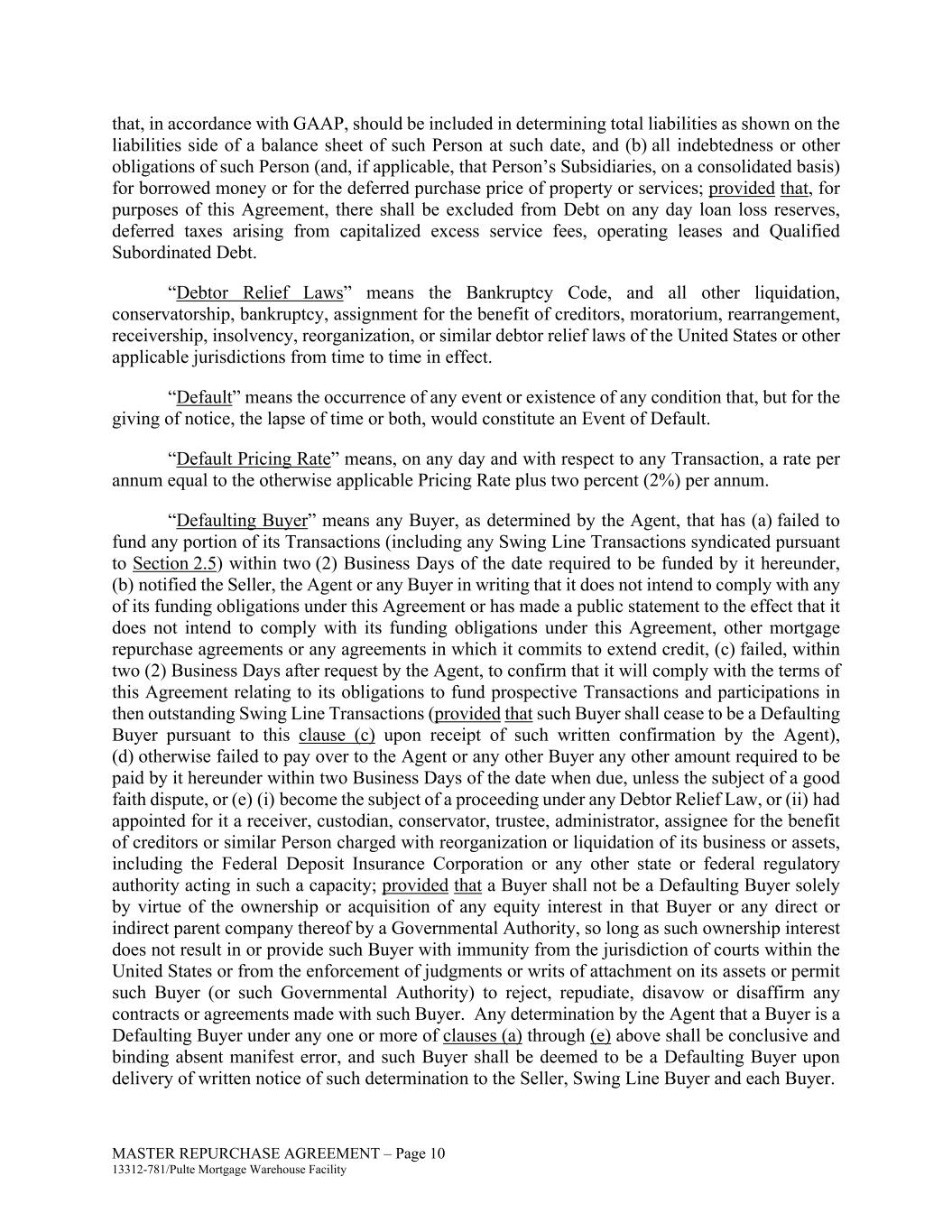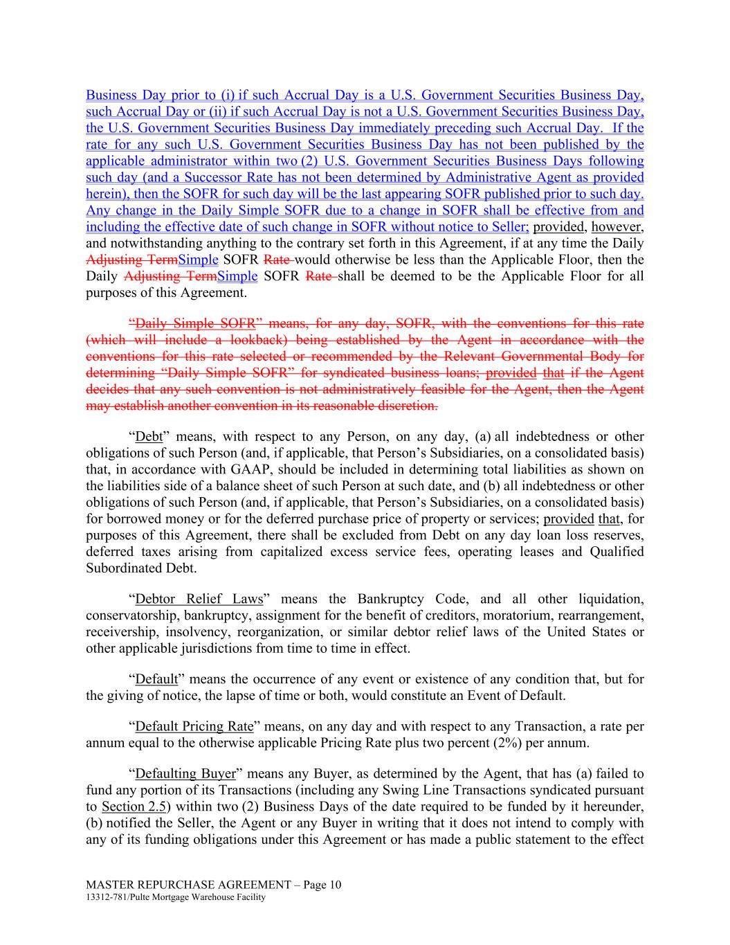 MASTER REPURCHASE AGREEMENT – Page 10 13312-781/Pulte Mortgage Warehouse Facility Business Day prior to (i) if such Accrual Day is a U.S. Government Securities Business Day, such Accrual Day or (ii) if such Accrual Day is not a U.S. Government Securities Business Day, the U.S. Government Securities Business Day immediately preceding such Accrual Day. If the rate for any such U.S. Government Securities Business Day has not been published by the applicable administrator within two (2) U.S. Government Securities Business Days following such day (and a Successor Rate has not been determined by Administrative Agent as provided herein), then the SOFR for such day will be the last appearing SOFR published prior to such day. Any change in the Daily Simple SOFR due to a change in SOFR shall be effective from and including the effective date of such change in SOFR without notice to Seller; provided, however, and notwithstanding anything to the contrary set forth in this Agreement, if at any time the Daily Adjusting TermSimple SOFR Rate would otherwise be less than the Applicable Floor, then the Daily Adjusting TermSimple SOFR Rate shall be deemed to be the Applicable Floor for all purposes of this Agreement. “Daily Simple SOFR” means, for any day, SOFR, with the conventions for this rate (which will include a lookback) being established by the Agent in accordance with the conventions for this rate selected or recommended by the Relevant Governmental Body for determining “Daily Simple SOFR” for syndicated business loans; provided that if the Agent decides that any such convention is not administratively feasible for the Agent, then the Agent may establish another convention in its reasonable discretion. “Debt” means, with respect to any Person, on any day, (a) all indebtedness or other obligations of such Person (and, if applicable, that Person’s Subsidiaries, on a consolidated basis) that, in accordance with GAAP, should be included in determining total liabilities as shown on the liabilities side of a balance sheet of such Person at such date, and (b) all indebtedness or other obligations of such Person (and, if applicable, that Person’s Subsidiaries, on a consolidated basis) for borrowed money or for the deferred purchase price of property or services; provided that, for purposes of this Agreement, there shall be excluded from Debt on any day loan loss reserves, deferred taxes arising from capitalized excess service fees, operating leases and Qualified Subordinated Debt. “Debtor Relief Laws” means the Bankruptcy Code, and all other liquidation, conservatorship, bankruptcy, assignment for the benefit of creditors, moratorium, rearrangement, receivership, insolvency, reorganization, or similar debtor relief laws of the United States or other applicable jurisdictions from time to time in effect. “Default” means the occurrence of any event or existence of any condition that, but for the giving of notice, the lapse of time or both, would constitute an Event of Default. “Default Pricing Rate” means, on any day and with respect to any Transaction, a rate per annum equal to the otherwise applicable Pricing Rate plus two percent (2%) per annum. “Defaulting Buyer” means any Buyer, as determined by the Agent, that has (a) failed to fund any portion of its Transactions (including any Swing Line Transactions syndicated pursuant to Section 2.5) within two (2) Business Days of the date required to be funded by it hereunder, (b) notified the Seller, the Agent or any Buyer in writing that it does not intend to comply with any of its funding obligations under this Agreement or has made a public statement to the effect