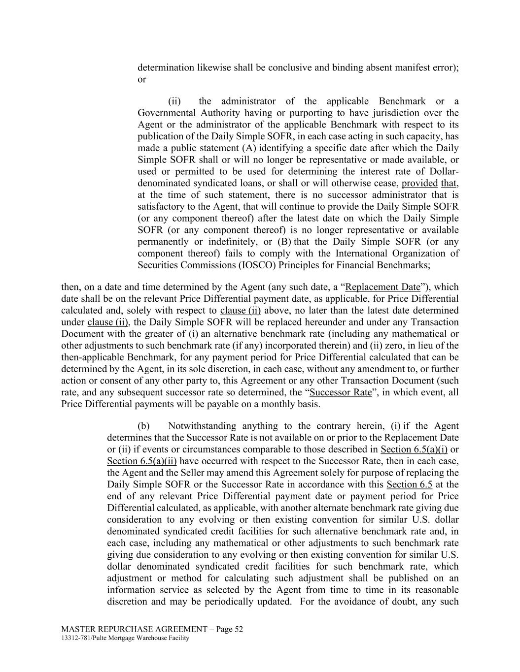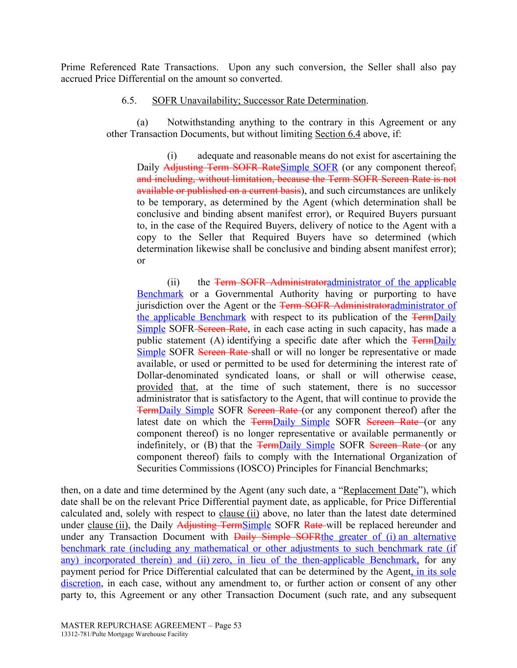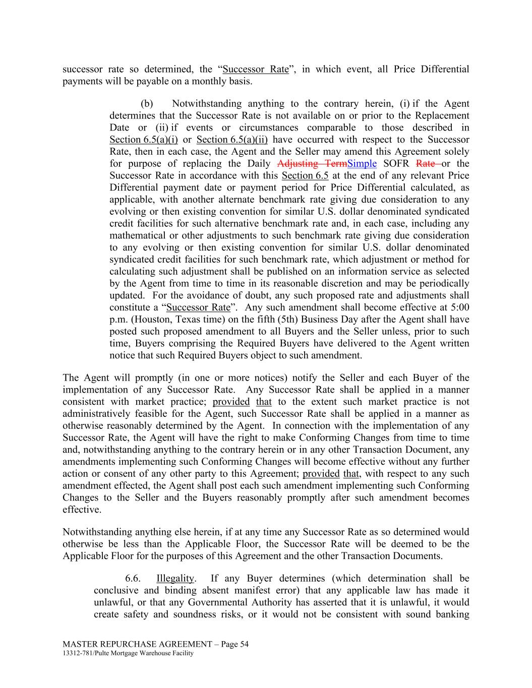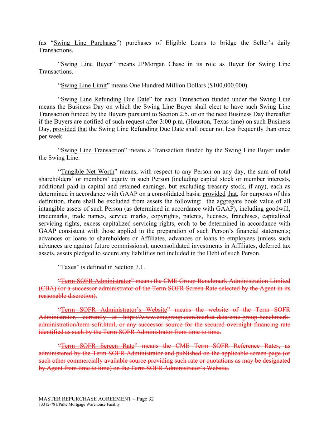 MASTER REPURCHASE AGREEMENT – Page 10 13312-781/Pulte Mortgage Warehouse Facility Business Day prior to (i) if such Accrual Day is a U.S. Government Securities Business Day, such Accrual Day or (ii) if such Accrual Day is not a U.S. Government Securities Business Day, the U.S. Government Securities Business Day immediately preceding such Accrual Day. If the rate for any such U.S. Government Securities Business Day has not been published by the applicable administrator within two (2) U.S. Government Securities Business Days following such day (and a Successor Rate has not been determined by Administrative Agent as provided herein), then the SOFR for such day will be the last appearing SOFR published prior to such day. Any change in the Daily Simple SOFR due to a change in SOFR shall be effective from and including the effective date of such change in SOFR without notice to Seller; provided, however, and notwithstanding anything to the contrary set forth in this Agreement, if at any time the Daily Adjusting TermSimple SOFR Rate would otherwise be less than the Applicable Floor, then the Daily Adjusting TermSimple SOFR Rate shall be deemed to be the Applicable Floor for all purposes of this Agreement. “Daily Simple SOFR” means, for any day, SOFR, with the conventions for this rate (which will include a lookback) being established by the Agent in accordance with the conventions for this rate selected or recommended by the Relevant Governmental Body for determining “Daily Simple SOFR” for syndicated business loans; provided that if the Agent decides that any such convention is not administratively feasible for the Agent, then the Agent may establish another convention in its reasonable discretion. “Debt” means, with respect to any Person, on any day, (a) all indebtedness or other obligations of such Person (and, if applicable, that Person’s Subsidiaries, on a consolidated basis) that, in accordance with GAAP, should be included in determining total liabilities as shown on the liabilities side of a balance sheet of such Person at such date, and (b) all indebtedness or other obligations of such Person (and, if applicable, that Person’s Subsidiaries, on a consolidated basis) for borrowed money or for the deferred purchase price of property or services; provided that, for purposes of this Agreement, there shall be excluded from Debt on any day loan loss reserves, deferred taxes arising from capitalized excess service fees, operating leases and Qualified Subordinated Debt. “Debtor Relief Laws” means the Bankruptcy Code, and all other liquidation, conservatorship, bankruptcy, assignment for the benefit of creditors, moratorium, rearrangement, receivership, insolvency, reorganization, or similar debtor relief laws of the United States or other applicable jurisdictions from time to time in effect. “Default” means the occurrence of any event or existence of any condition that, but for the giving of notice, the lapse of time or both, would constitute an Event of Default. “Default Pricing Rate” means, on any day and with respect to any Transaction, a rate per annum equal to the otherwise applicable Pricing Rate plus two percent (2%) per annum. “Defaulting Buyer” means any Buyer, as determined by the Agent, that has (a) failed to fund any portion of its Transactions (including any Swing Line Transactions syndicated pursuant to Section 2.5) within two (2) Business Days of the date required to be funded by it hereunder, (b) notified the Seller, the Agent or any Buyer in writing that it does not intend to comply with any of its funding obligations under this Agreement or has made a public statement to the effect