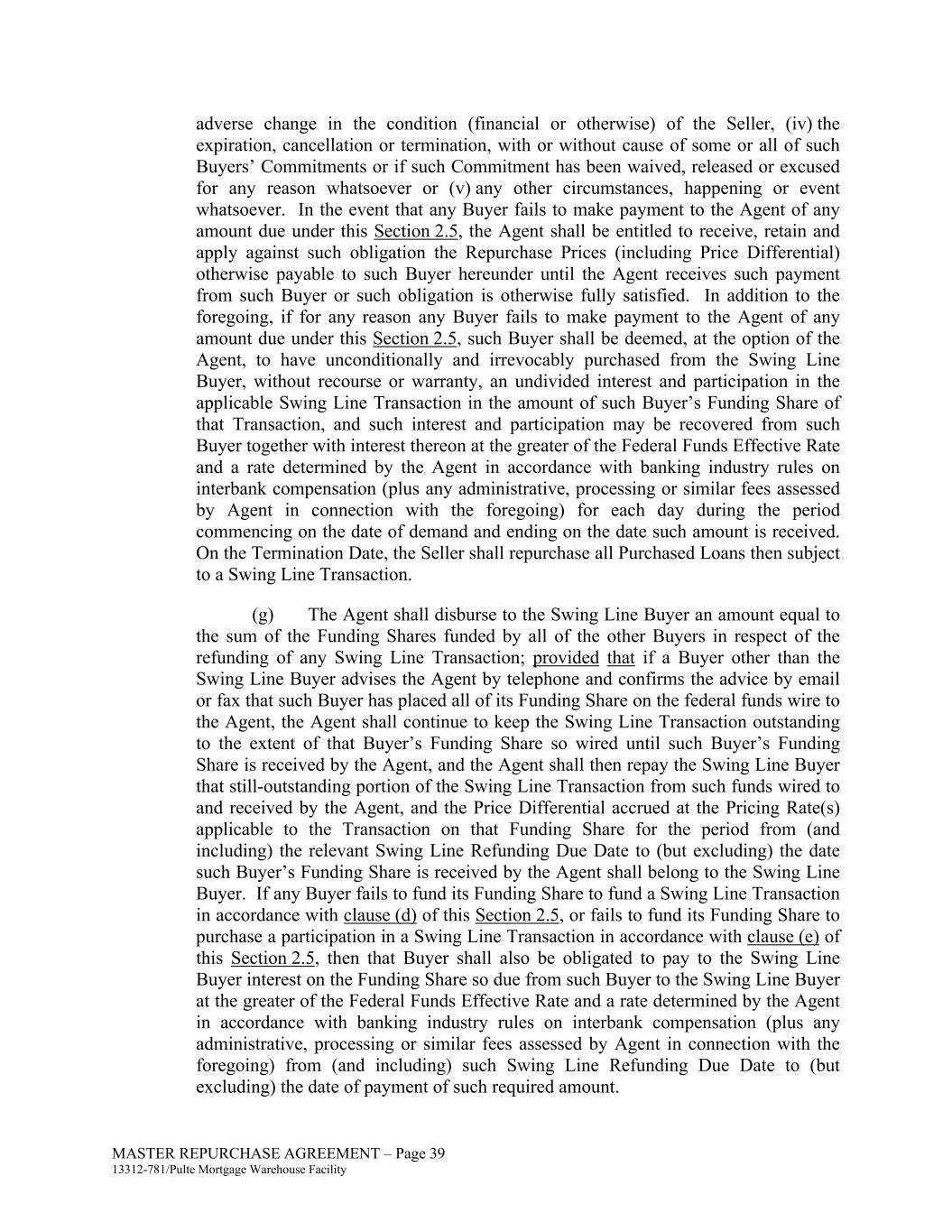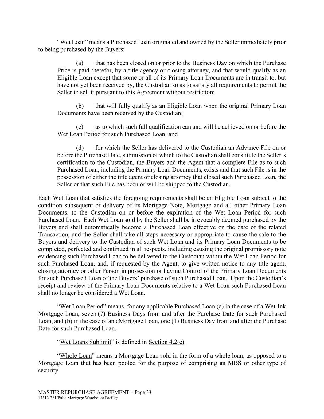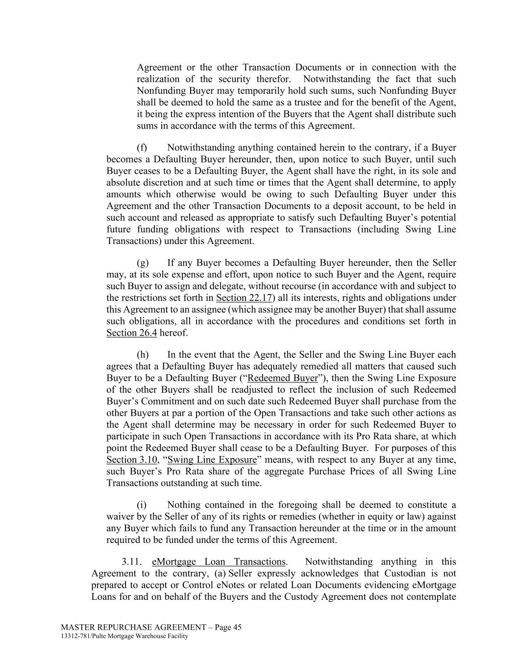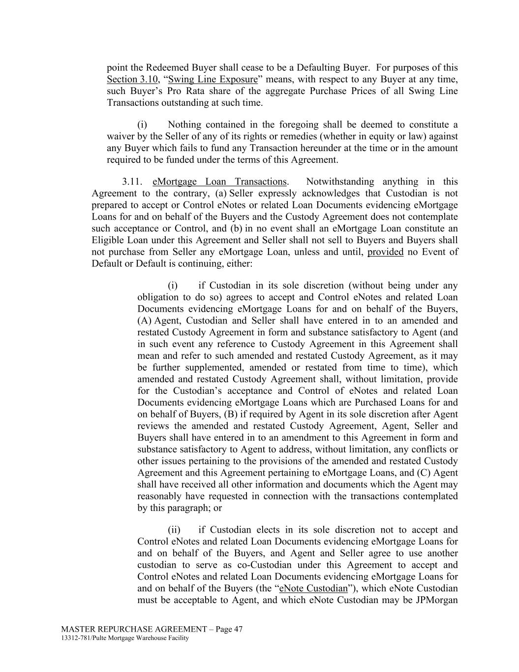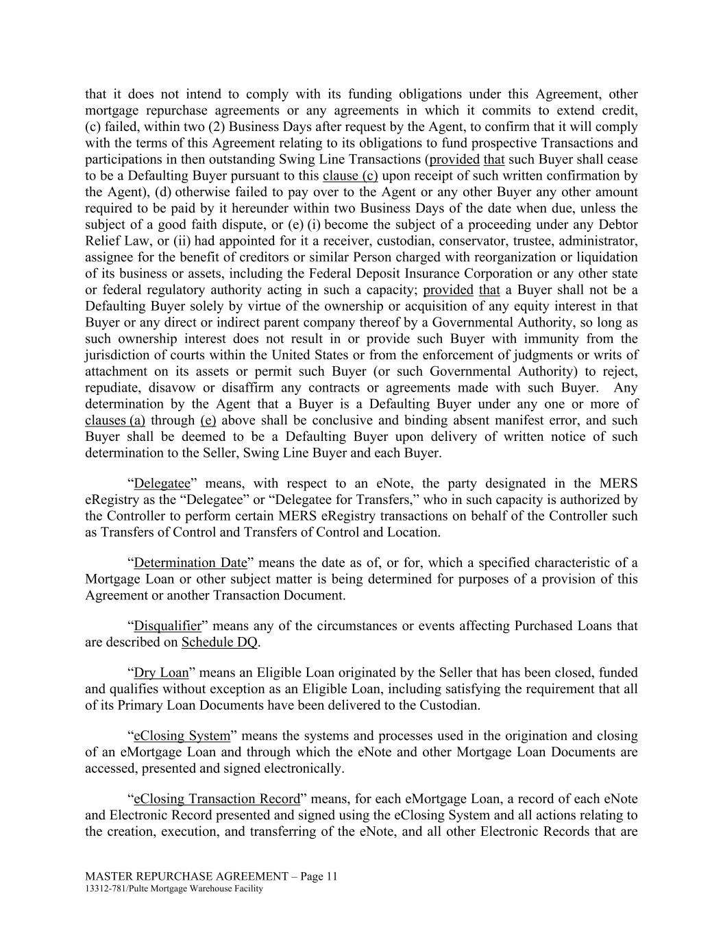 MASTER REPURCHASE AGREEMENT – Page 11 13312-781/Pulte Mortgage Warehouse Facility that it does not intend to comply with its funding obligations under this Agreement, other mortgage repurchase agreements or any agreements in which it commits to extend credit, (c) failed, within two (2) Business Days after request by the Agent, to confirm that it will comply with the terms of this Agreement relating to its obligations to fund prospective Transactions and participations in then outstanding Swing Line Transactions (provided that such Buyer shall cease to be a Defaulting Buyer pursuant to this clause (c) upon receipt of such written confirmation by the Agent), (d) otherwise failed to pay over to the Agent or any other Buyer any other amount required to be paid by it hereunder within two Business Days of the date when due, unless the subject of a good faith dispute, or (e) (i) become the subject of a proceeding under any Debtor Relief Law, or (ii) had appointed for it a receiver, custodian, conservator, trustee, administrator, assignee for the benefit of creditors or similar Person charged with reorganization or liquidation of its business or assets, including the Federal Deposit Insurance Corporation or any other state or federal regulatory authority acting in such a capacity; provided that a Buyer shall not be a Defaulting Buyer solely by virtue of the ownership or acquisition of any equity interest in that Buyer or any direct or indirect parent company thereof by a Governmental Authority, so long as such ownership interest does not result in or provide such Buyer with immunity from the jurisdiction of courts within the United States or from the enforcement of judgments or writs of attachment on its assets or permit such Buyer (or such Governmental Authority) to reject, repudiate, disavow or disaffirm any contracts or agreements made with such Buyer. Any determination by the Agent that a Buyer is a Defaulting Buyer under any one or more of clauses (a) through (e) above shall be conclusive and binding absent manifest error, and such Buyer shall be deemed to be a Defaulting Buyer upon delivery of written notice of such determination to the Seller, Swing Line Buyer and each Buyer. “Delegatee” means, with respect to an eNote, the party designated in the MERS eRegistry as the “Delegatee” or “Delegatee for Transfers,” who in such capacity is authorized by the Controller to perform certain MERS eRegistry transactions on behalf of the Controller such as Transfers of Control and Transfers of Control and Location. “Determination Date” means the date as of, or for, which a specified characteristic of a Mortgage Loan or other subject matter is being determined for purposes of a provision of this Agreement or another Transaction Document. “Disqualifier” means any of the circumstances or events affecting Purchased Loans that are described on Schedule DQ. “Dry Loan” means an Eligible Loan originated by the Seller that has been closed, funded and qualifies without exception as an Eligible Loan, including satisfying the requirement that all of its Primary Loan Documents have been delivered to the Custodian. “eClosing System” means the systems and processes used in the origination and closing of an eMortgage Loan and through which the eNote and other Mortgage Loan Documents are accessed, presented and signed electronically. “eClosing Transaction Record” means, for each eMortgage Loan, a record of each eNote and Electronic Record presented and signed using the eClosing System and all actions relating to the creation, execution, and transferring of the eNote, and all other Electronic Records that are