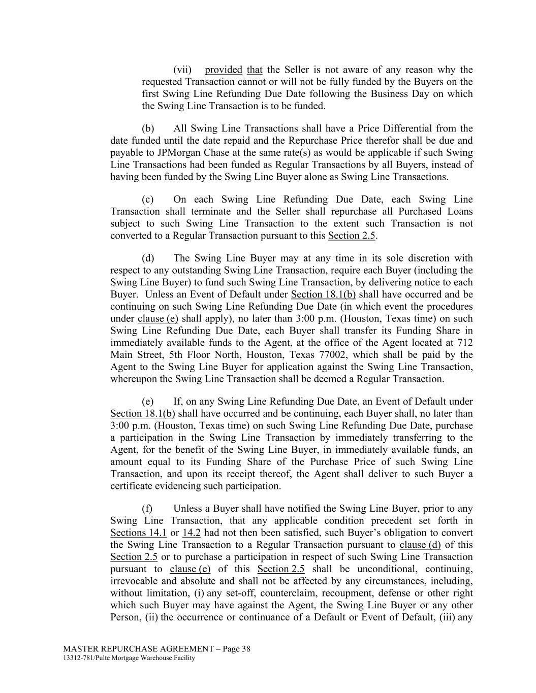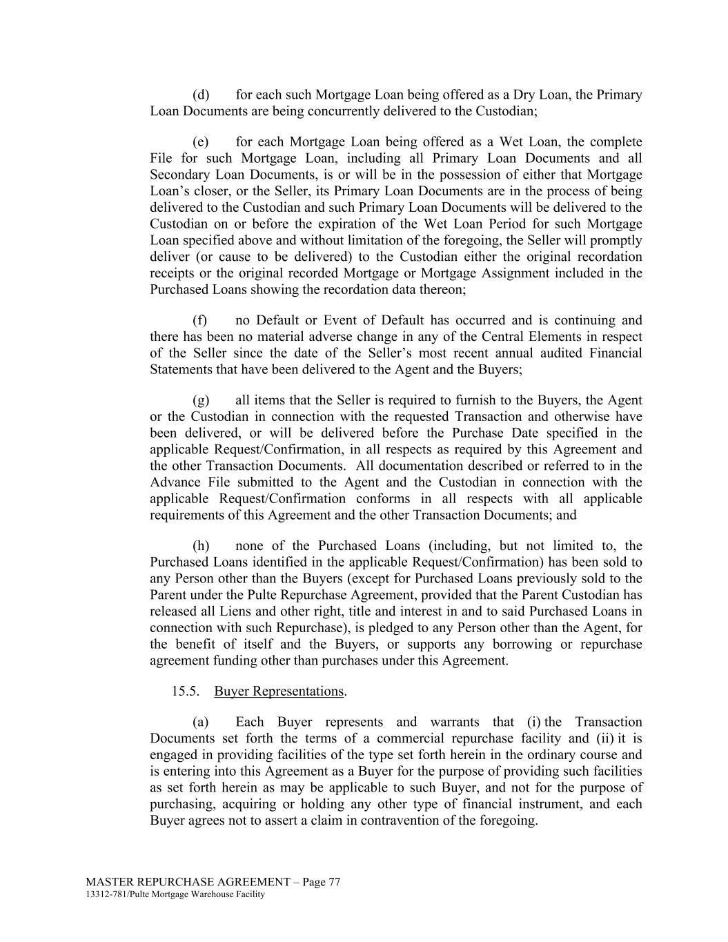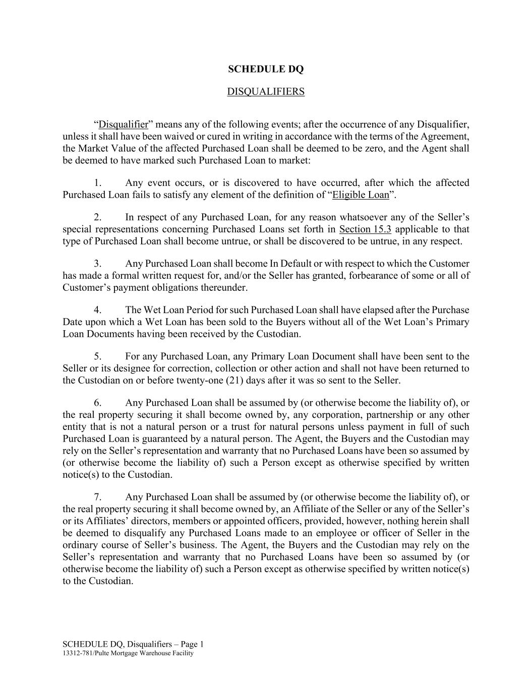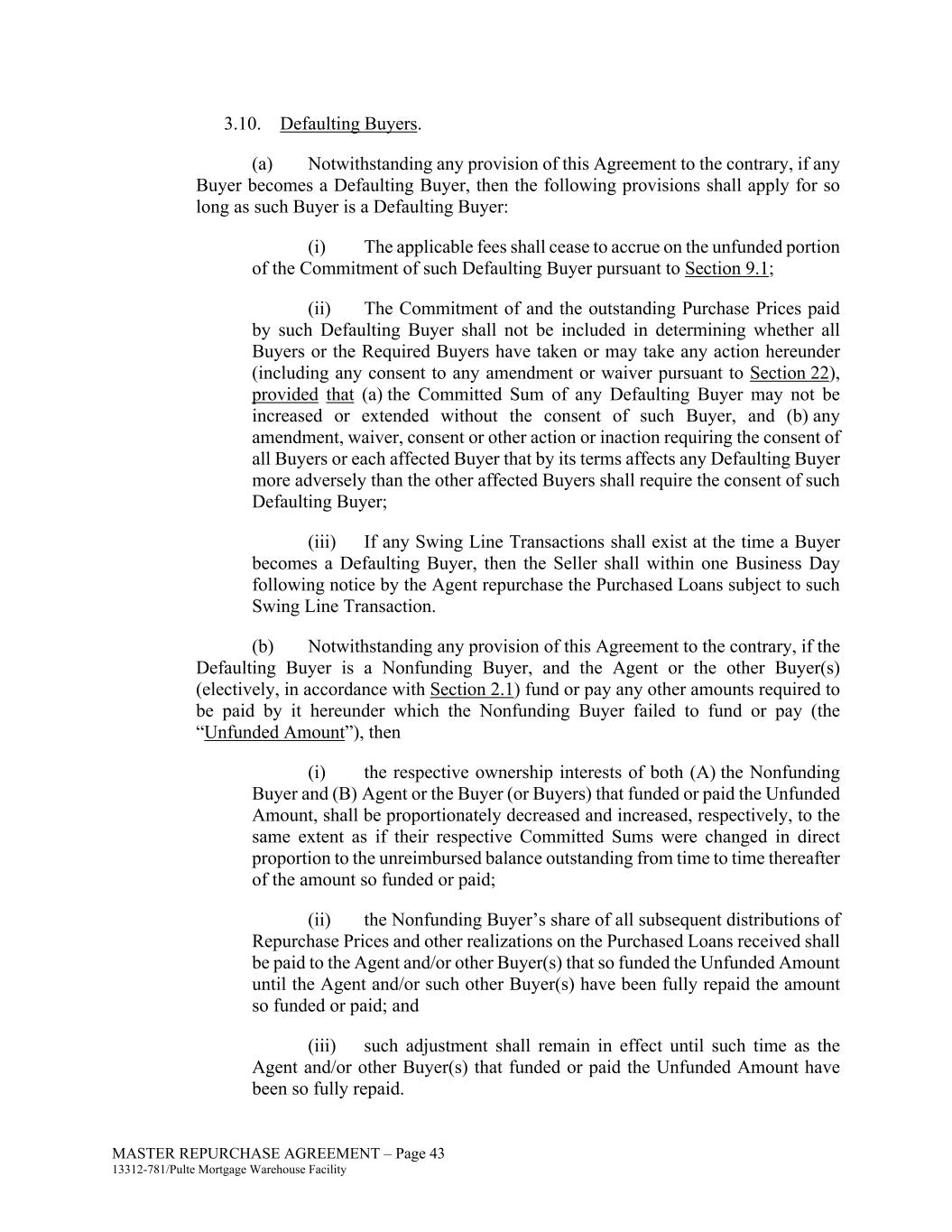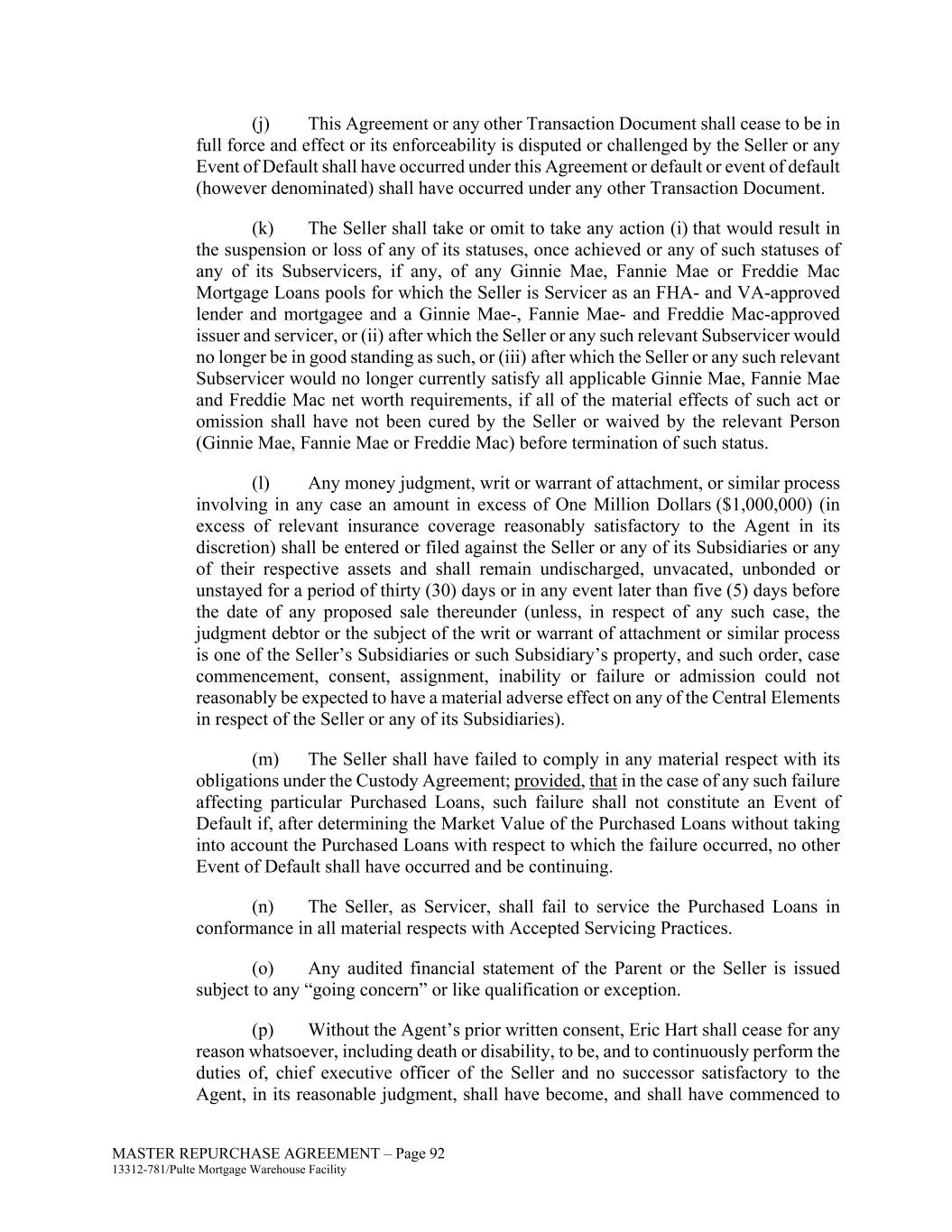 MASTER REPURCHASE AGREEMENT – Page 11 13312-781/Pulte Mortgage Warehouse Facility that it does not intend to comply with its funding obligations under this Agreement, other mortgage repurchase agreements or any agreements in which it commits to extend credit, (c) failed, within two (2) Business Days after request by the Agent, to confirm that it will comply with the terms of this Agreement relating to its obligations to fund prospective Transactions and participations in then outstanding Swing Line Transactions (provided that such Buyer shall cease to be a Defaulting Buyer pursuant to this clause (c) upon receipt of such written confirmation by the Agent), (d) otherwise failed to pay over to the Agent or any other Buyer any other amount required to be paid by it hereunder within two Business Days of the date when due, unless the subject of a good faith dispute, or (e) (i) become the subject of a proceeding under any Debtor Relief Law, or (ii) had appointed for it a receiver, custodian, conservator, trustee, administrator, assignee for the benefit of creditors or similar Person charged with reorganization or liquidation of its business or assets, including the Federal Deposit Insurance Corporation or any other state or federal regulatory authority acting in such a capacity; provided that a Buyer shall not be a Defaulting Buyer solely by virtue of the ownership or acquisition of any equity interest in that Buyer or any direct or indirect parent company thereof by a Governmental Authority, so long as such ownership interest does not result in or provide such Buyer with immunity from the jurisdiction of courts within the United States or from the enforcement of judgments or writs of attachment on its assets or permit such Buyer (or such Governmental Authority) to reject, repudiate, disavow or disaffirm any contracts or agreements made with such Buyer. Any determination by the Agent that a Buyer is a Defaulting Buyer under any one or more of clauses (a) through (e) above shall be conclusive and binding absent manifest error, and such Buyer shall be deemed to be a Defaulting Buyer upon delivery of written notice of such determination to the Seller, Swing Line Buyer and each Buyer. “Delegatee” means, with respect to an eNote, the party designated in the MERS eRegistry as the “Delegatee” or “Delegatee for Transfers,” who in such capacity is authorized by the Controller to perform certain MERS eRegistry transactions on behalf of the Controller such as Transfers of Control and Transfers of Control and Location. “Determination Date” means the date as of, or for, which a specified characteristic of a Mortgage Loan or other subject matter is being determined for purposes of a provision of this Agreement or another Transaction Document. “Disqualifier” means any of the circumstances or events affecting Purchased Loans that are described on Schedule DQ. “Dry Loan” means an Eligible Loan originated by the Seller that has been closed, funded and qualifies without exception as an Eligible Loan, including satisfying the requirement that all of its Primary Loan Documents have been delivered to the Custodian. “eClosing System” means the systems and processes used in the origination and closing of an eMortgage Loan and through which the eNote and other Mortgage Loan Documents are accessed, presented and signed electronically. “eClosing Transaction Record” means, for each eMortgage Loan, a record of each eNote and Electronic Record presented and signed using the eClosing System and all actions relating to the creation, execution, and transferring of the eNote, and all other Electronic Records that are