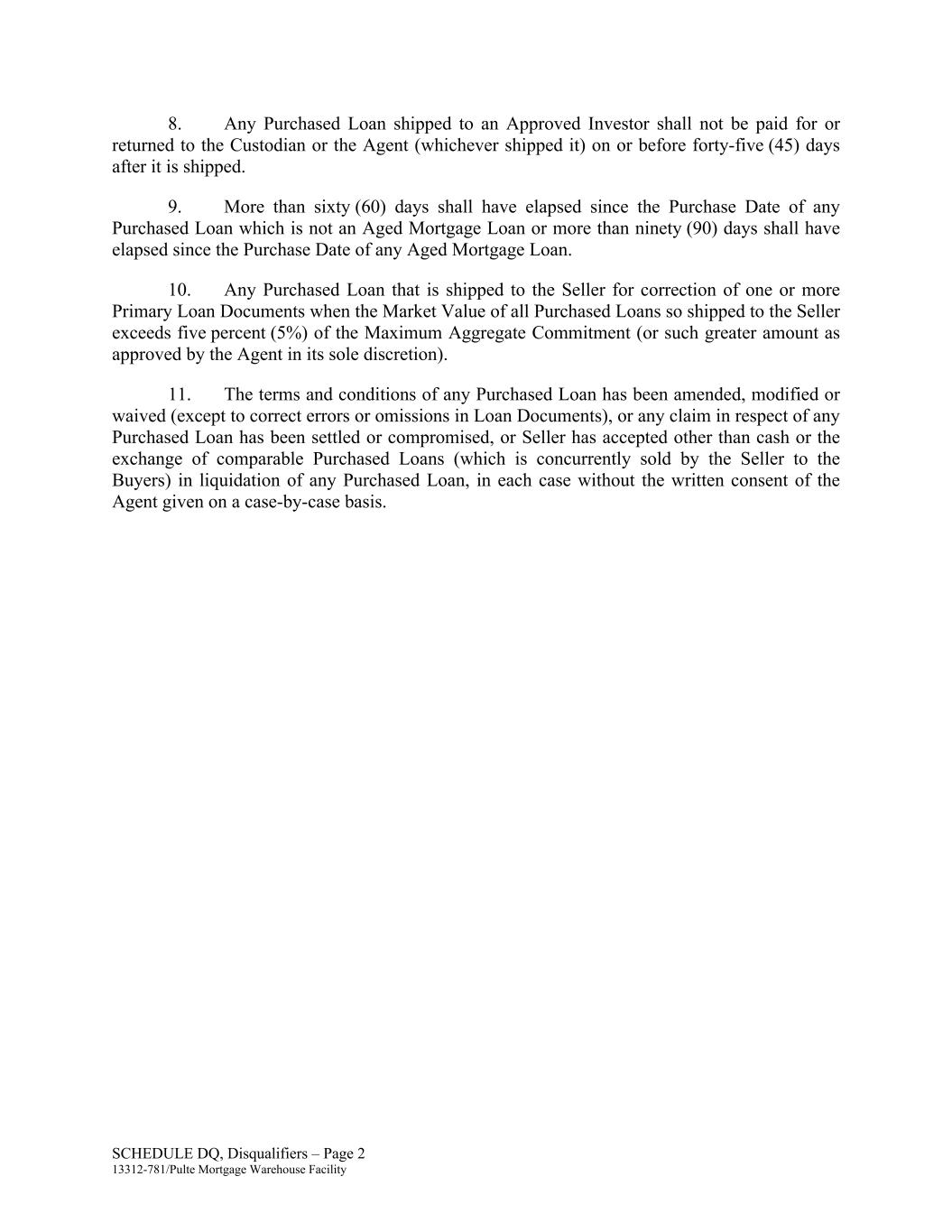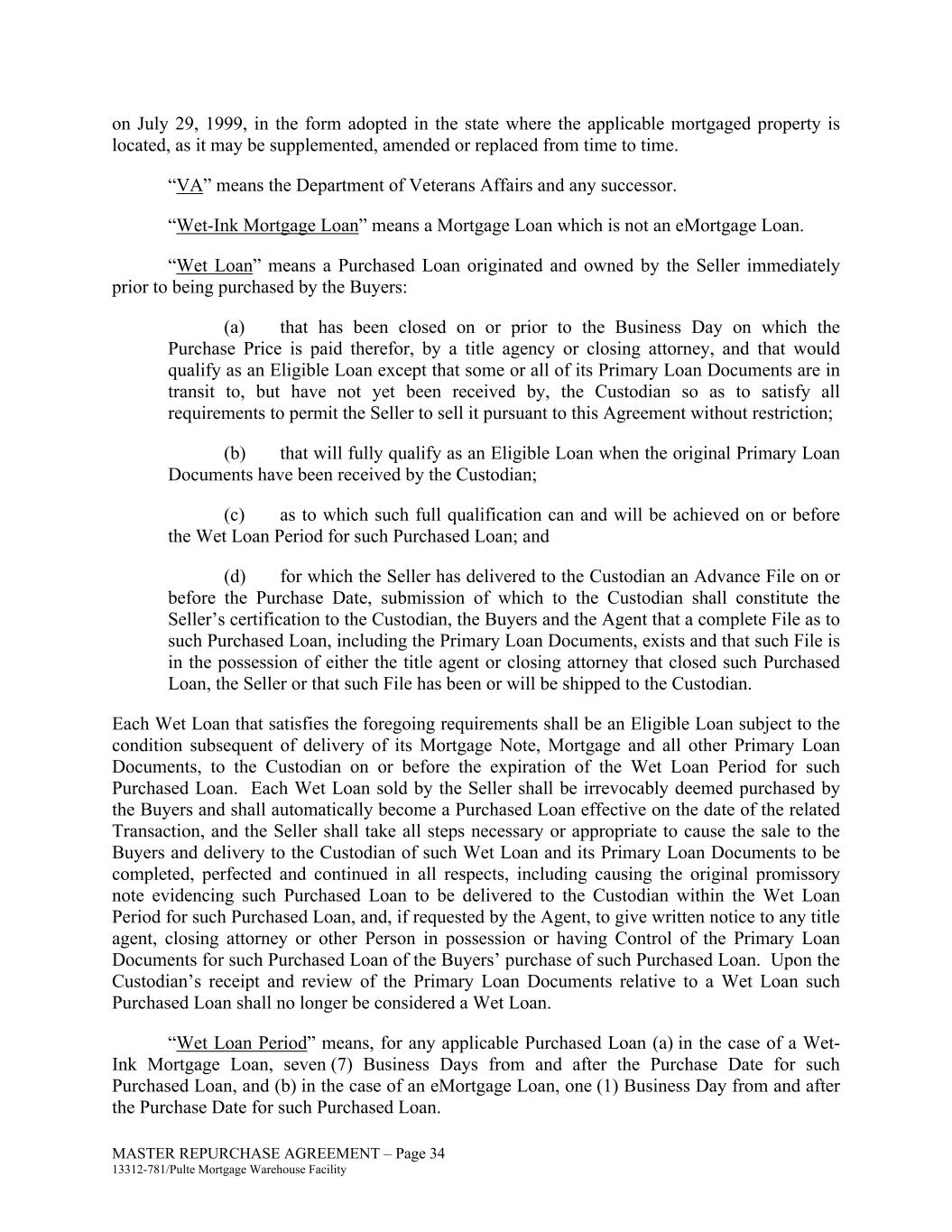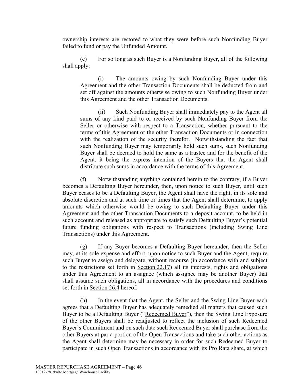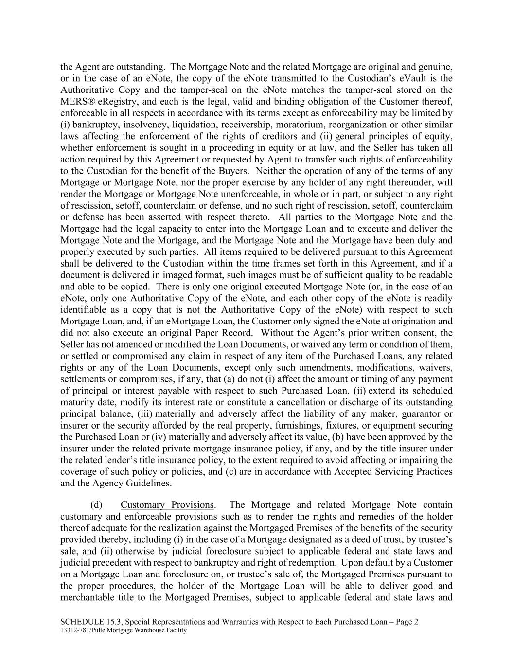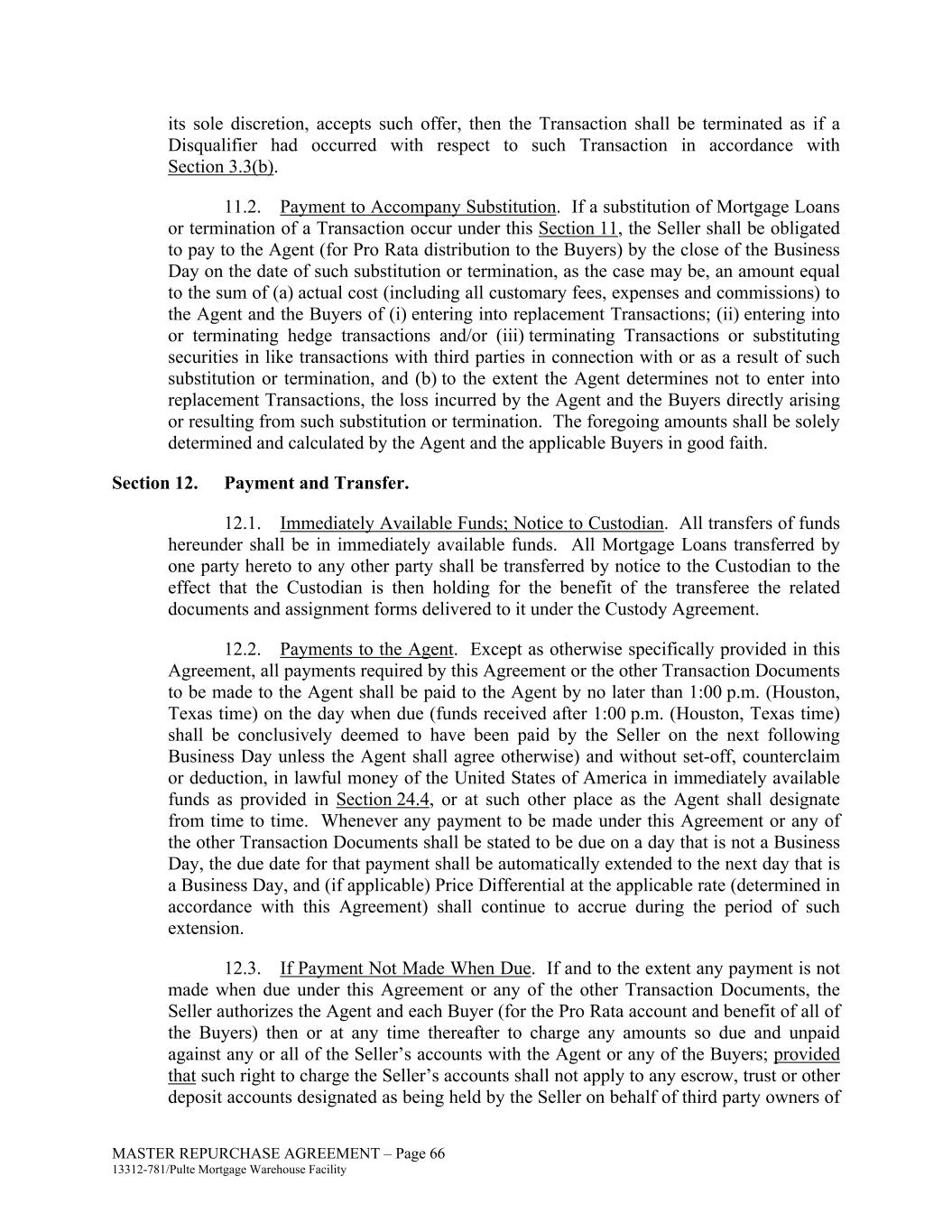 MASTER REPURCHASE AGREEMENT – Page 11 13312-781/Pulte Mortgage Warehouse Facility that it does not intend to comply with its funding obligations under this Agreement, other mortgage repurchase agreements or any agreements in which it commits to extend credit, (c) failed, within two (2) Business Days after request by the Agent, to confirm that it will comply with the terms of this Agreement relating to its obligations to fund prospective Transactions and participations in then outstanding Swing Line Transactions (provided that such Buyer shall cease to be a Defaulting Buyer pursuant to this clause (c) upon receipt of such written confirmation by the Agent), (d) otherwise failed to pay over to the Agent or any other Buyer any other amount required to be paid by it hereunder within two Business Days of the date when due, unless the subject of a good faith dispute, or (e) (i) become the subject of a proceeding under any Debtor Relief Law, or (ii) had appointed for it a receiver, custodian, conservator, trustee, administrator, assignee for the benefit of creditors or similar Person charged with reorganization or liquidation of its business or assets, including the Federal Deposit Insurance Corporation or any other state or federal regulatory authority acting in such a capacity; provided that a Buyer shall not be a Defaulting Buyer solely by virtue of the ownership or acquisition of any equity interest in that Buyer or any direct or indirect parent company thereof by a Governmental Authority, so long as such ownership interest does not result in or provide such Buyer with immunity from the jurisdiction of courts within the United States or from the enforcement of judgments or writs of attachment on its assets or permit such Buyer (or such Governmental Authority) to reject, repudiate, disavow or disaffirm any contracts or agreements made with such Buyer. Any determination by the Agent that a Buyer is a Defaulting Buyer under any one or more of clauses (a) through (e) above shall be conclusive and binding absent manifest error, and such Buyer shall be deemed to be a Defaulting Buyer upon delivery of written notice of such determination to the Seller, Swing Line Buyer and each Buyer. “Delegatee” means, with respect to an eNote, the party designated in the MERS eRegistry as the “Delegatee” or “Delegatee for Transfers,” who in such capacity is authorized by the Controller to perform certain MERS eRegistry transactions on behalf of the Controller such as Transfers of Control and Transfers of Control and Location. “Determination Date” means the date as of, or for, which a specified characteristic of a Mortgage Loan or other subject matter is being determined for purposes of a provision of this Agreement or another Transaction Document. “Disqualifier” means any of the circumstances or events affecting Purchased Loans that are described on Schedule DQ. “Dry Loan” means an Eligible Loan originated by the Seller that has been closed, funded and qualifies without exception as an Eligible Loan, including satisfying the requirement that all of its Primary Loan Documents have been delivered to the Custodian. “eClosing System” means the systems and processes used in the origination and closing of an eMortgage Loan and through which the eNote and other Mortgage Loan Documents are accessed, presented and signed electronically. “eClosing Transaction Record” means, for each eMortgage Loan, a record of each eNote and Electronic Record presented and signed using the eClosing System and all actions relating to the creation, execution, and transferring of the eNote, and all other Electronic Records that are