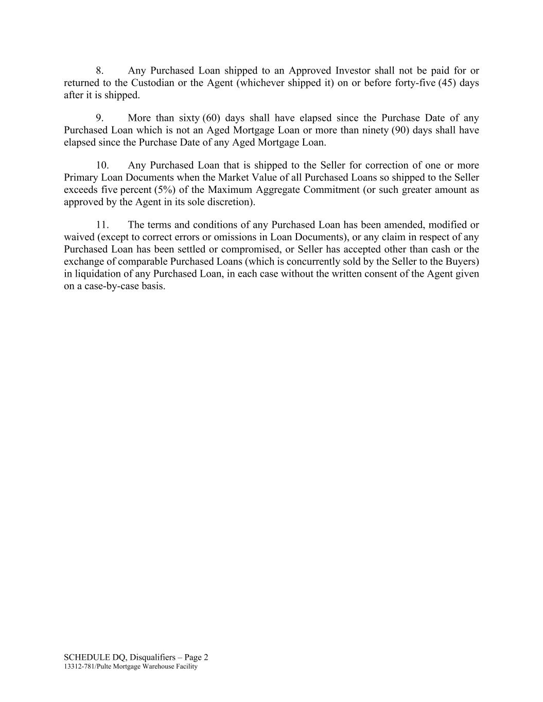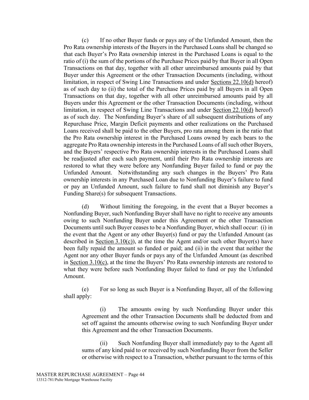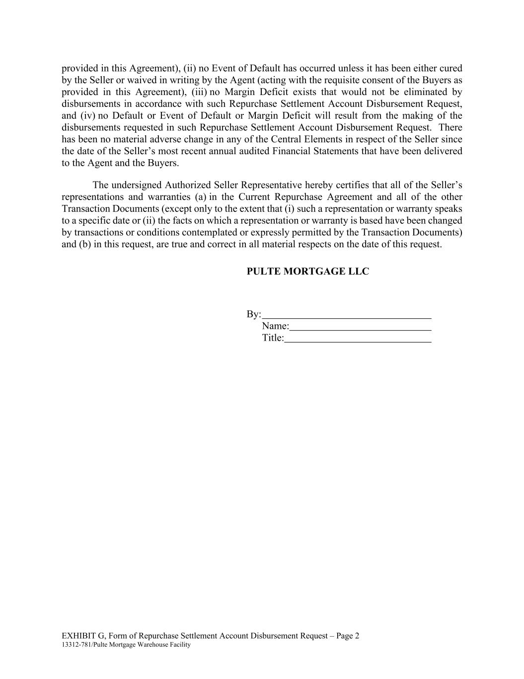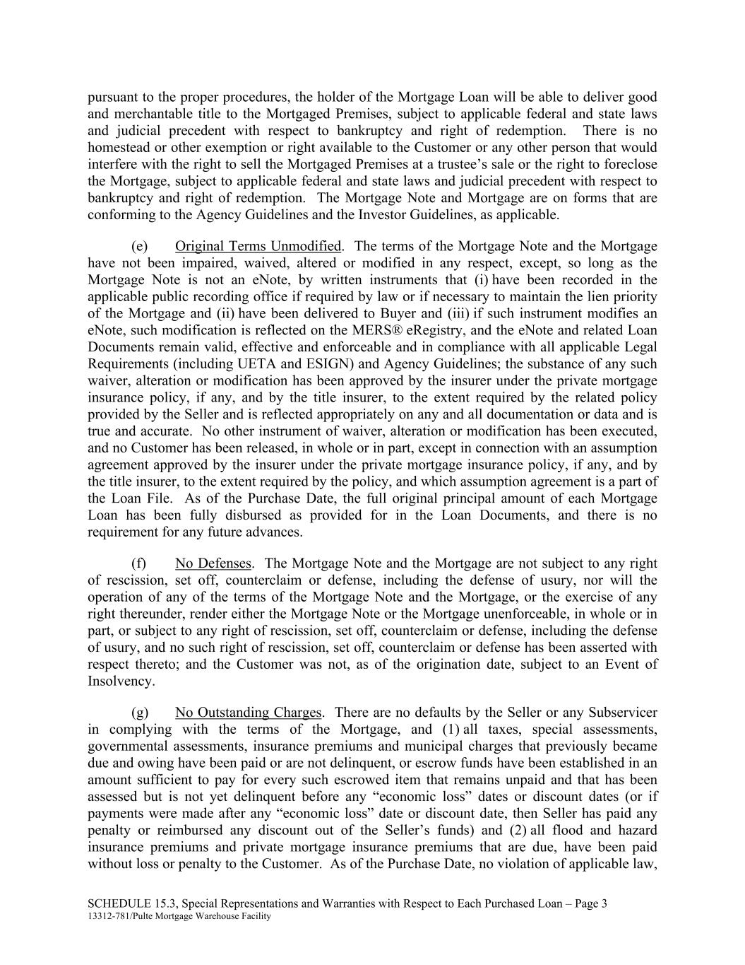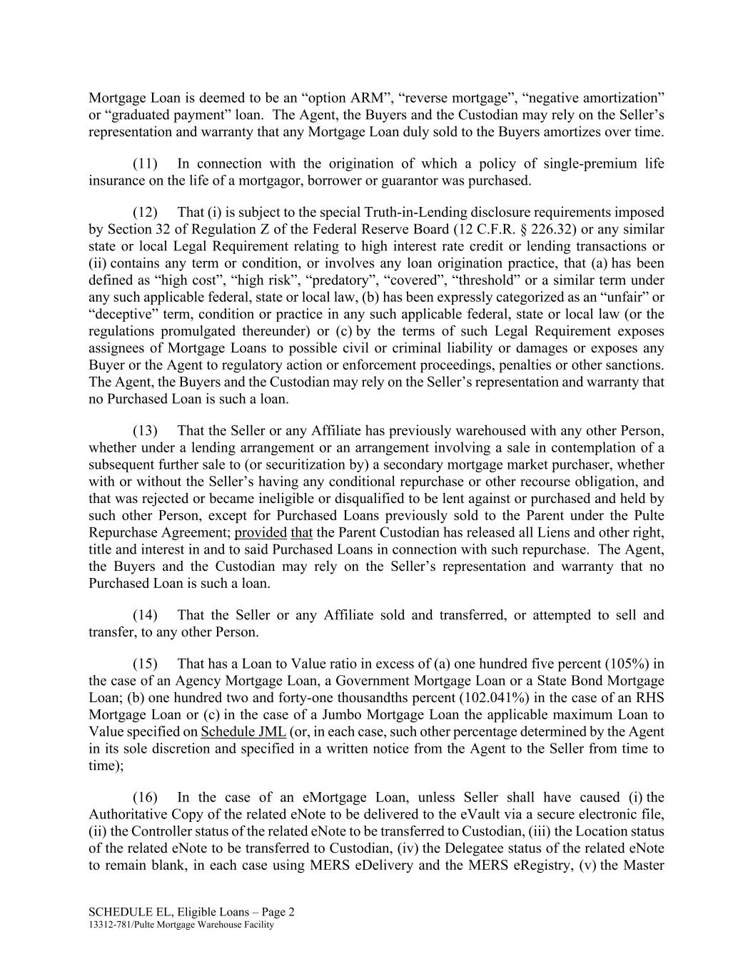 MASTER REPURCHASE AGREEMENT – Page 11 13312-781/Pulte Mortgage Warehouse Facility that it does not intend to comply with its funding obligations under this Agreement, other mortgage repurchase agreements or any agreements in which it commits to extend credit, (c) failed, within two (2) Business Days after request by the Agent, to confirm that it will comply with the terms of this Agreement relating to its obligations to fund prospective Transactions and participations in then outstanding Swing Line Transactions (provided that such Buyer shall cease to be a Defaulting Buyer pursuant to this clause (c) upon receipt of such written confirmation by the Agent), (d) otherwise failed to pay over to the Agent or any other Buyer any other amount required to be paid by it hereunder within two Business Days of the date when due, unless the subject of a good faith dispute, or (e) (i) become the subject of a proceeding under any Debtor Relief Law, or (ii) had appointed for it a receiver, custodian, conservator, trustee, administrator, assignee for the benefit of creditors or similar Person charged with reorganization or liquidation of its business or assets, including the Federal Deposit Insurance Corporation or any other state or federal regulatory authority acting in such a capacity; provided that a Buyer shall not be a Defaulting Buyer solely by virtue of the ownership or acquisition of any equity interest in that Buyer or any direct or indirect parent company thereof by a Governmental Authority, so long as such ownership interest does not result in or provide such Buyer with immunity from the jurisdiction of courts within the United States or from the enforcement of judgments or writs of attachment on its assets or permit such Buyer (or such Governmental Authority) to reject, repudiate, disavow or disaffirm any contracts or agreements made with such Buyer. Any determination by the Agent that a Buyer is a Defaulting Buyer under any one or more of clauses (a) through (e) above shall be conclusive and binding absent manifest error, and such Buyer shall be deemed to be a Defaulting Buyer upon delivery of written notice of such determination to the Seller, Swing Line Buyer and each Buyer. “Delegatee” means, with respect to an eNote, the party designated in the MERS eRegistry as the “Delegatee” or “Delegatee for Transfers,” who in such capacity is authorized by the Controller to perform certain MERS eRegistry transactions on behalf of the Controller such as Transfers of Control and Transfers of Control and Location. “Determination Date” means the date as of, or for, which a specified characteristic of a Mortgage Loan or other subject matter is being determined for purposes of a provision of this Agreement or another Transaction Document. “Disqualifier” means any of the circumstances or events affecting Purchased Loans that are described on Schedule DQ. “Dry Loan” means an Eligible Loan originated by the Seller that has been closed, funded and qualifies without exception as an Eligible Loan, including satisfying the requirement that all of its Primary Loan Documents have been delivered to the Custodian. “eClosing System” means the systems and processes used in the origination and closing of an eMortgage Loan and through which the eNote and other Mortgage Loan Documents are accessed, presented and signed electronically. “eClosing Transaction Record” means, for each eMortgage Loan, a record of each eNote and Electronic Record presented and signed using the eClosing System and all actions relating to the creation, execution, and transferring of the eNote, and all other Electronic Records that are