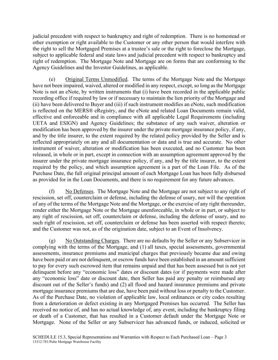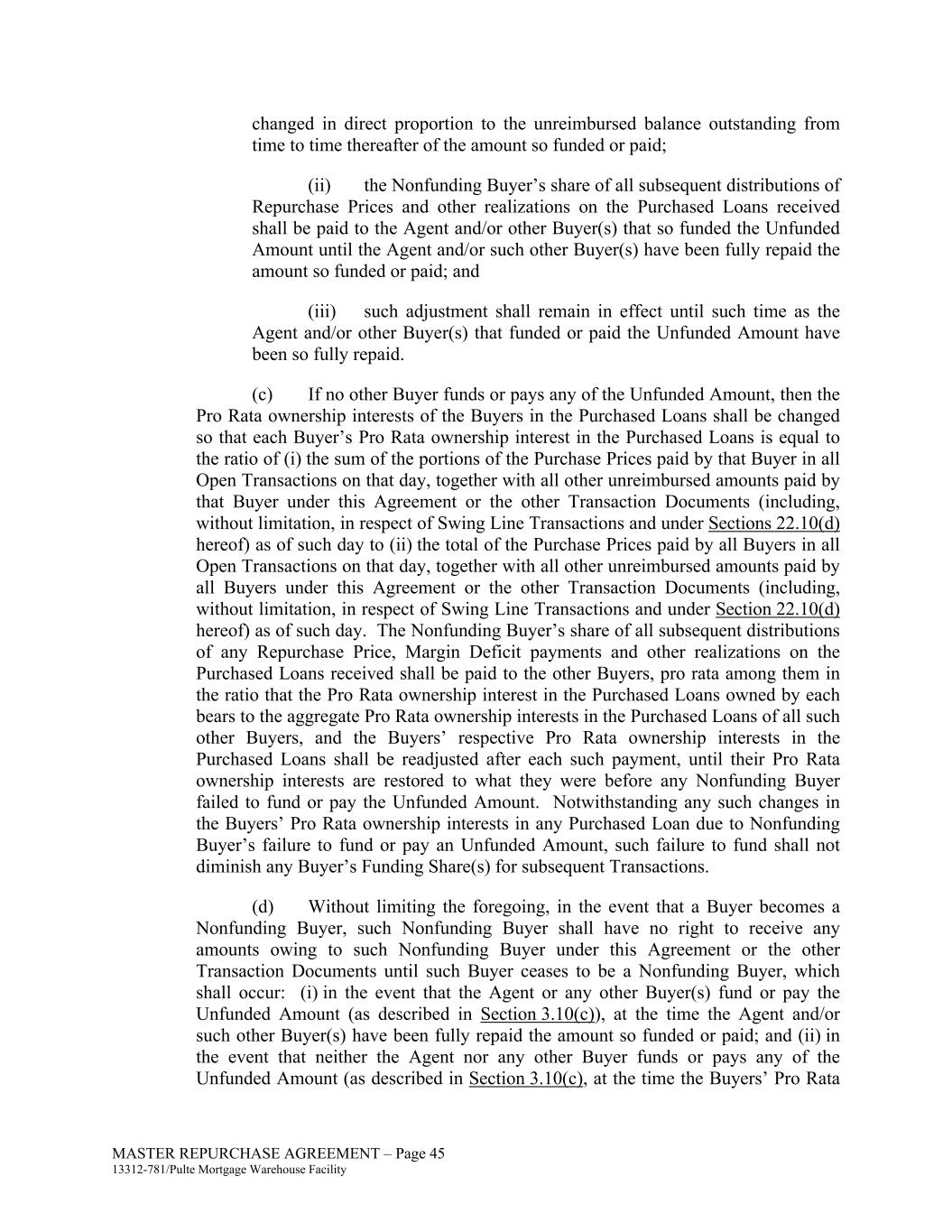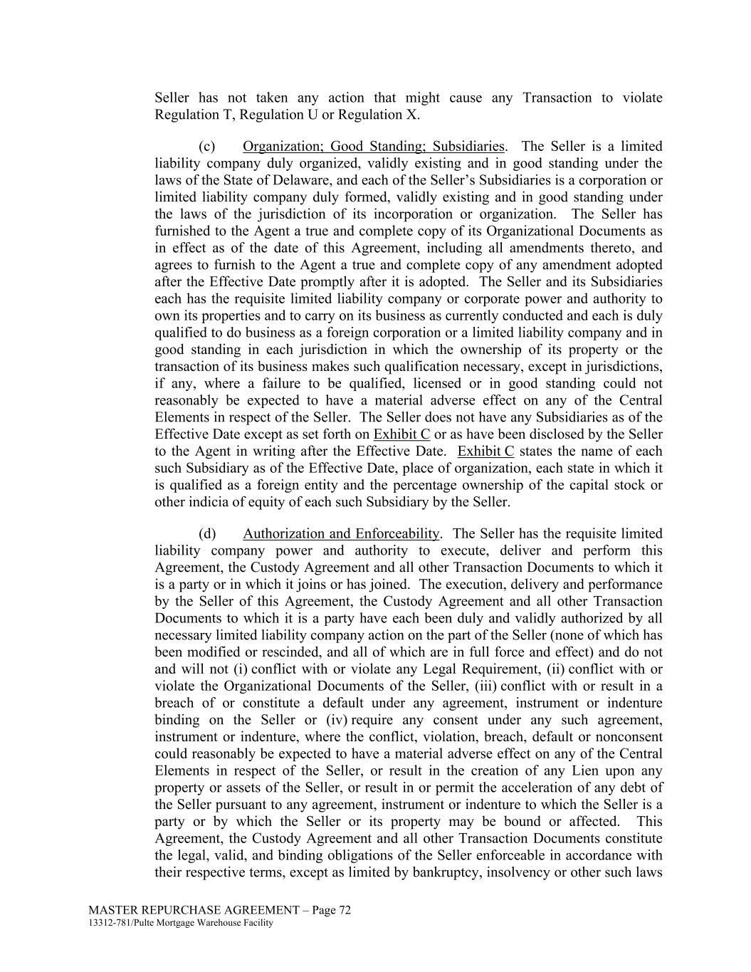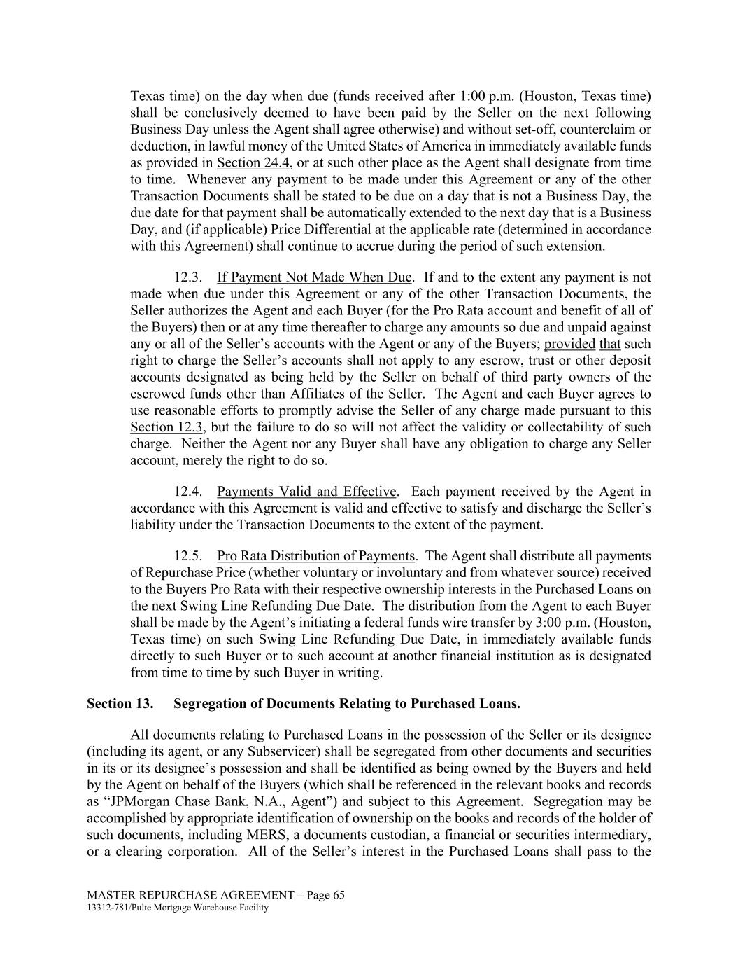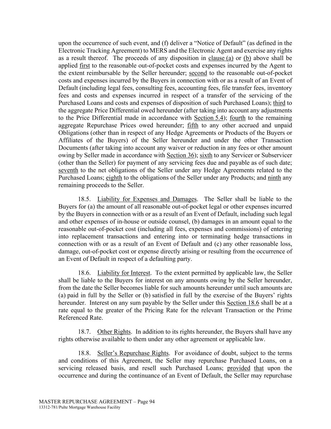 MASTER REPURCHASE AGREEMENT – Page 11 13312-781/Pulte Mortgage Warehouse Facility that it does not intend to comply with its funding obligations under this Agreement, other mortgage repurchase agreements or any agreements in which it commits to extend credit, (c) failed, within two (2) Business Days after request by the Agent, to confirm that it will comply with the terms of this Agreement relating to its obligations to fund prospective Transactions and participations in then outstanding Swing Line Transactions (provided that such Buyer shall cease to be a Defaulting Buyer pursuant to this clause (c) upon receipt of such written confirmation by the Agent), (d) otherwise failed to pay over to the Agent or any other Buyer any other amount required to be paid by it hereunder within two Business Days of the date when due, unless the subject of a good faith dispute, or (e) (i) become the subject of a proceeding under any Debtor Relief Law, or (ii) had appointed for it a receiver, custodian, conservator, trustee, administrator, assignee for the benefit of creditors or similar Person charged with reorganization or liquidation of its business or assets, including the Federal Deposit Insurance Corporation or any other state or federal regulatory authority acting in such a capacity; provided that a Buyer shall not be a Defaulting Buyer solely by virtue of the ownership or acquisition of any equity interest in that Buyer or any direct or indirect parent company thereof by a Governmental Authority, so long as such ownership interest does not result in or provide such Buyer with immunity from the jurisdiction of courts within the United States or from the enforcement of judgments or writs of attachment on its assets or permit such Buyer (or such Governmental Authority) to reject, repudiate, disavow or disaffirm any contracts or agreements made with such Buyer. Any determination by the Agent that a Buyer is a Defaulting Buyer under any one or more of clauses (a) through (e) above shall be conclusive and binding absent manifest error, and such Buyer shall be deemed to be a Defaulting Buyer upon delivery of written notice of such determination to the Seller, Swing Line Buyer and each Buyer. “Delegatee” means, with respect to an eNote, the party designated in the MERS eRegistry as the “Delegatee” or “Delegatee for Transfers,” who in such capacity is authorized by the Controller to perform certain MERS eRegistry transactions on behalf of the Controller such as Transfers of Control and Transfers of Control and Location. “Determination Date” means the date as of, or for, which a specified characteristic of a Mortgage Loan or other subject matter is being determined for purposes of a provision of this Agreement or another Transaction Document. “Disqualifier” means any of the circumstances or events affecting Purchased Loans that are described on Schedule DQ. “Dry Loan” means an Eligible Loan originated by the Seller that has been closed, funded and qualifies without exception as an Eligible Loan, including satisfying the requirement that all of its Primary Loan Documents have been delivered to the Custodian. “eClosing System” means the systems and processes used in the origination and closing of an eMortgage Loan and through which the eNote and other Mortgage Loan Documents are accessed, presented and signed electronically. “eClosing Transaction Record” means, for each eMortgage Loan, a record of each eNote and Electronic Record presented and signed using the eClosing System and all actions relating to the creation, execution, and transferring of the eNote, and all other Electronic Records that are