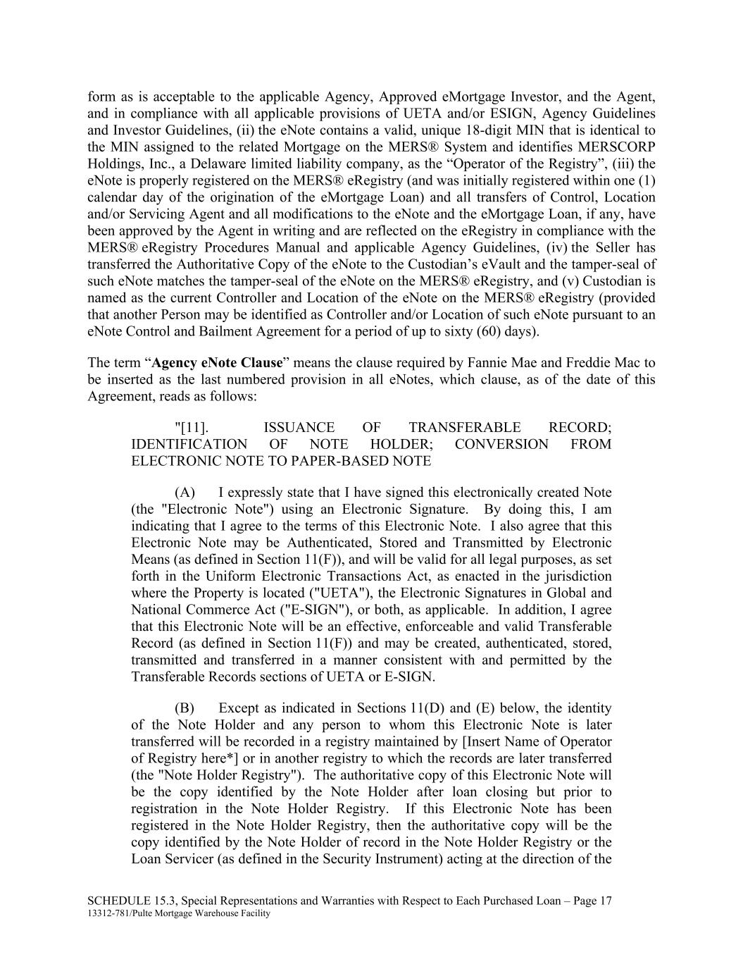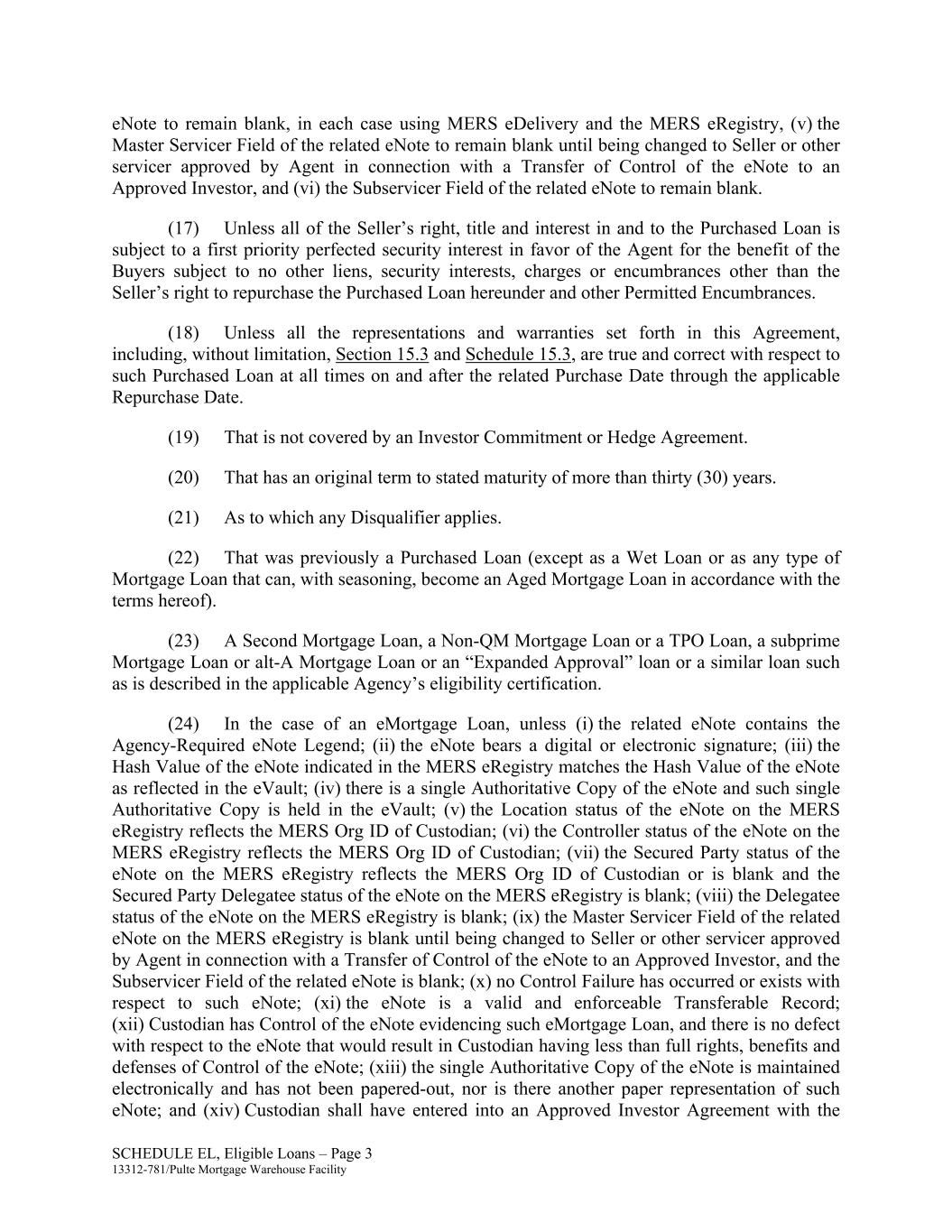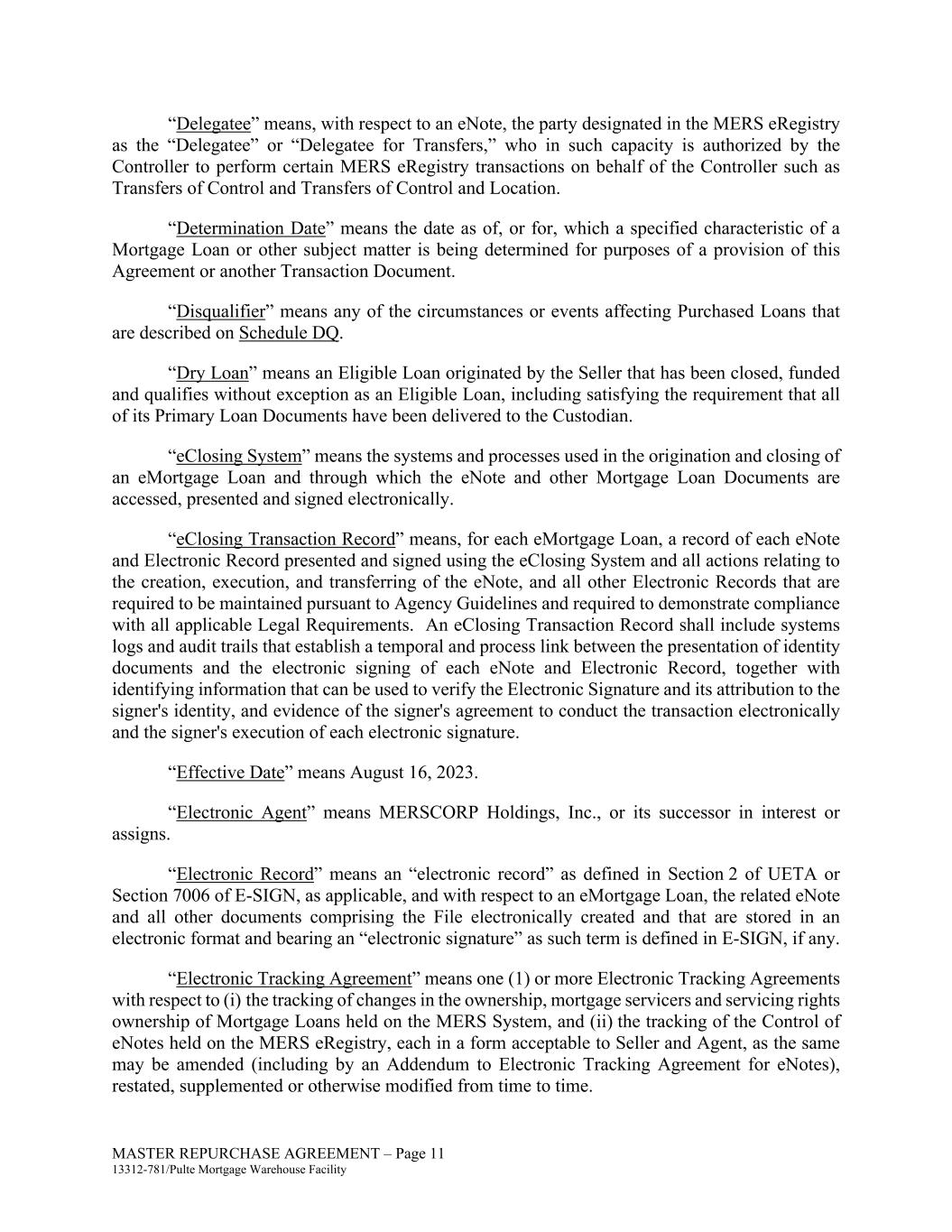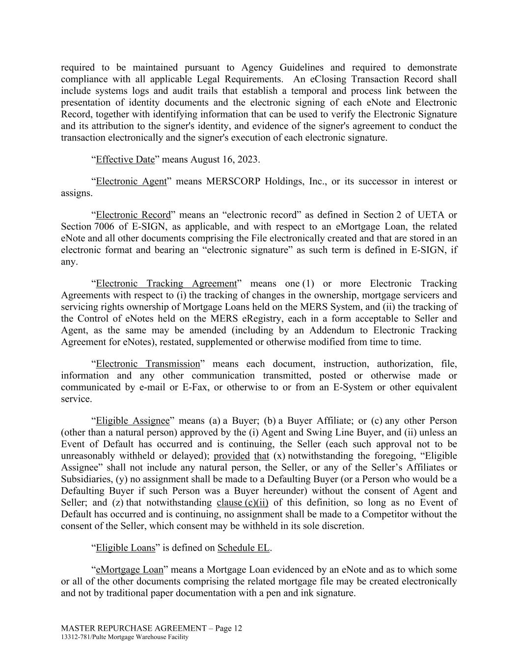 MASTER REPURCHASE AGREEMENT – Page 12 13312-781/Pulte Mortgage Warehouse Facility required to be maintained pursuant to Agency Guidelines and required to demonstrate compliance with all applicable Legal Requirements. An eClosing Transaction Record shall include systems logs and audit trails that establish a temporal and process link between the presentation of identity documents and the electronic signing of each eNote and Electronic Record, together with identifying information that can be used to verify the Electronic Signature and its attribution to the signer's identity, and evidence of the signer's agreement to conduct the transaction electronically and the signer's execution of each electronic signature. “Effective Date” means August 16, 2023. “Electronic Agent” means MERSCORP Holdings, Inc., or its successor in interest or assigns. “Electronic Record” means an “electronic record” as defined in Section 2 of UETA or Section 7006 of E-SIGN, as applicable, and with respect to an eMortgage Loan, the related eNote and all other documents comprising the File electronically created and that are stored in an electronic format and bearing an “electronic signature” as such term is defined in E-SIGN, if any. “Electronic Tracking Agreement” means one (1) or more Electronic Tracking Agreements with respect to (i) the tracking of changes in the ownership, mortgage servicers and servicing rights ownership of Mortgage Loans held on the MERS System, and (ii) the tracking of the Control of eNotes held on the MERS eRegistry, each in a form acceptable to Seller and Agent, as the same may be amended (including by an Addendum to Electronic Tracking Agreement for eNotes), restated, supplemented or otherwise modified from time to time. “Electronic Transmission” means each document, instruction, authorization, file, information and any other communication transmitted, posted or otherwise made or communicated by e-mail or E-Fax, or otherwise to or from an E-System or other equivalent service. “Eligible Assignee” means (a) a Buyer; (b) a Buyer Affiliate; or (c) any other Person (other than a natural person) approved by the (i) Agent and Swing Line Buyer, and (ii) unless an Event of Default has occurred and is continuing, the Seller (each such approval not to be unreasonably withheld or delayed); provided that (x) notwithstanding the foregoing, “Eligible Assignee” shall not include any natural person, the Seller, or any of the Seller’s Affiliates or Subsidiaries, (y) no assignment shall be made to a Defaulting Buyer (or a Person who would be a Defaulting Buyer if such Person was a Buyer hereunder) without the consent of Agent and Seller; and (z) that notwithstanding clause (c)(ii) of this definition, so long as no Event of Default has occurred and is continuing, no assignment shall be made to a Competitor without the consent of the Seller, which consent may be withheld in its sole discretion. “Eligible Loans” is defined on Schedule EL. “eMortgage Loan” means a Mortgage Loan evidenced by an eNote and as to which some or all of the other documents comprising the related mortgage file may be created electronically and not by traditional paper documentation with a pen and ink signature.